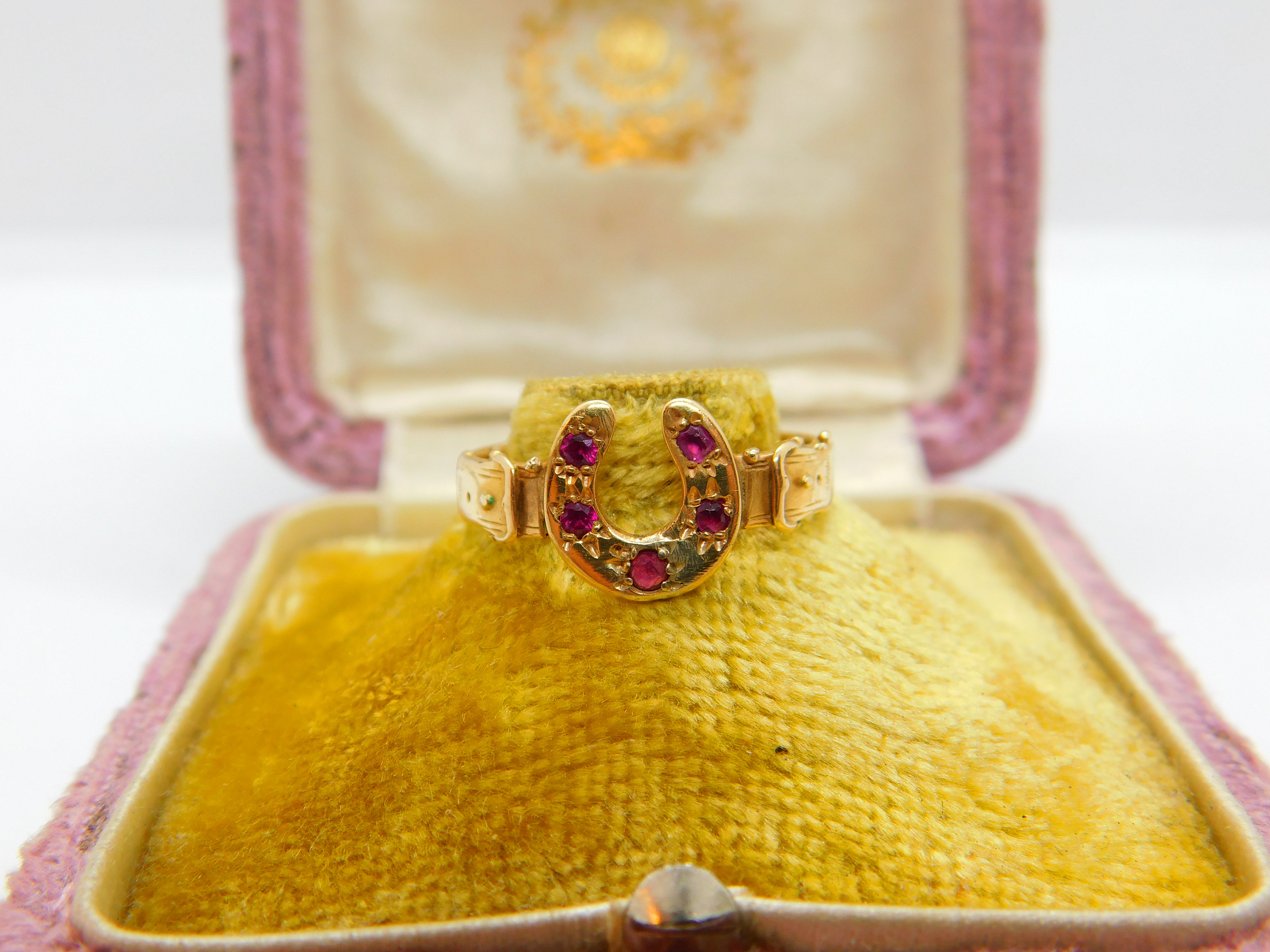 Details: A fantastic and wonderfully designed antique Victorian 15ct yellow gold ring in the form of a horseshoe symbolic of good luck set with natural rubies throughout hallmarked Birmingham 1870 clearly to the inner band. This is a wonderful item that would make a perfect gift or addition to any collection. The BOX pictured is for PRESENTATION ONLY and is NOT included in the listings but used to frame the pictures unless specifically stated otherwise.