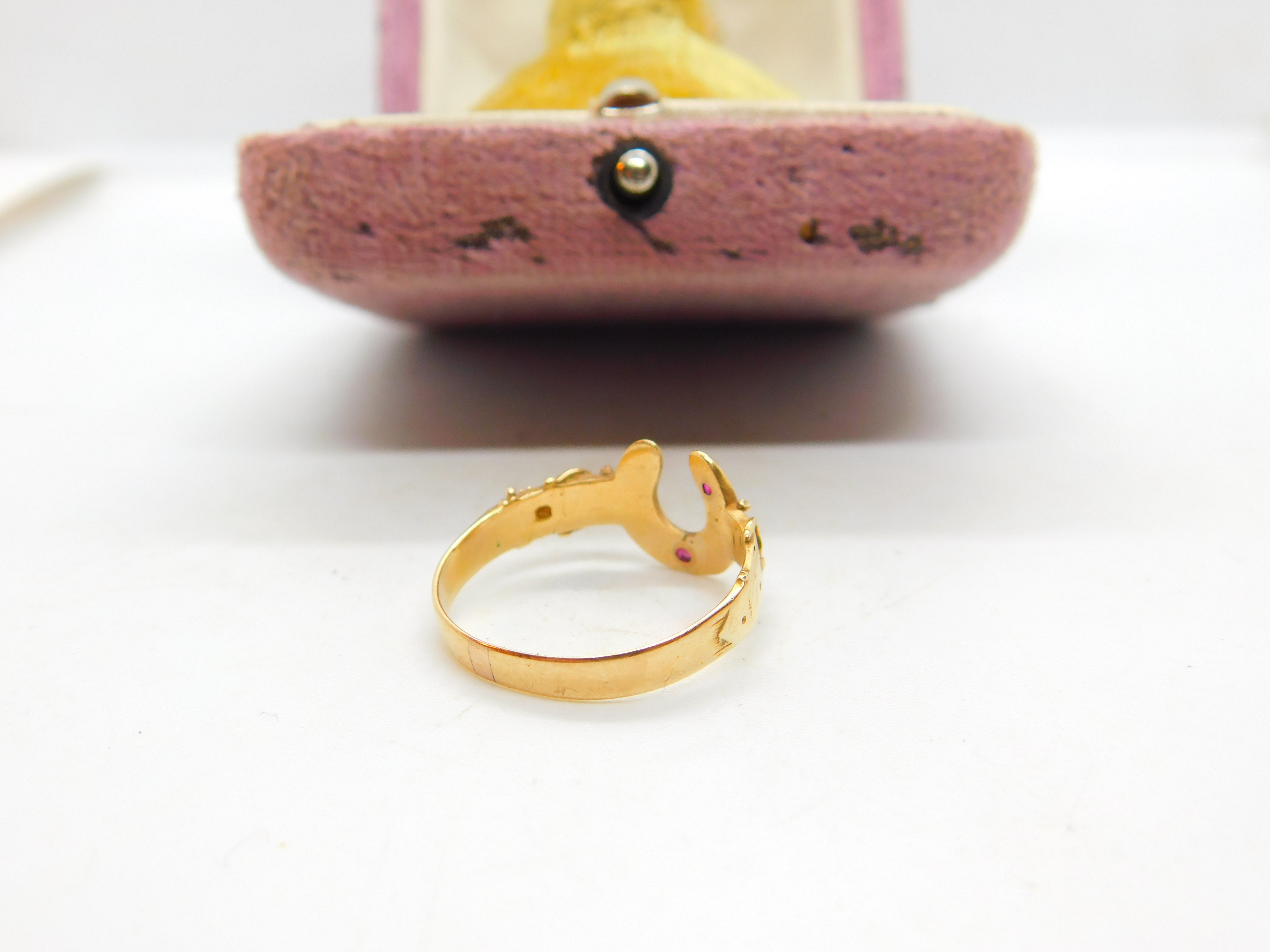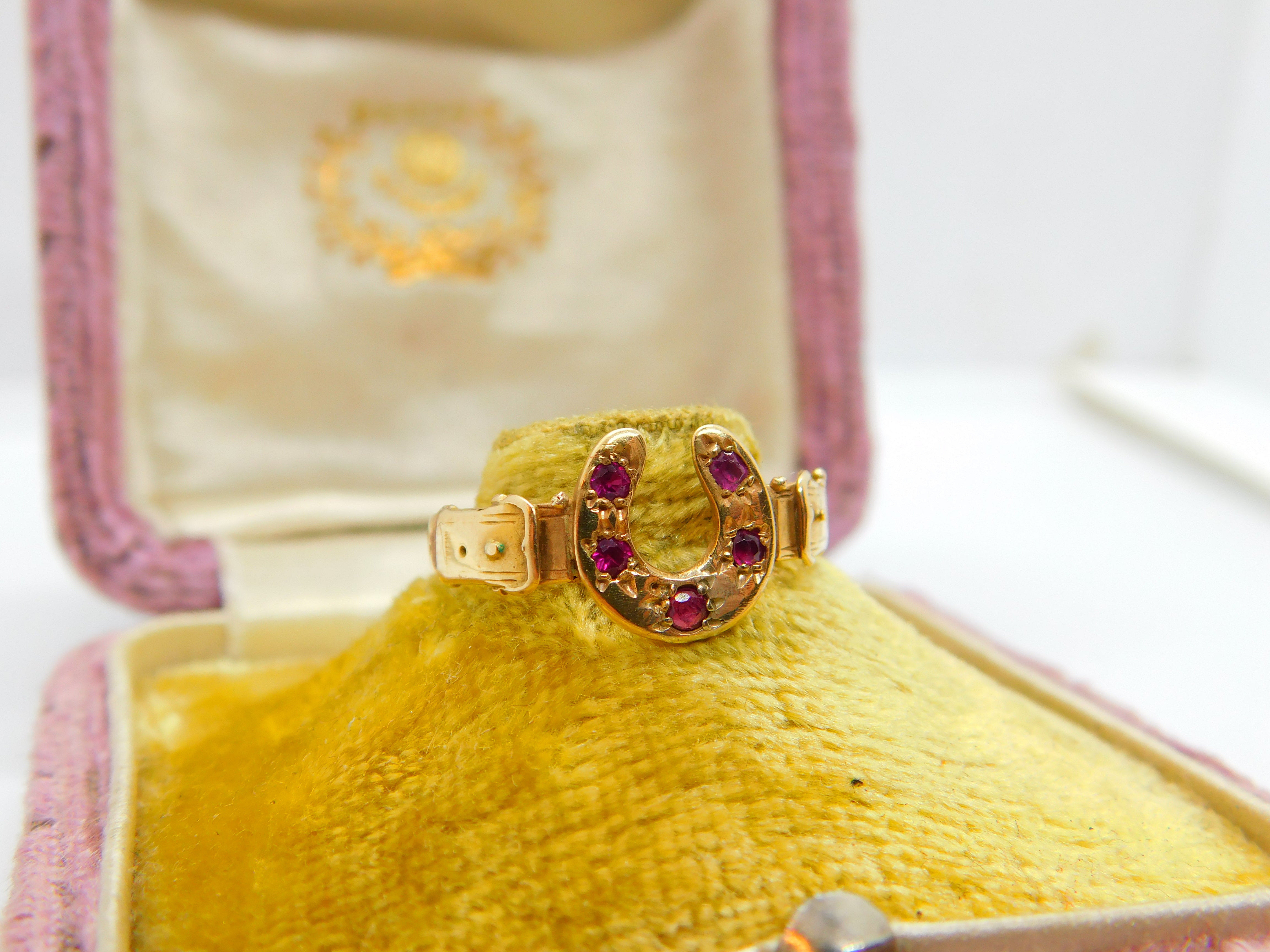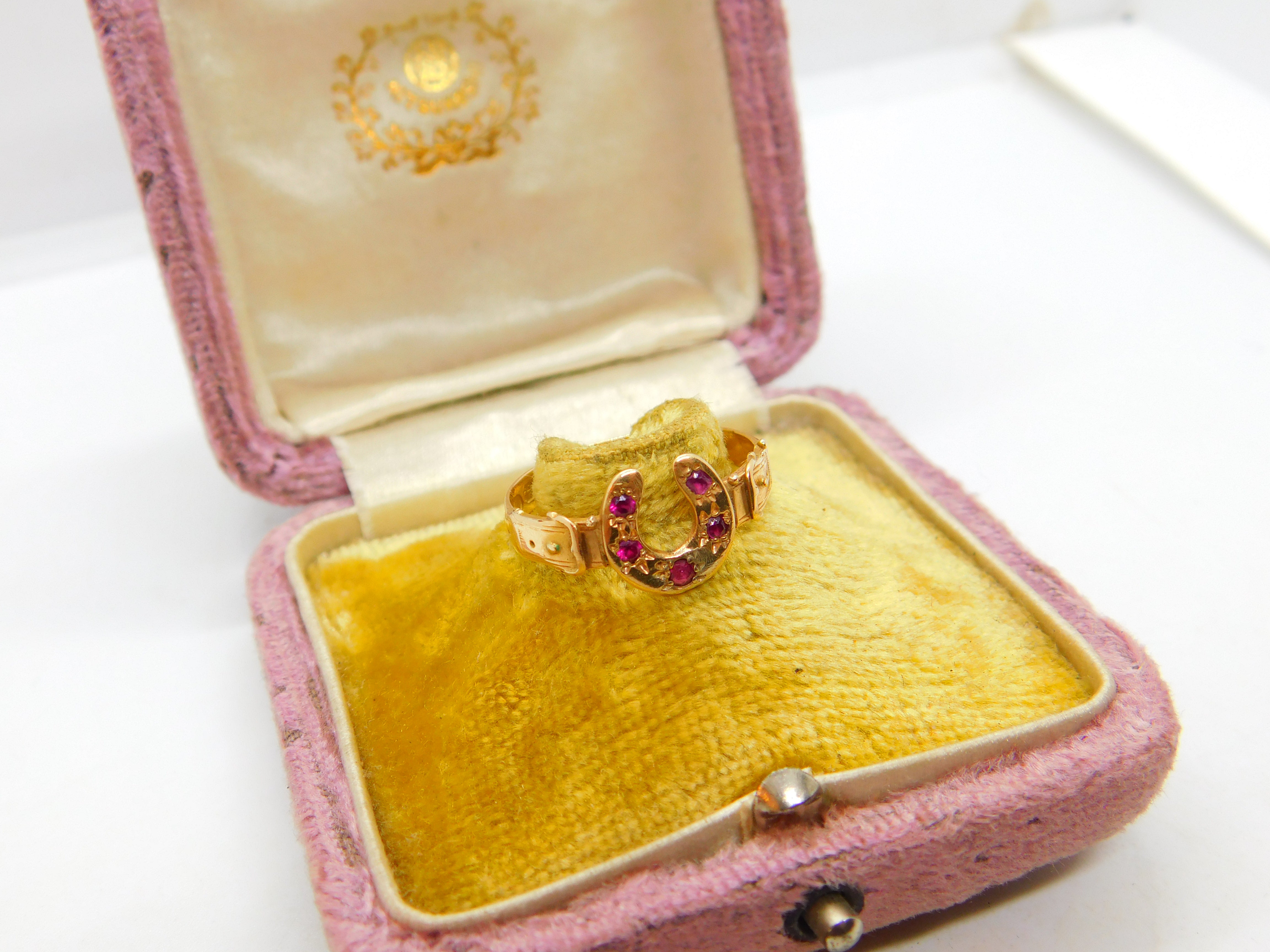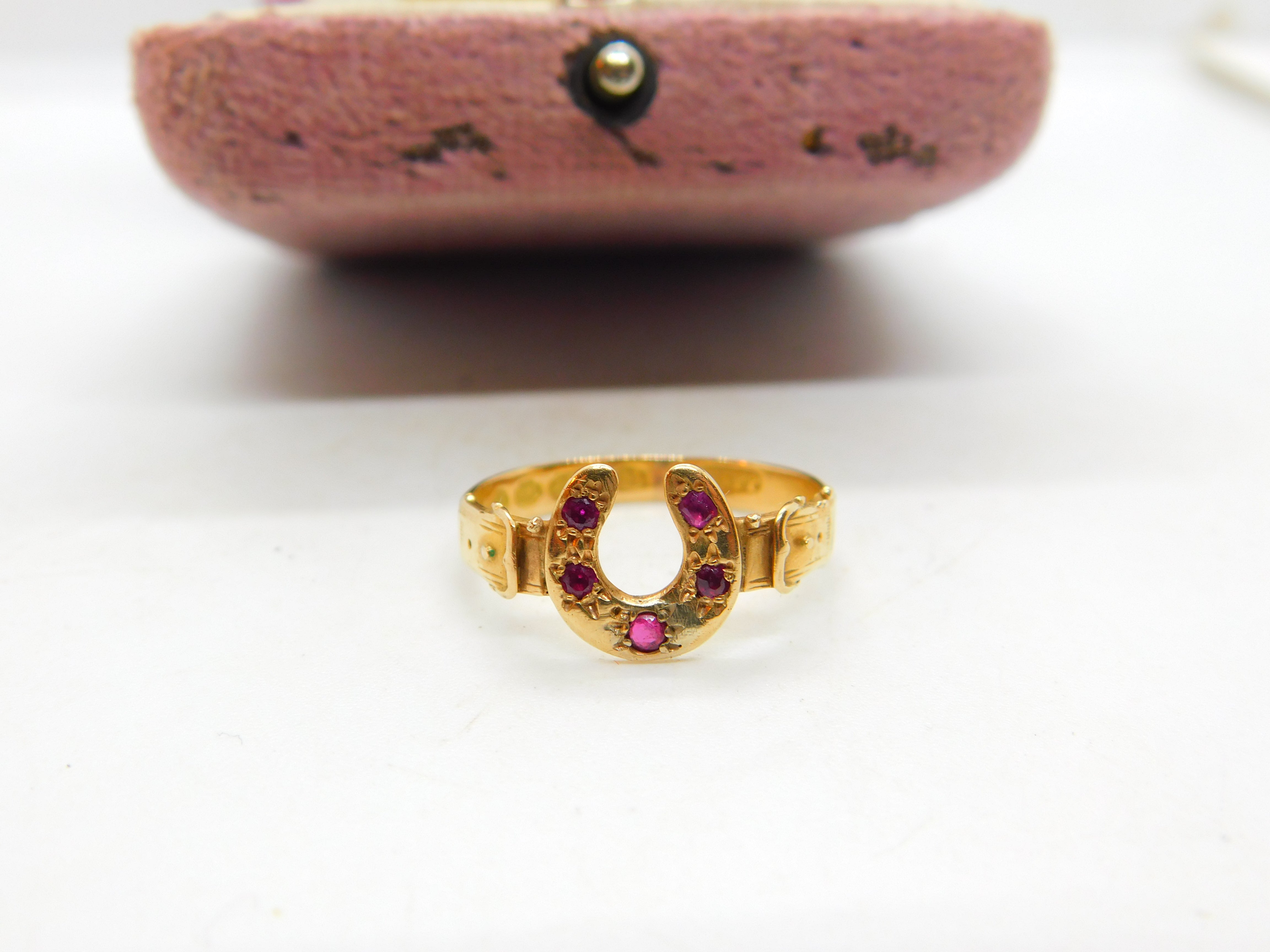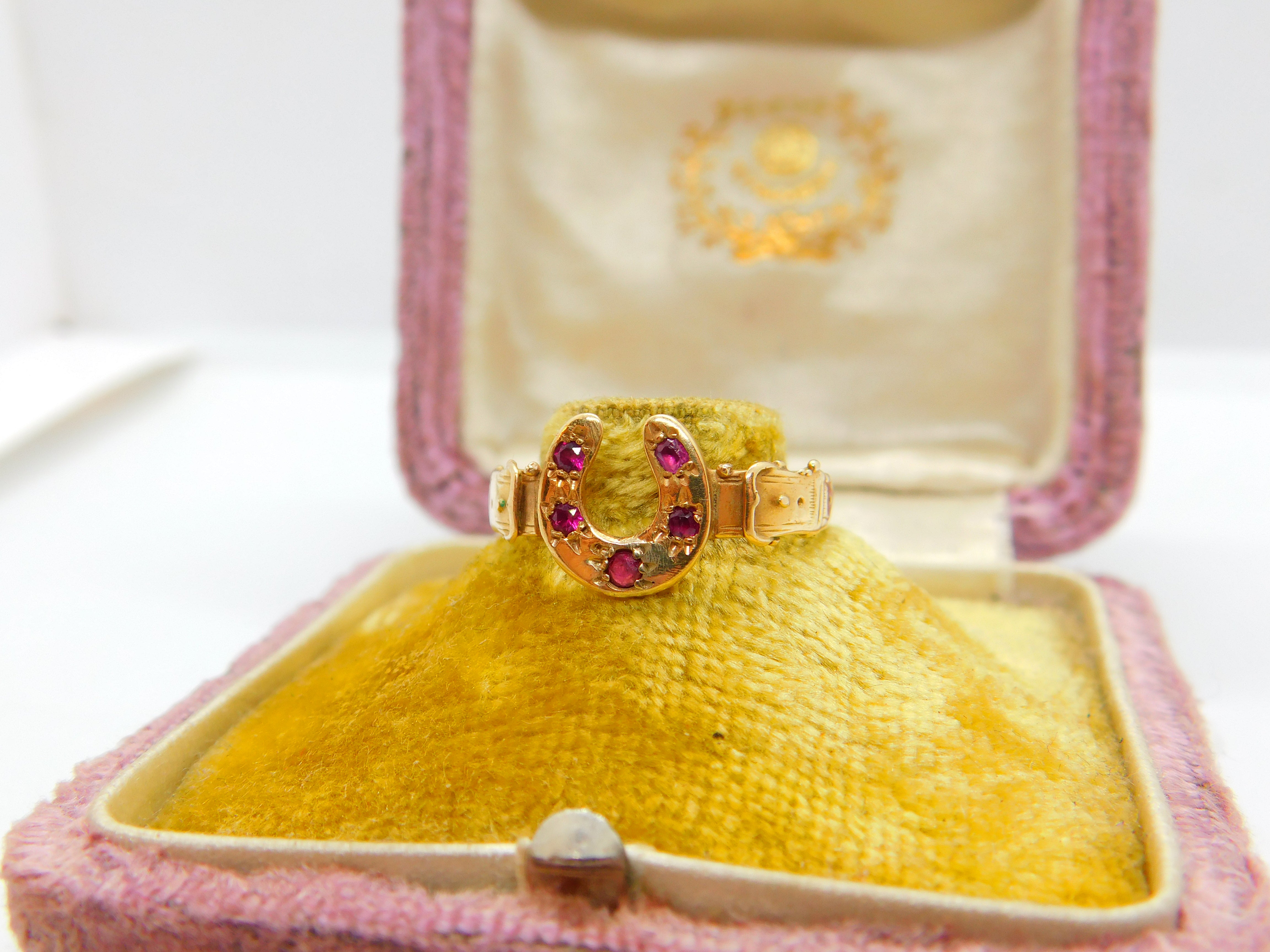 Victorian 15ct Gold & Ruby Set Good Luck Horseshoe Ring Antique 1870 Birmingham