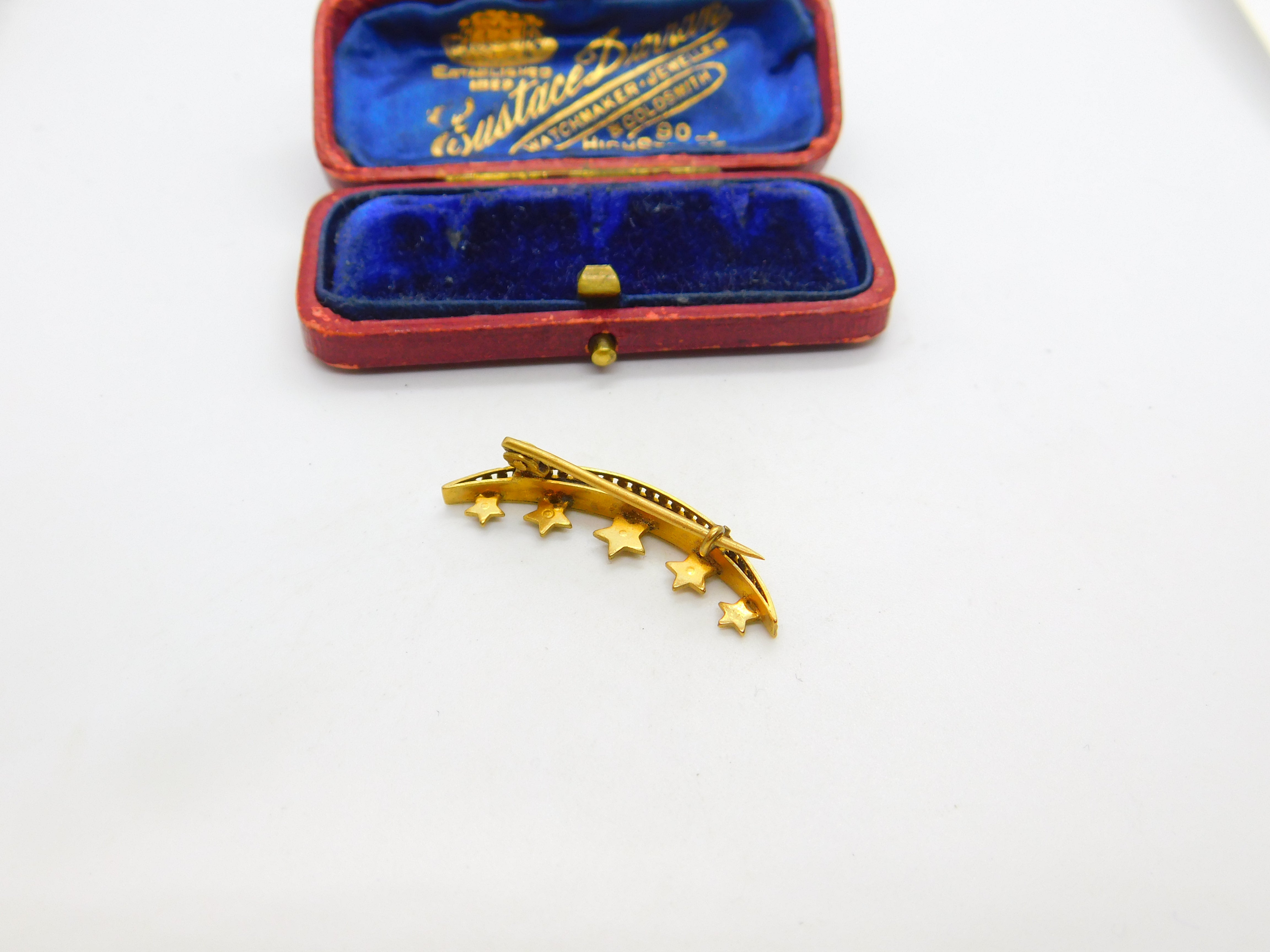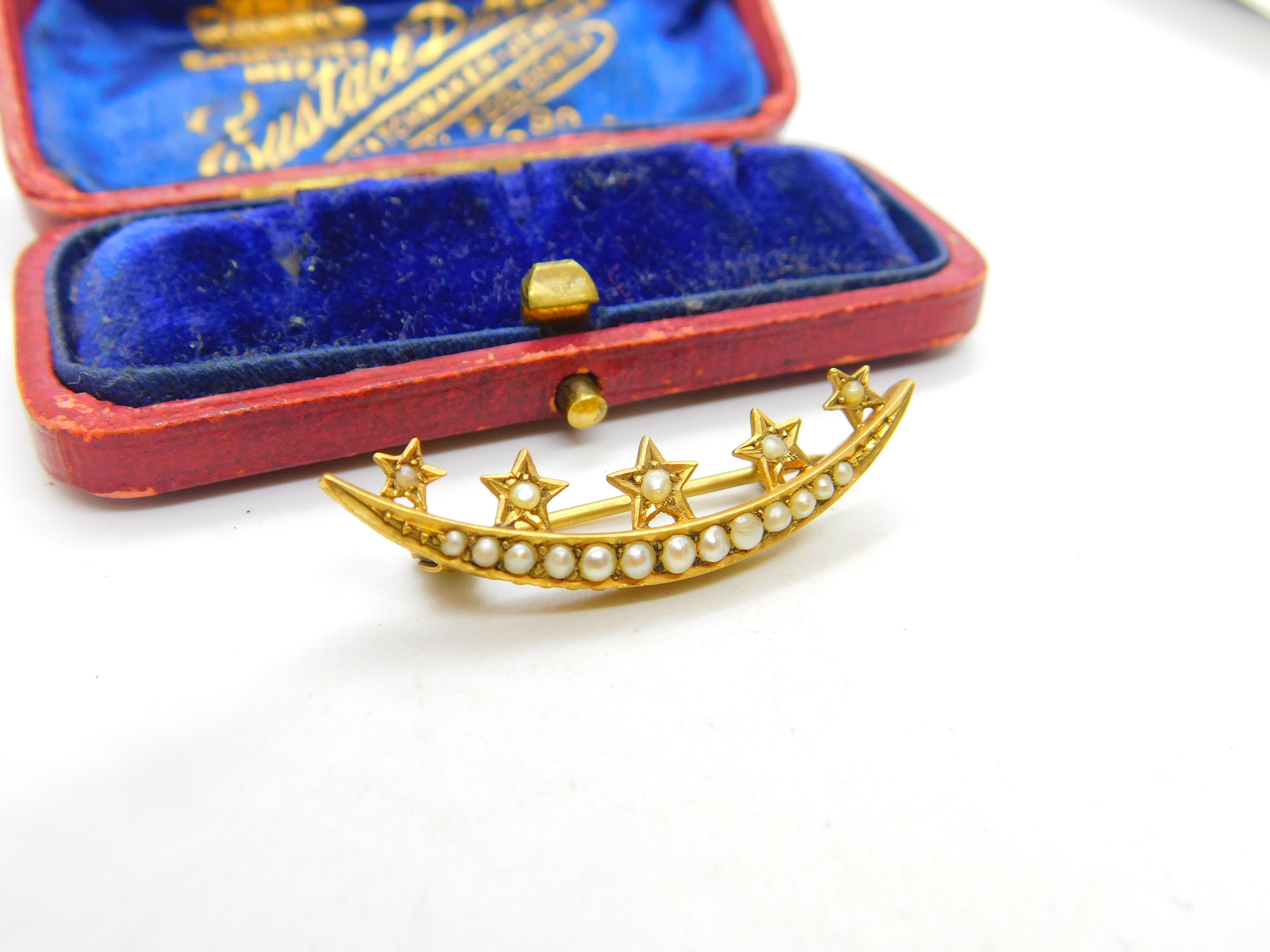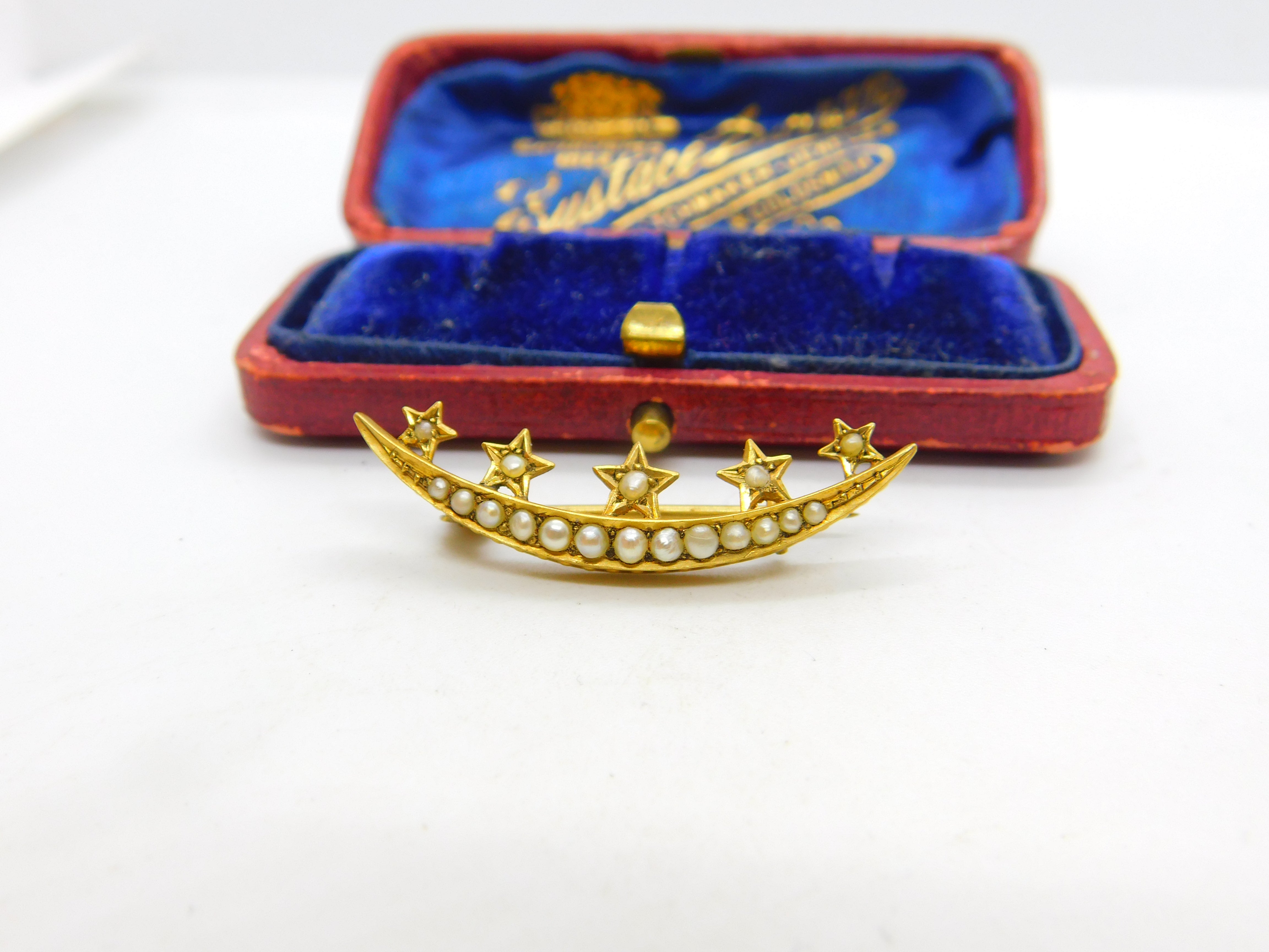 Details: A fantastic and wonderfully designed antique Victorian 15ct yellow gold crescent moon & star sweetheart brooch set with seed pearls c1860, the gold has been XRF tested. This is a wonderful item that would make a perfect gift or addition to any collection. The BOX pictured is for PRESENTATION ONLY and is NOT included in the listings but used to frame the pictures unless specifically stated otherwise.