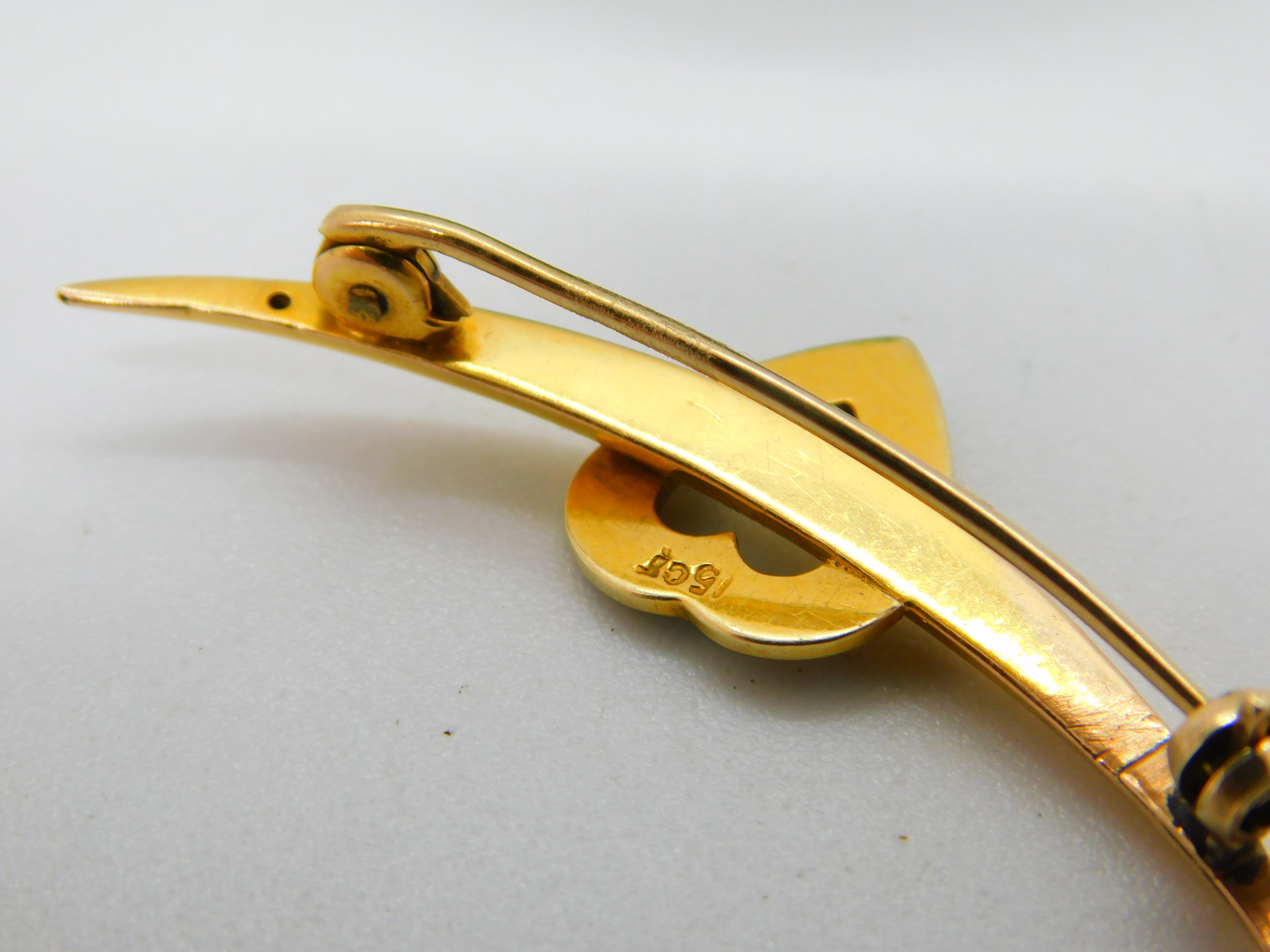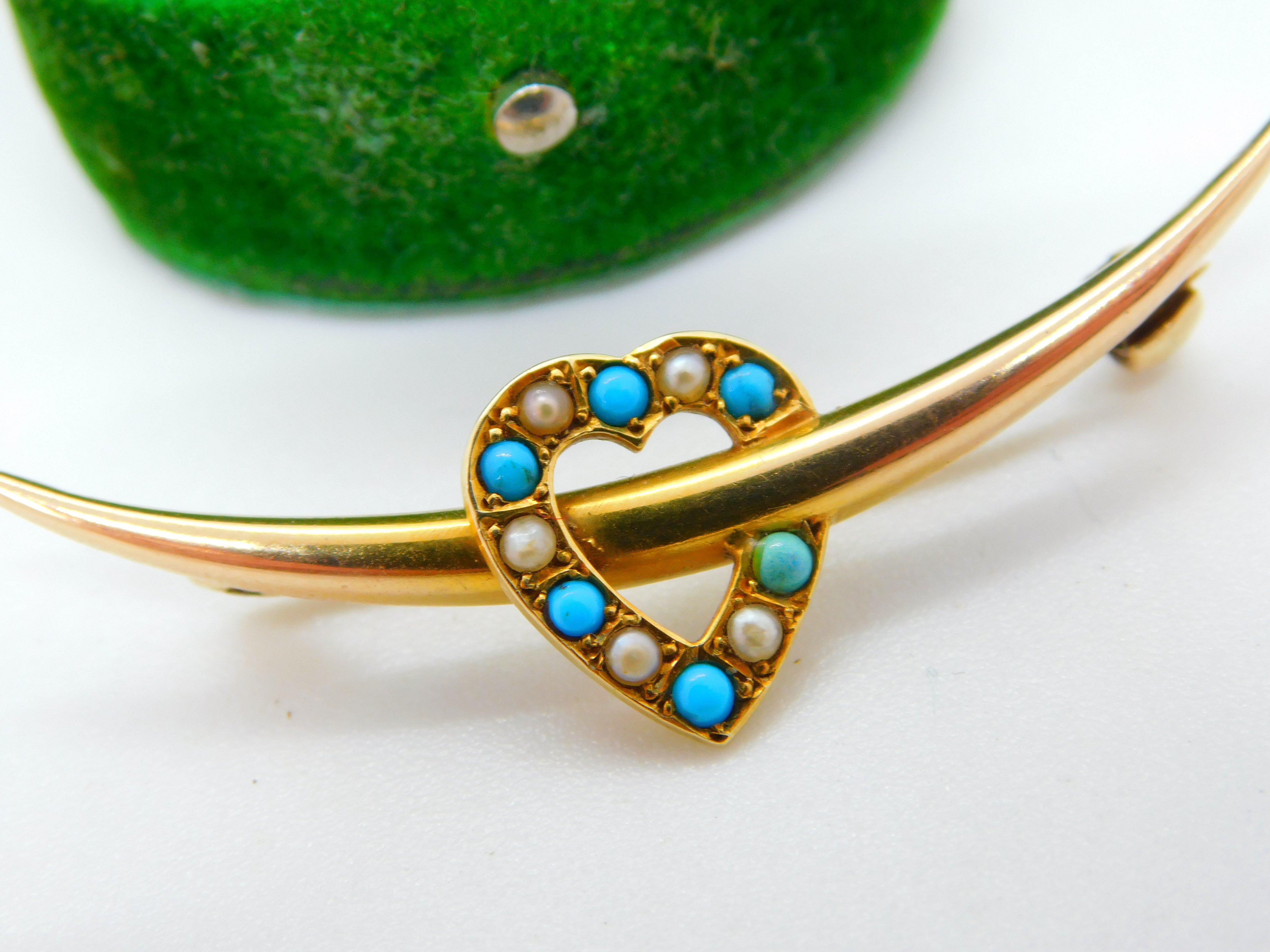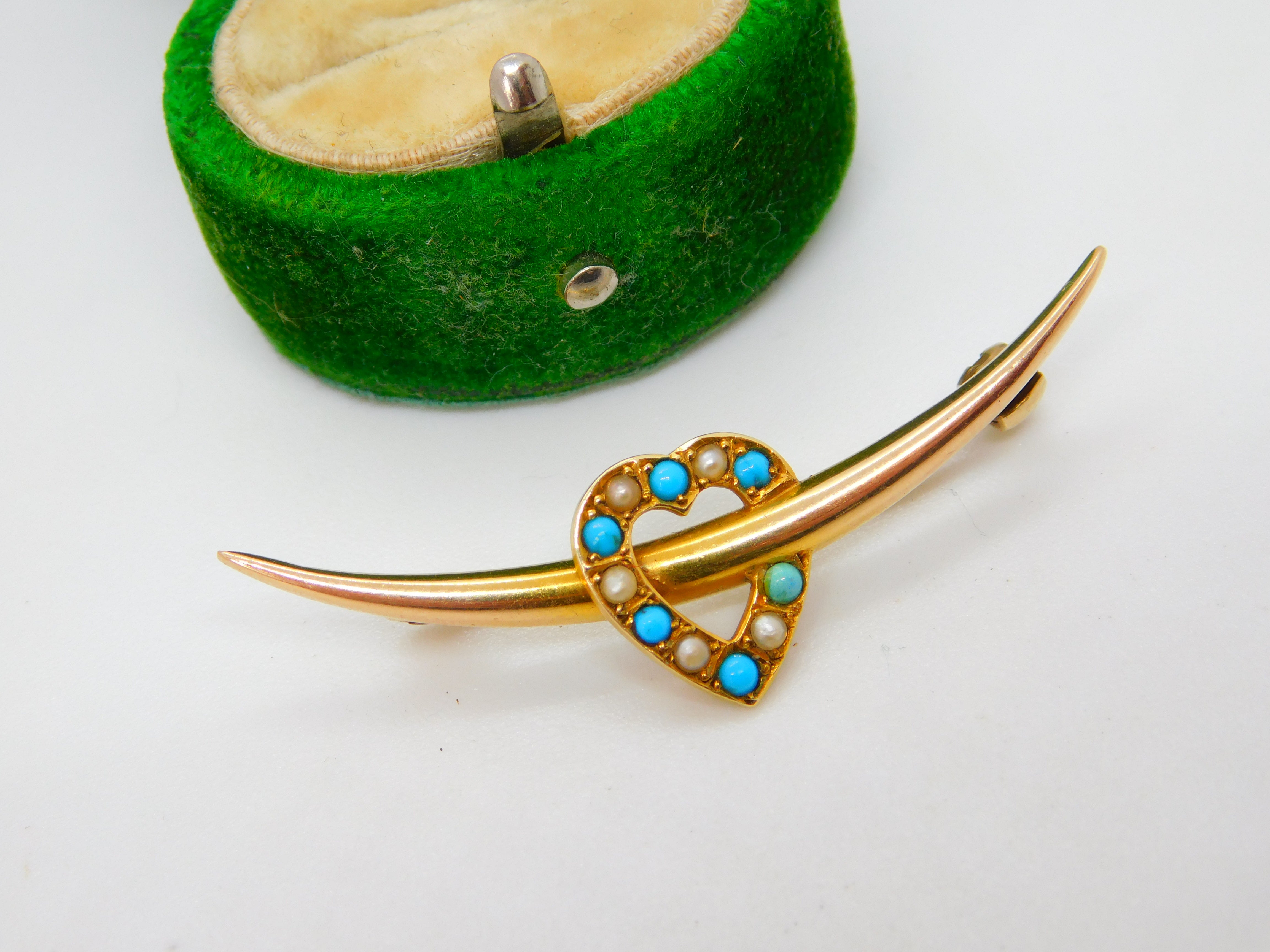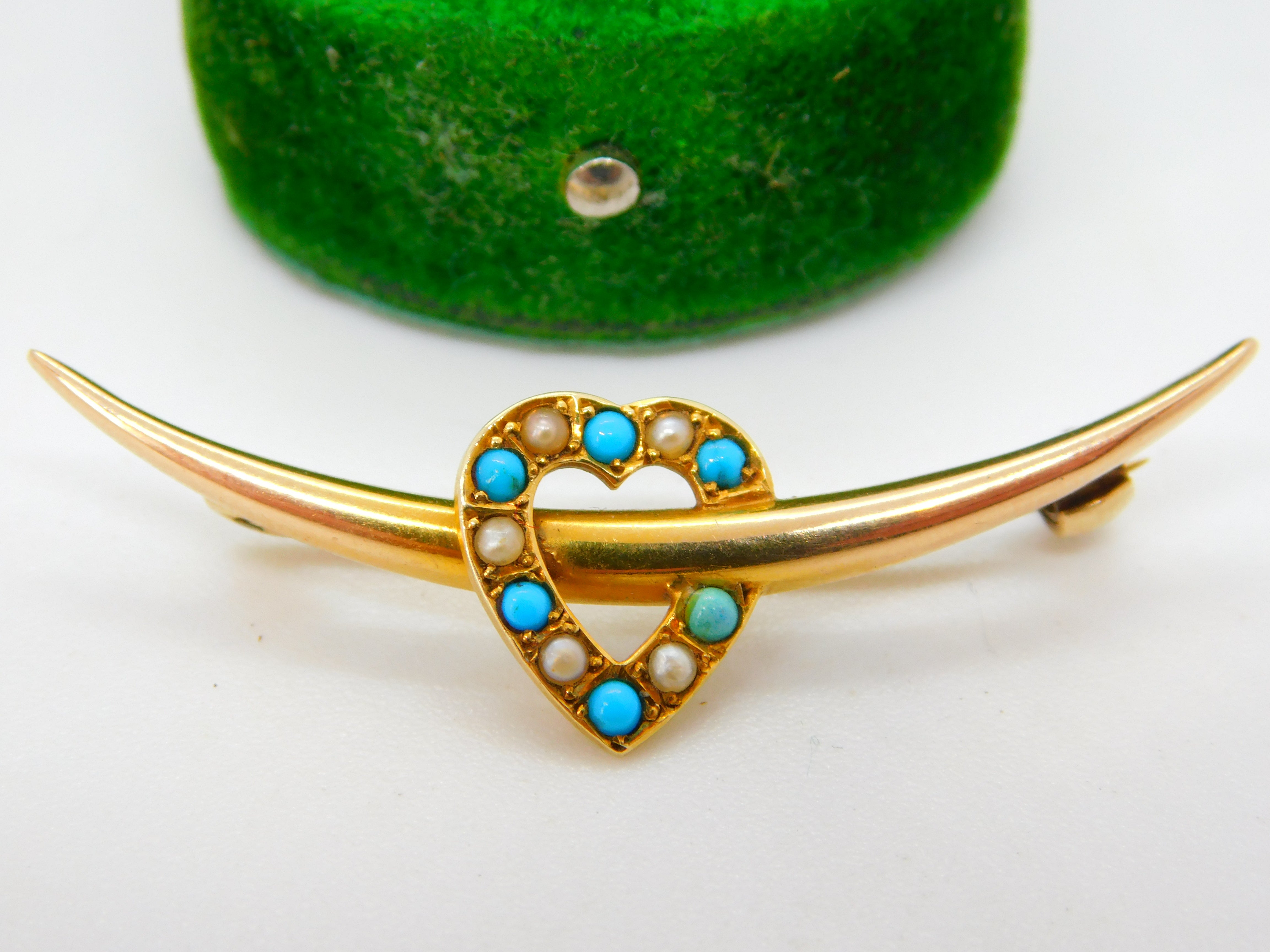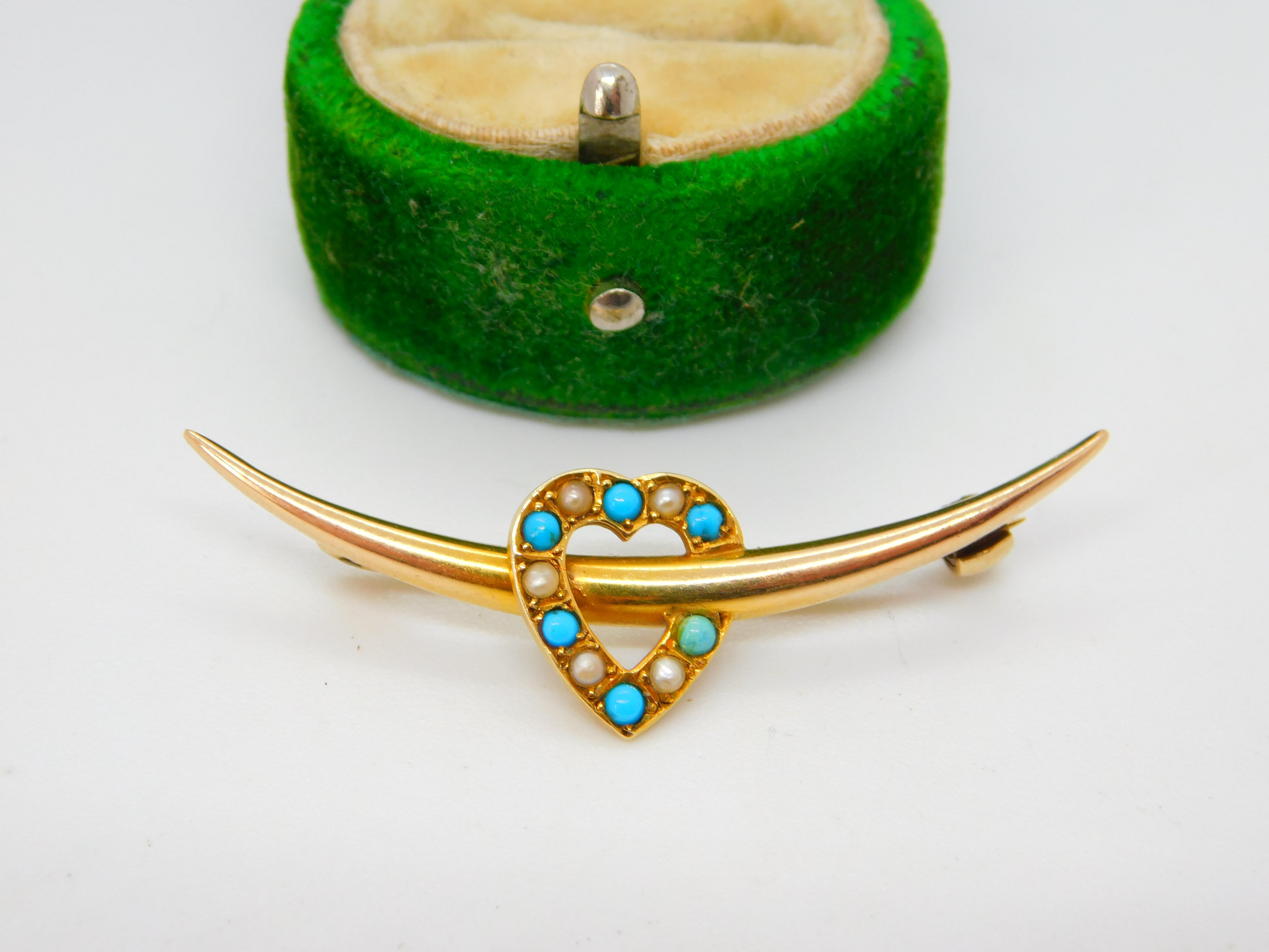Victorian 15ct Gold, Seed Pearl & Turquoise Crescent Heart Brooch Antique c1890
