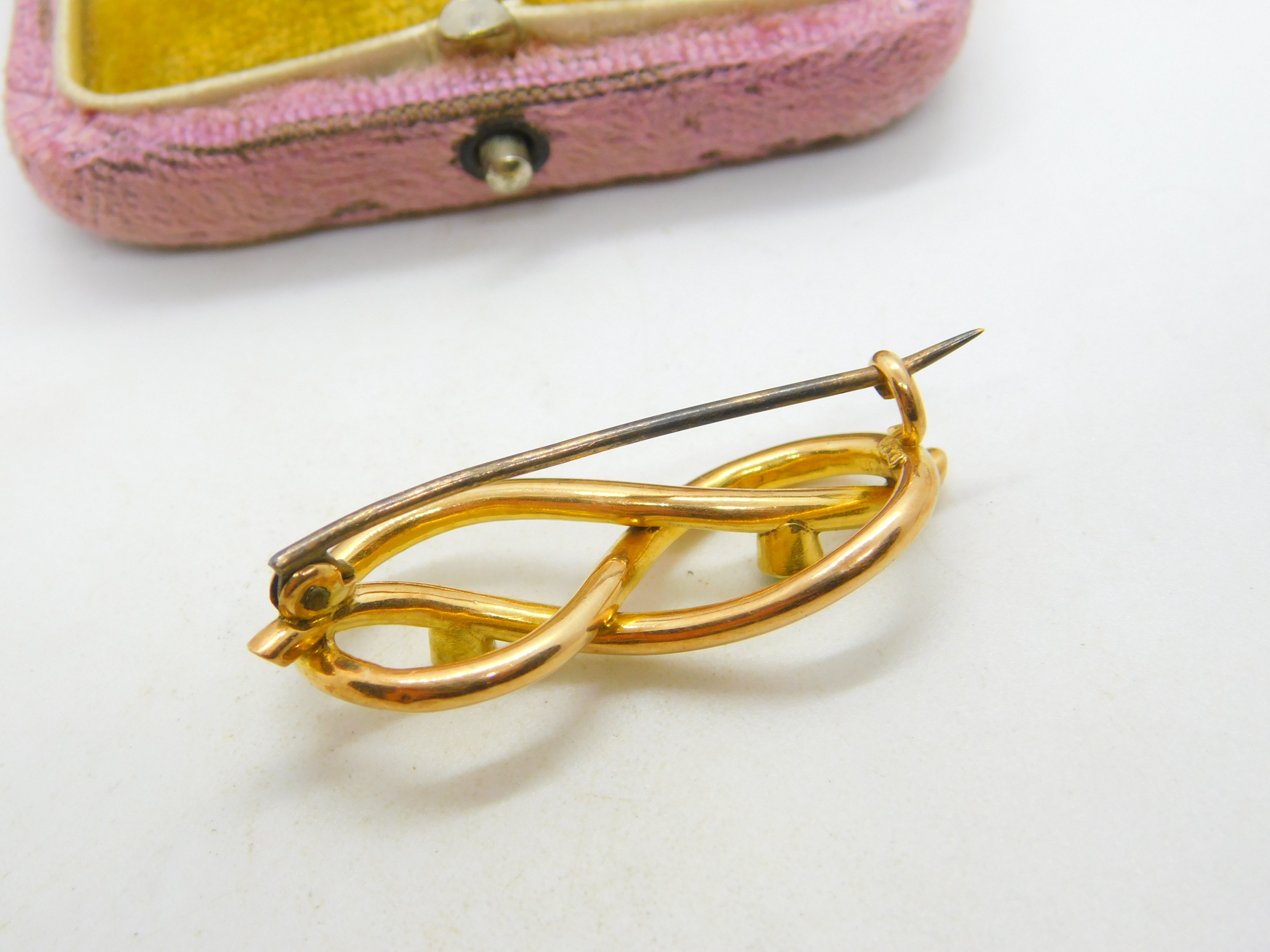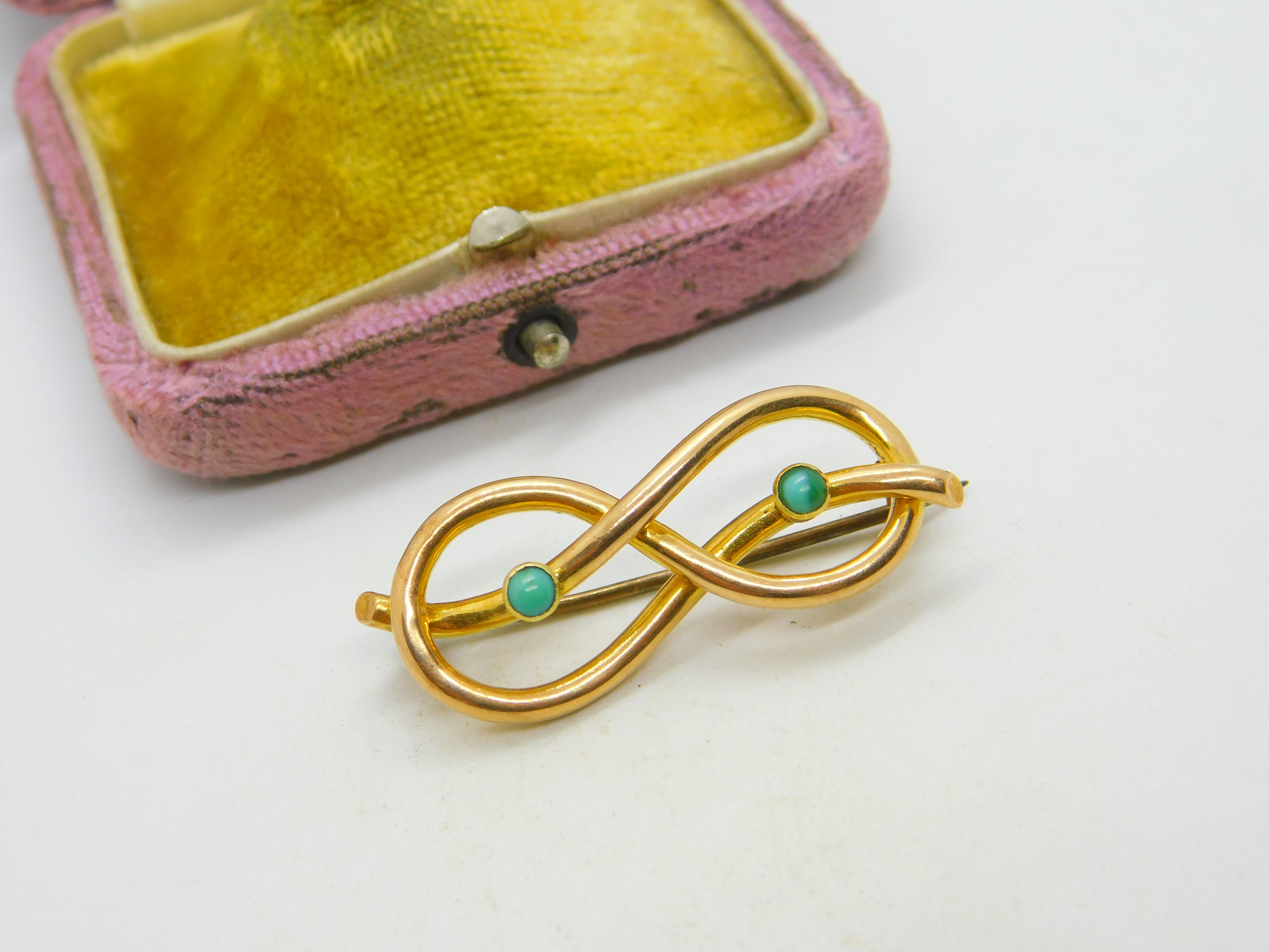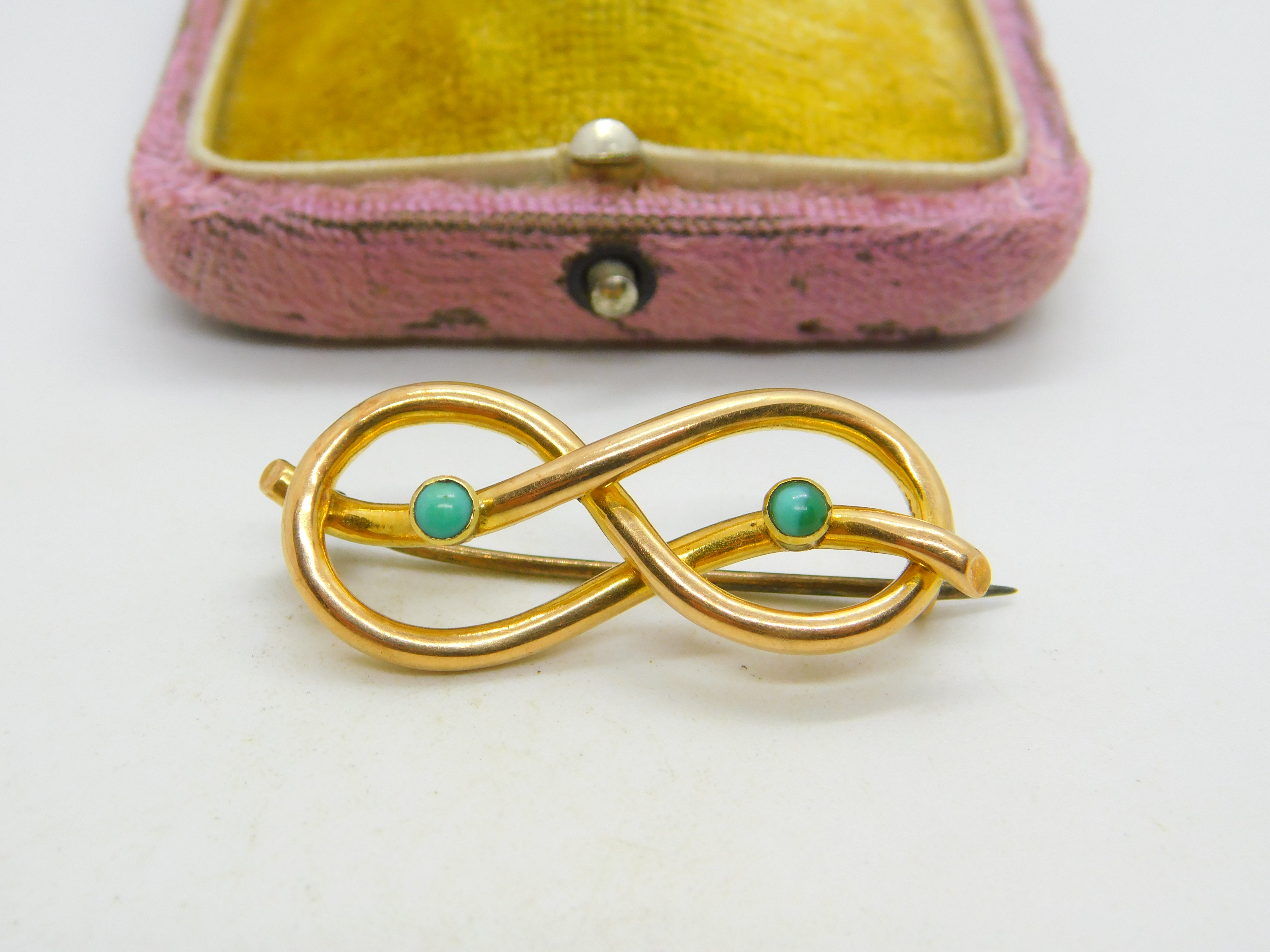 Victorian 15ct Gold & Turquoise Lovers Knot Sweetheart Brooch Antique c1880