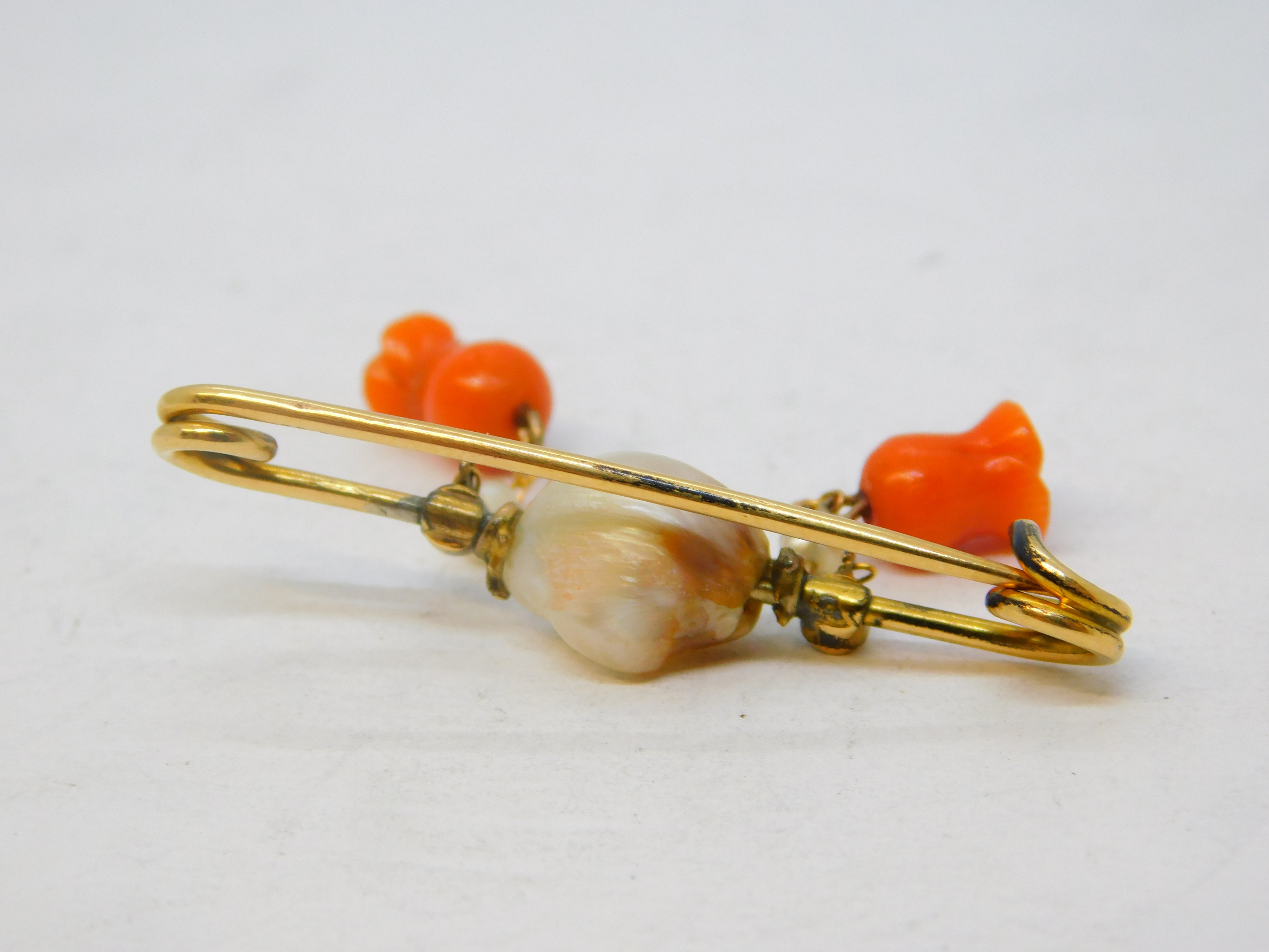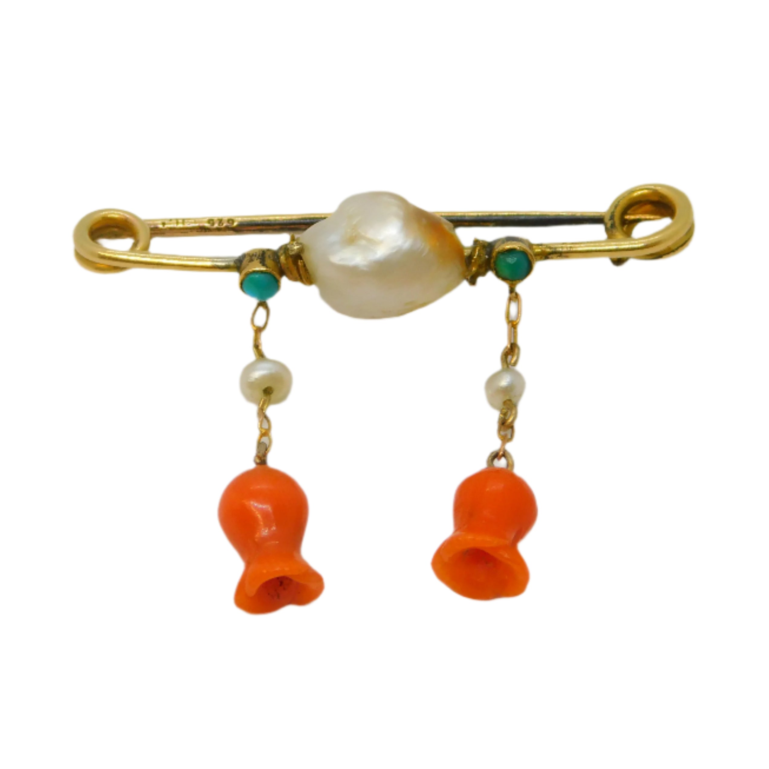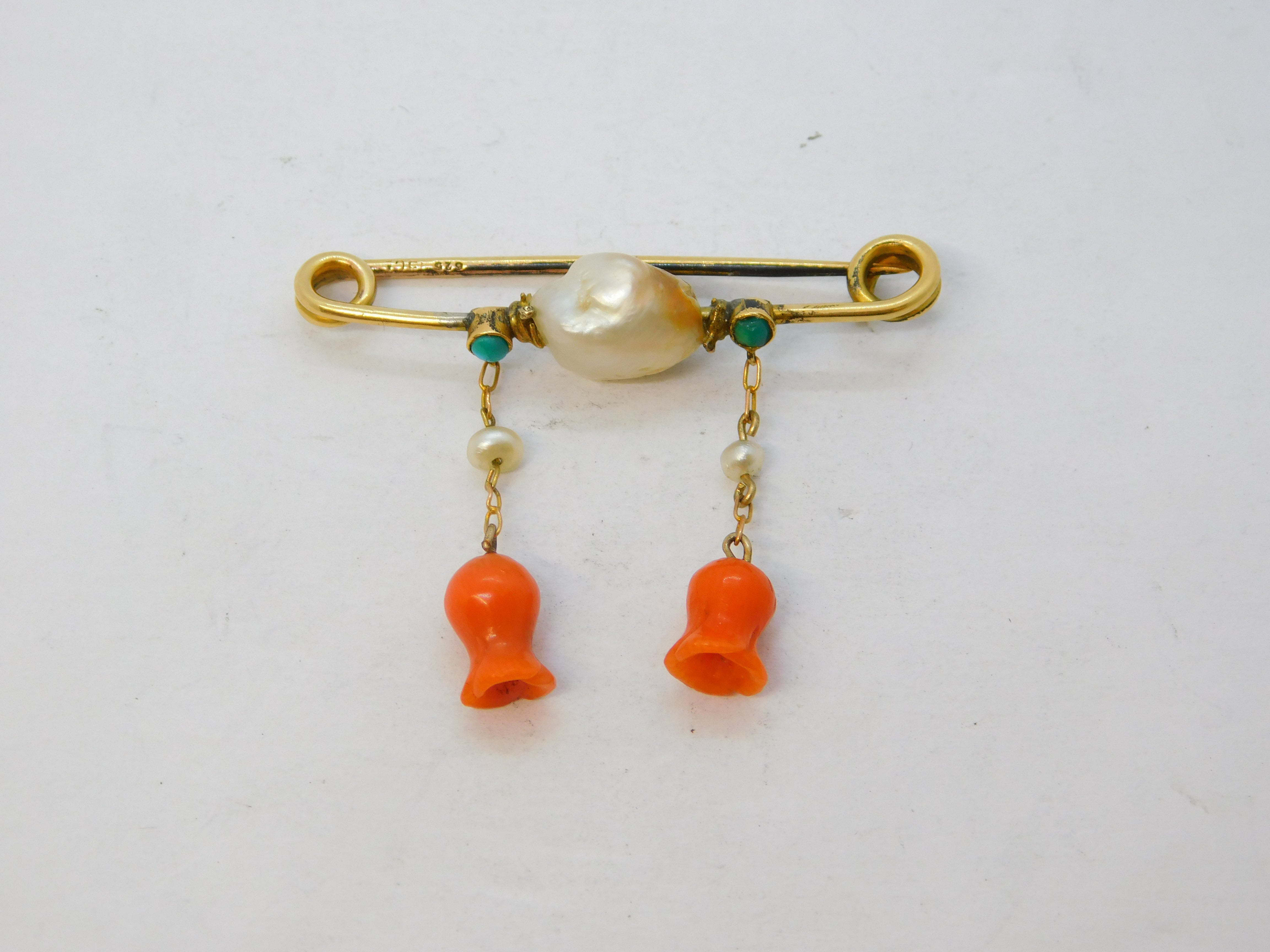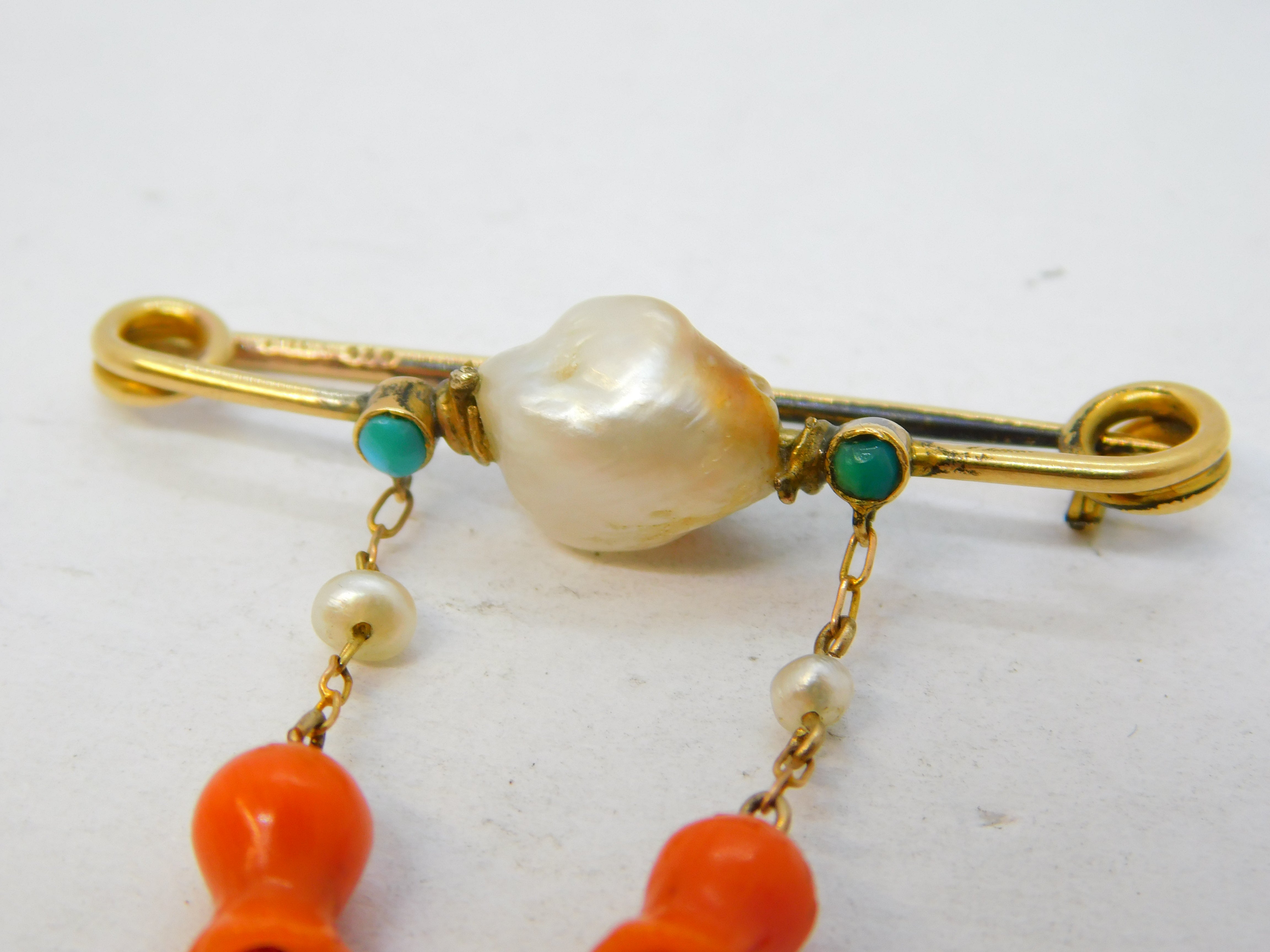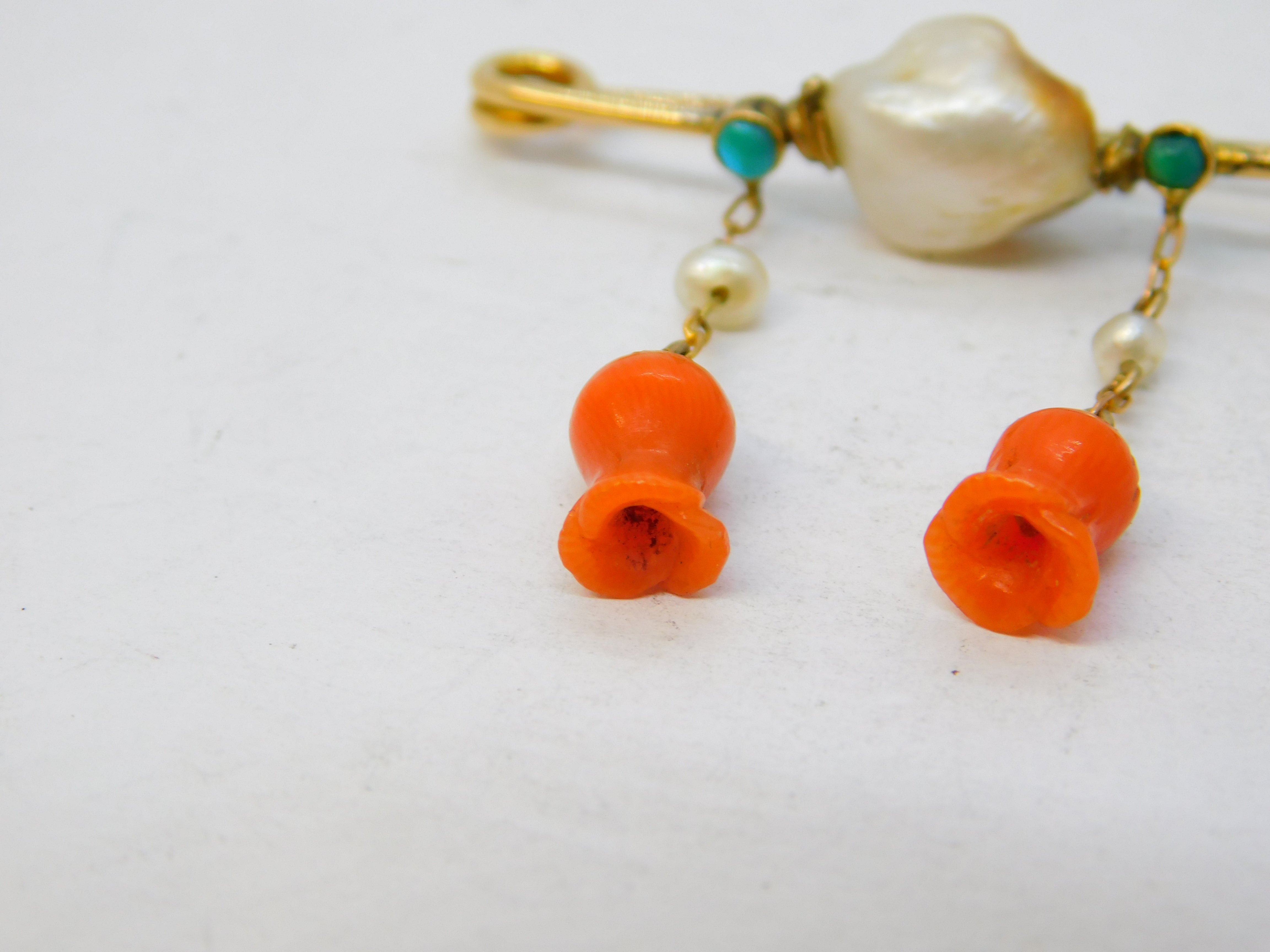 Details: A fantastic and wonderfully designed antique Victorian 15ct yellow gold dress brooch set with central blistered pearl flanked with small turquoise stones alongside drop pearls and two superb carved red coral flowers hallmarked to the back pin c1880. This is a wonderful item that would make a perfect gift or addition to any collection.
