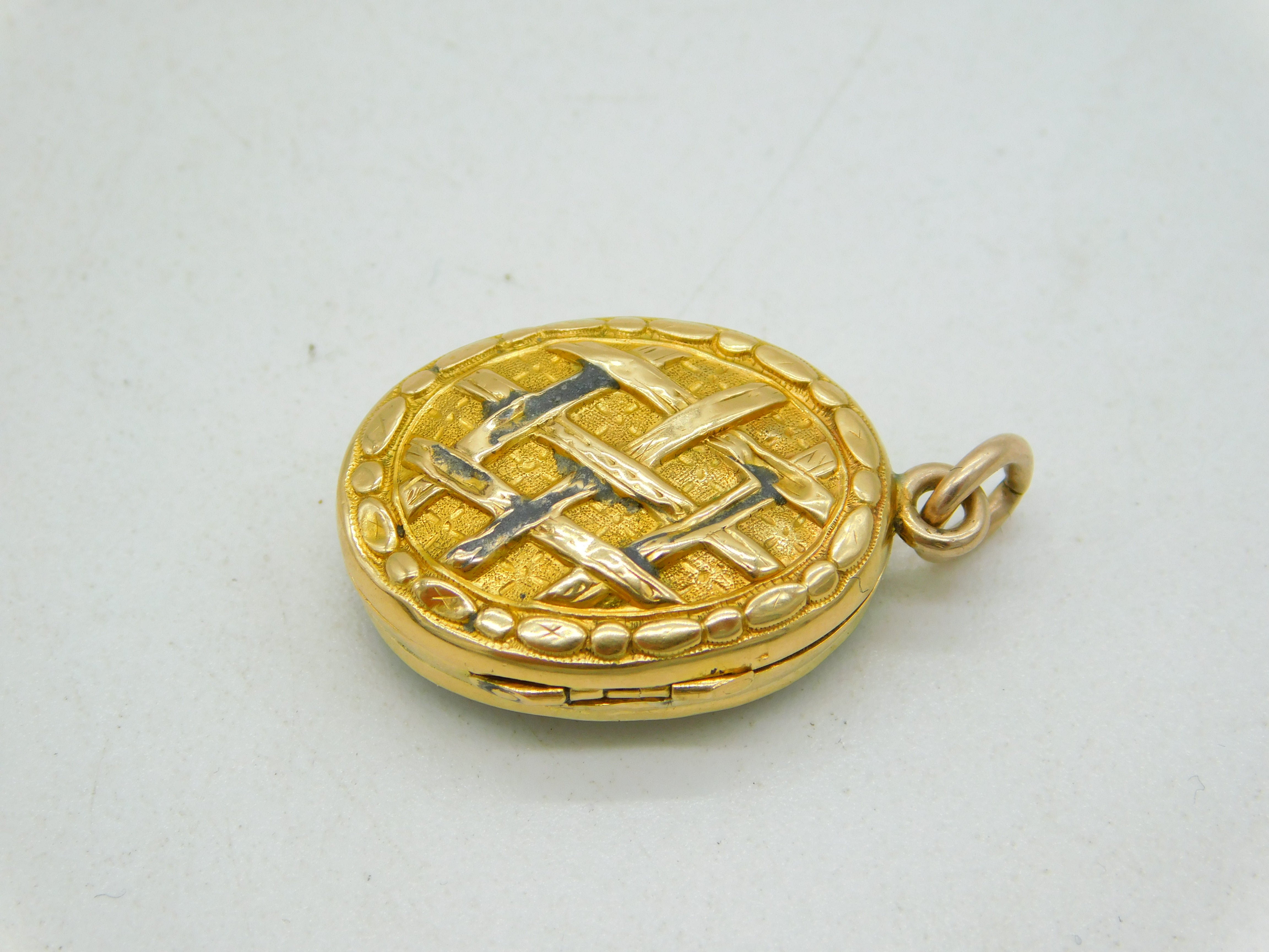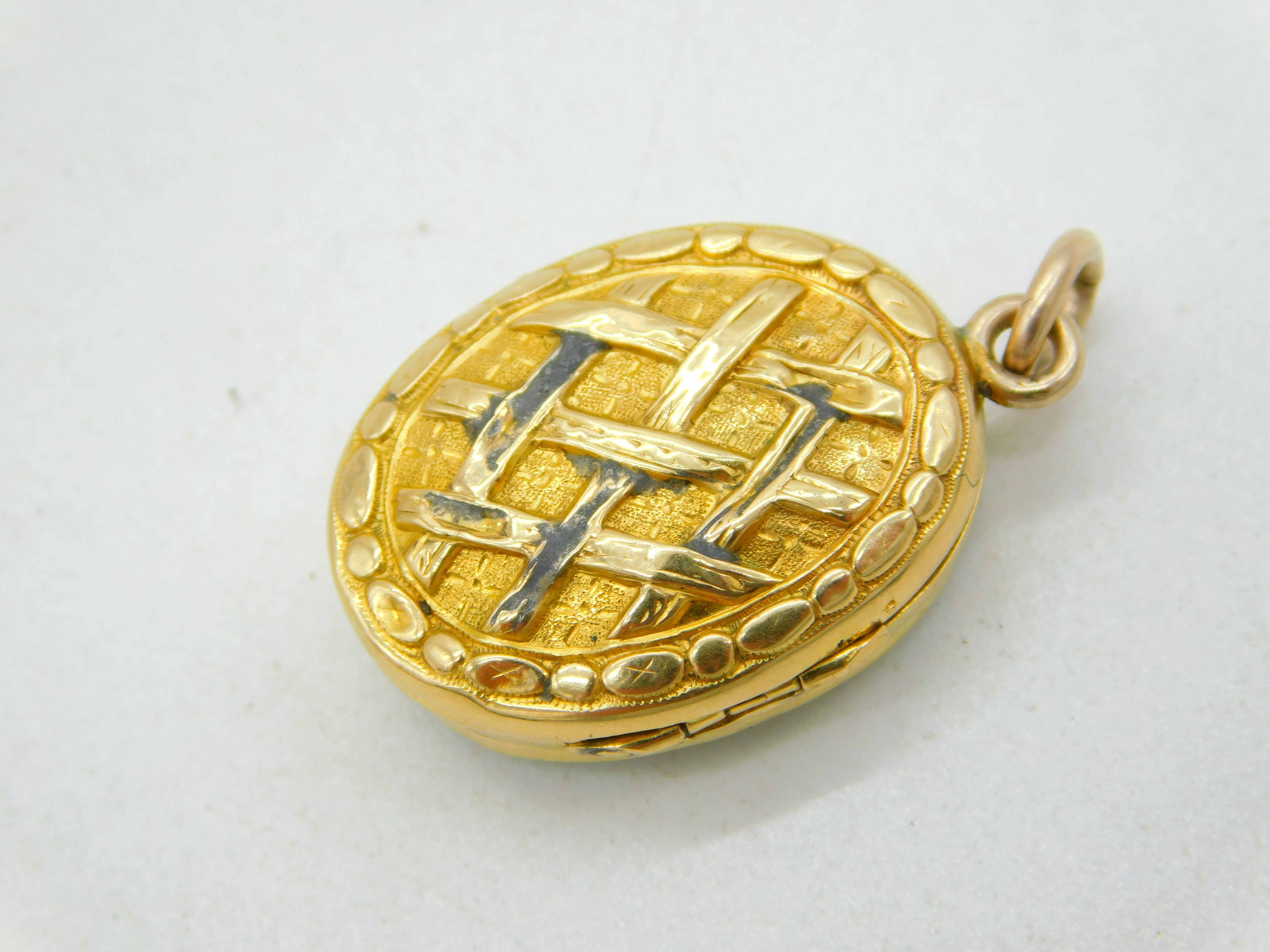 Details: A fantastic and wonderfully designed antique Victorian 15ct yellow gold mourning locket pendant set with section of blond hair c1860, the gold has been XRF tested as it is unmarked. This is a wonderful item that would make a perfect gift or addition to any collection.