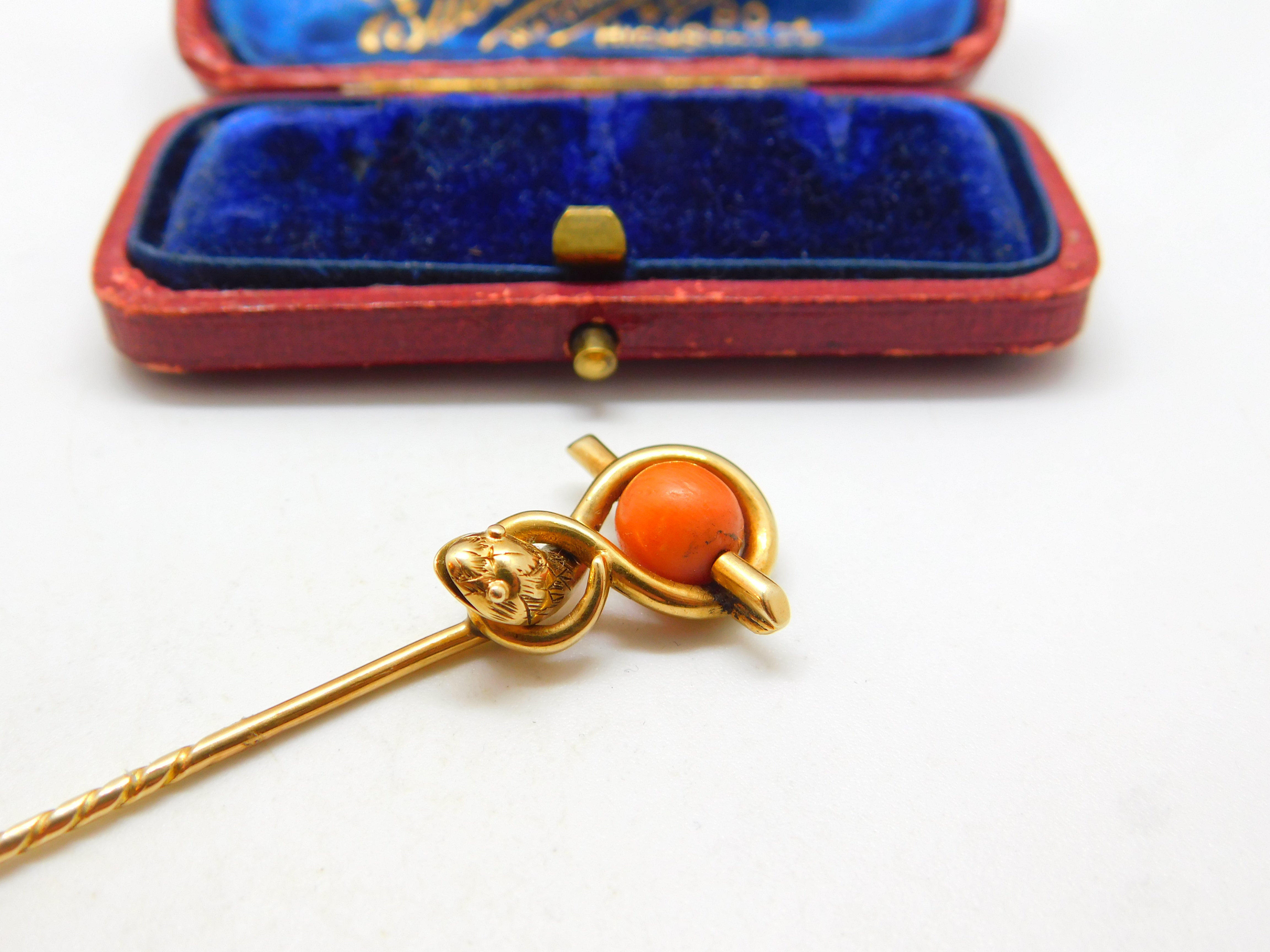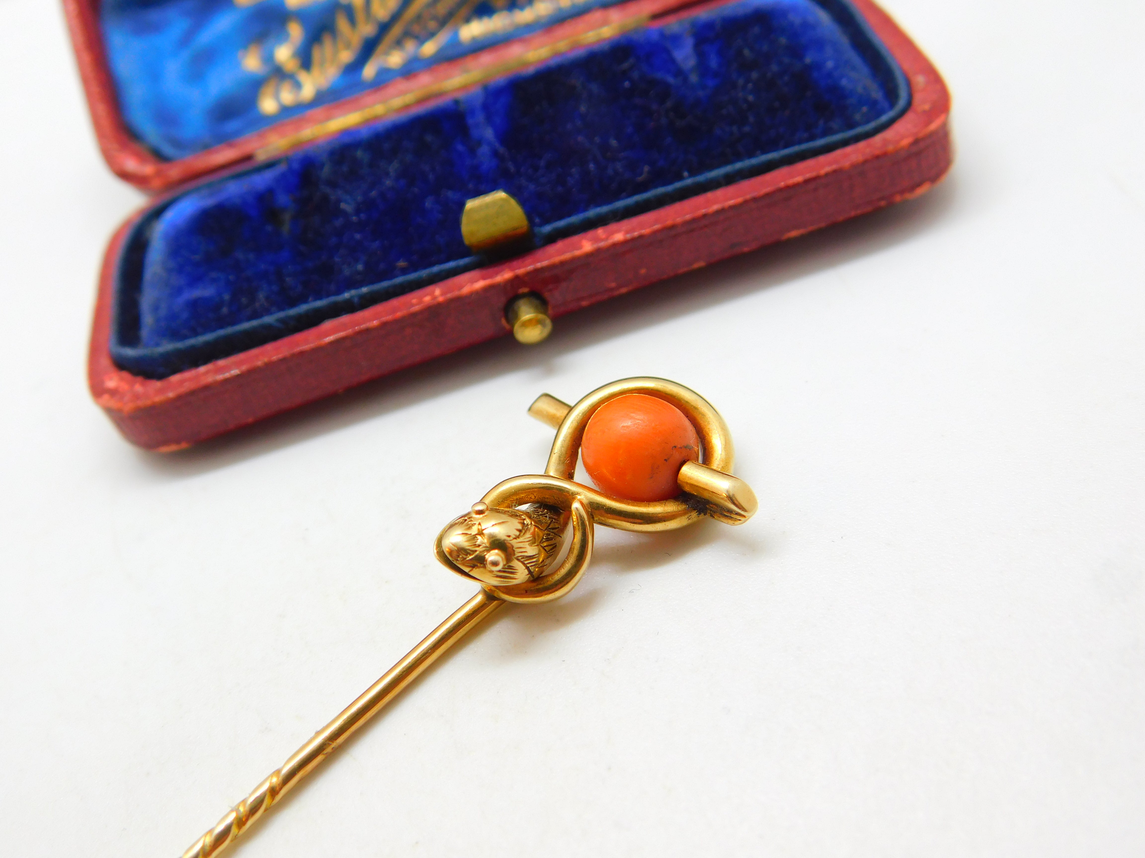 Details: A fantastic and wonderfully designed antique Victorian 15ct yellow gold large stick pin set with a lovely red coral bead in the form of a serpent or snake c1880 - the gold has been XRF tested only makers marks to the reverse. This is a wonderful item that would make a perfect gift or addition to any collection. The BOX pictured is for PRESENTATION ONLY and is NOT included in the listings but used to frame the pictures unless specifically stated otherwise.