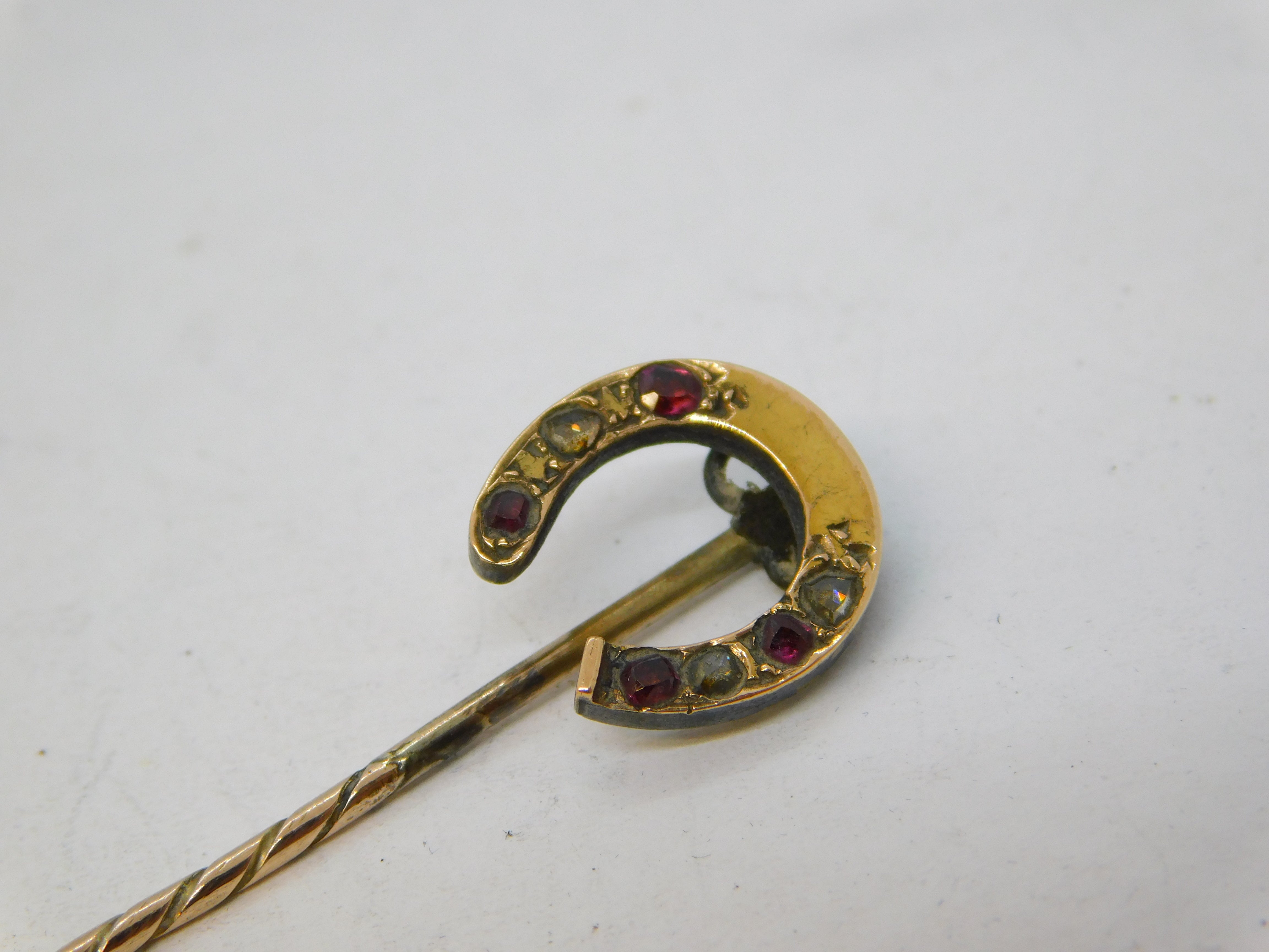 Details: A fantastic and wonderfully designed antique Victorian 15ct yellow gold lucky horseshoe stick pin set with old-cut diamonds and rubies c1880, the gold has been XRF tested as it is unmarked. This is a wonderful item that would make a perfect gift or addition to any collection.