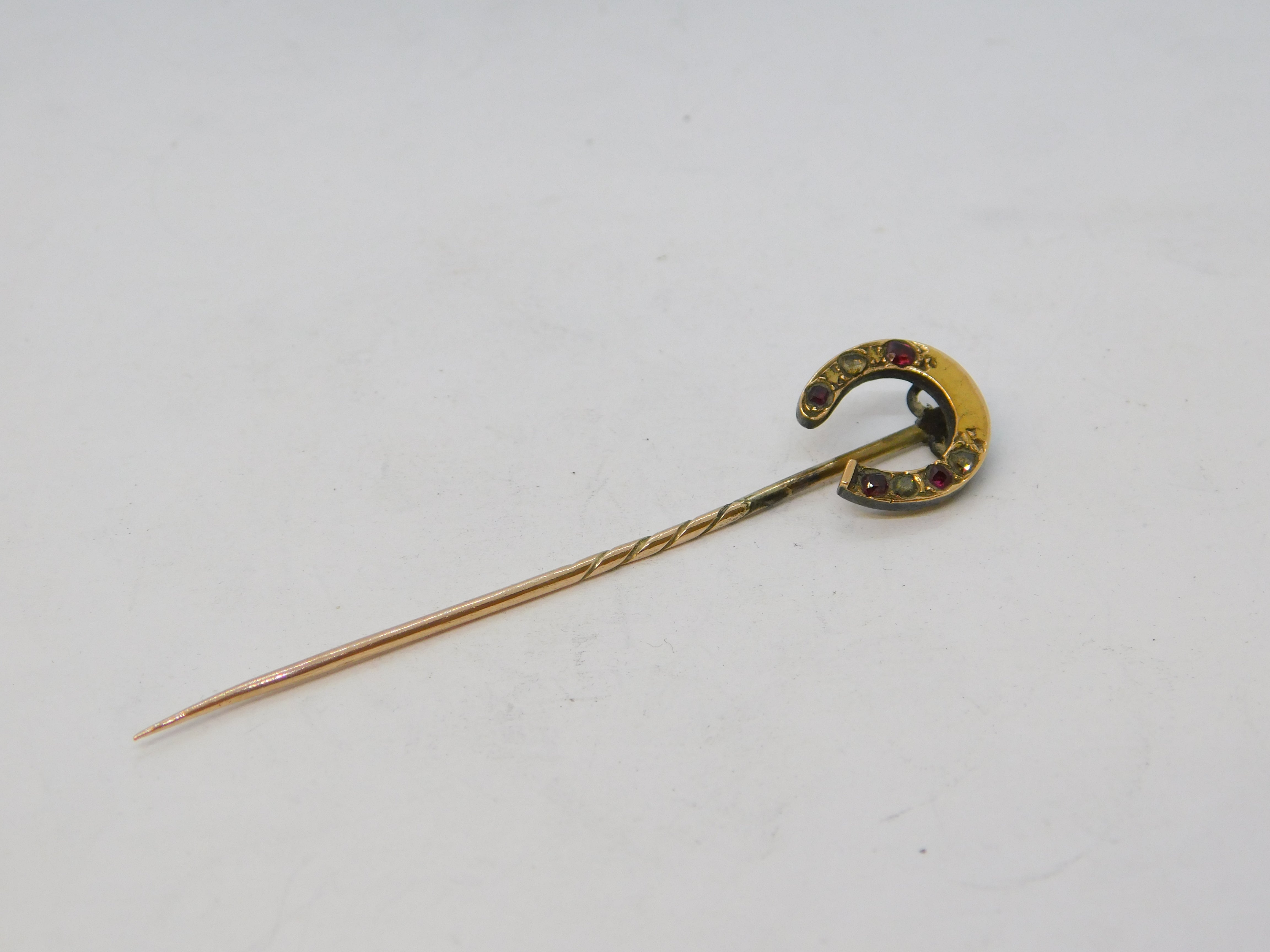 Victorian 15ct Yellow Gold, Diamond & Ruby Horseshoe Stick Pin Antique c1880