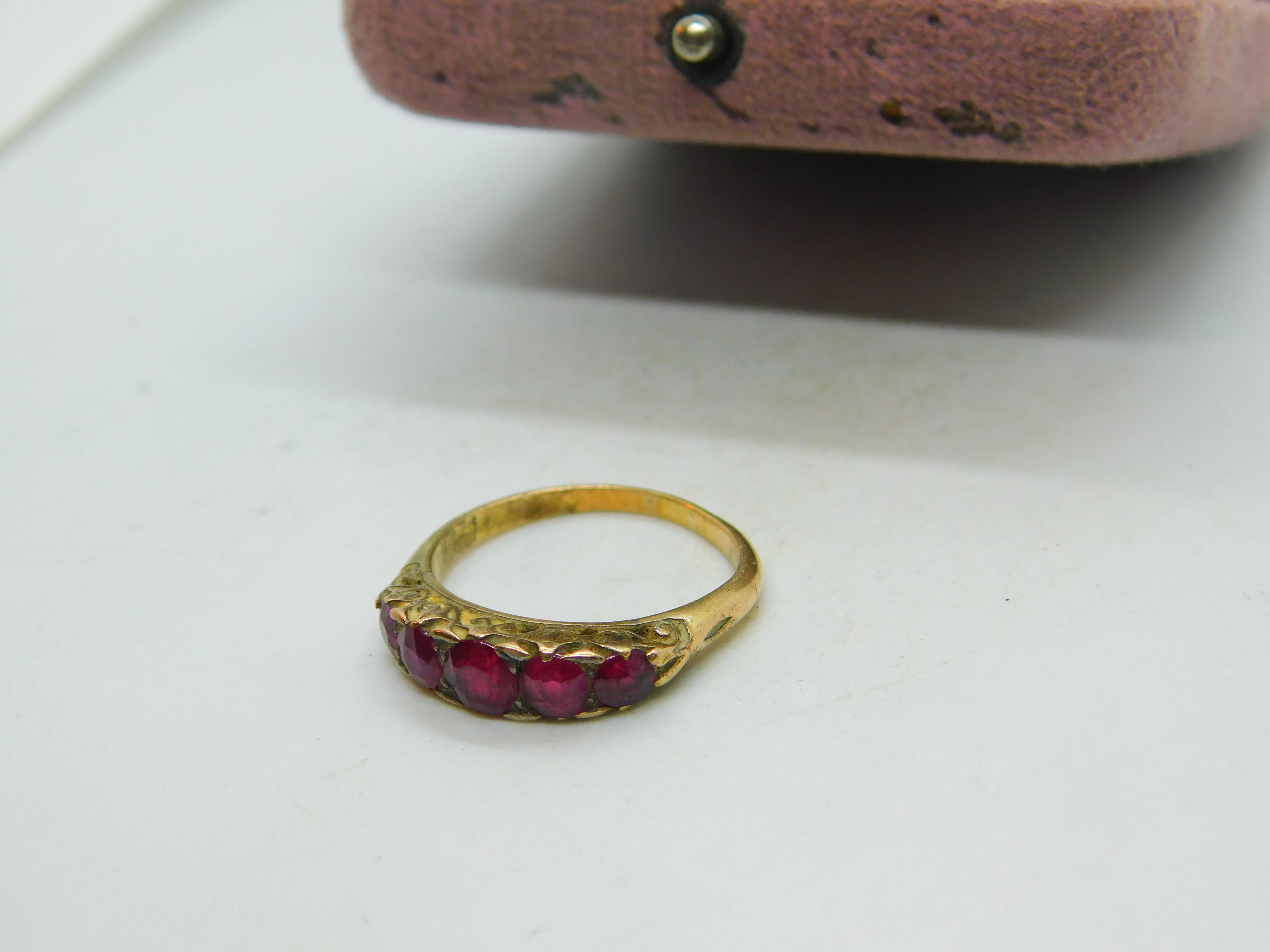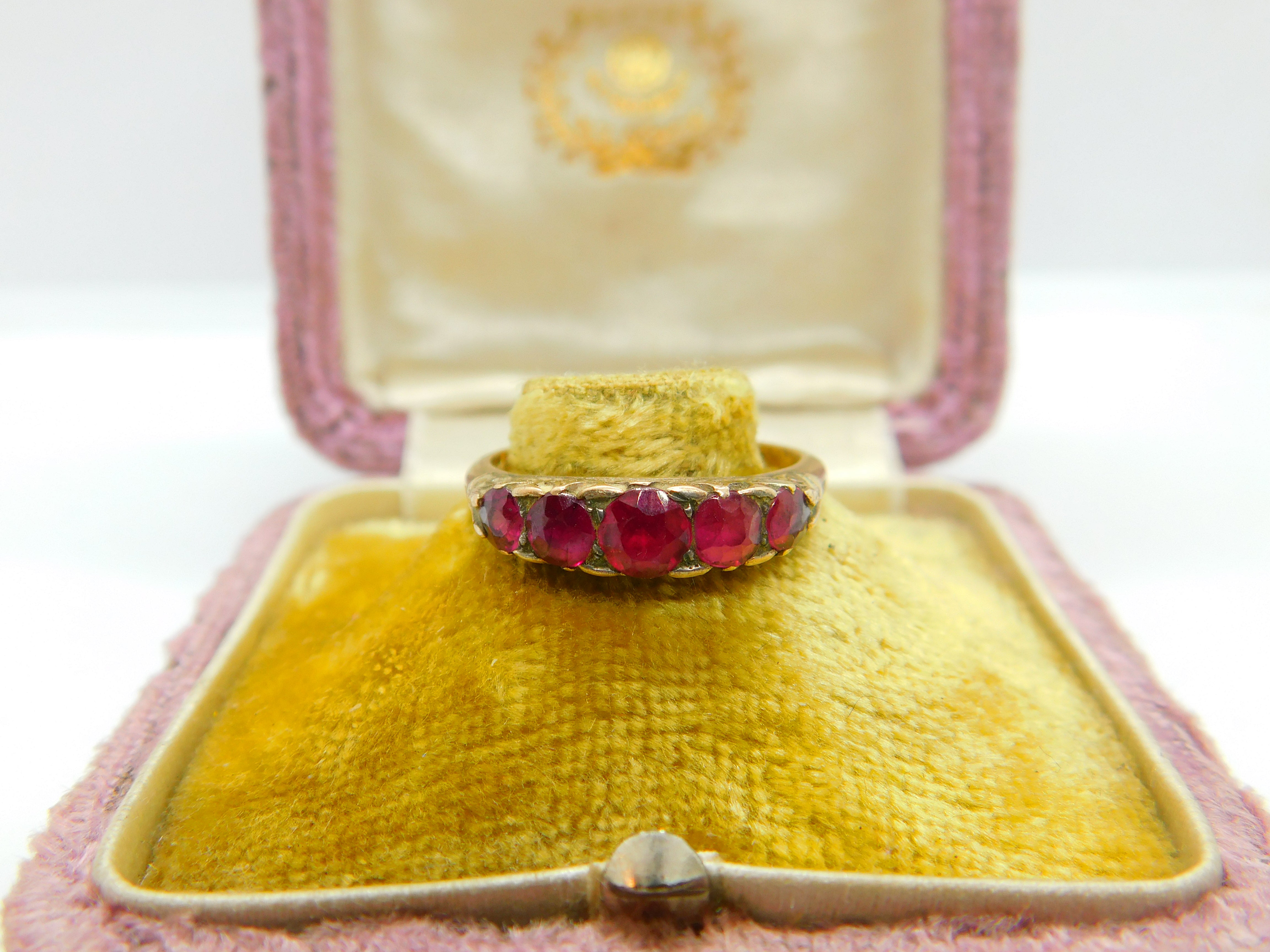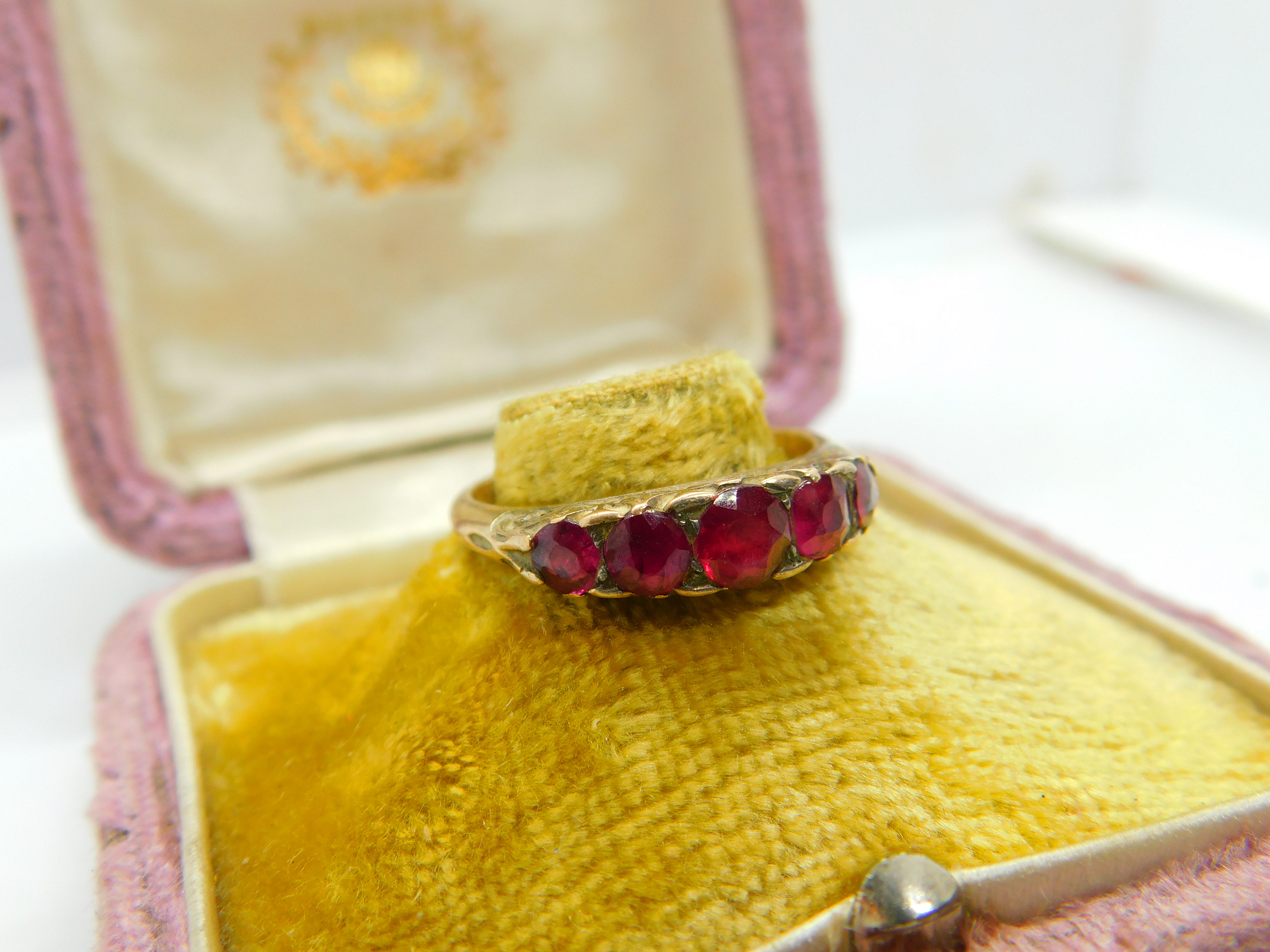 Victorian 15ct Yellow Gold & Five Stone Ruby Band Ring Antique c1890