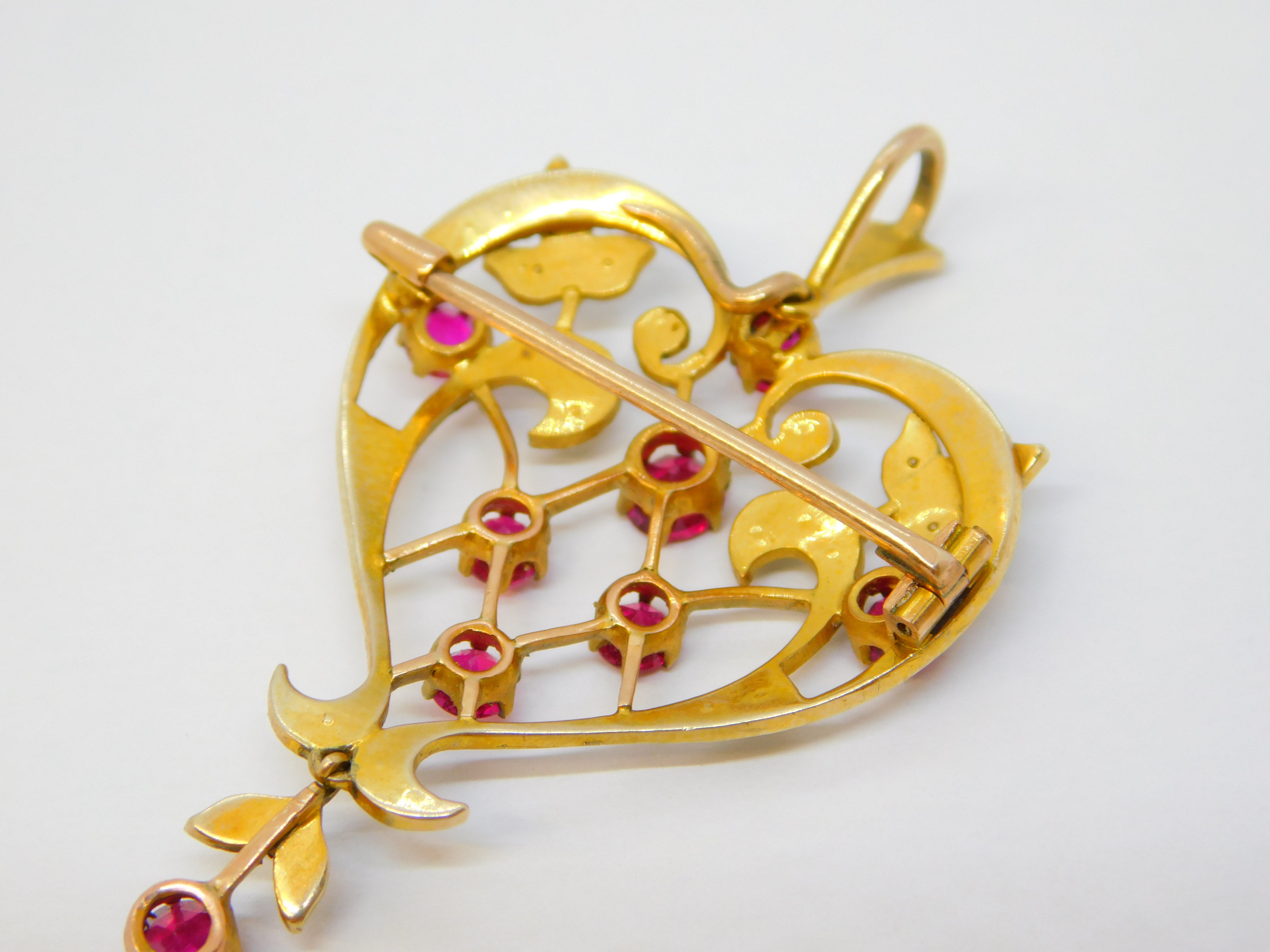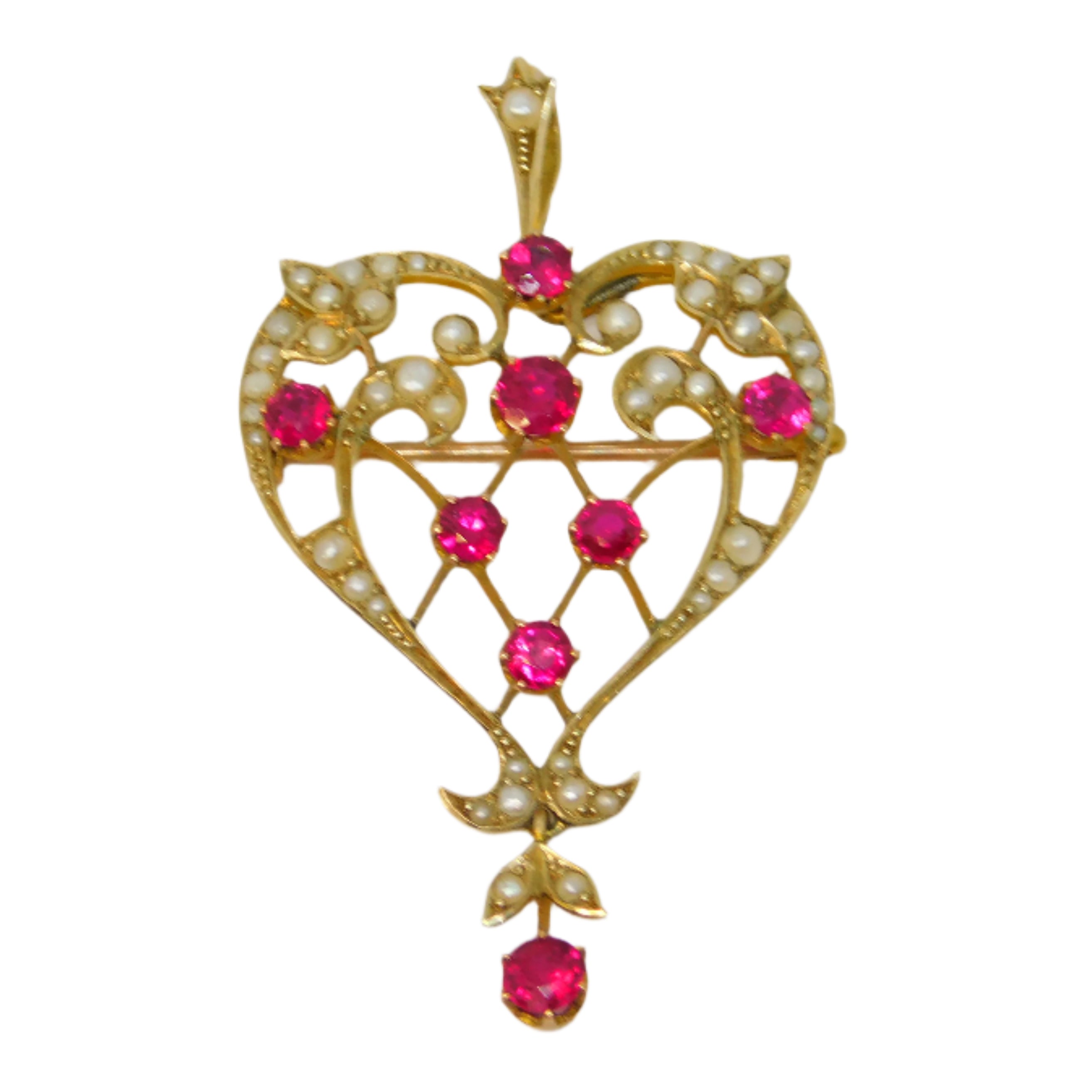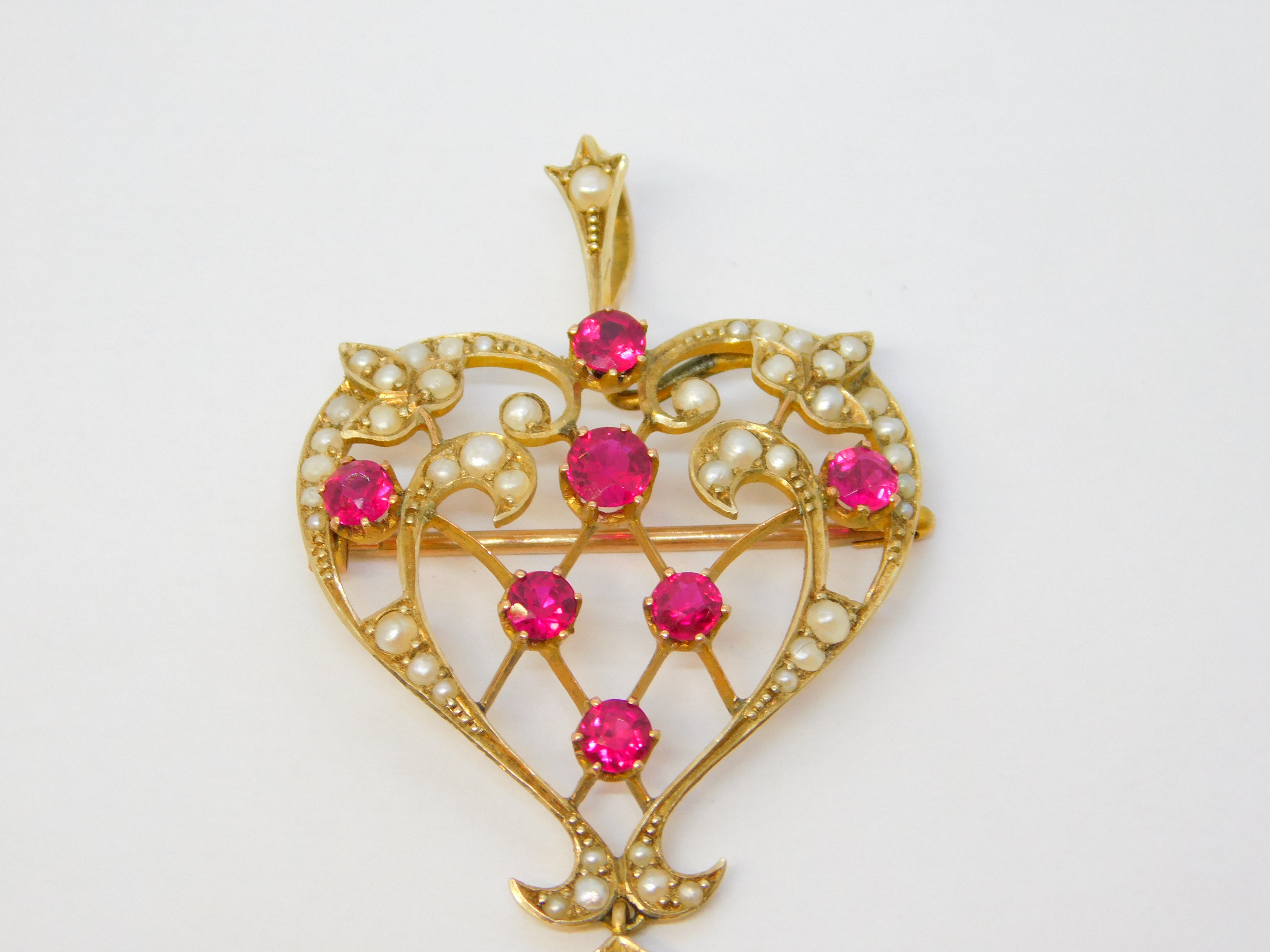 Victorian 15ct Yellow Gold, Red Paste & Seed Pearl Lavalier Drop Pendant Antique