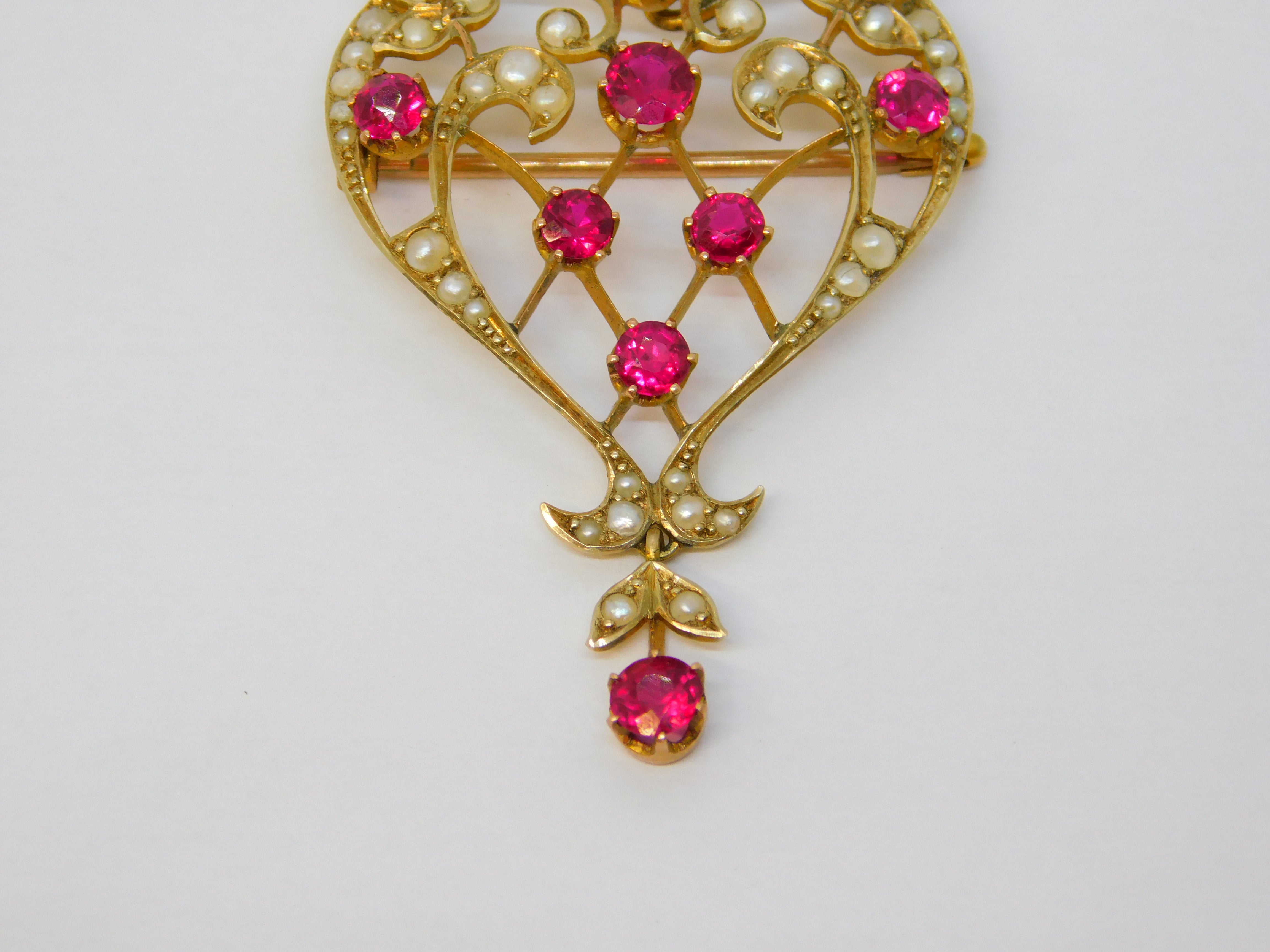Details: A fantastic and wonderfully designed antique Victorian 15ct yellow gold large lavalier drop pendant set throughout with pink stones alongside seed pearls c1890, the gold has been XRF tested as it is unmarked. This is a wonderful item that would make a perfect gift or addition to any collection.
