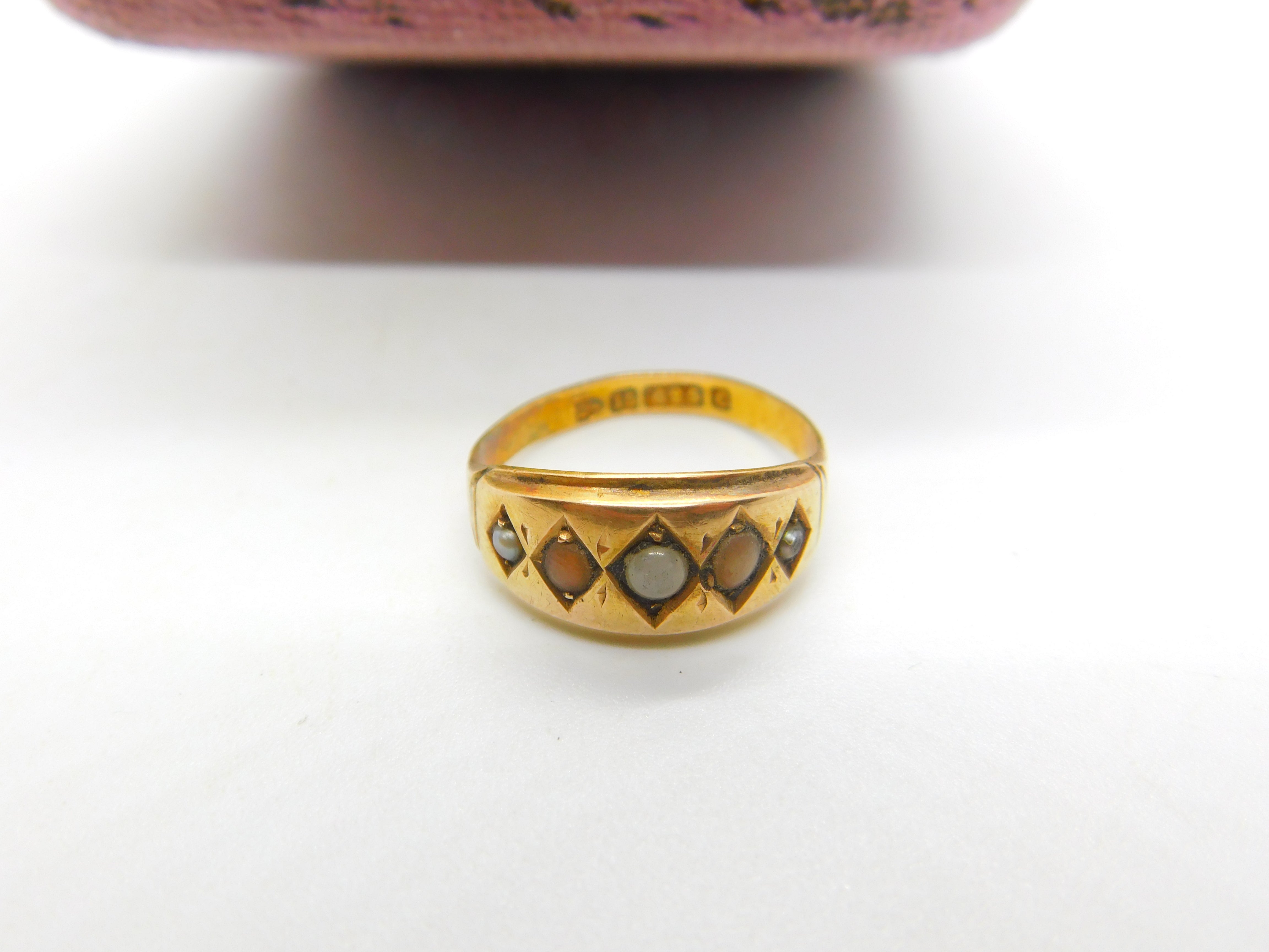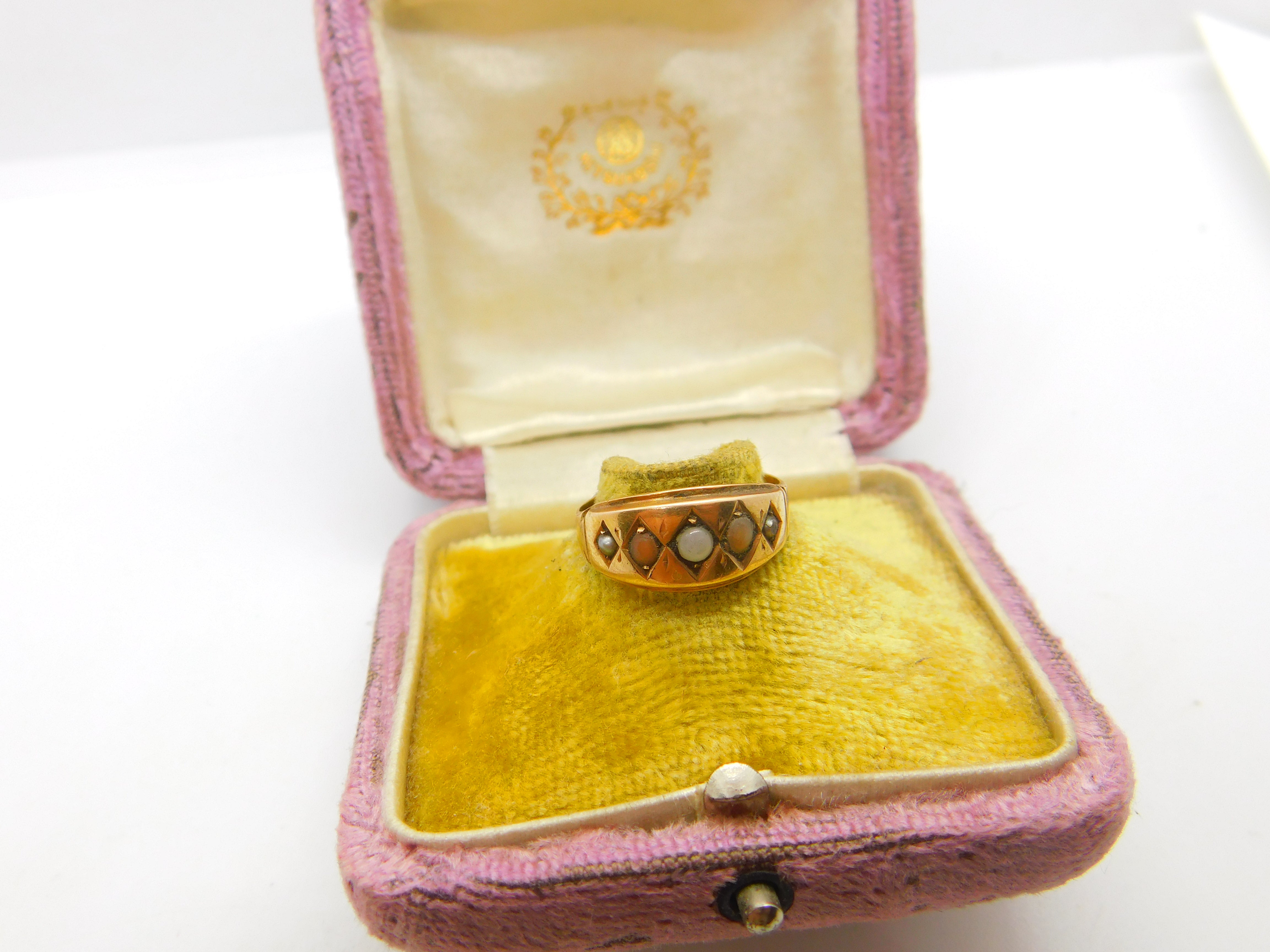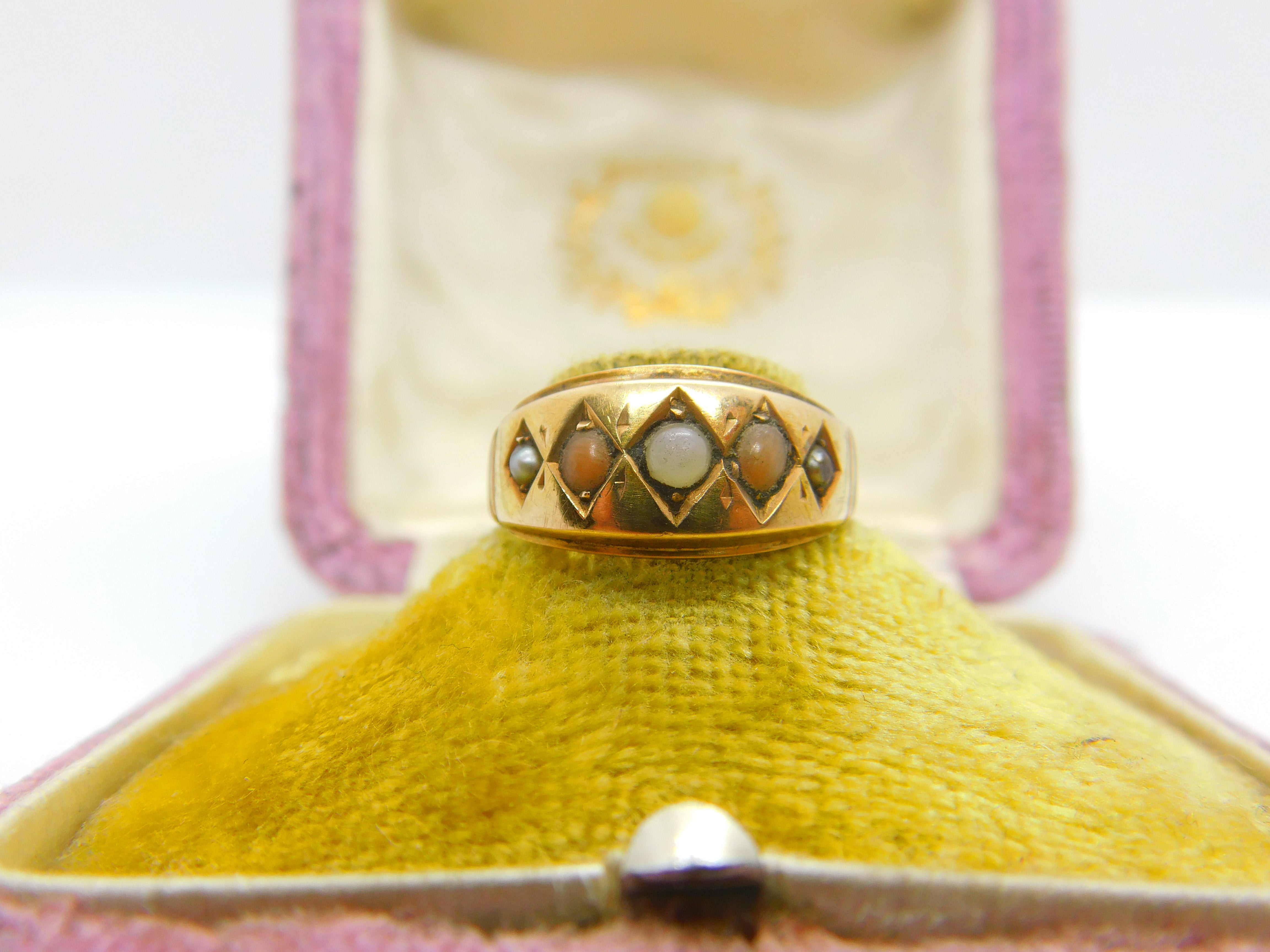 Victorian 15ct Yellow Gold, Seed Pearl & Coral Boat Ring 1886 Chester Antique