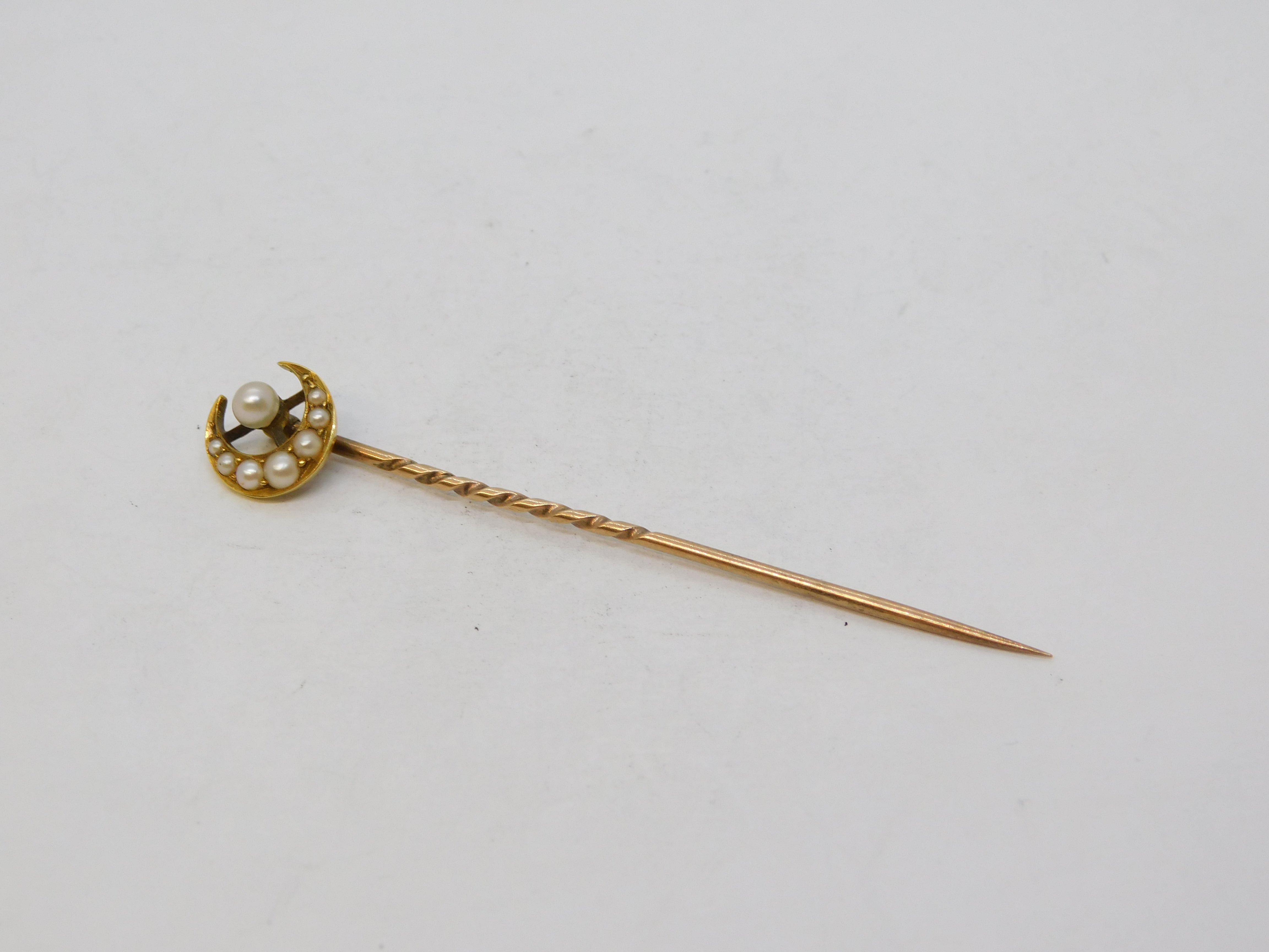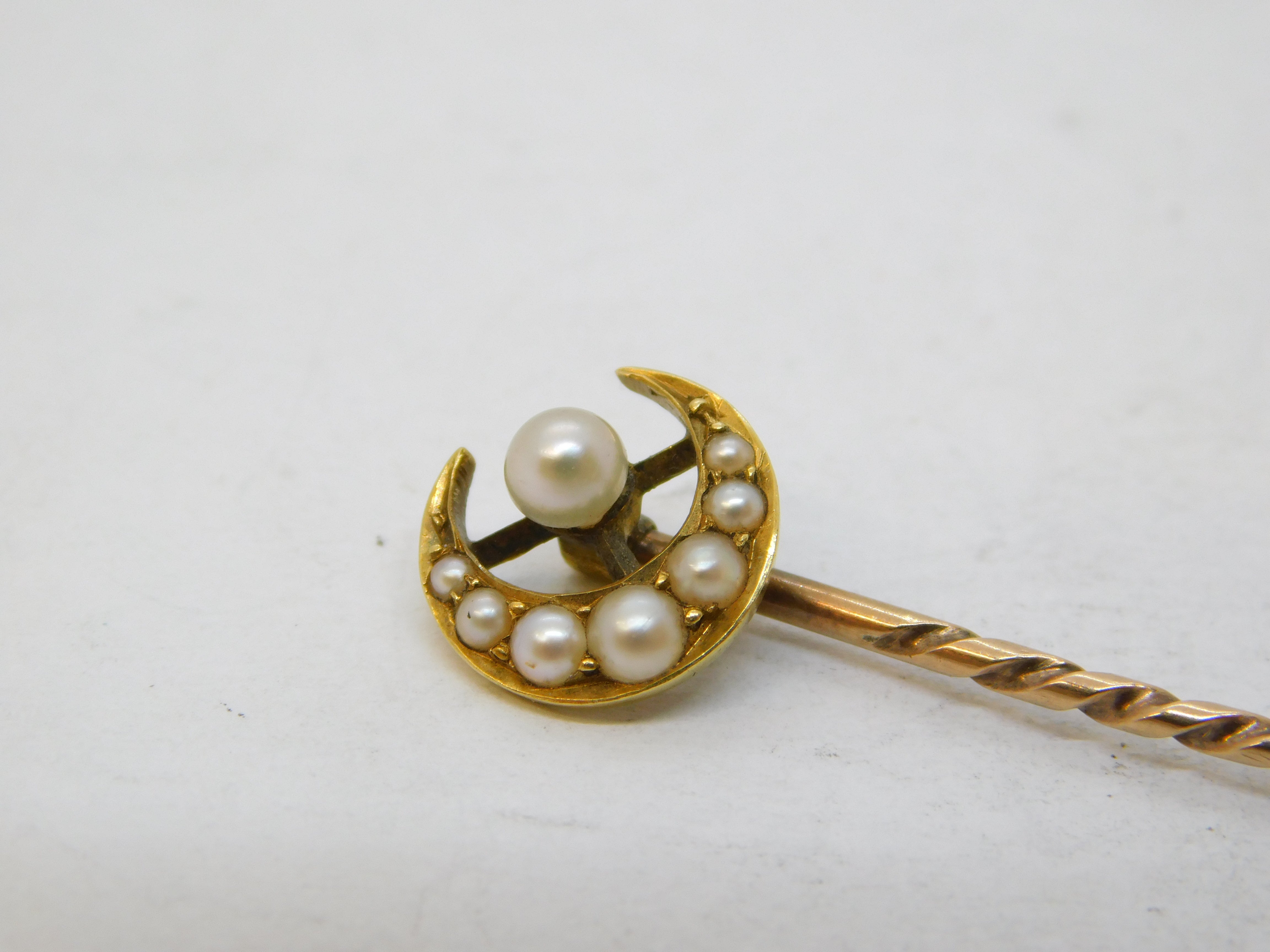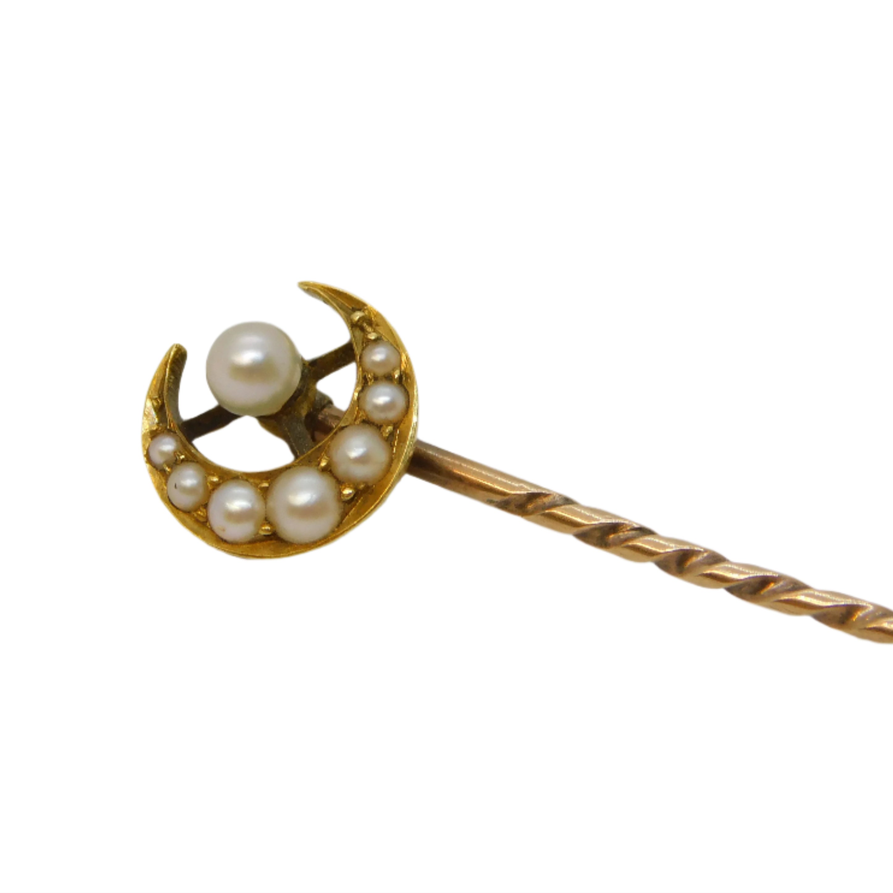 Victorian 15ct Yellow Gold Seed Pearl Crescent Moon Stick Pin Antique c1880