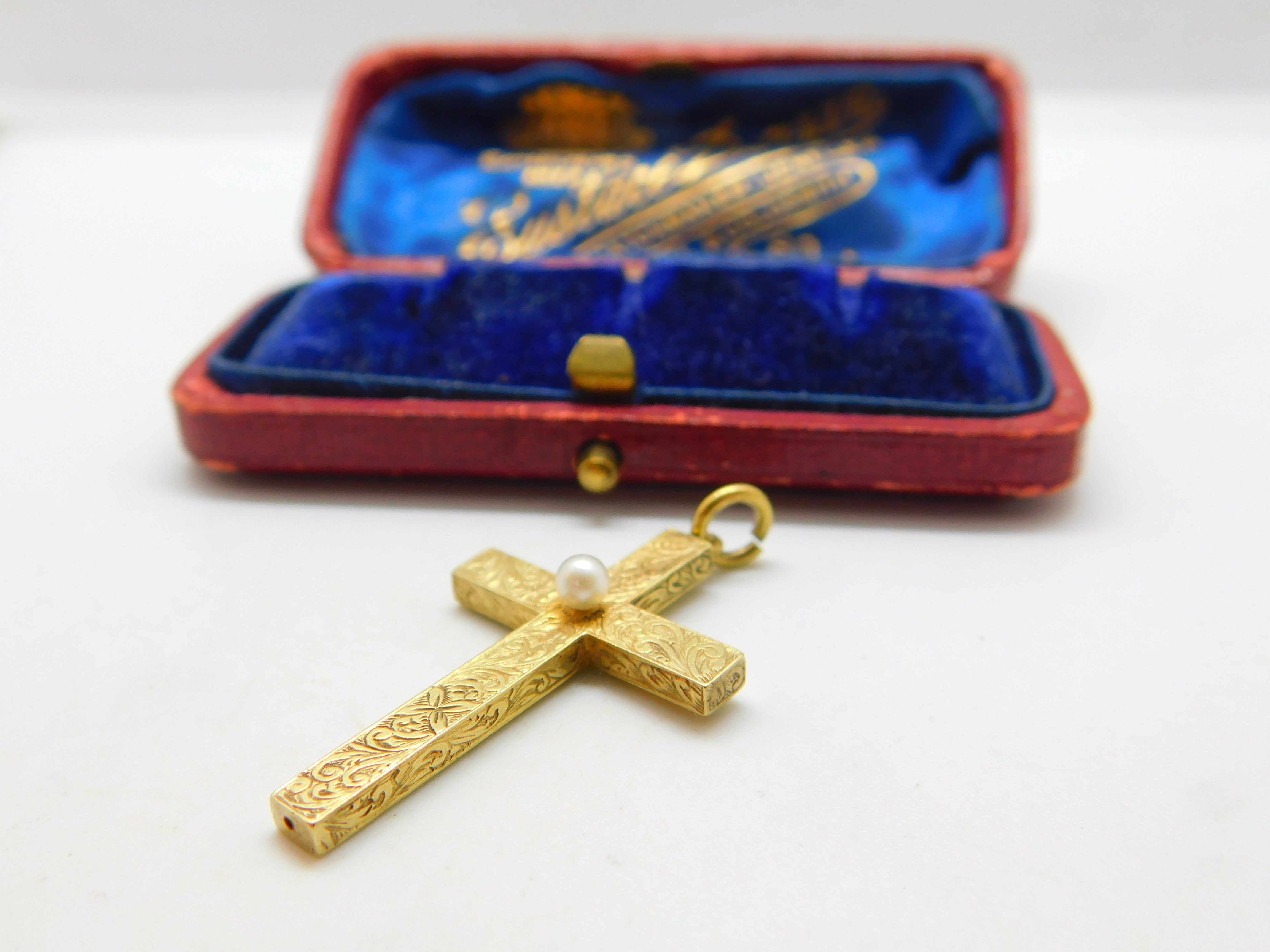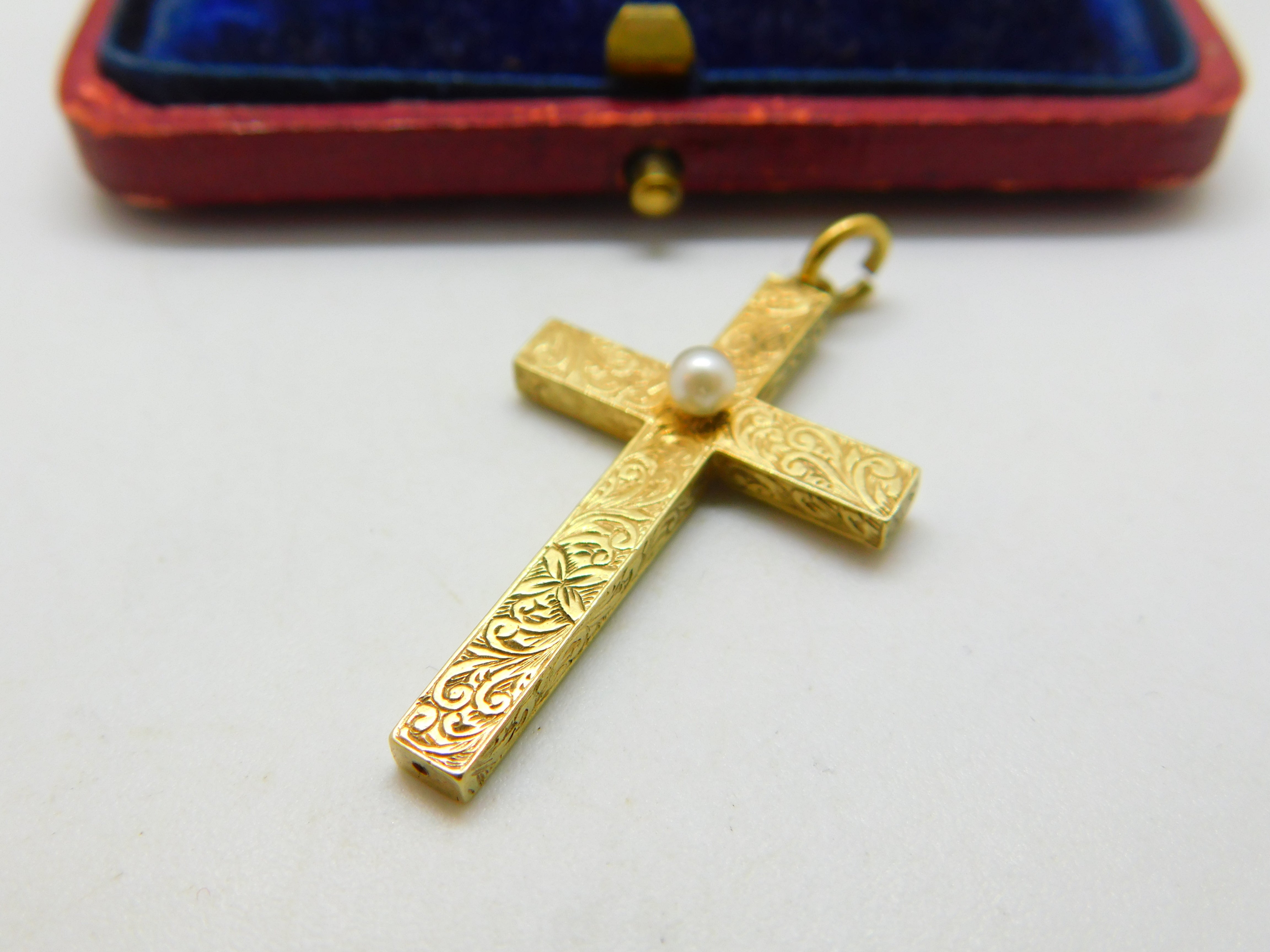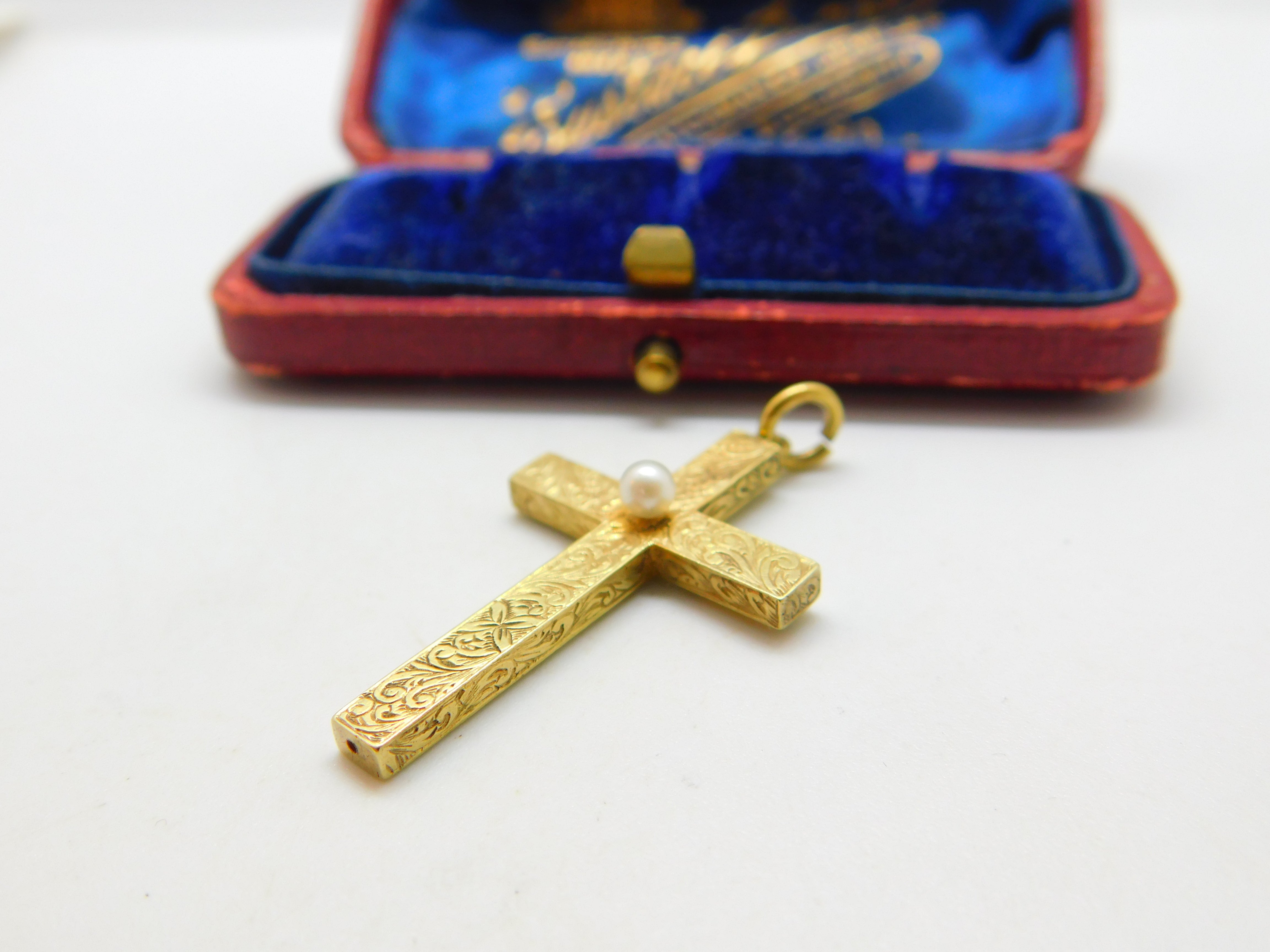 Victorian 15ct Yellow Gold & Seed Pearl Floral Cross Pendant Antique c1860