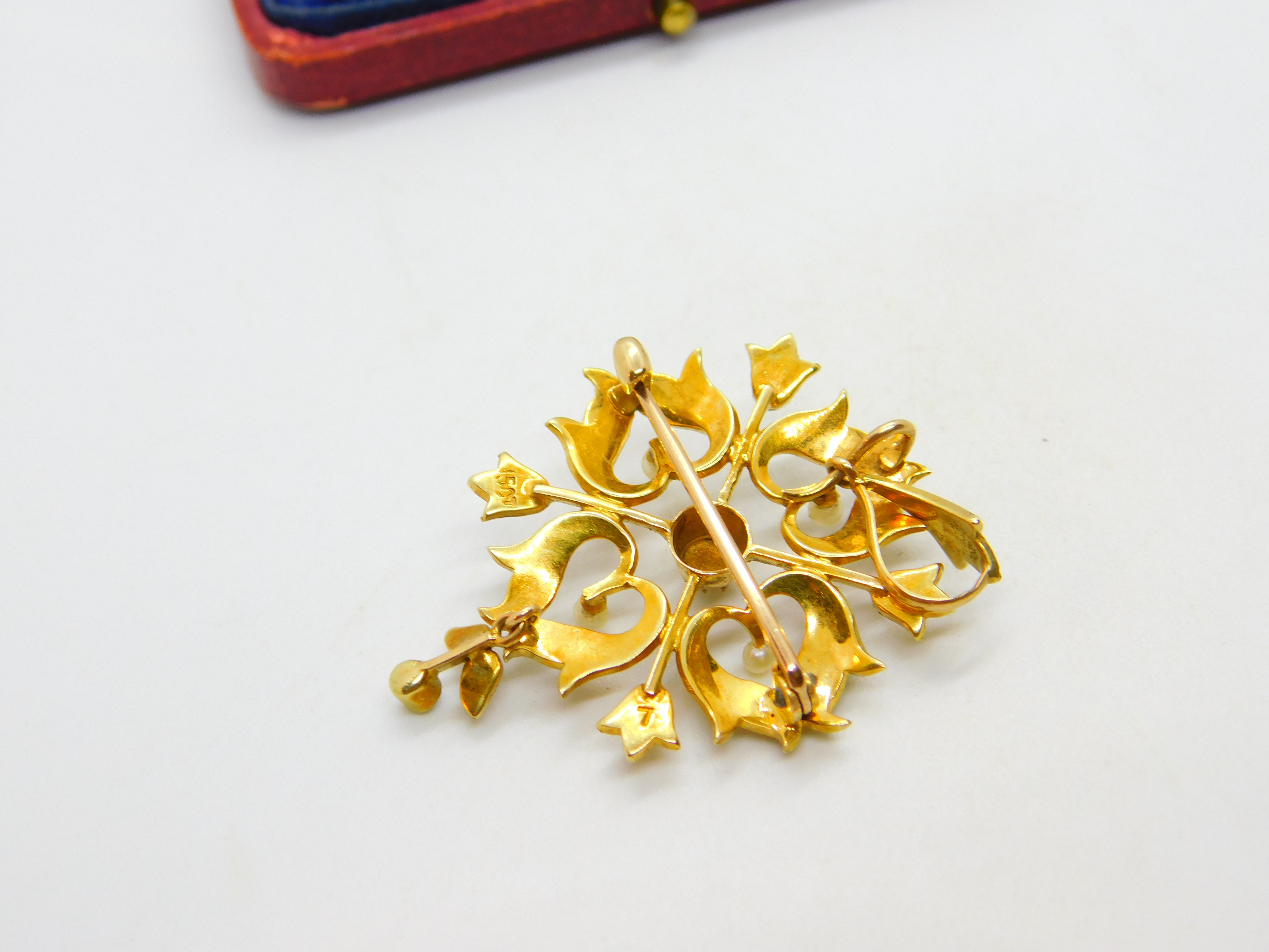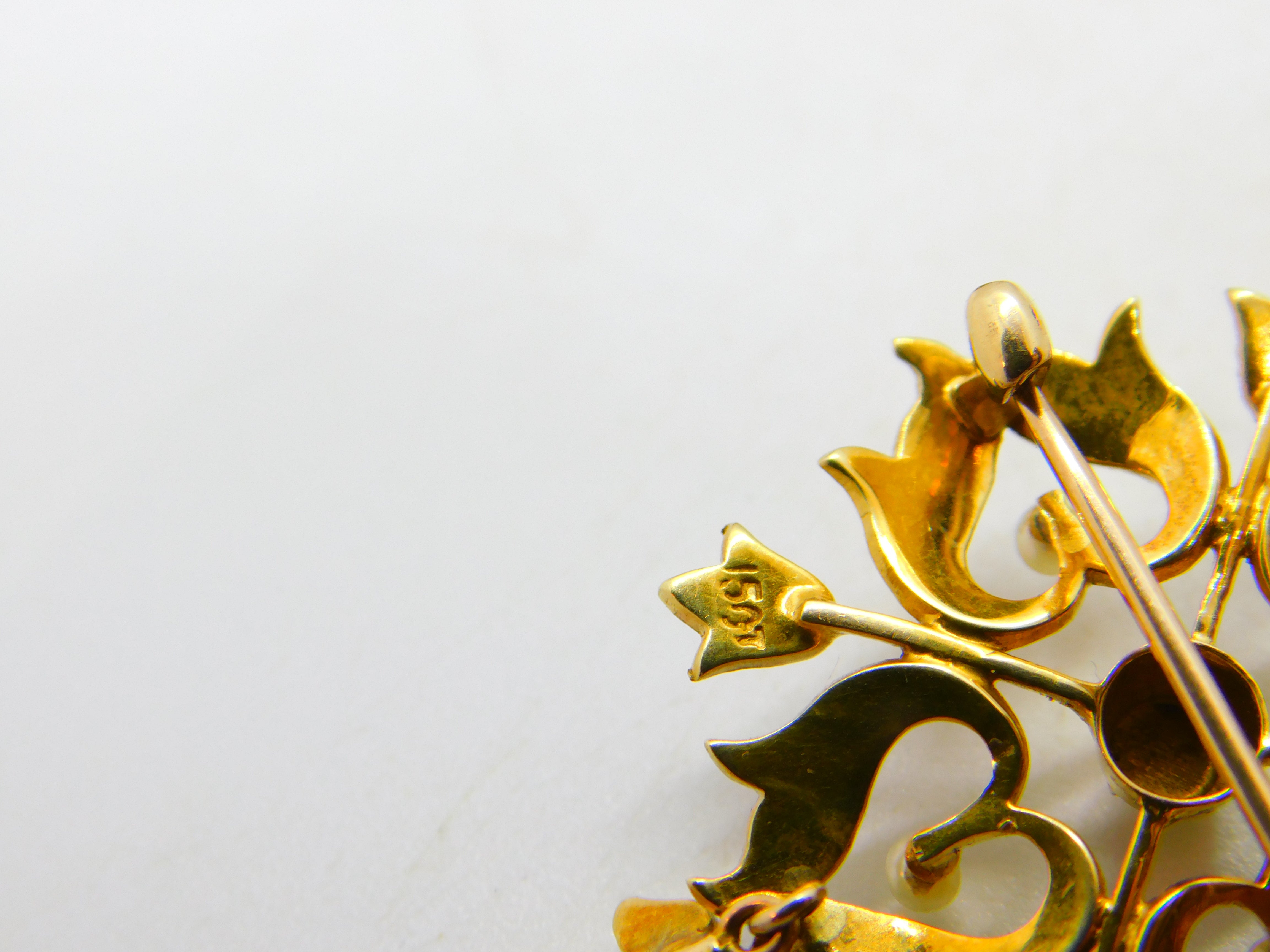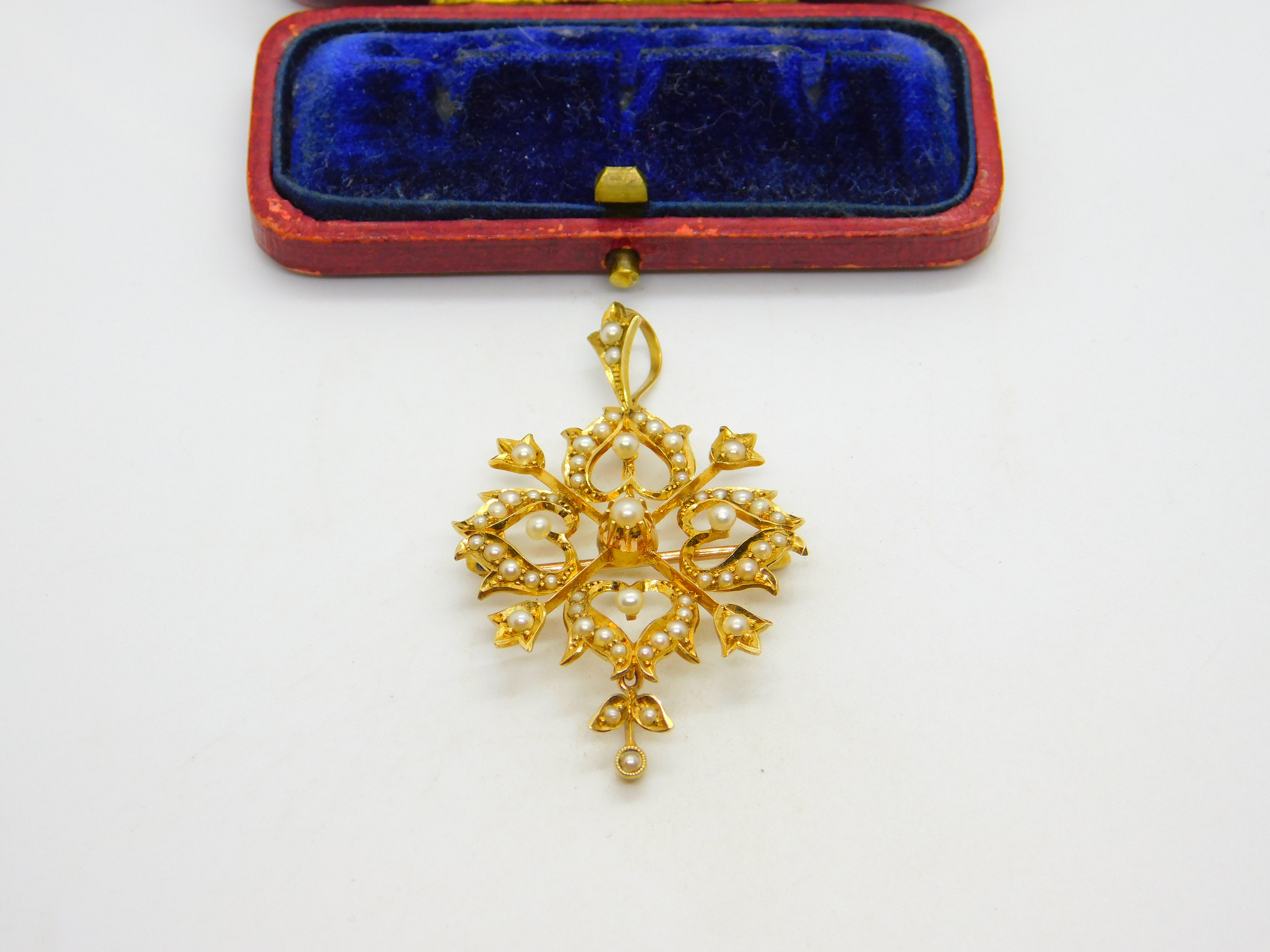 Details: A fantastic and wonderfully designed antique Victorian 15ct yellow gold floral lavalier drop pendant set throughout with seed pearls hallmarked '15ct' to the reverse c1890. Superb condition, could also be worn as a brooch. This is a wonderful item that would make a perfect gift or addition to any collection. The BOX pictured is for PRESENTATION ONLY and is NOT included in the listings but used to frame the pictures unless specifically stated otherwise.
