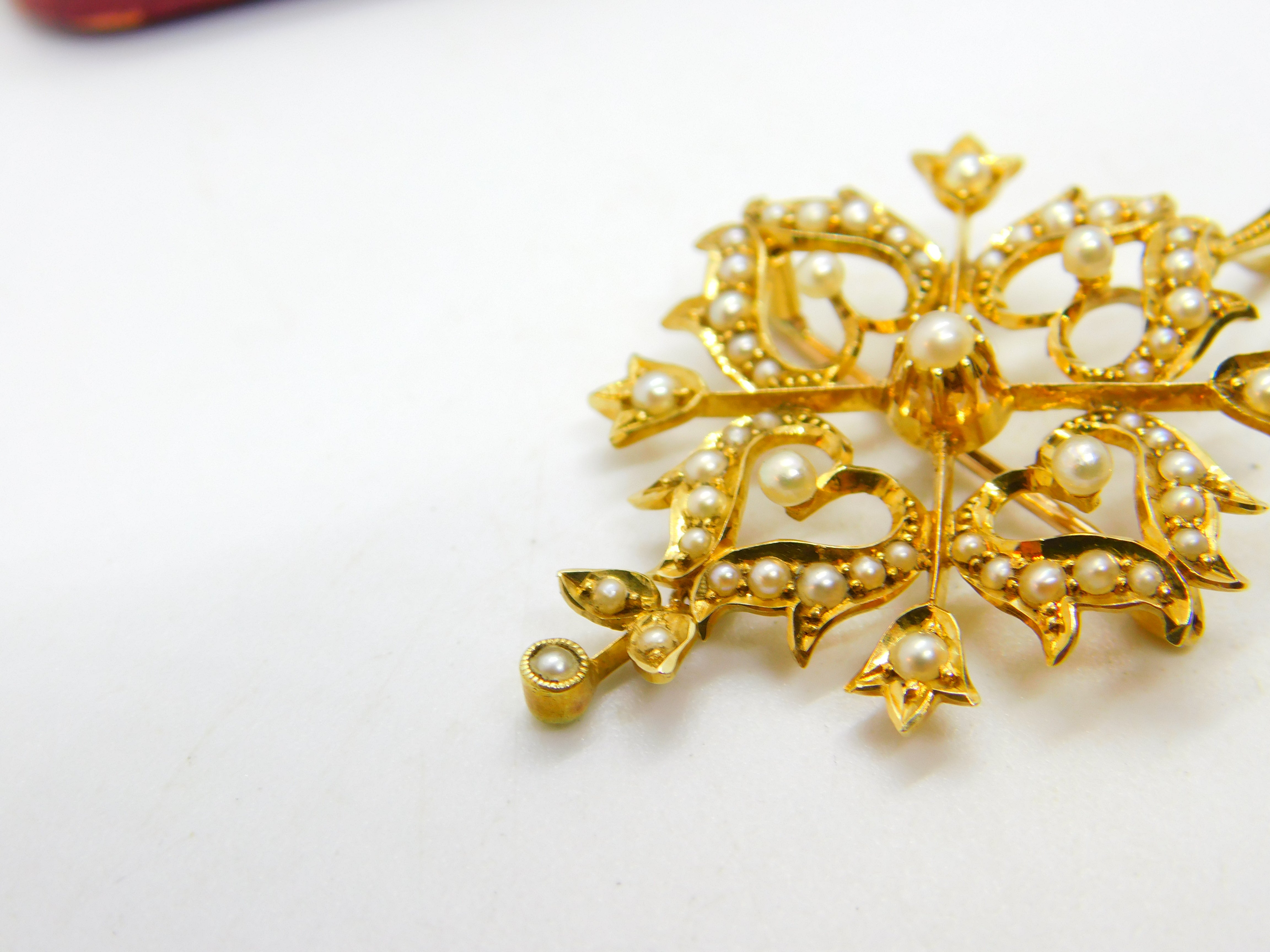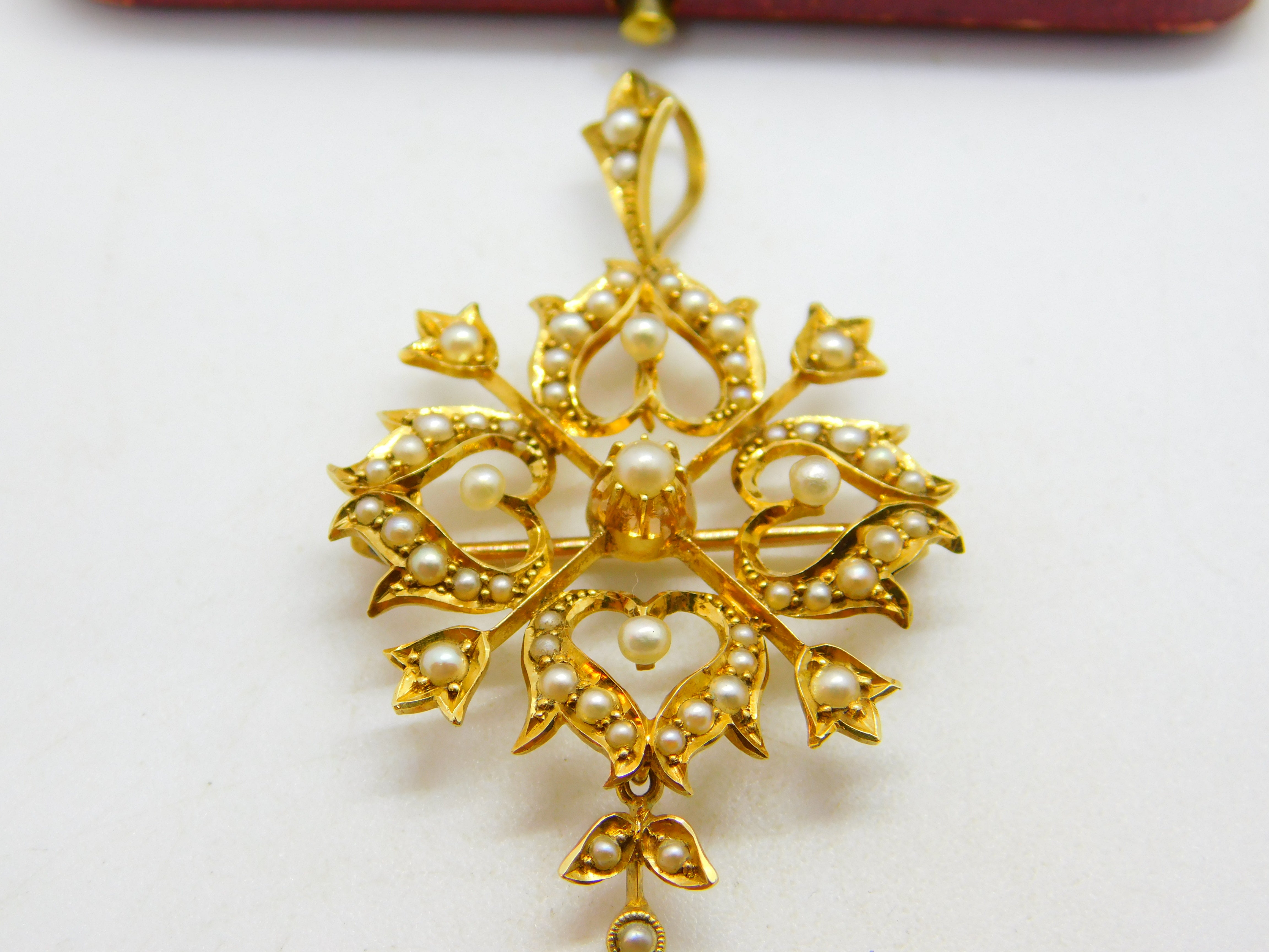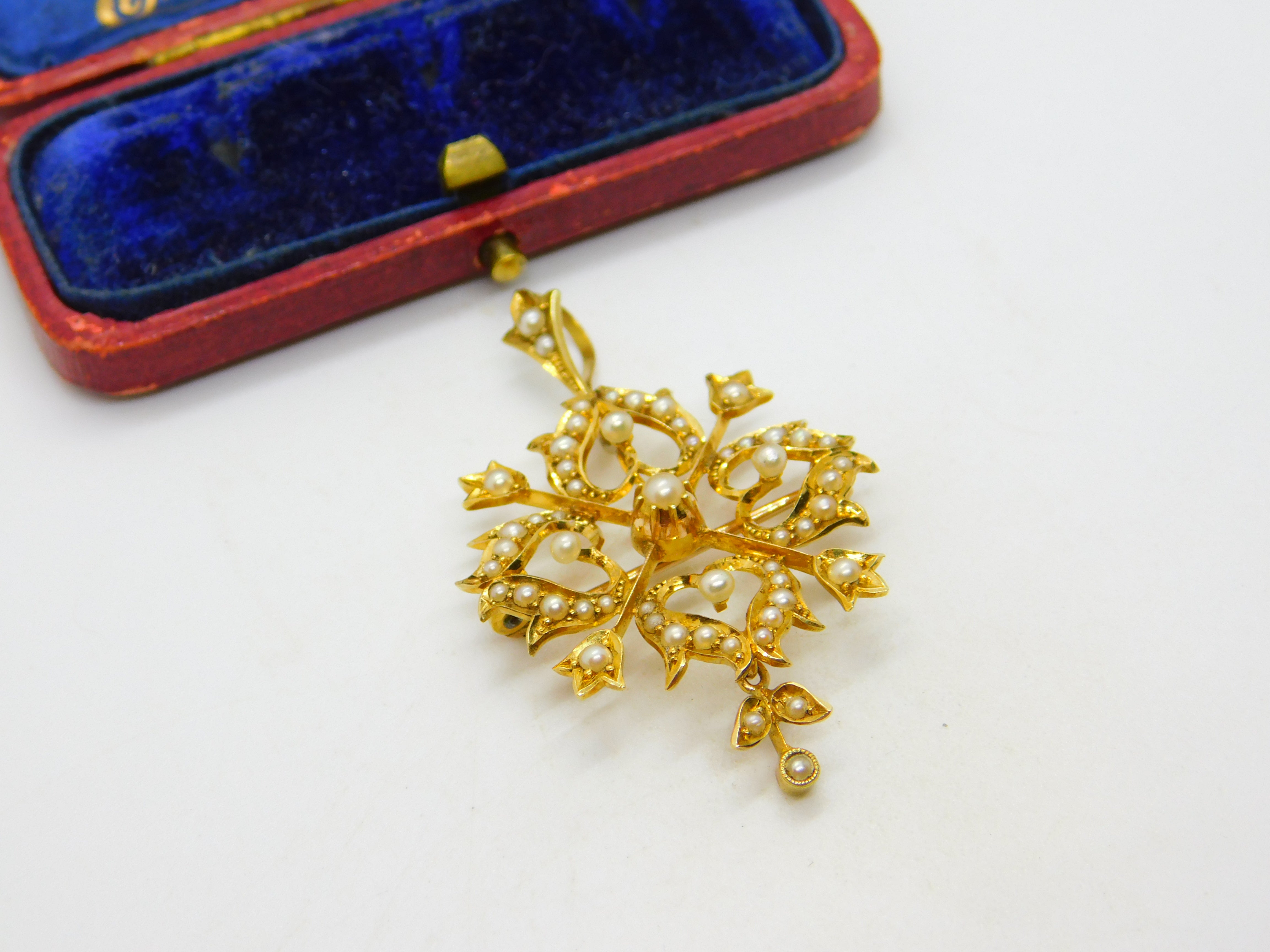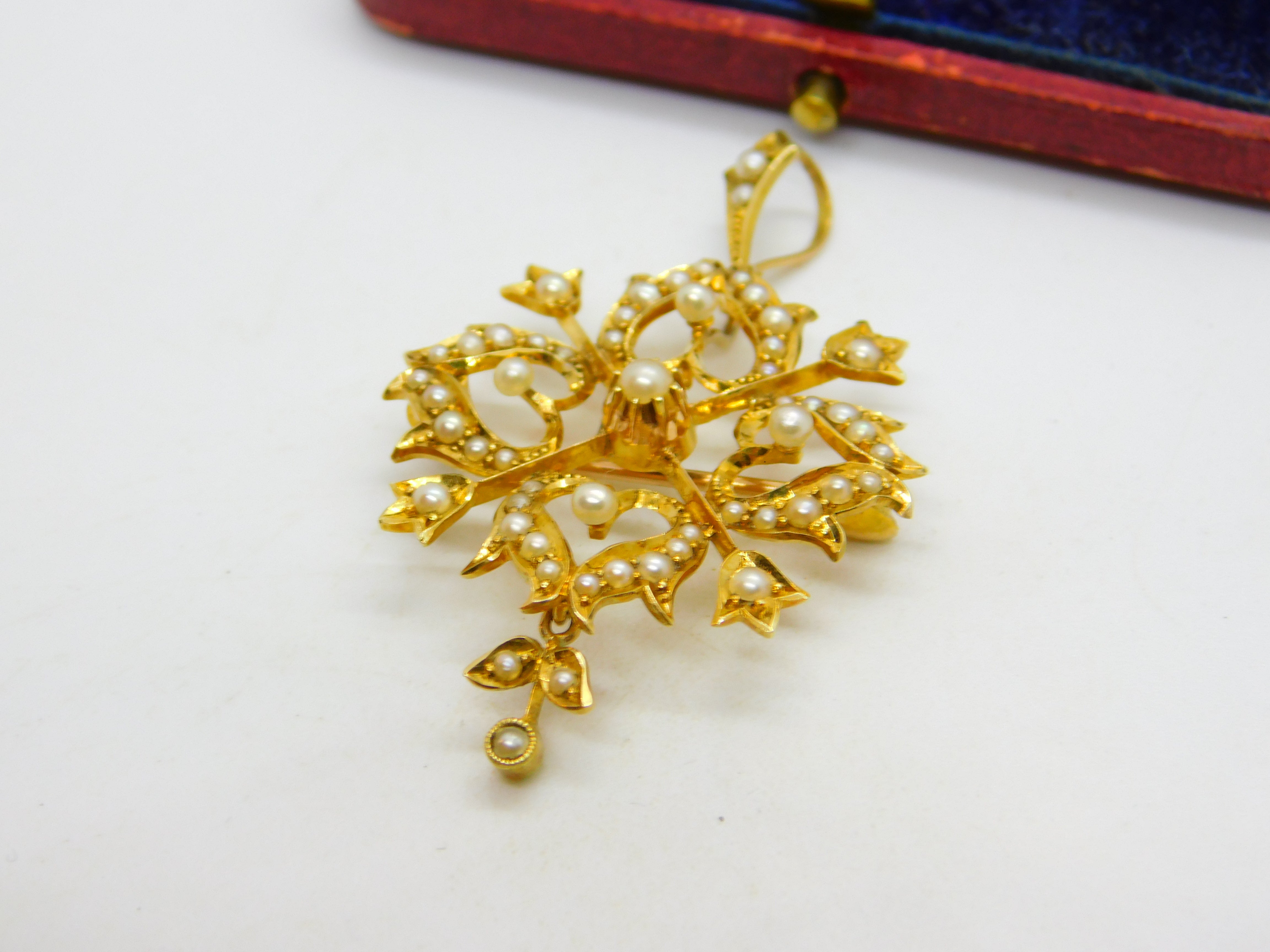 Victorian 15ct Yellow Gold Seed Pearl Set Floral Lavalier Drop Pendant c1890