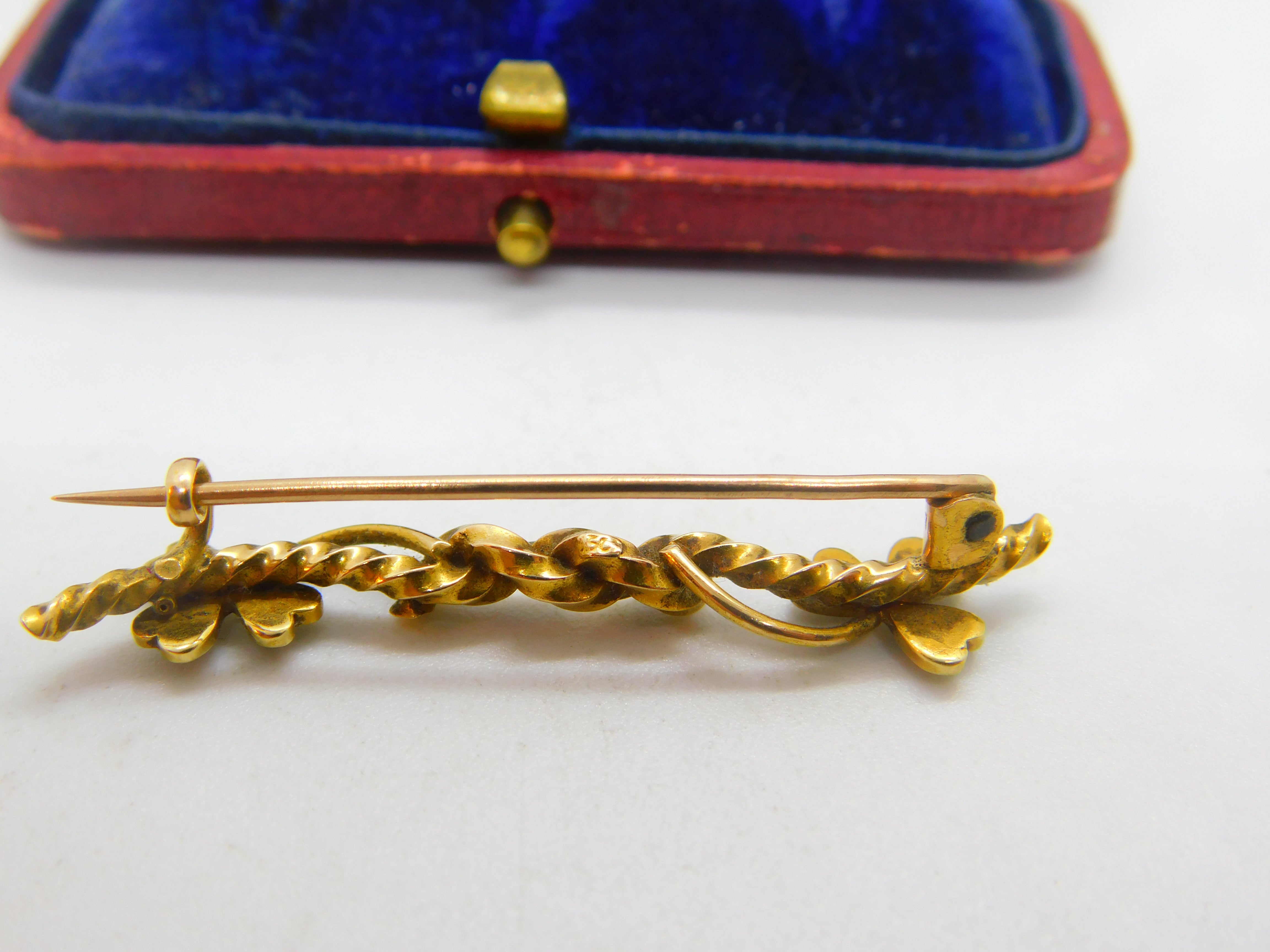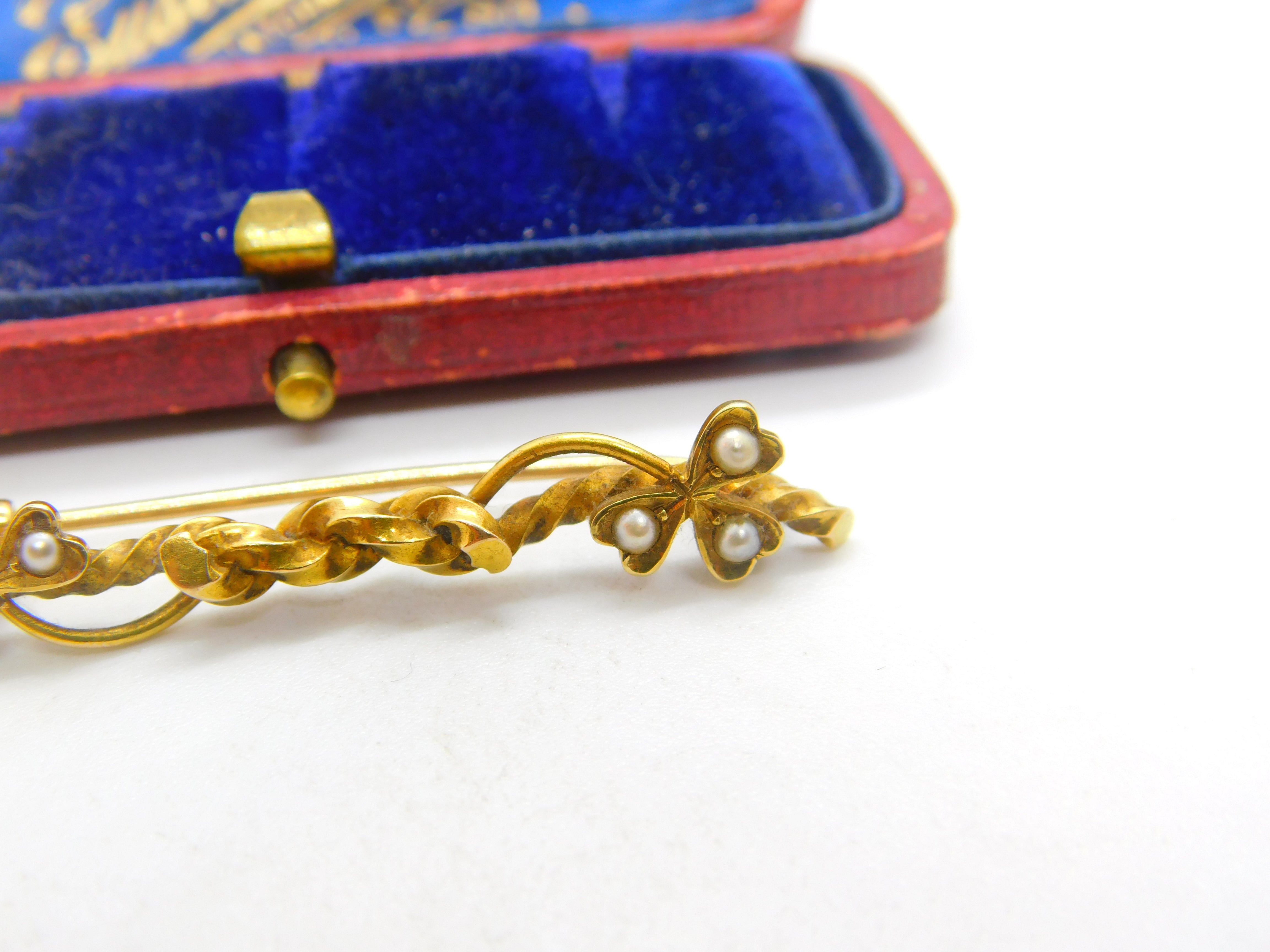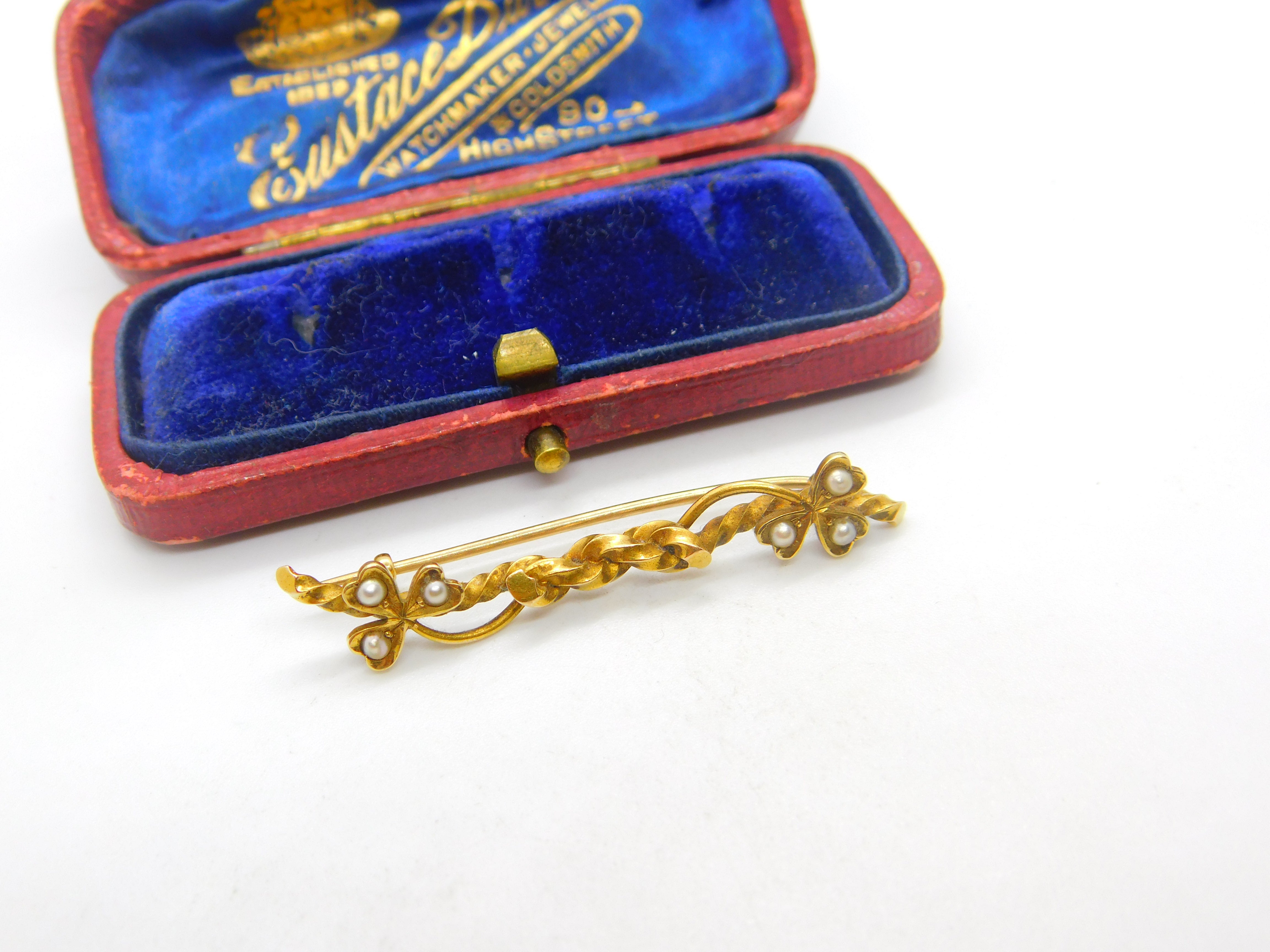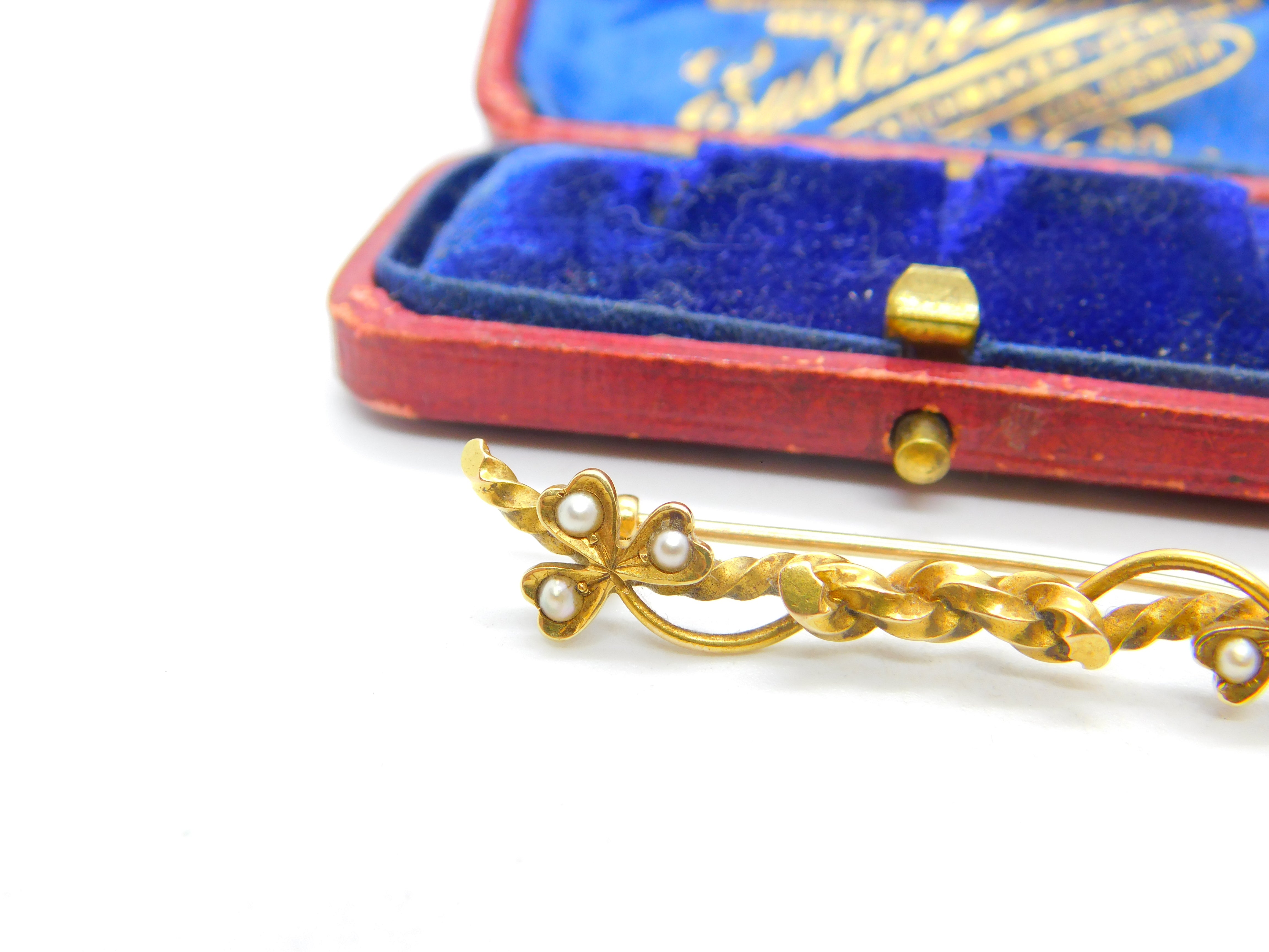Details: A fantastic and wonderfully designed antique Victorian 15ct yellow gold shamrock sweetheart knot brooch set with seed pearl marked 15ct to the reverse c1880. This is a wonderful item that would make a perfect gift or addition to any collection. The BOX pictured is for PRESENTATION ONLY and is NOT included in the listings but used to frame the pictures unless specifically stated otherwise.