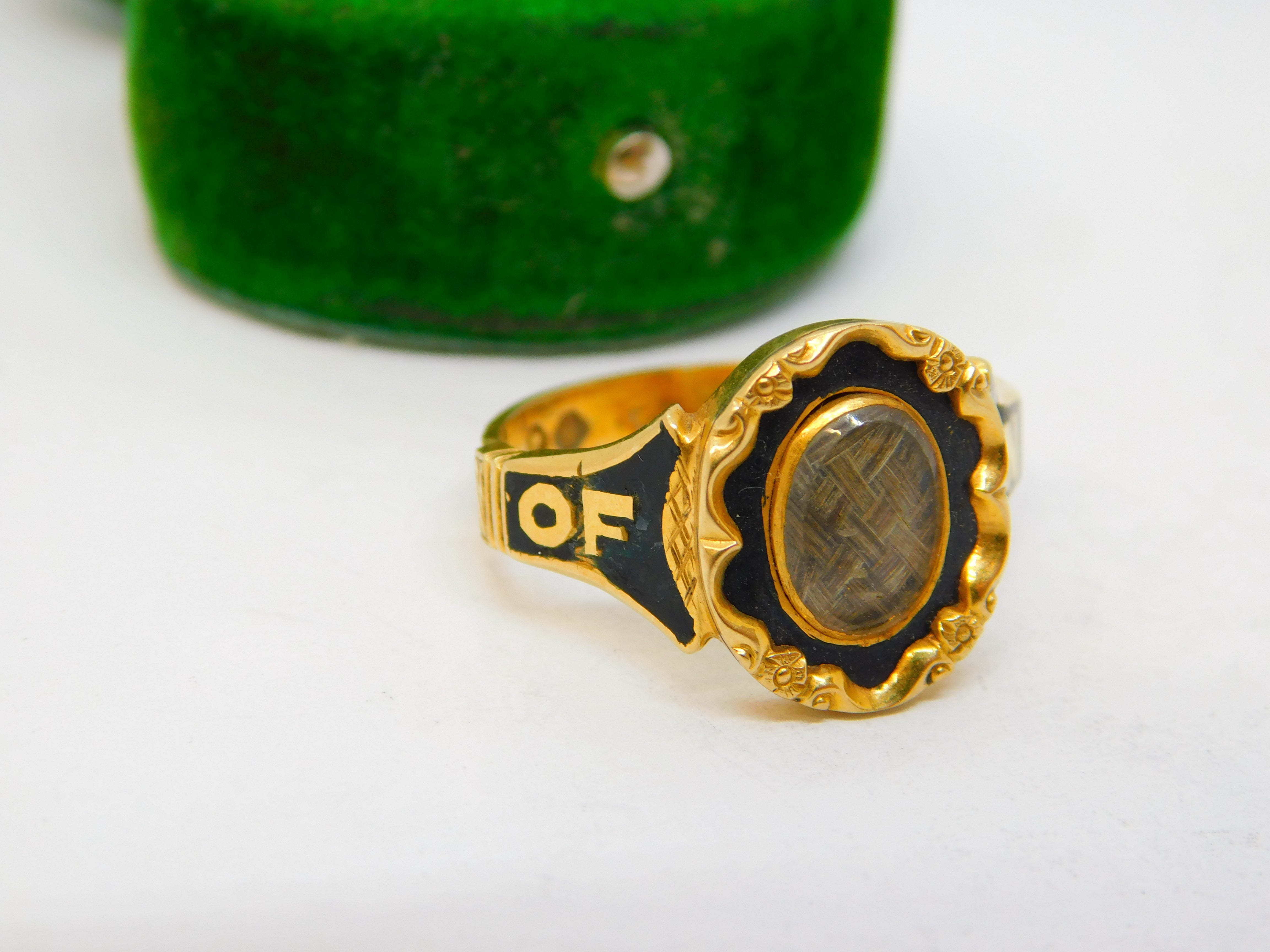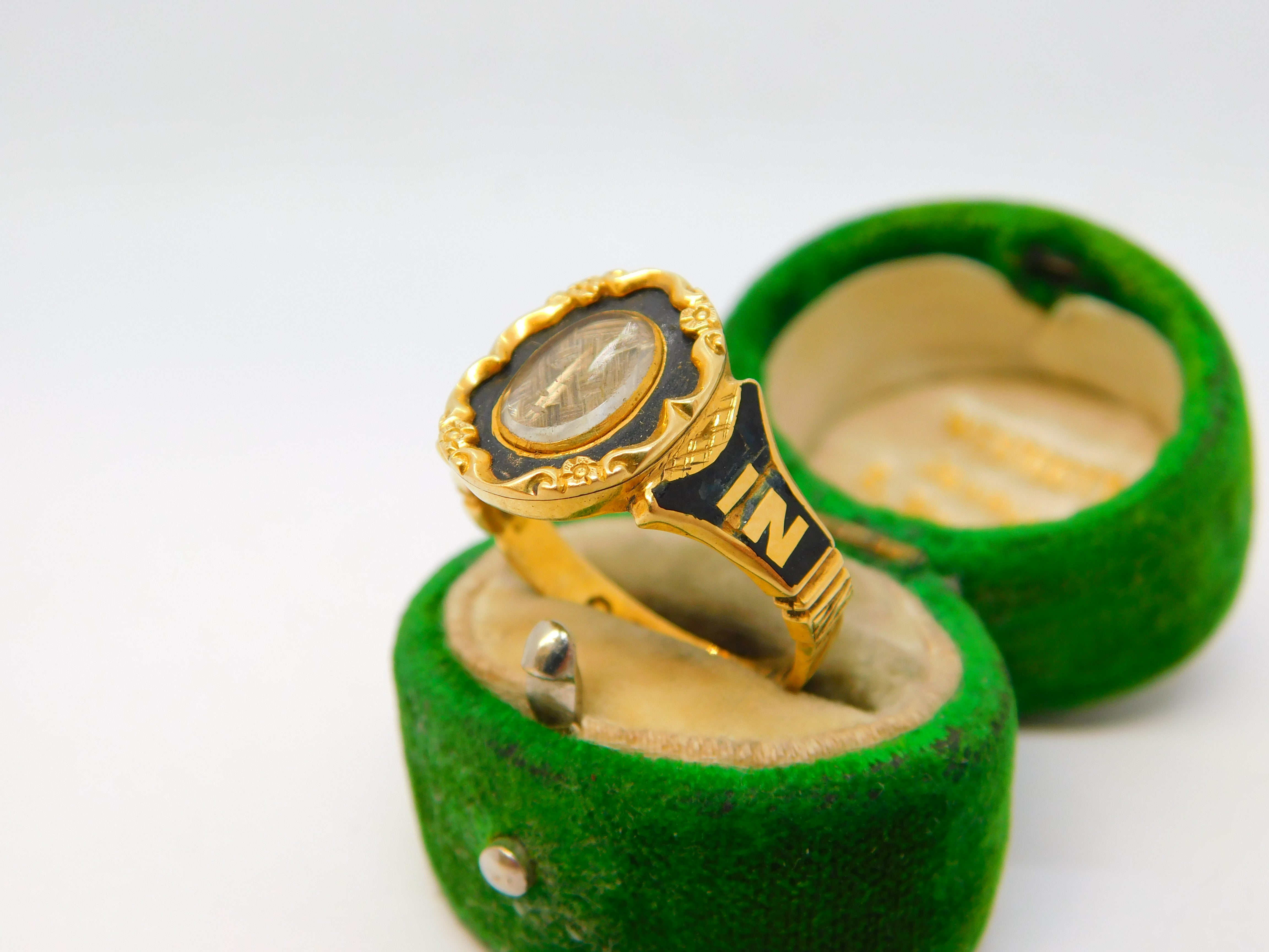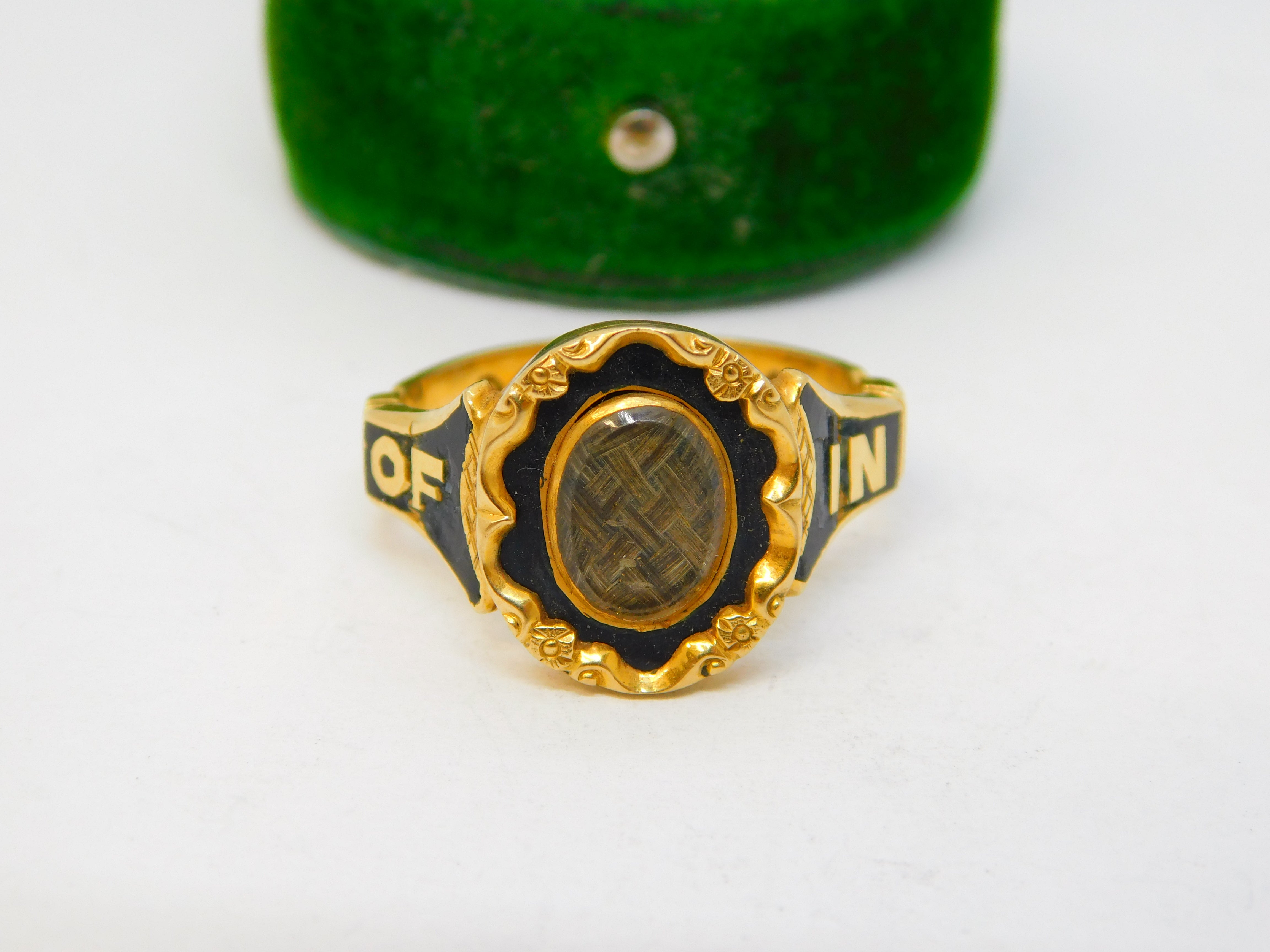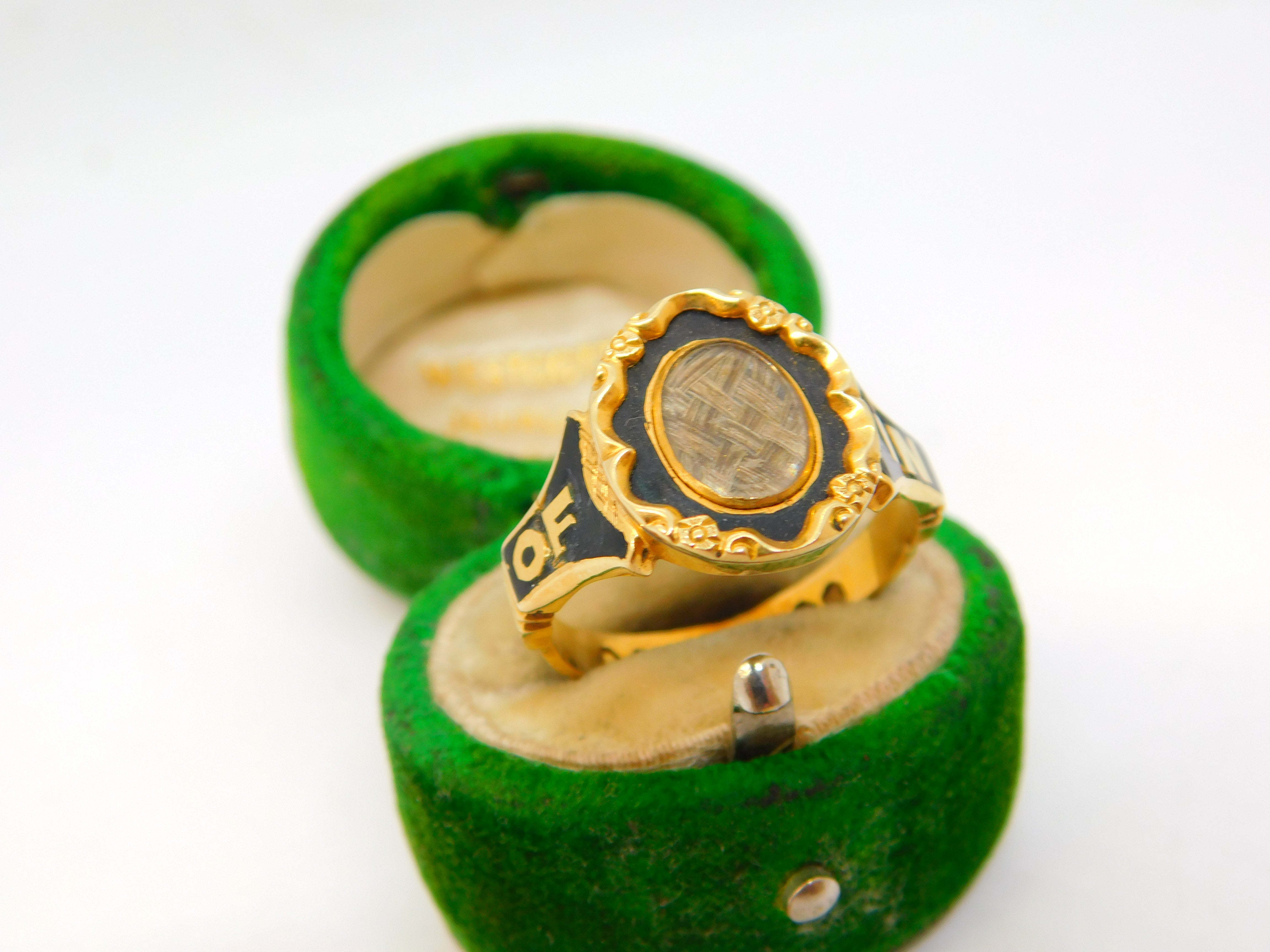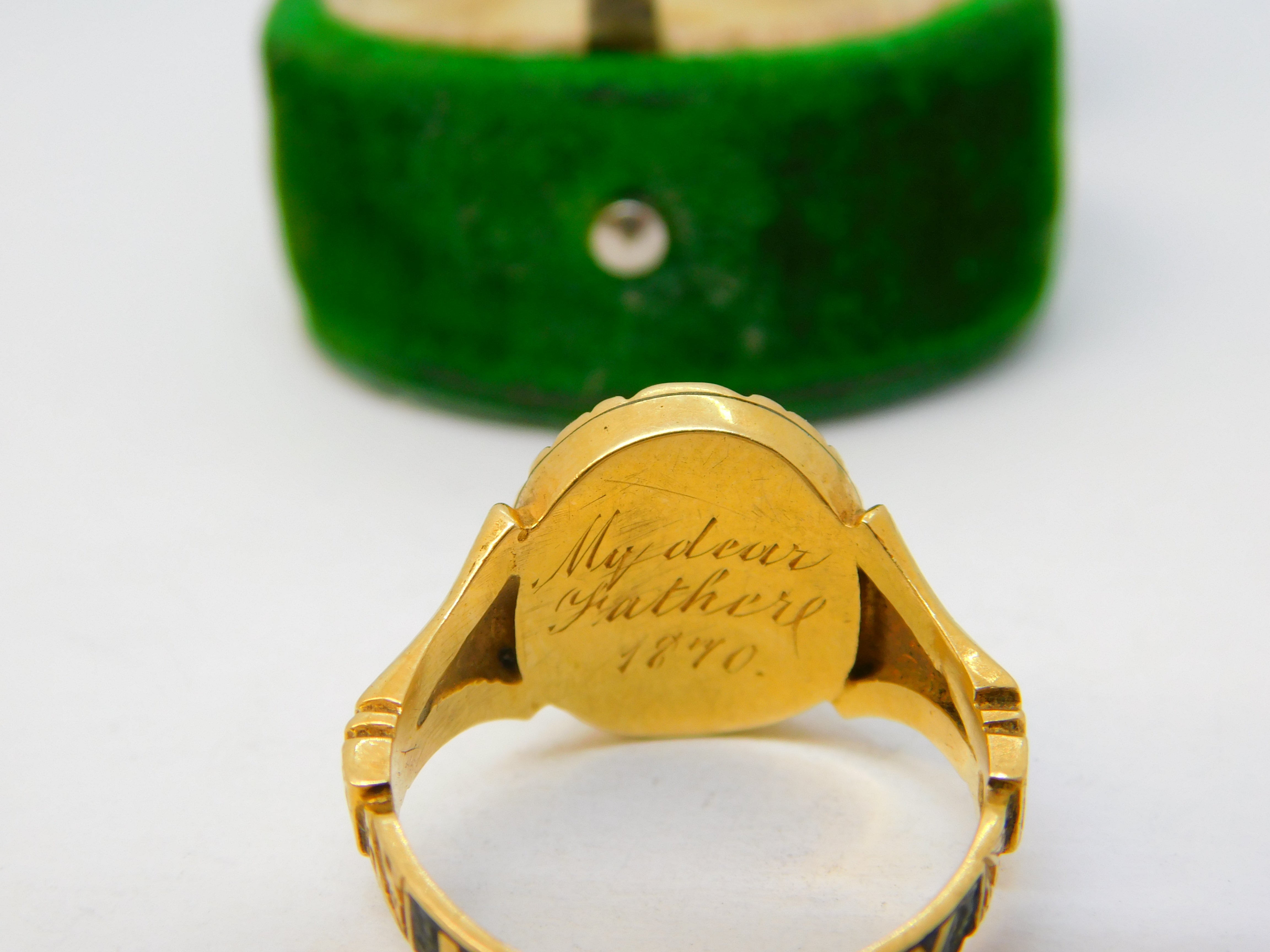Details: A fantastic and wonderfully designed antique Victorian 18ct yellow gold & black enamel mourning ring set with hair to the central panel, adorned with black enamel surrounding the band reading 'In Memory Of', engraved 'My Dear Father, 1870', hallmarked London 1856 to the interior band. This is a wonderful item that would make a perfect gift or addition to any collection. The BOX pictured is for PRESENTATION ONLY and is NOT included in the listings but used to frame the pictures unless specifically stated otherwise.