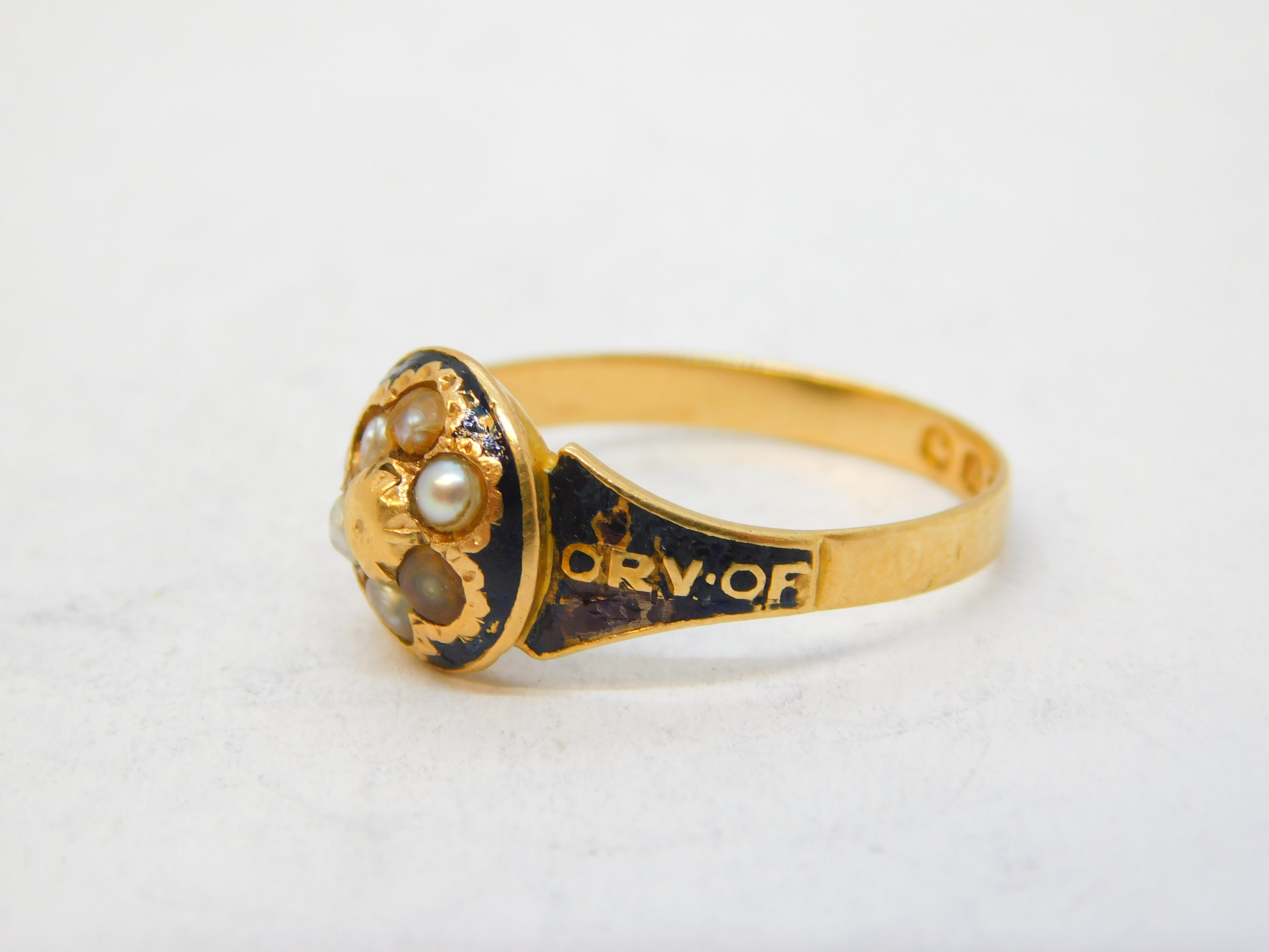 Details: A fantastic and wonderfully designed antique mid-Victorian 18ct yellow gold mourning ring with black enamel decoration reading 'In Memory Of' flanking the central seed pearl set floral cluster clearly hallmarked Birmingham 1870 to the interior. The pearls are worn and could be replaced. This is a wonderful item that would make a perfect gift or addition to any collection. We are more than happy to provide XRF reports for items upon request.