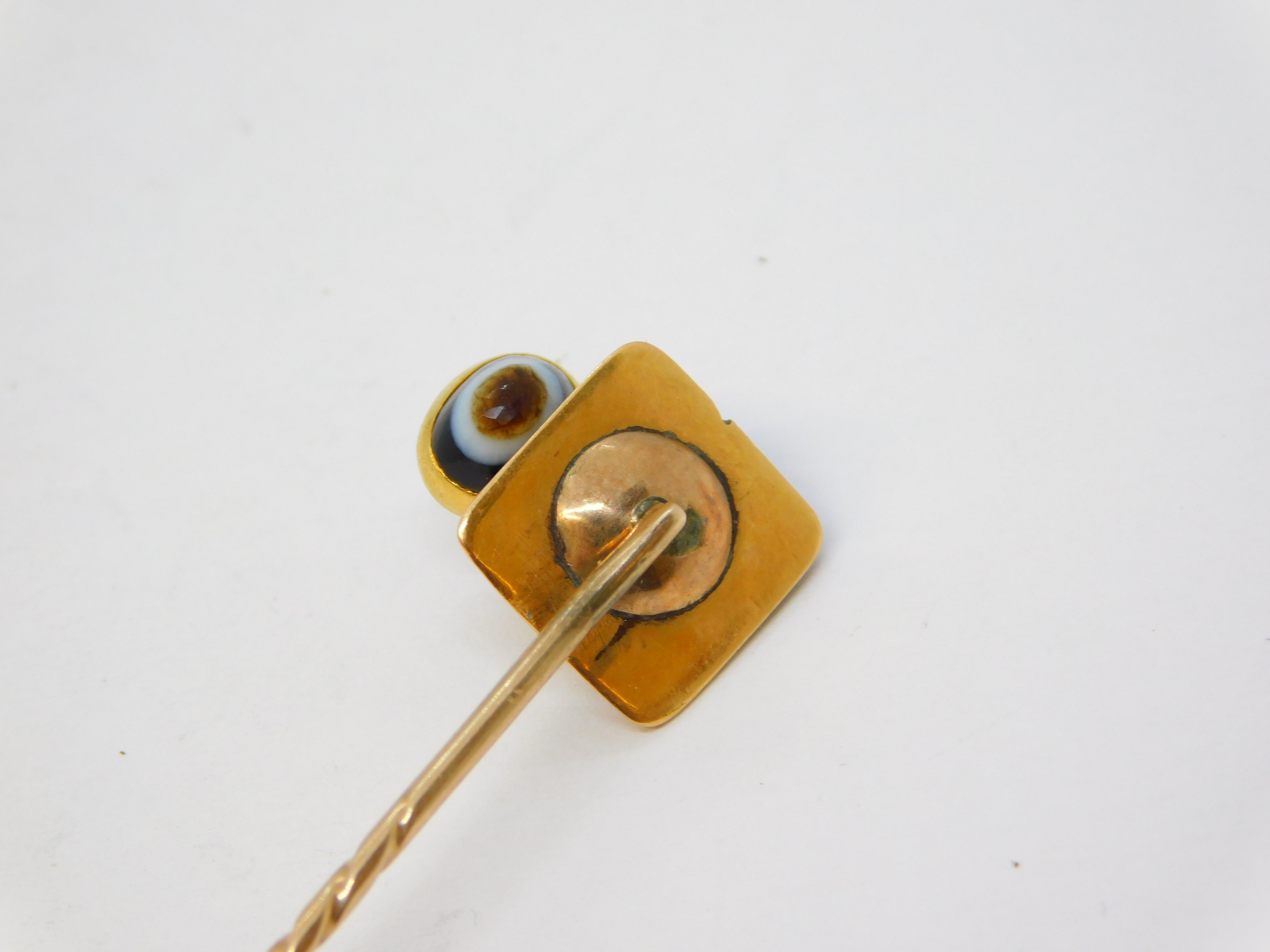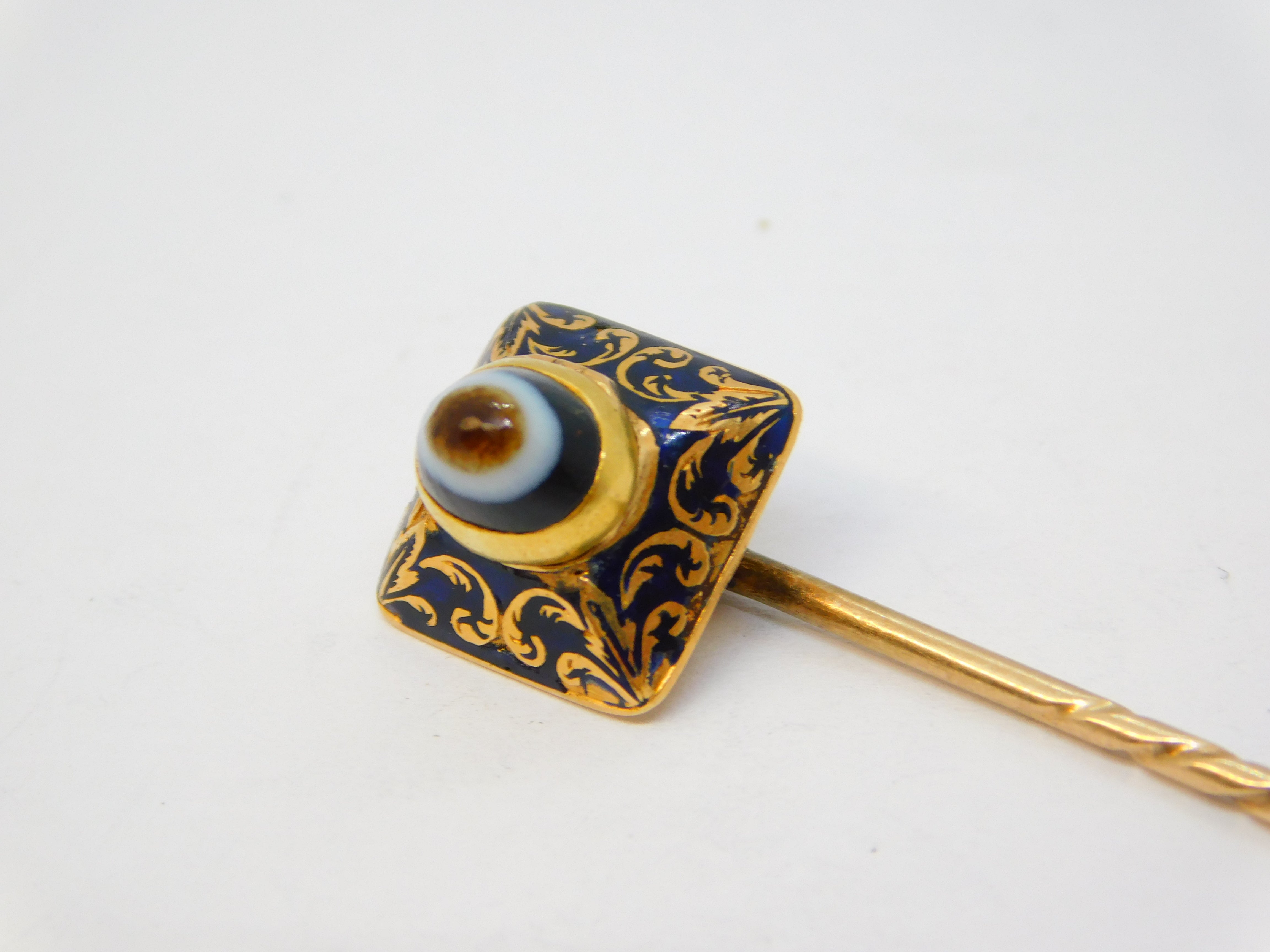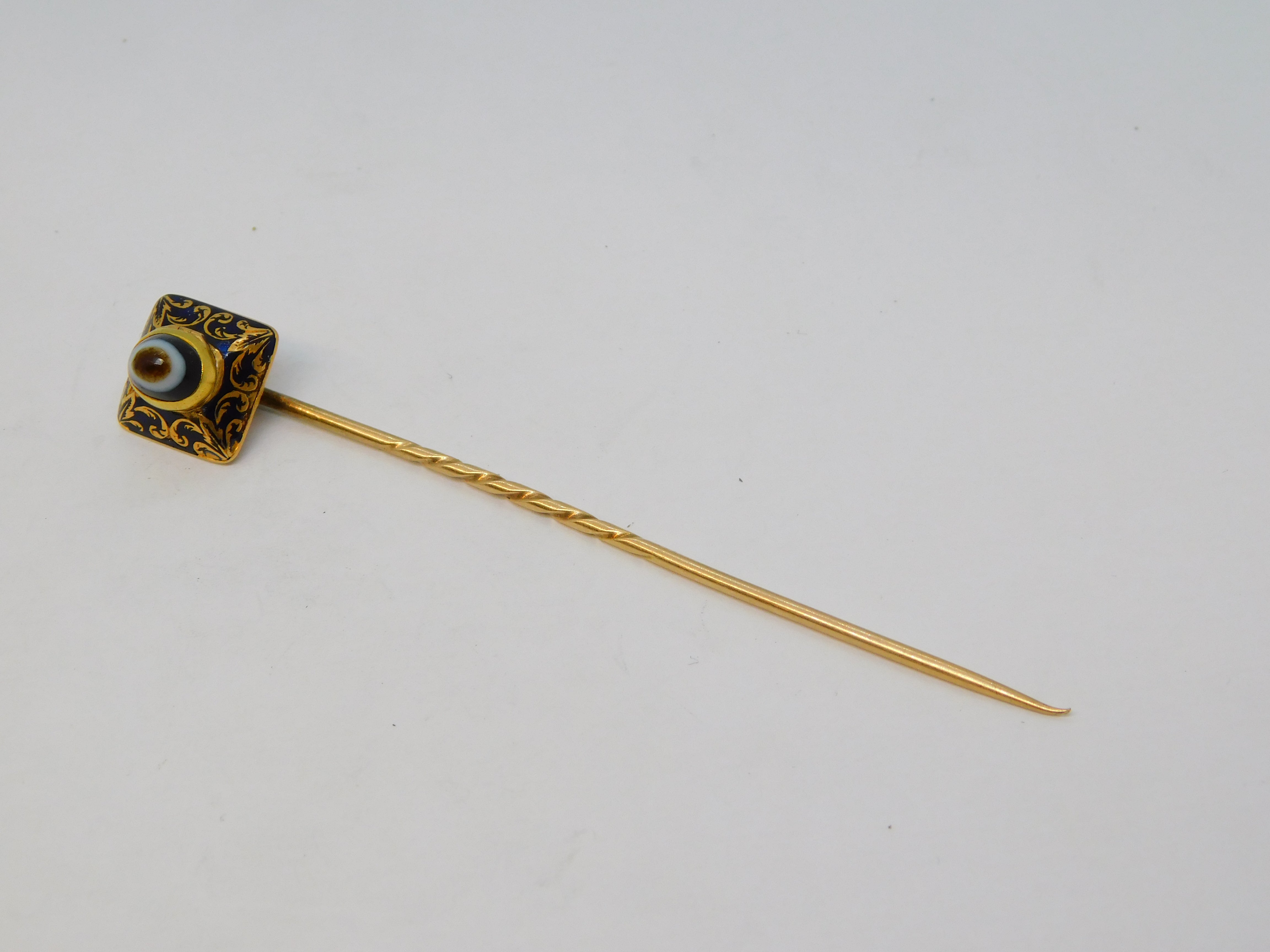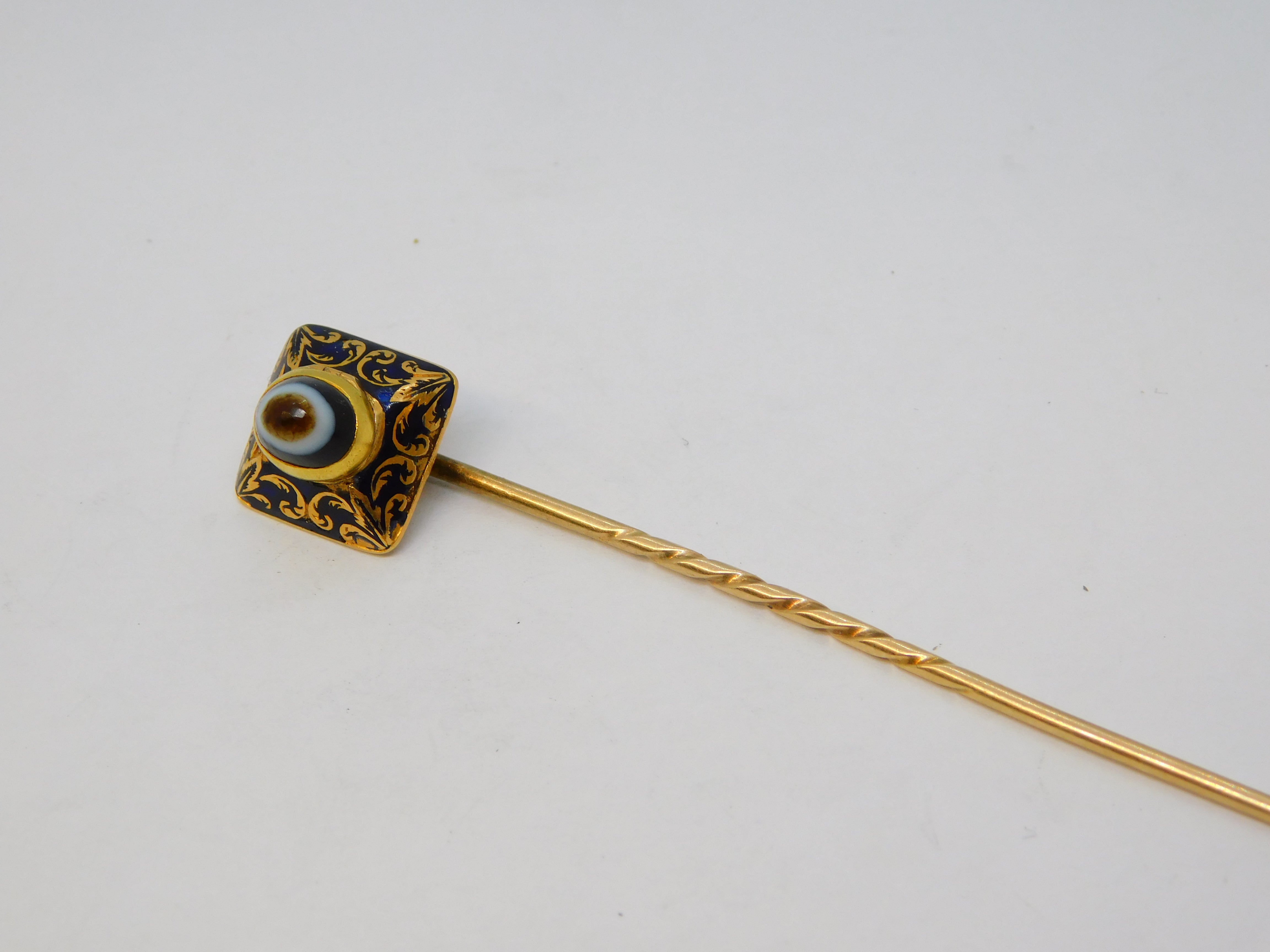 Victorian 18ct Gold, Blue Enamel, Bulls Eye Agate Mourning Stick Pin Antique c1840