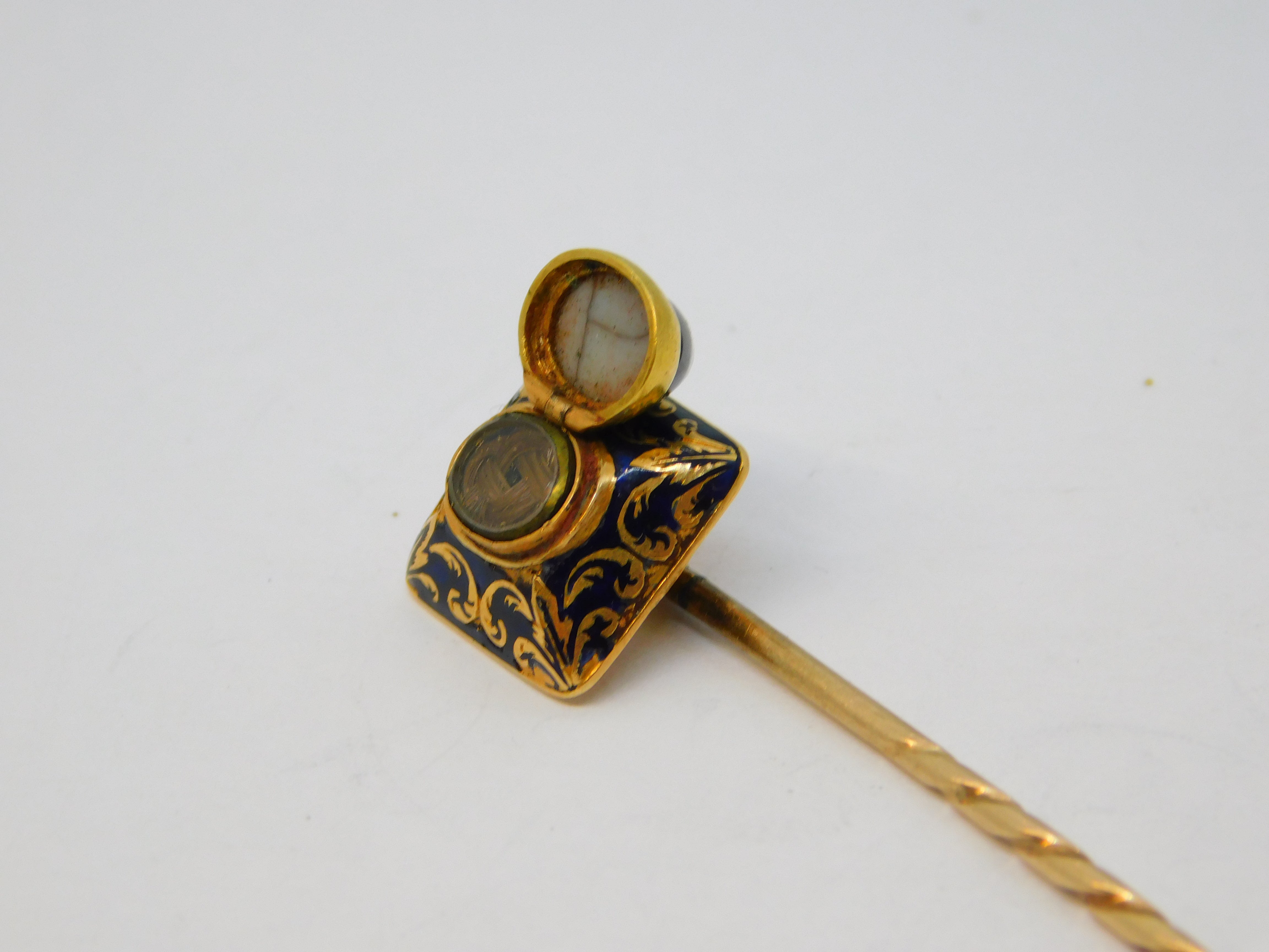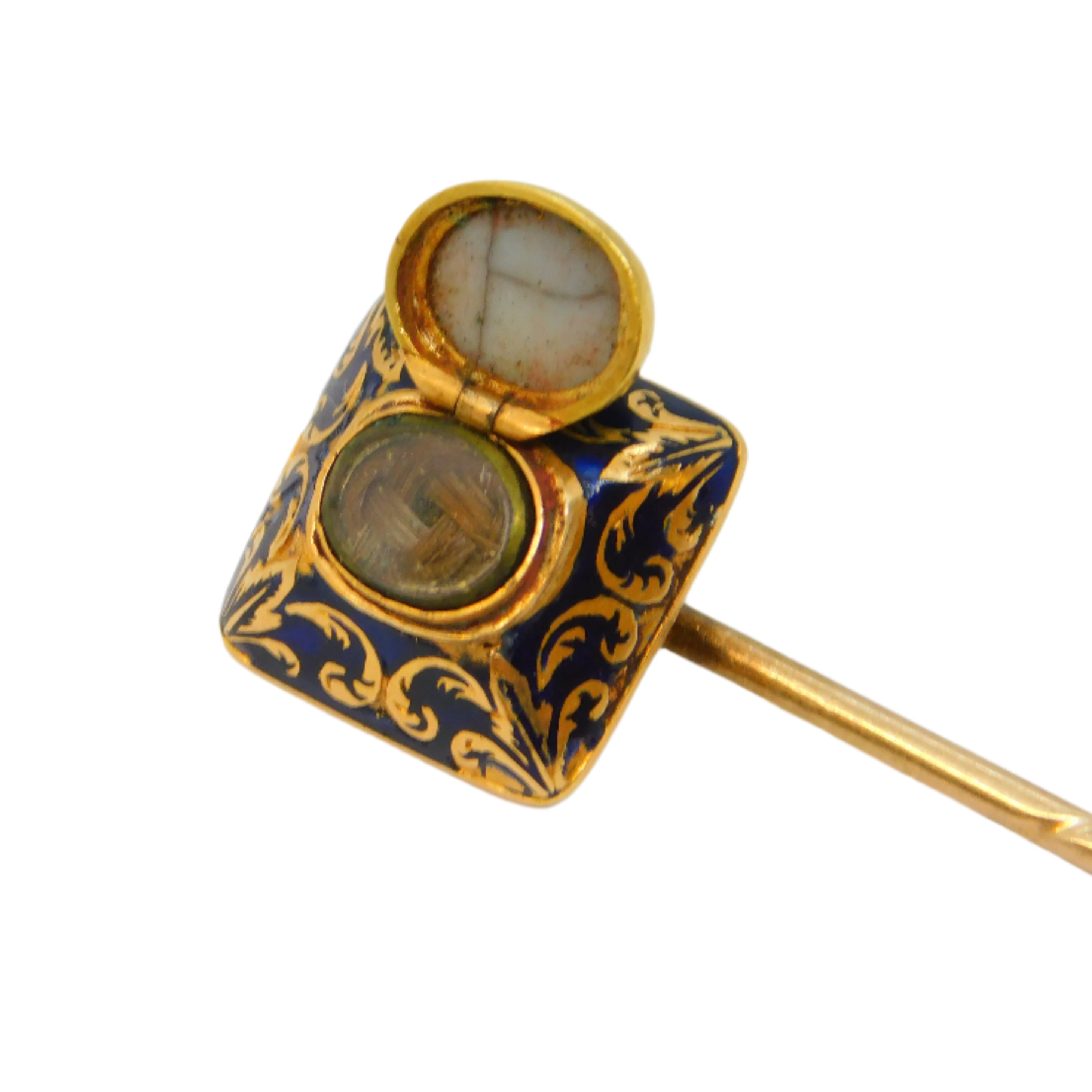 Details: A fantastic and wonderfully designed antique early-Victorian 18ct yellow gold & blue enamel floral mourning stick pin with superb opening locket set with hair to the terminal, the lid adorned with bulls eye agate, the gold has been XRF tested as it is unmarked. This is a wonderful item that would make a perfect gift or addition to any collection.