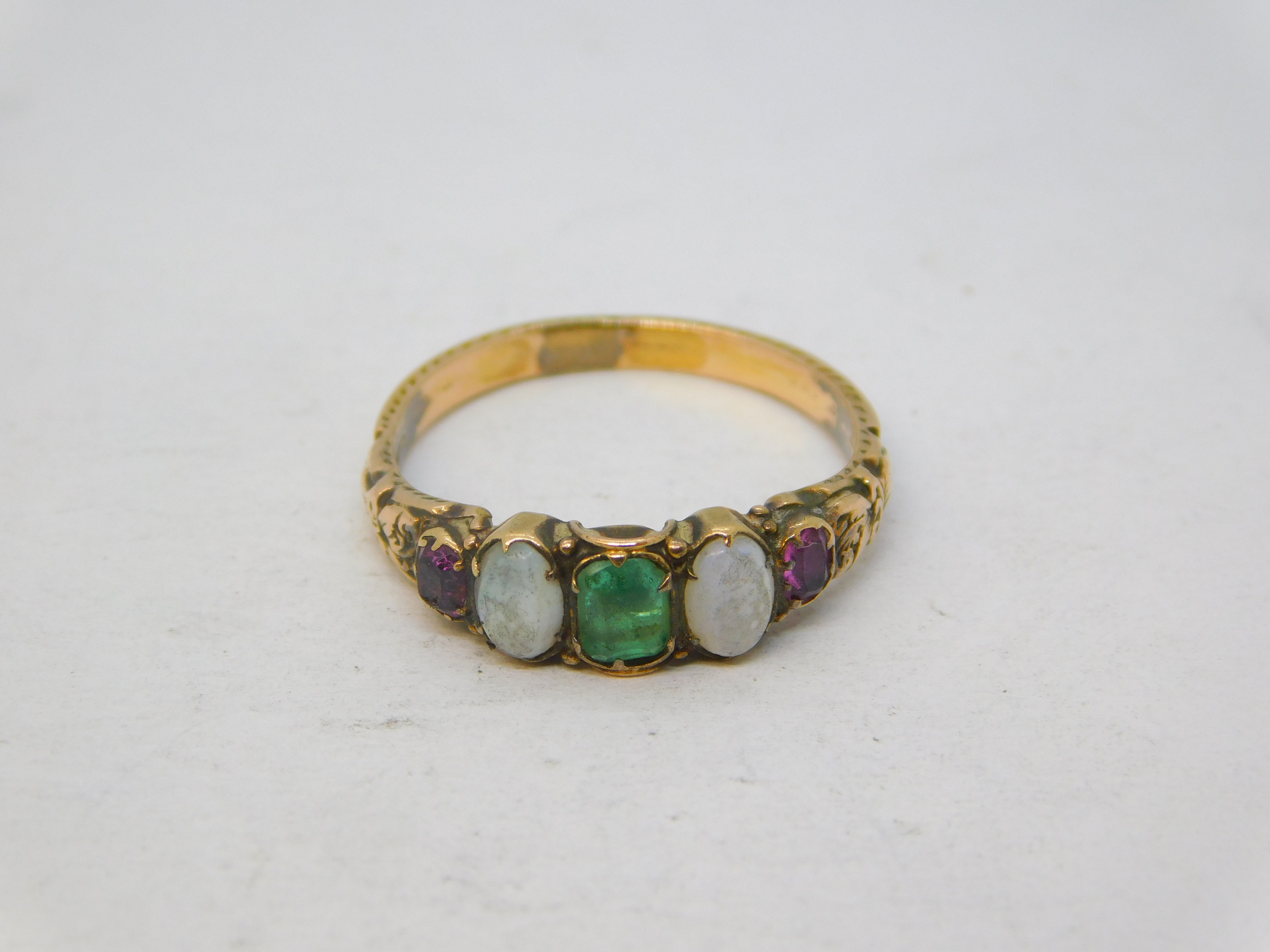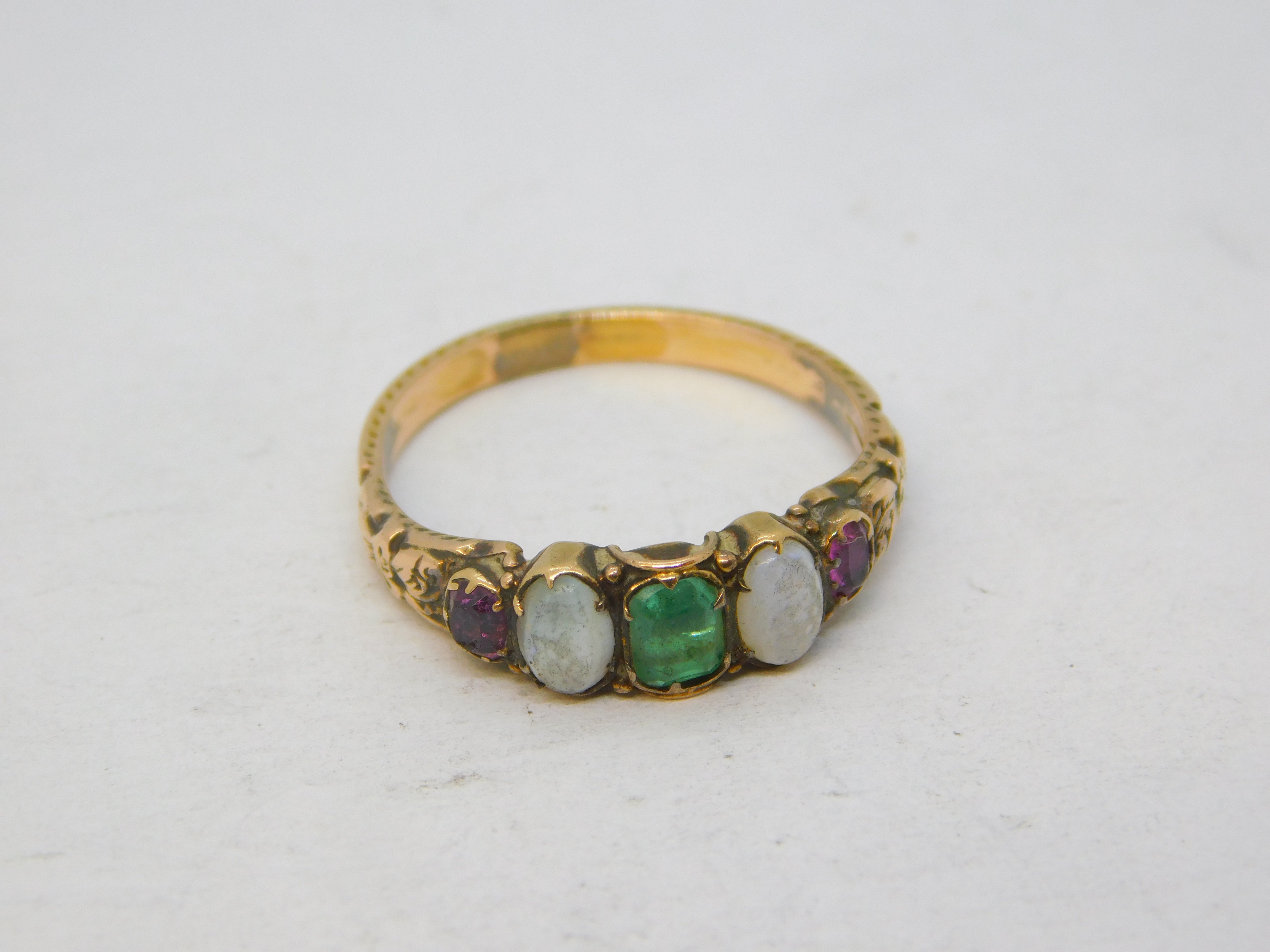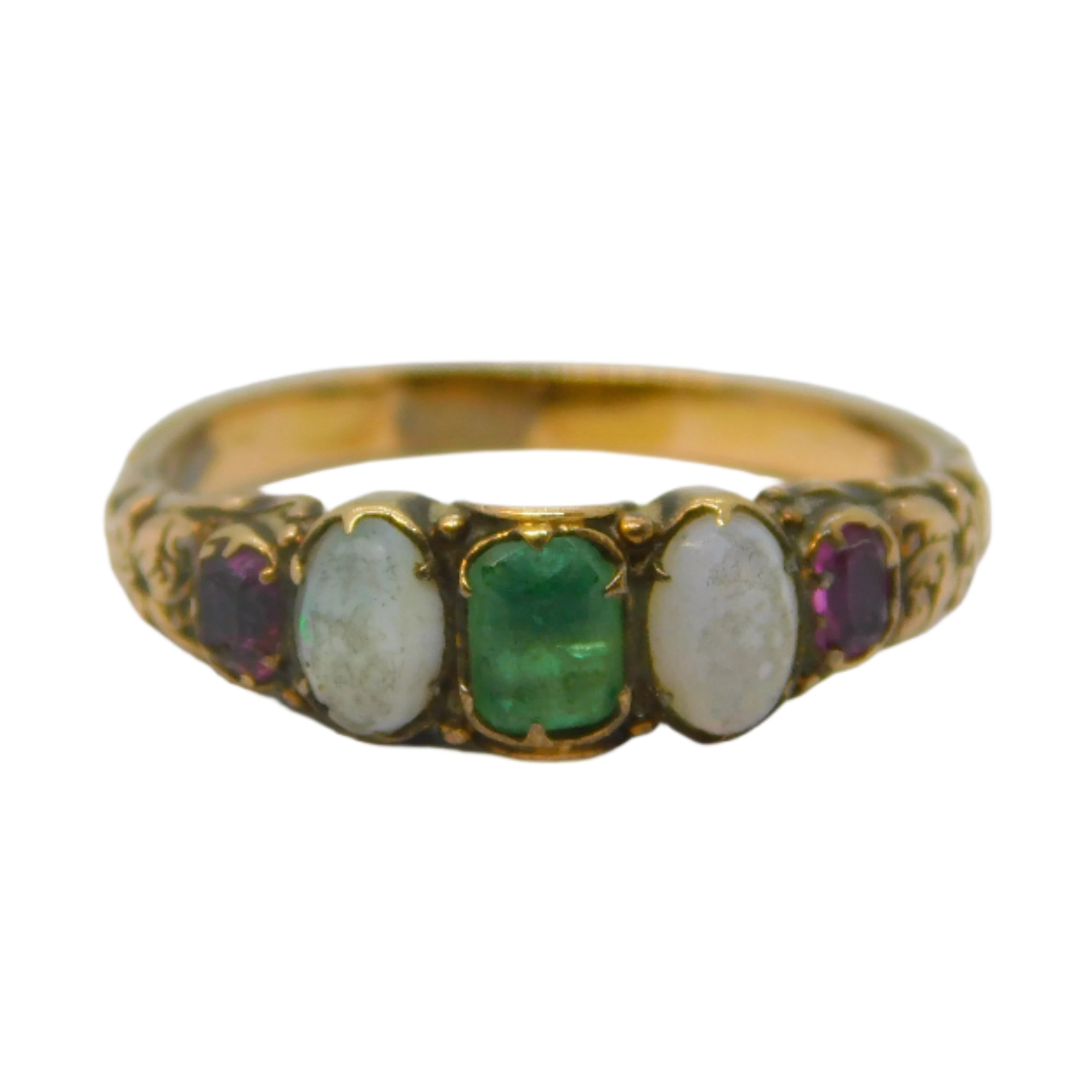 Details: A fantastic and wonderfully designed antique early-Victorian 18ct yellow gold dress ring, possibly acrostic, set with amethyst ,cabochon white opals and a central emerald c1840, superb floral decoration to the shoulders and throughout the shank, the gold has been XRF tested as it is unmarked c1840. The opals could benefit from a polish please note. This is a wonderful item that would make a perfect gift or addition to any collection.