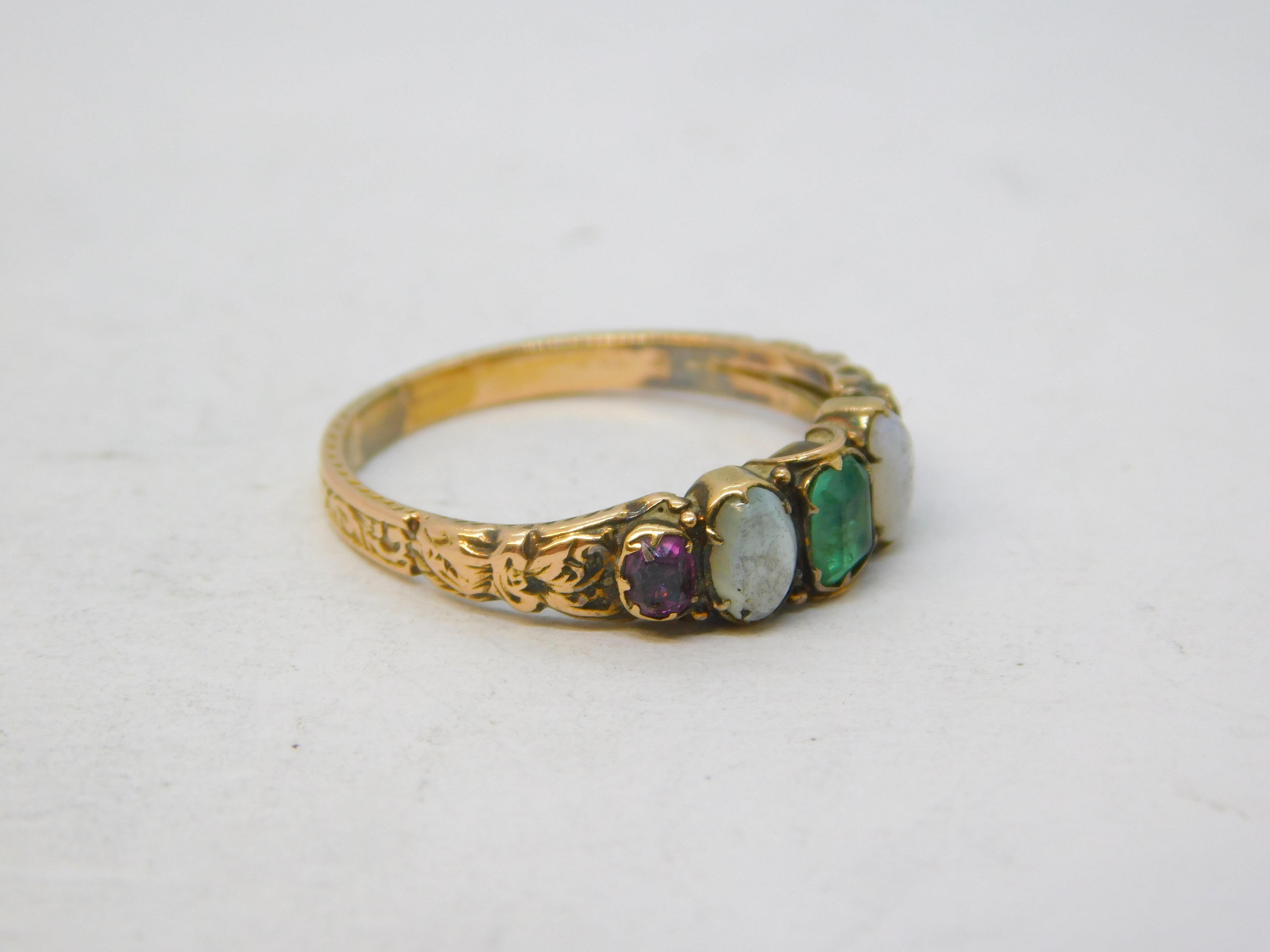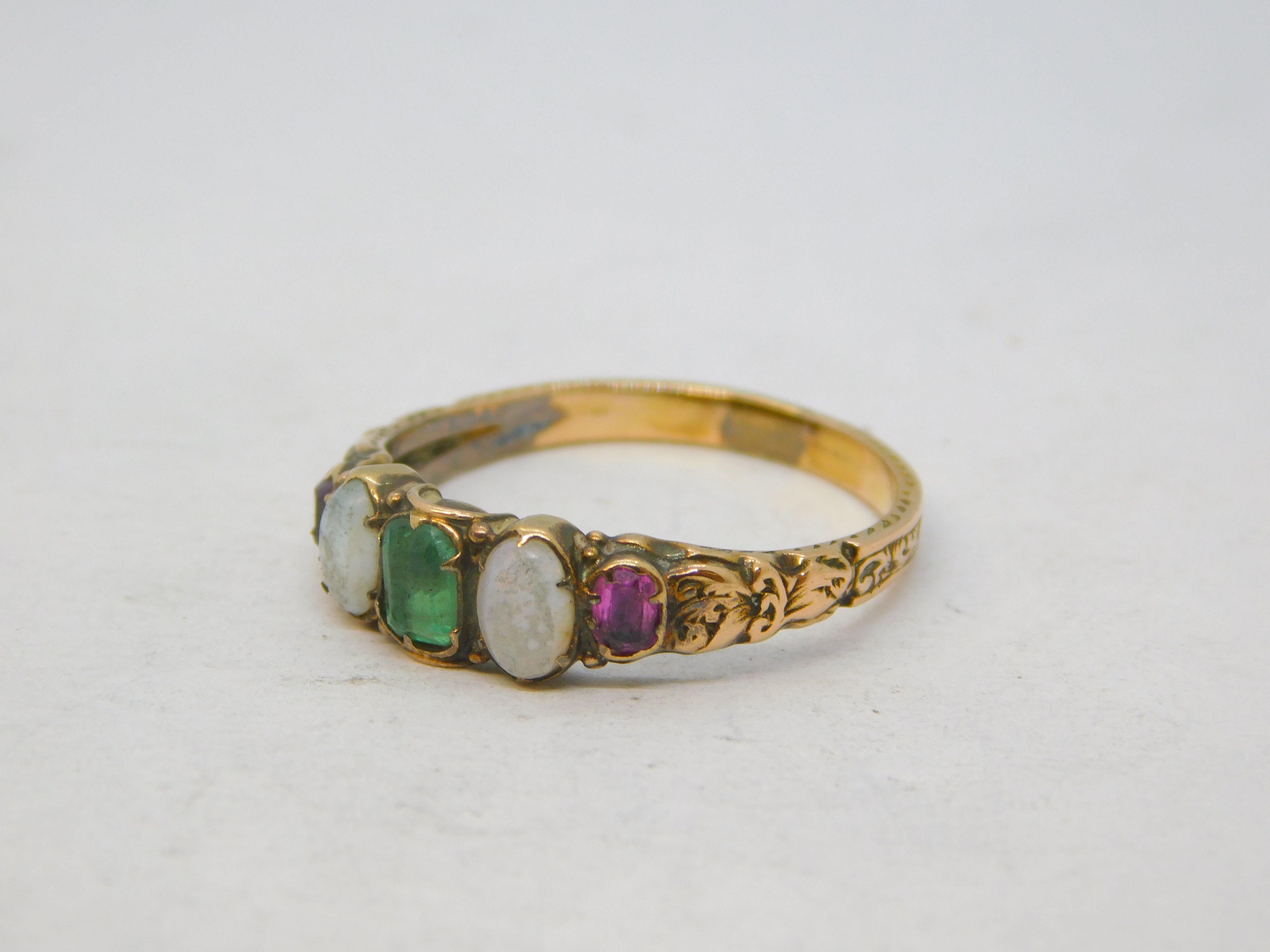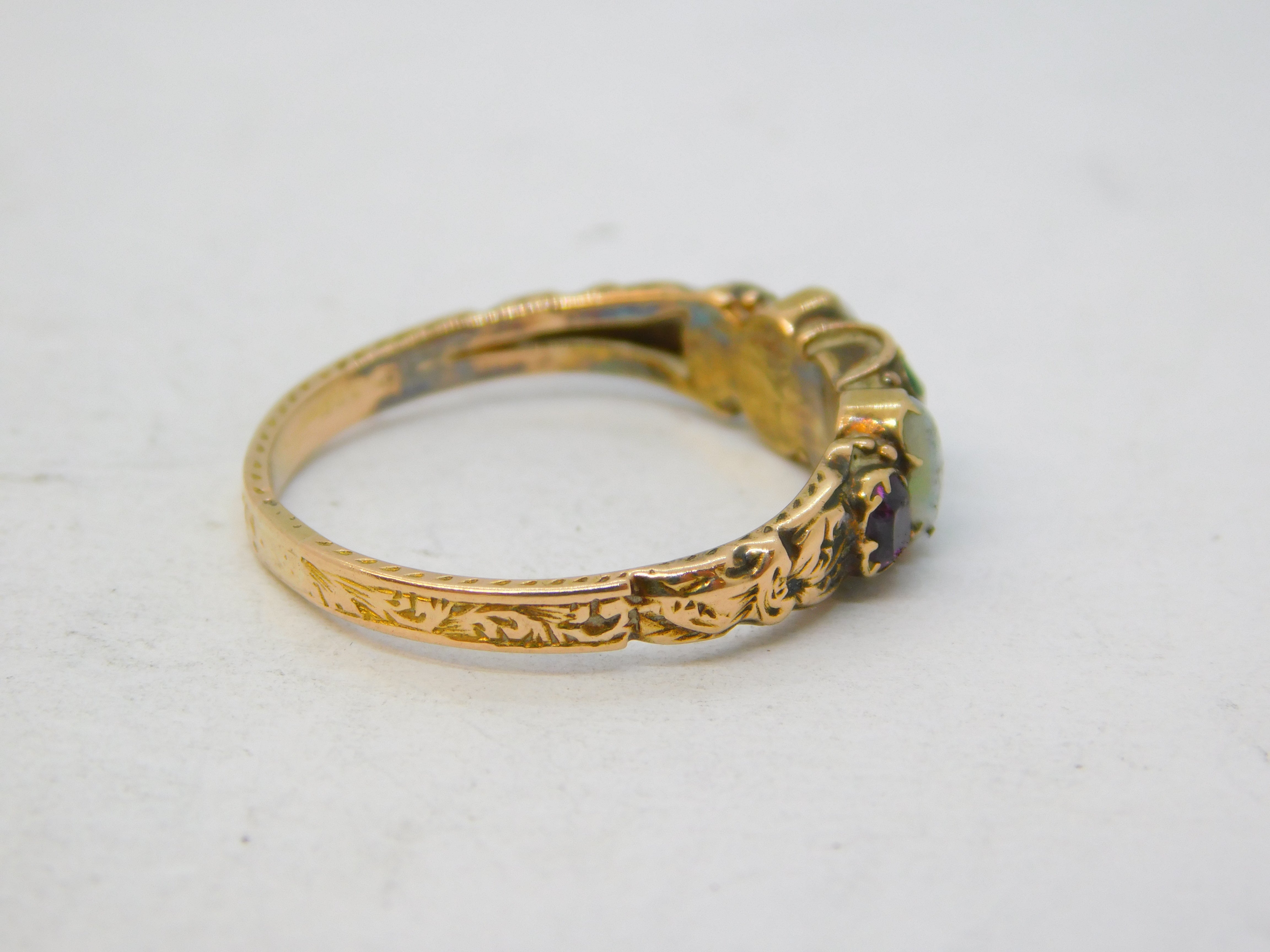 Details: A fantastic and wonderfully designed antique early-Victorian 18ct yellow gold dress ring, possibly acrostic, set with amethyst ,cabochon white opals and a central emerald c1840, superb floral decoration to the shoulders and throughout the shank, the gold has been XRF tested as it is unmarked c1840. The opals could benefit from a polish please note. This is a wonderful item that would make a perfect gift or addition to any collection.