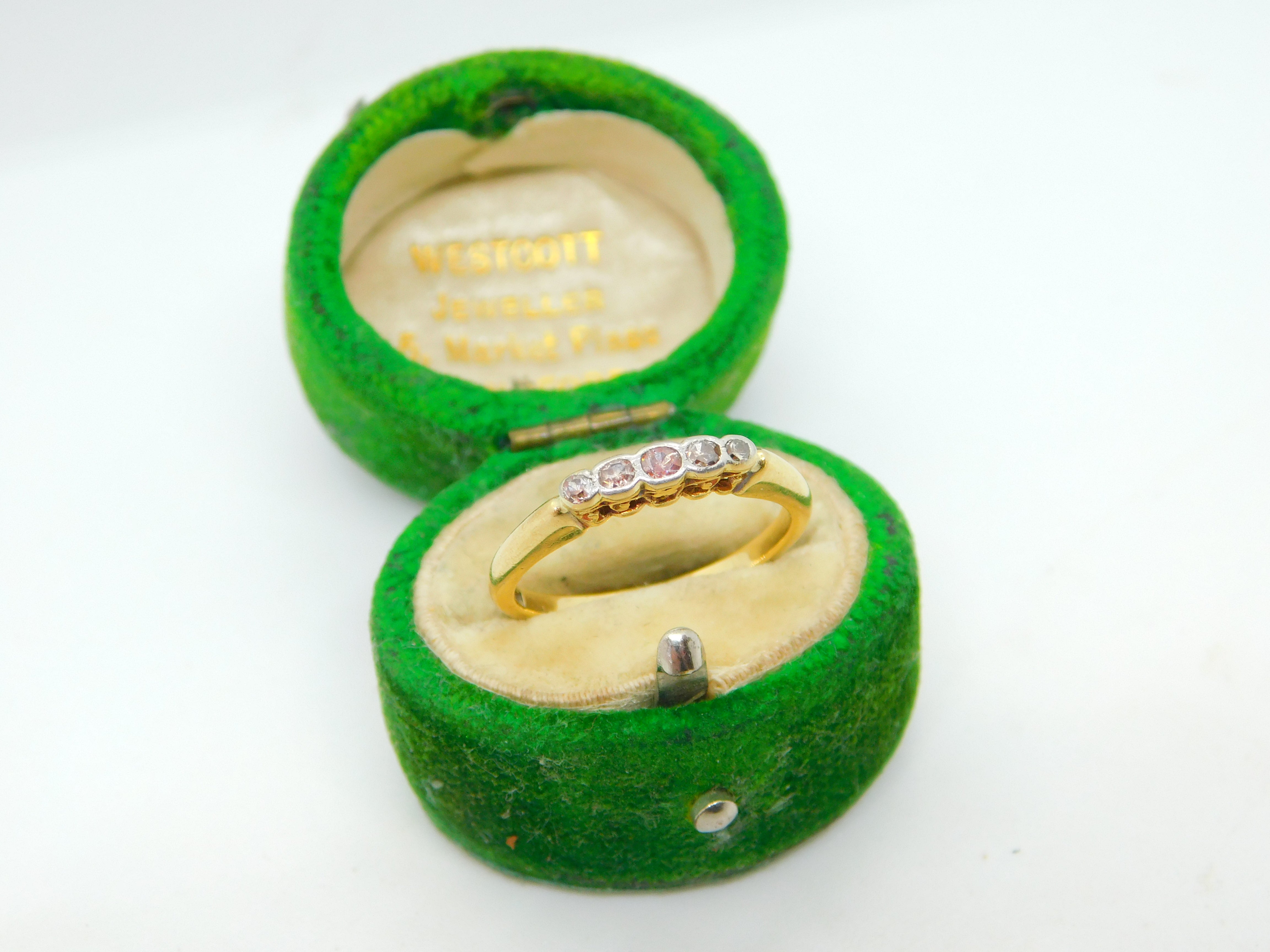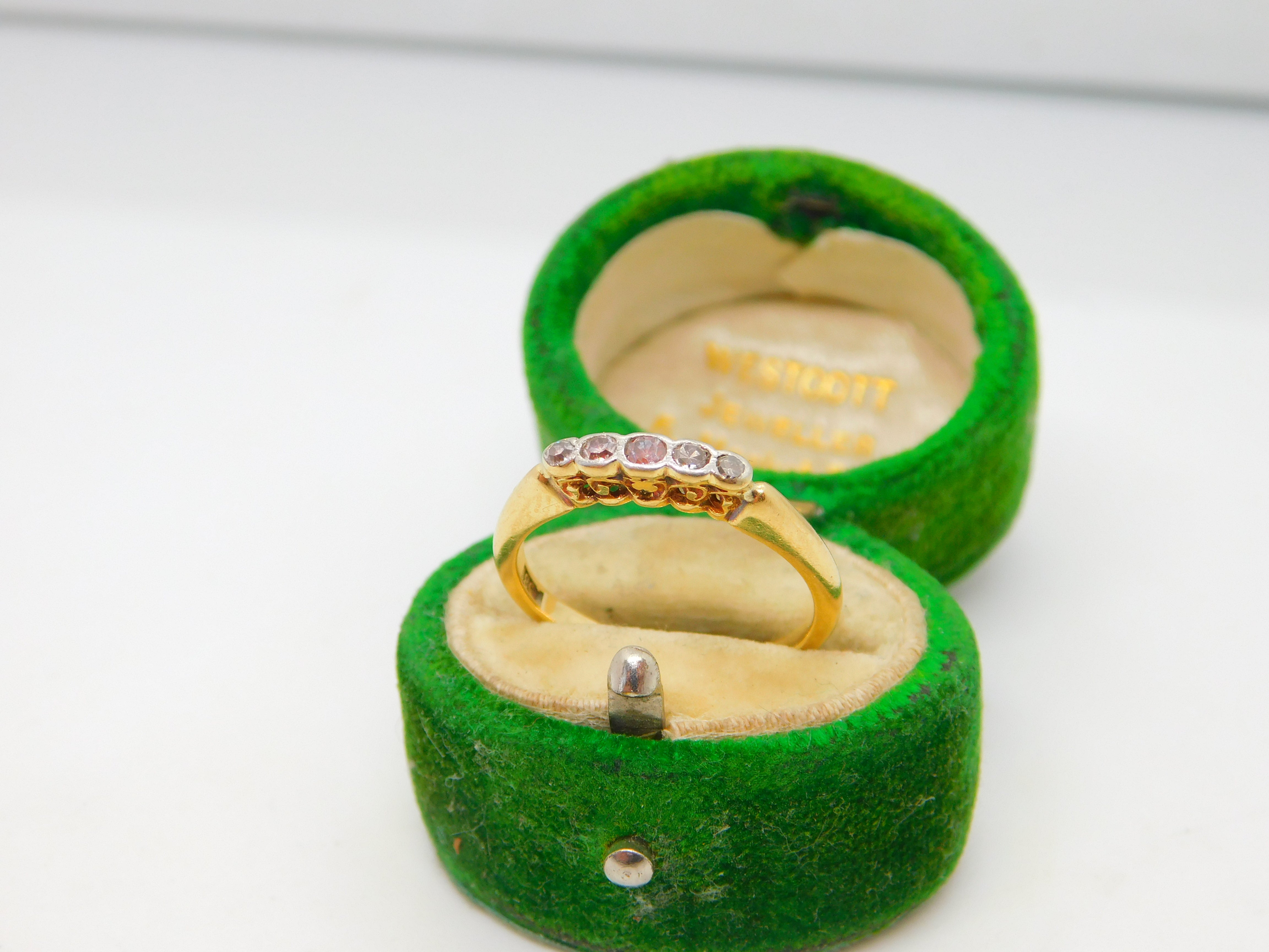 Details: A fantastic and wonderfully designed antique Victorian 18ct yellow gold & five-stone diamond band ring with lovely detailing hallmarked to the interior band c1890, the diamonds have all been tested, the central stone has a pinkish hue. This is a wonderful item that would make a perfect gift or addition to any collection. The BOX pictured is for PRESENTATION ONLY and is NOT included in the listings but used to frame the pictures unless specifically stated otherwise.