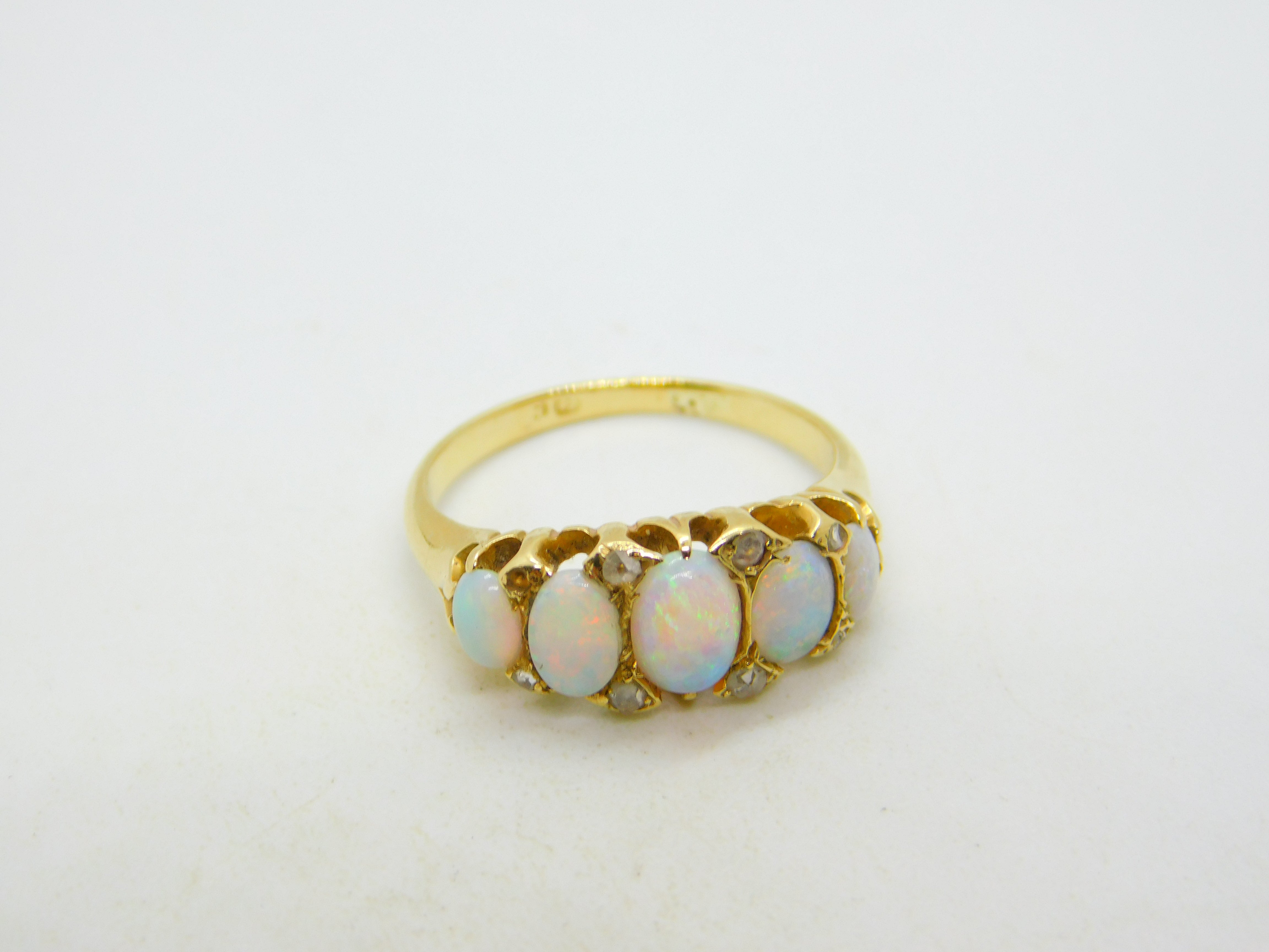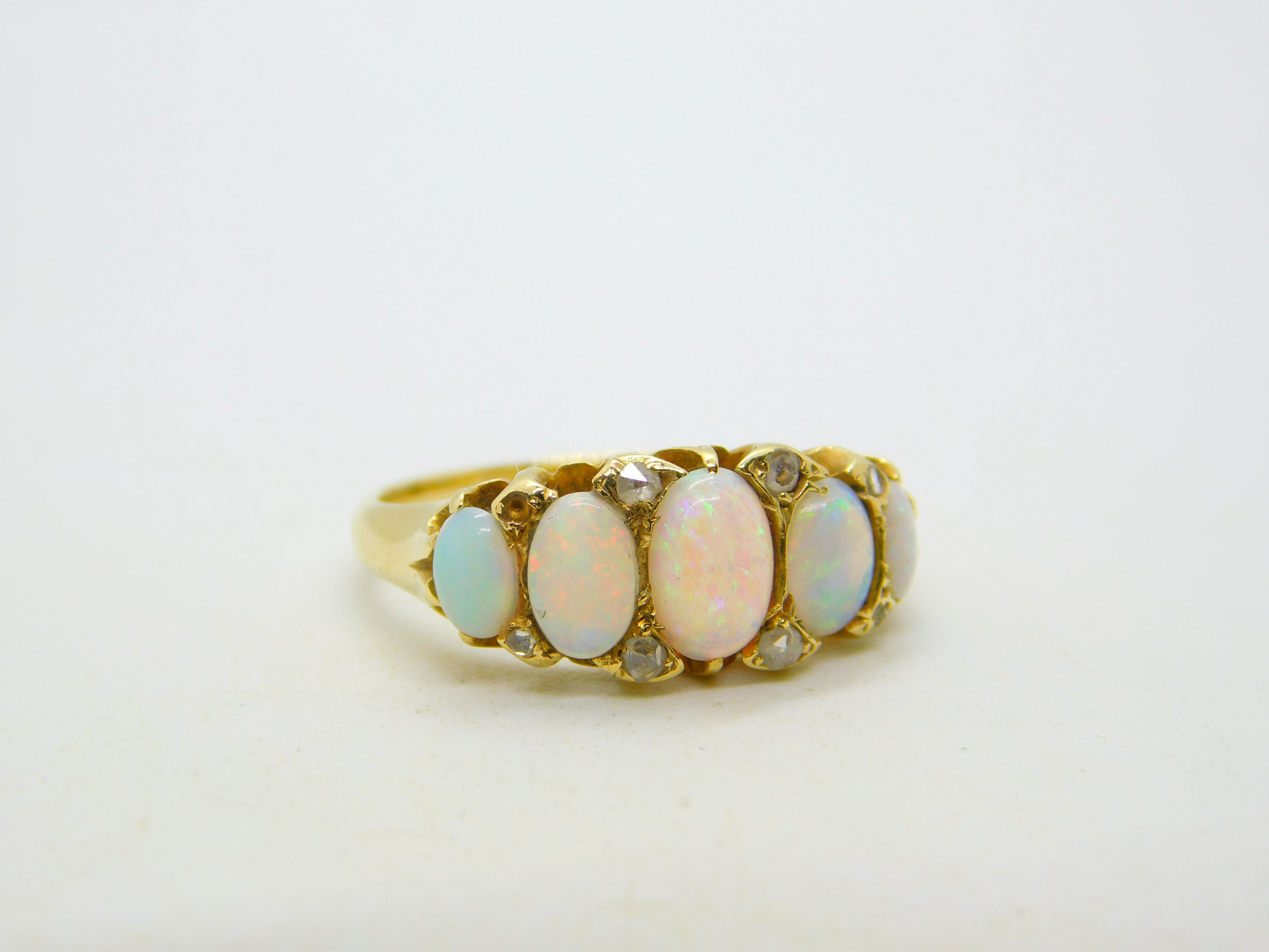 Details: A fantastic and wonderfully designed antique Victorian 18ct yellow gold boat ring set with five graduating cabochon cut opals flanked with old-cut diamonds, hallmarked Birmingham c1880 to the interior very rubbed marks, the gold has been XRF tested, the stones have been tested. This is a wonderful item that would make a perfect gift or addition to any collection.