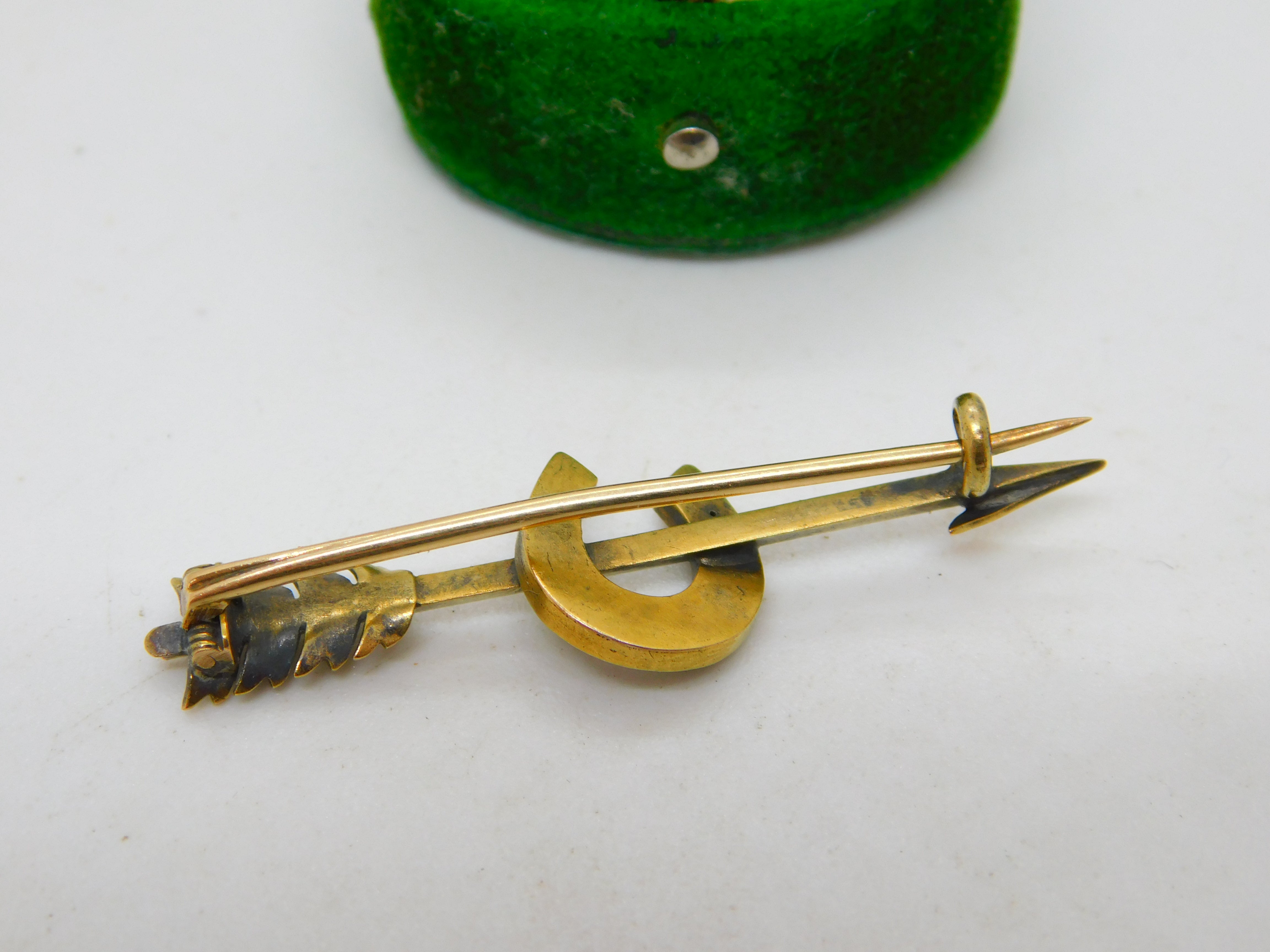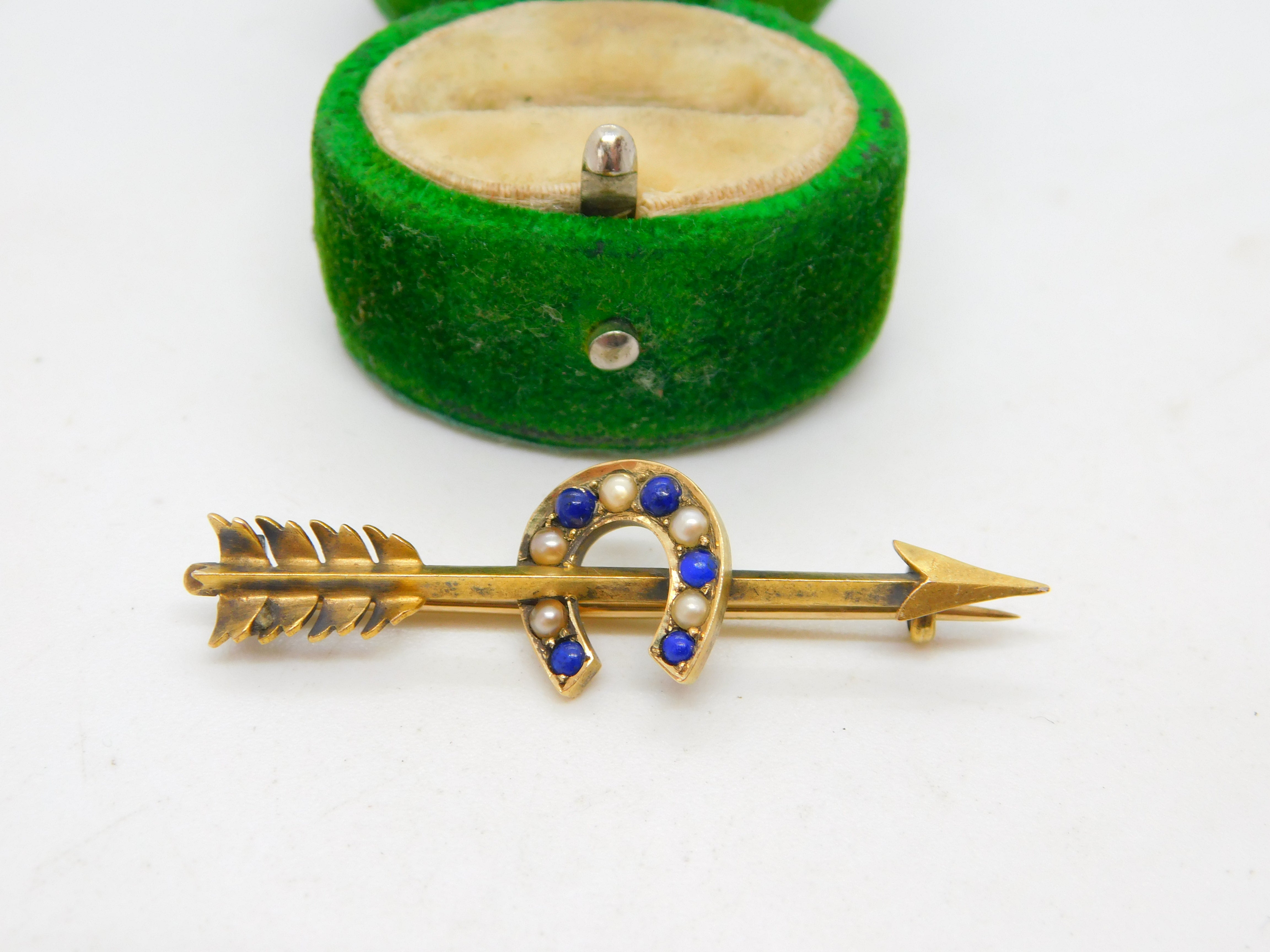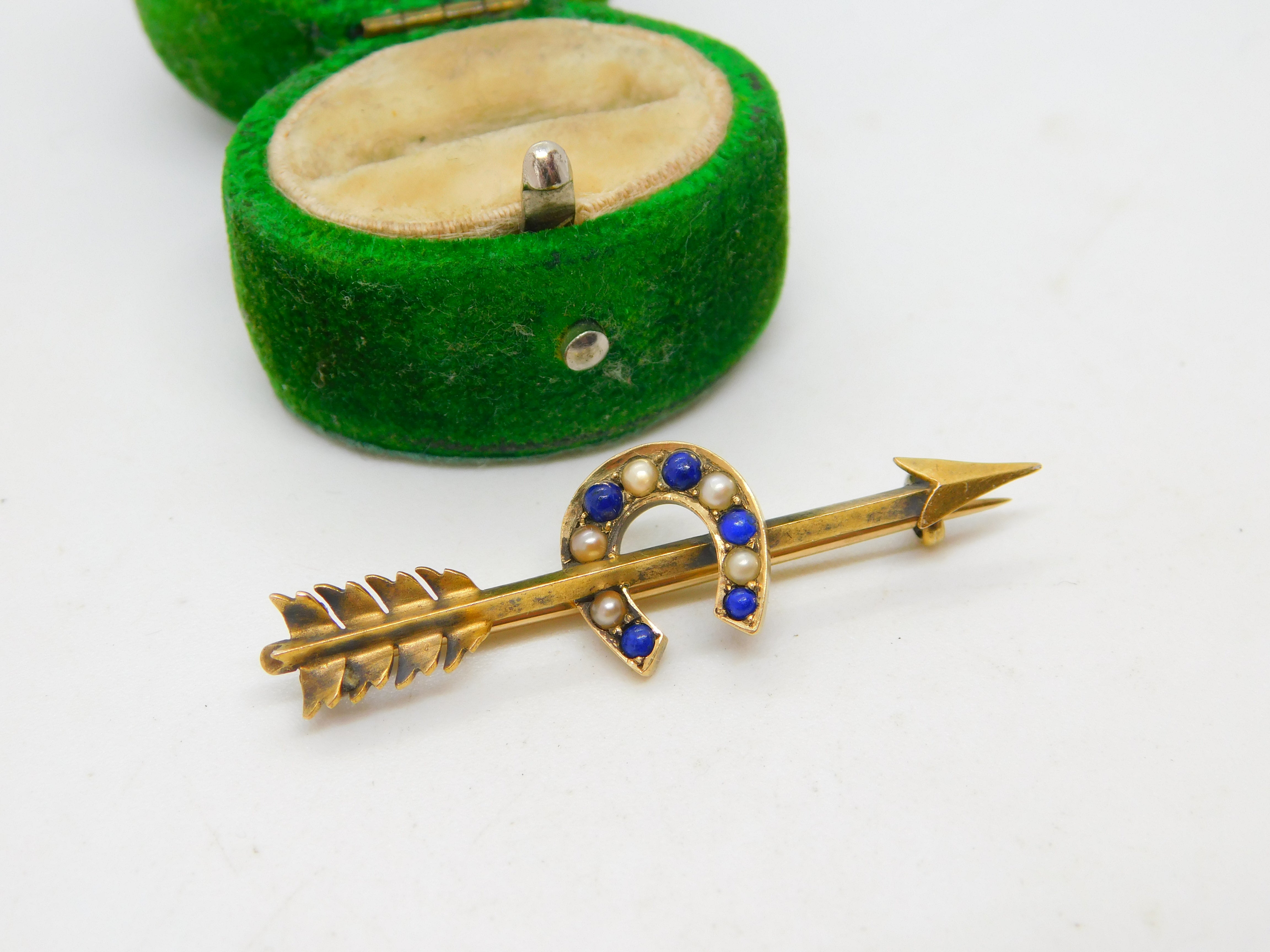 Victorian 18ct Gold, Lapis & Seed Pearl Arrow & Horseshoe Lucky Brooch c1890