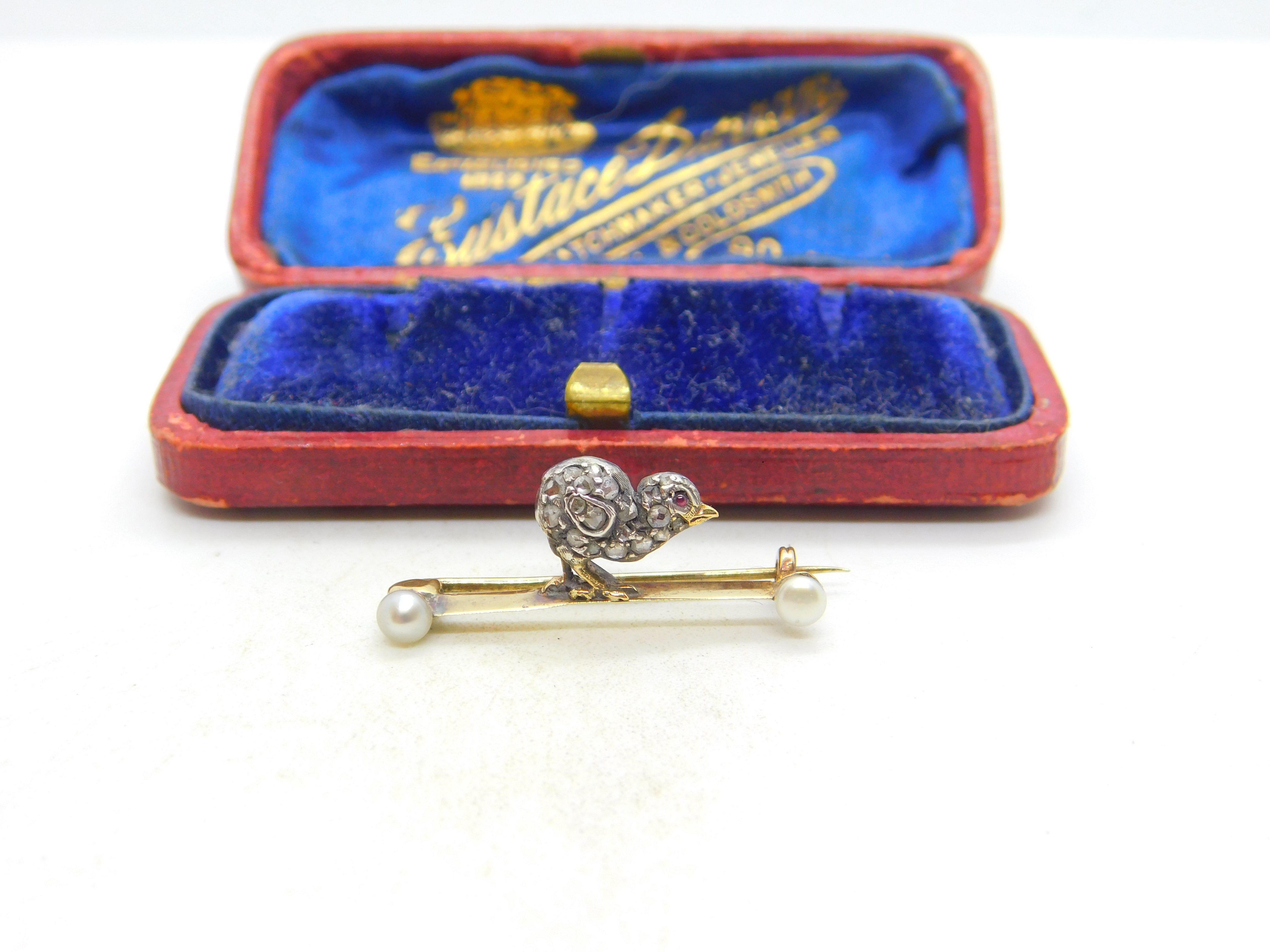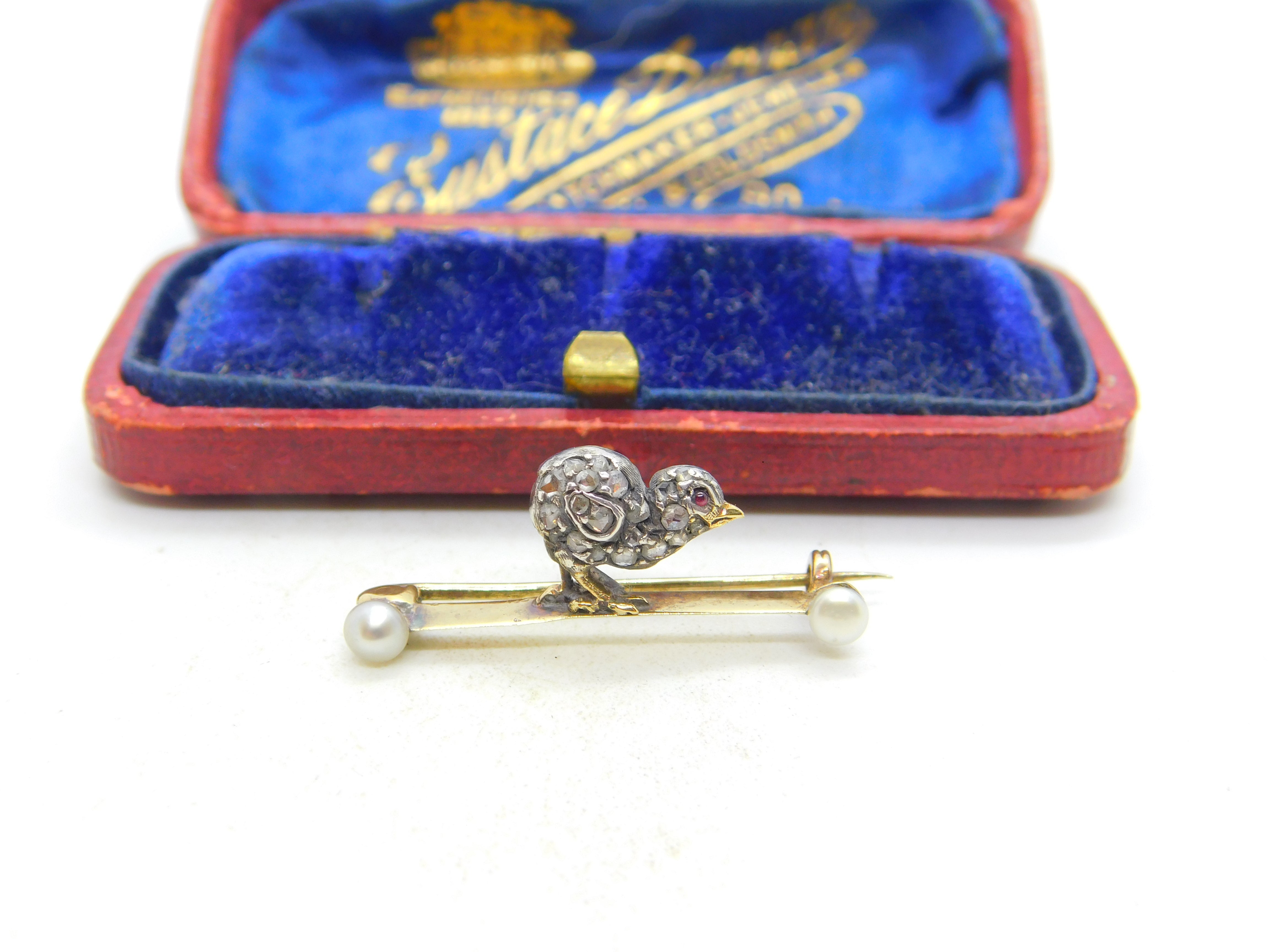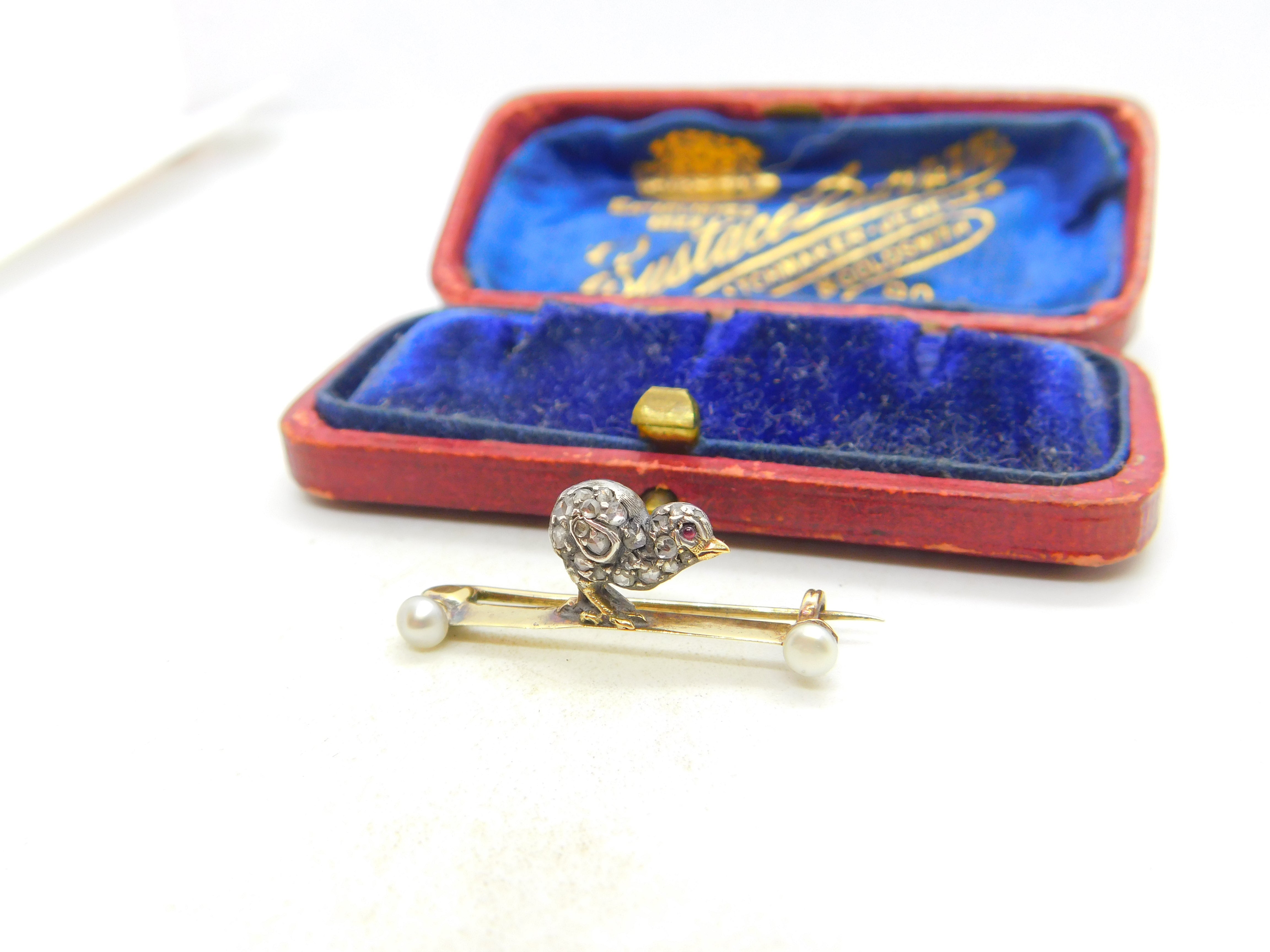 Victorian 18ct Gold, Pearl & Old-Mine Cut Diamond Baby Chick Brooch c1860 Antique