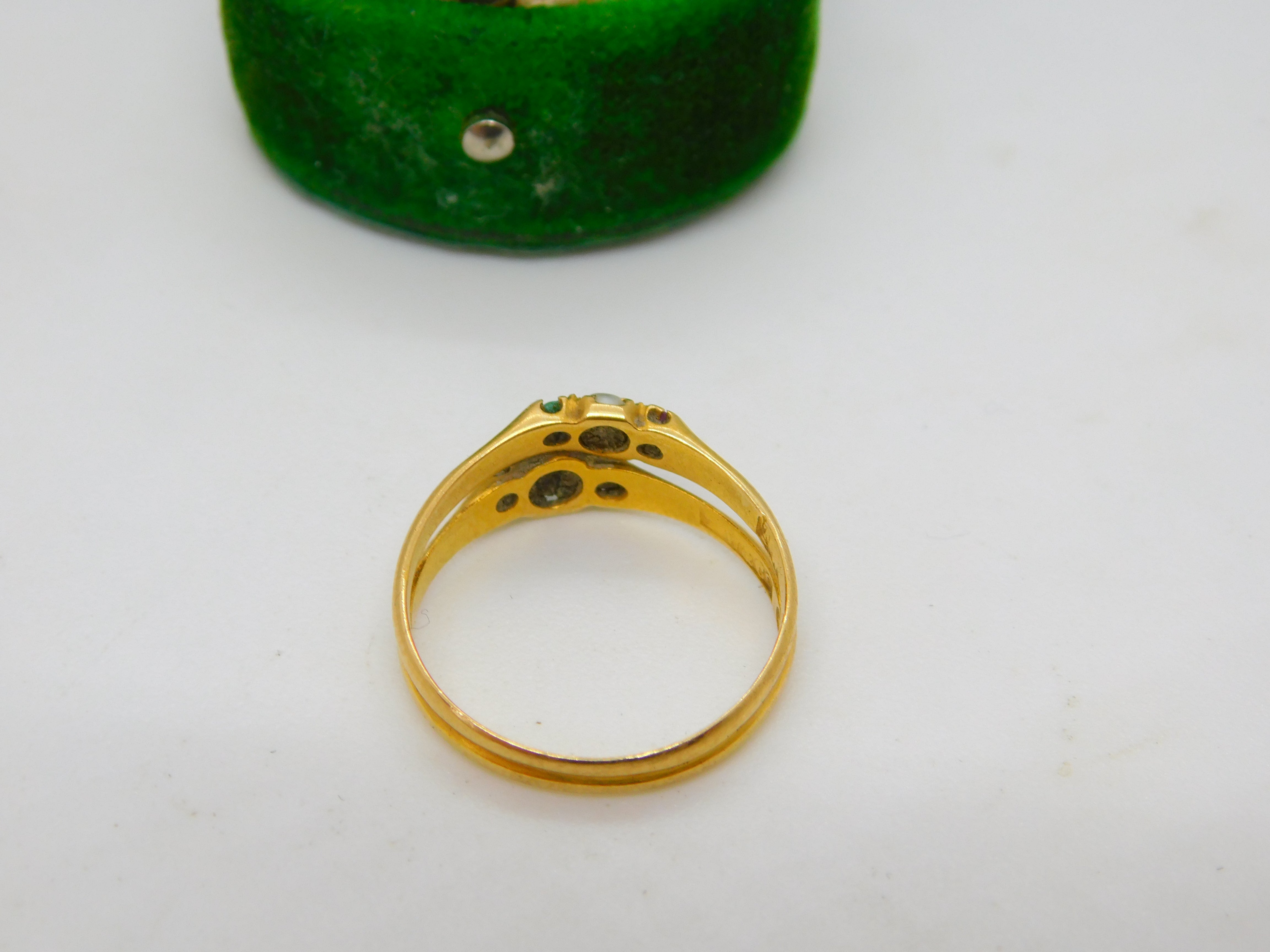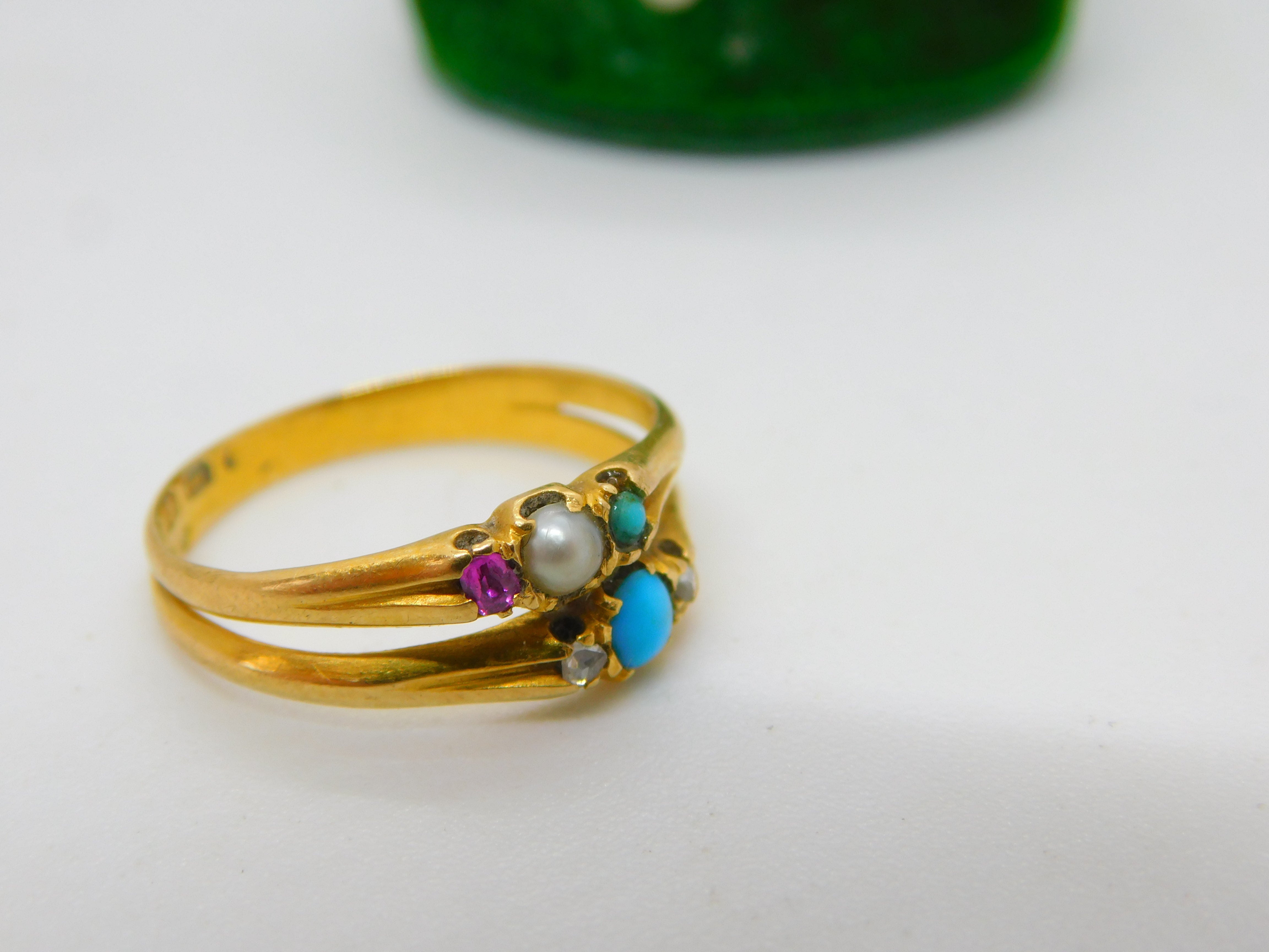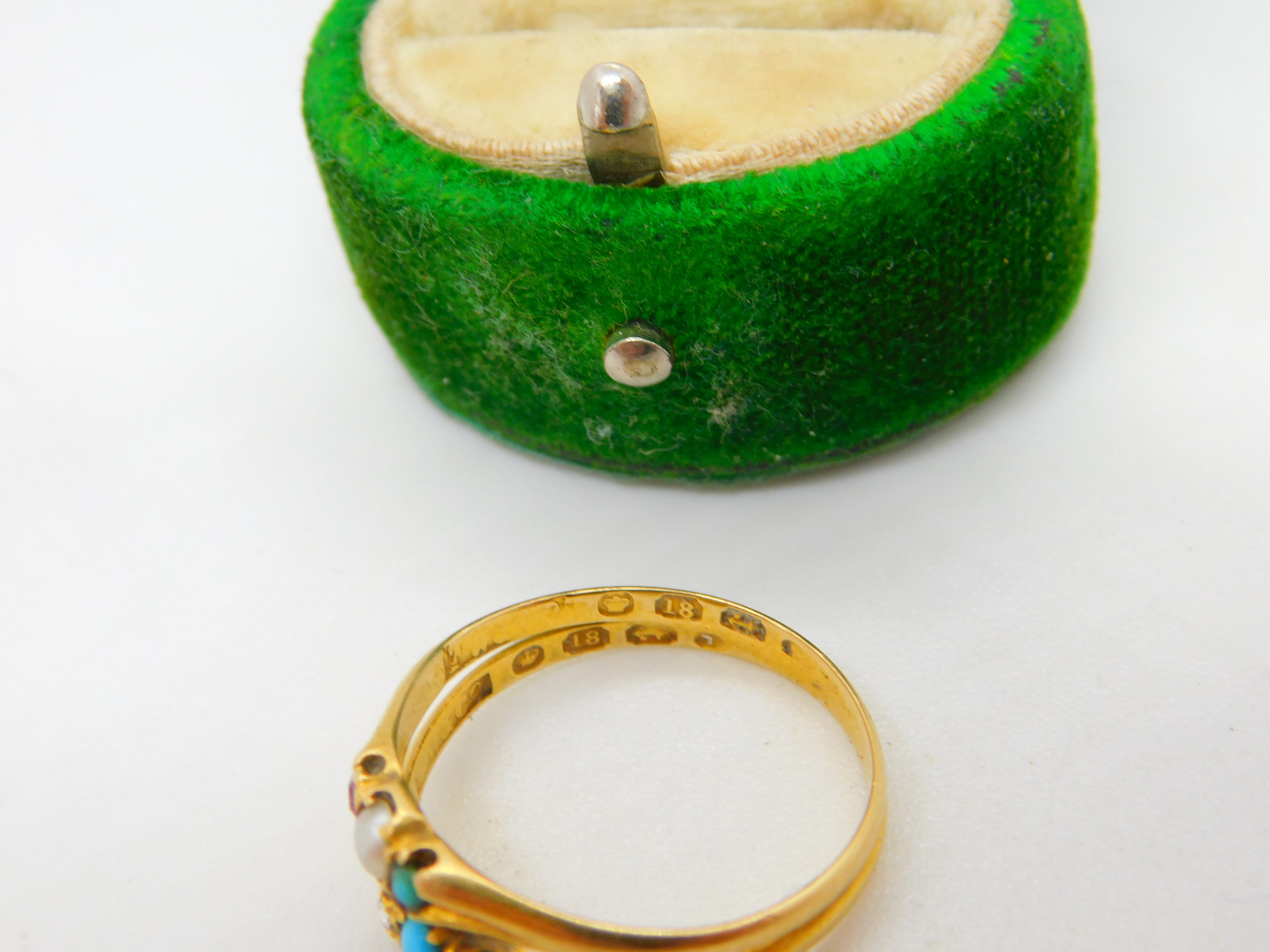 Victorian 18ct Gold, Pearl, Ruby, Diamond & Turquoise Double Band Ring Antique c1860