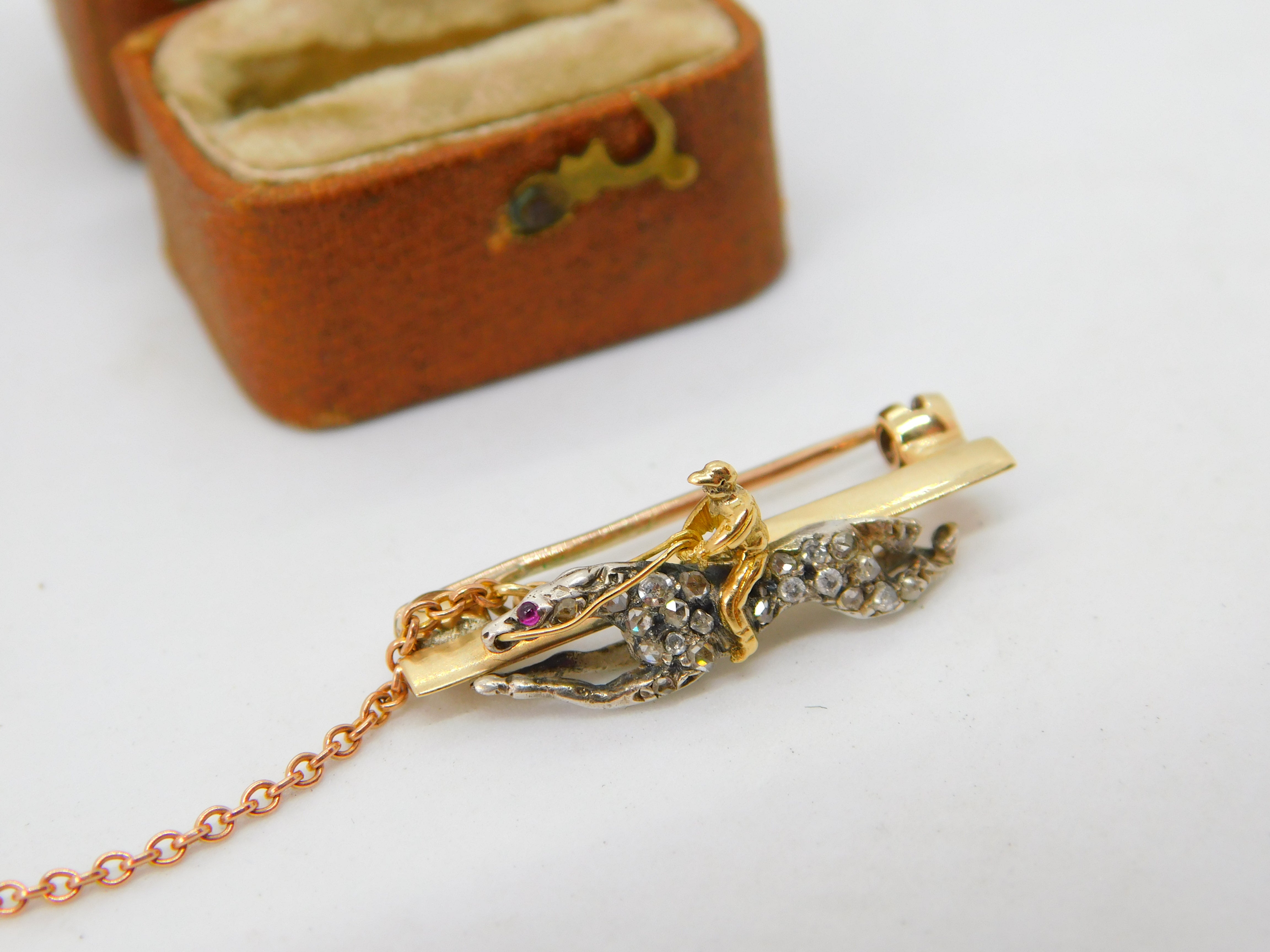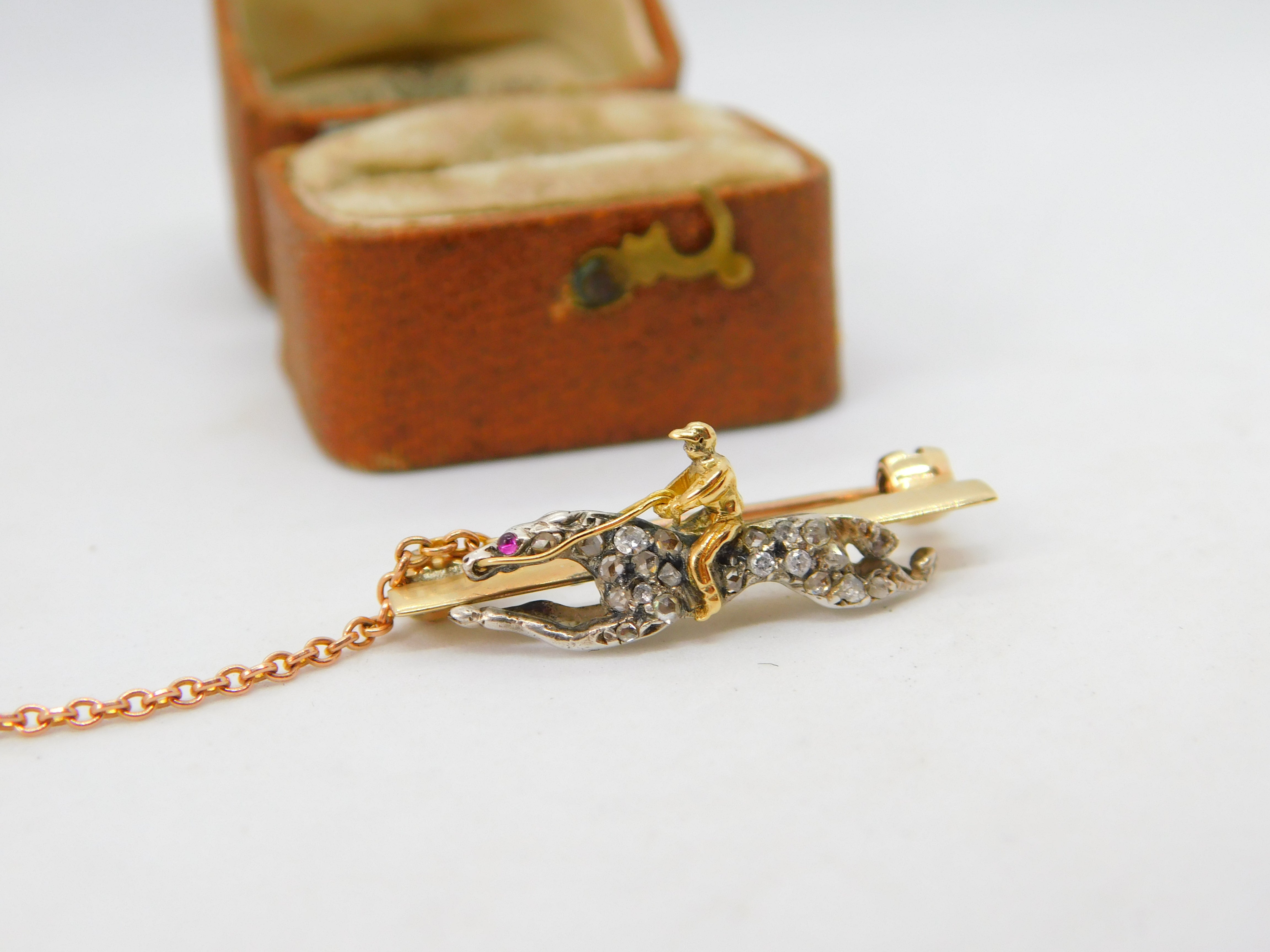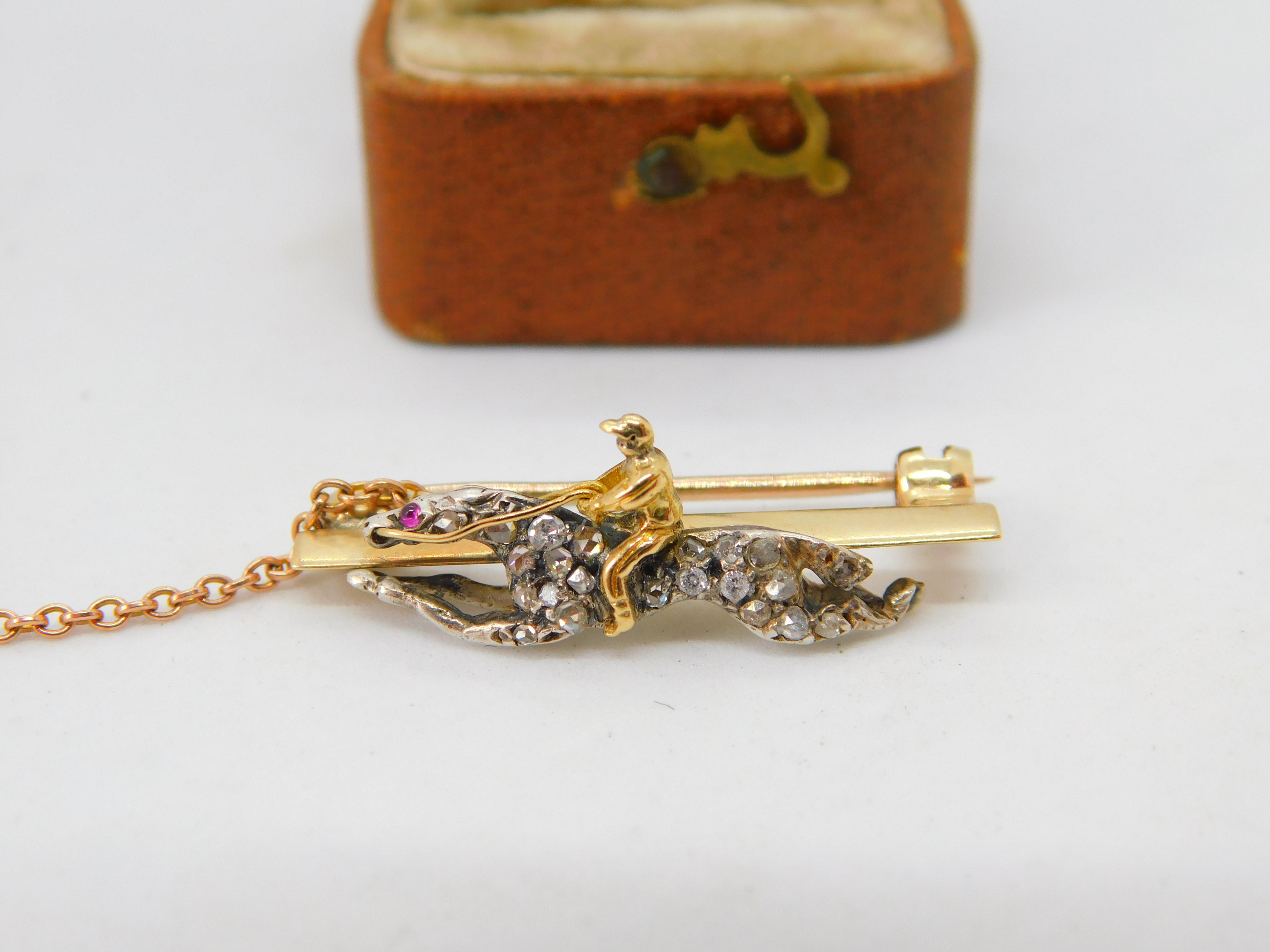 Details: A fantastic and wonderfully designed antique Victorian 18ct yellow gold horse racing jockey lucky brooch pin adorned with pave set diamonds and rubies and secured with a safety chain c1860. The gold has been XRF tested as it is unmarked. The diamonds have been tested. This is a wonderful item that would make a perfect gift or addition to any collection. The BOX pictured is for PRESENTATION ONLY and is NOT included in the listings but used to frame the pictures unless specifically stated otherwise.