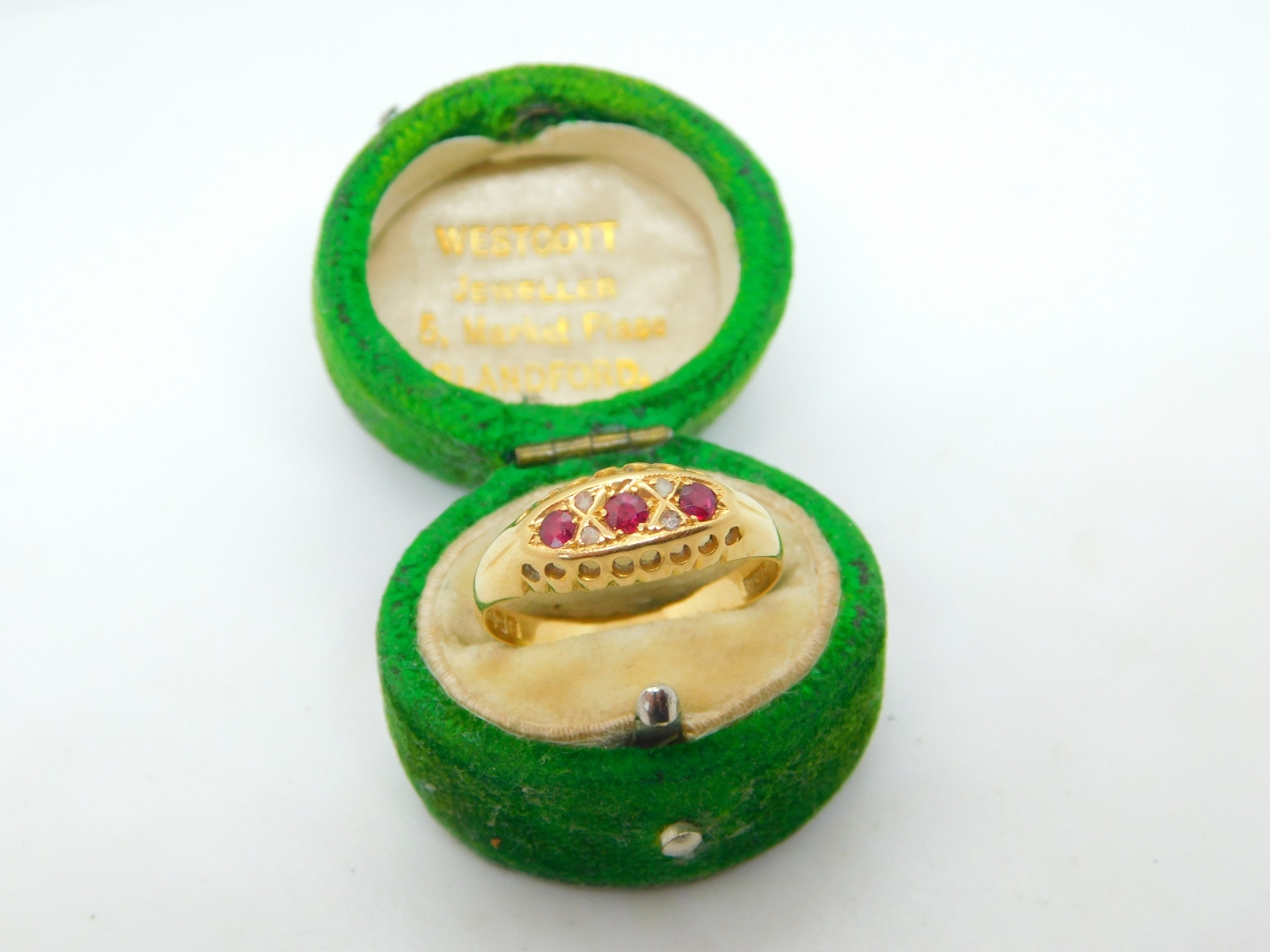 Details: A fantastic and wonderfully designed antique Victorian 18ct yellow gold boat ring set with rubies & diamond hallmarked Birmingham 1893 with nice clear hallmarks. This is a wonderful item that would make a perfect gift or addition to any collection. The BOX pictured is for PRESENTATION ONLY and is NOT included in the listings but used to frame the pictures unless specifically stated otherwise.