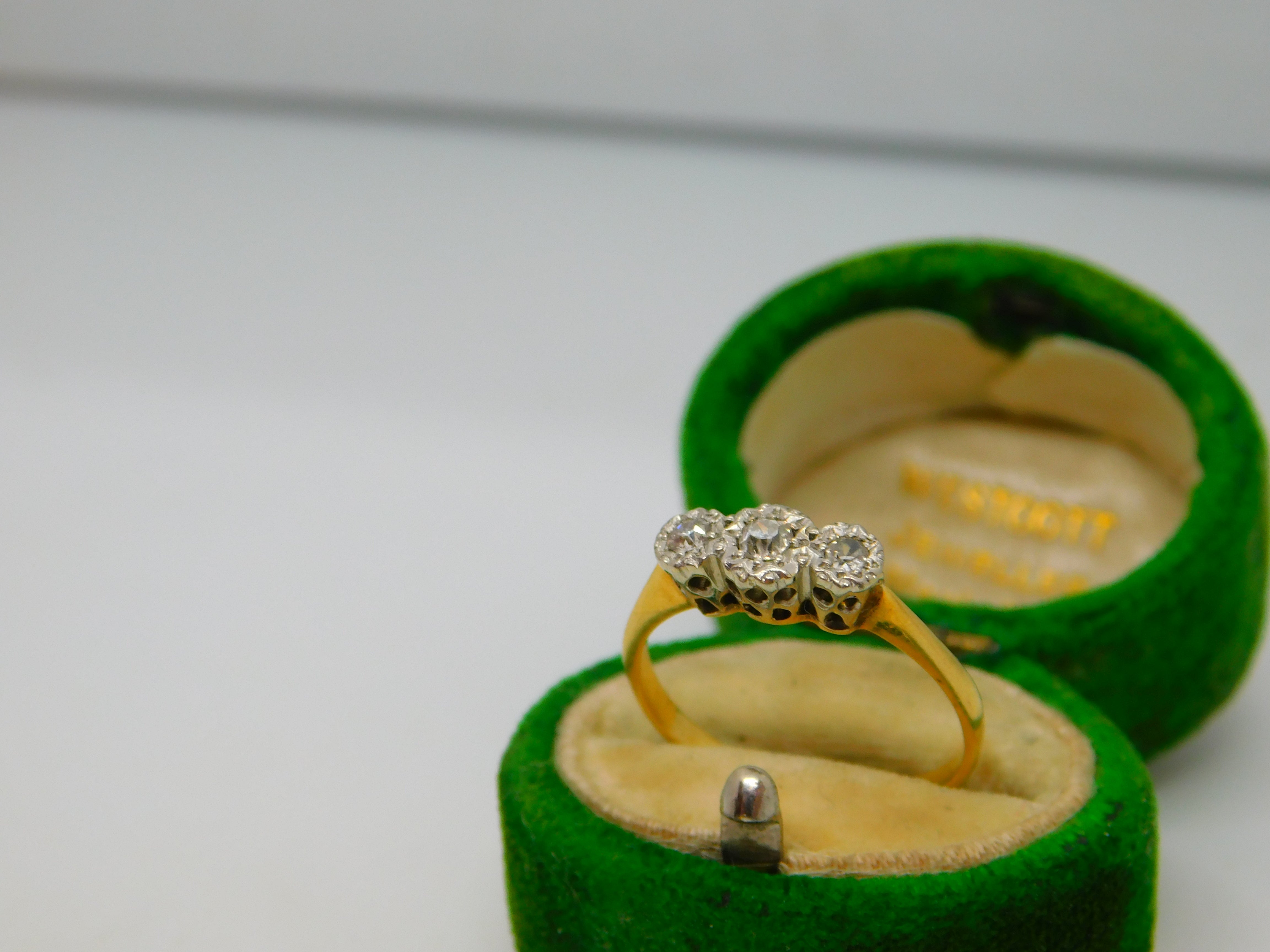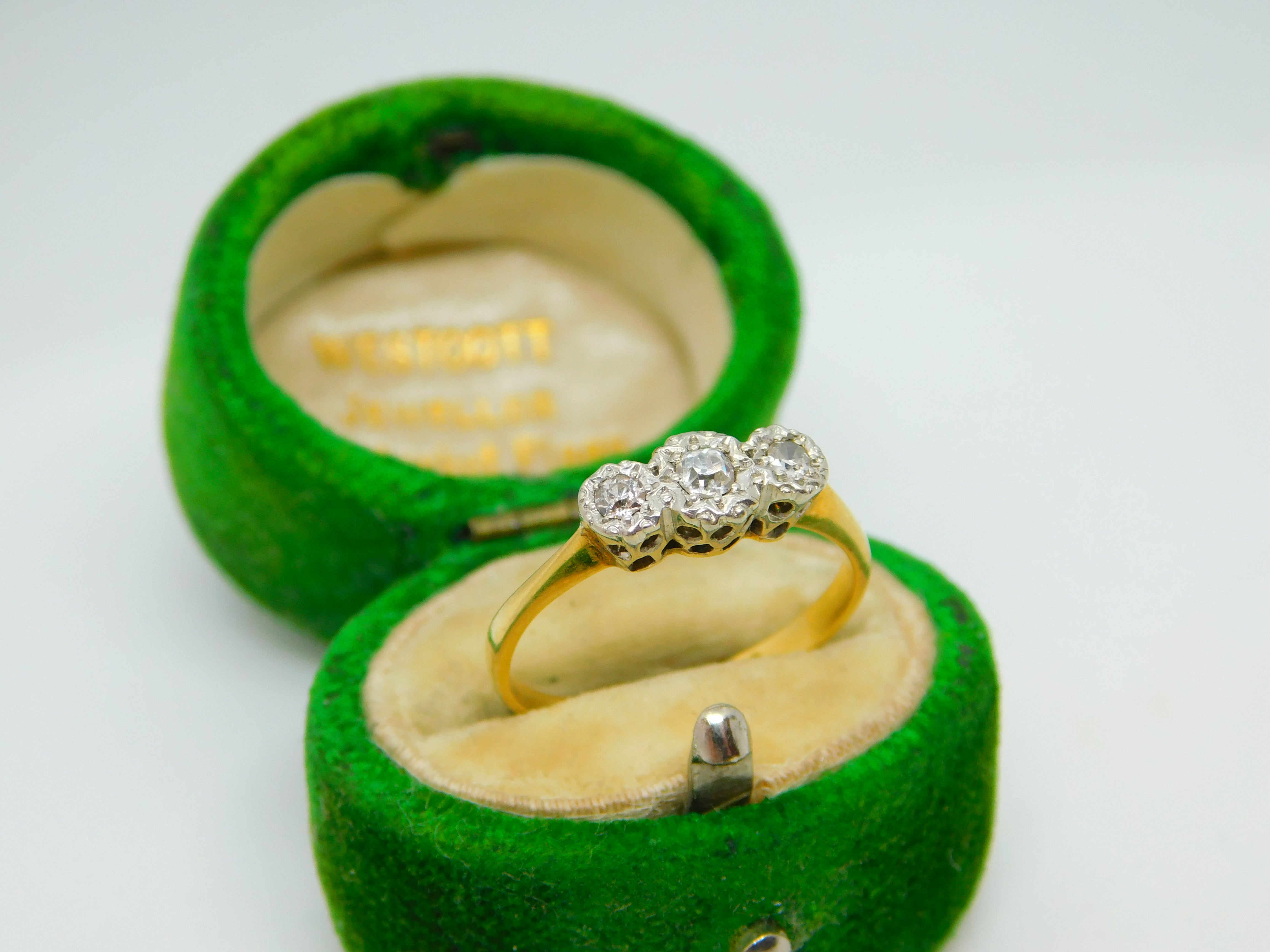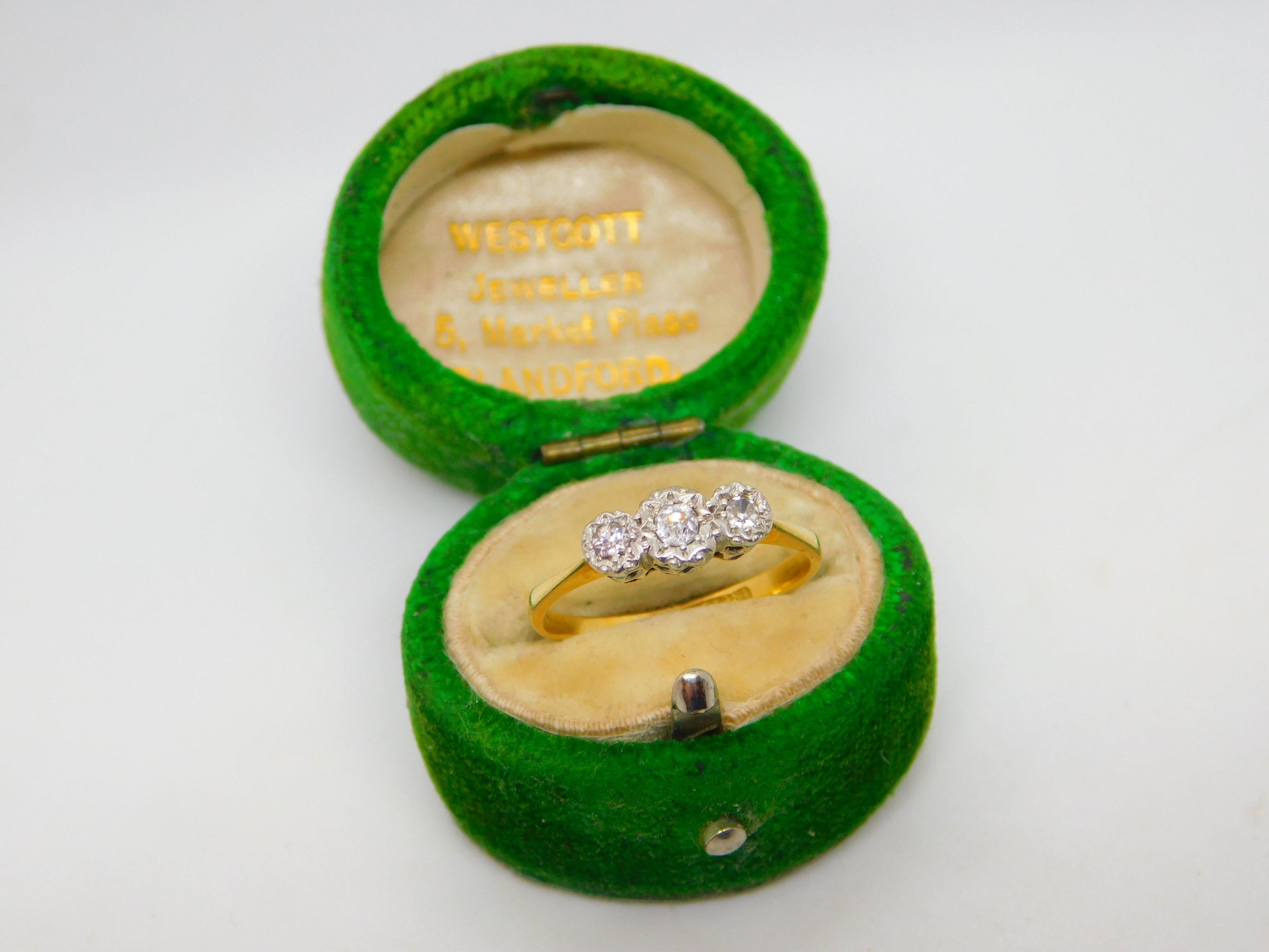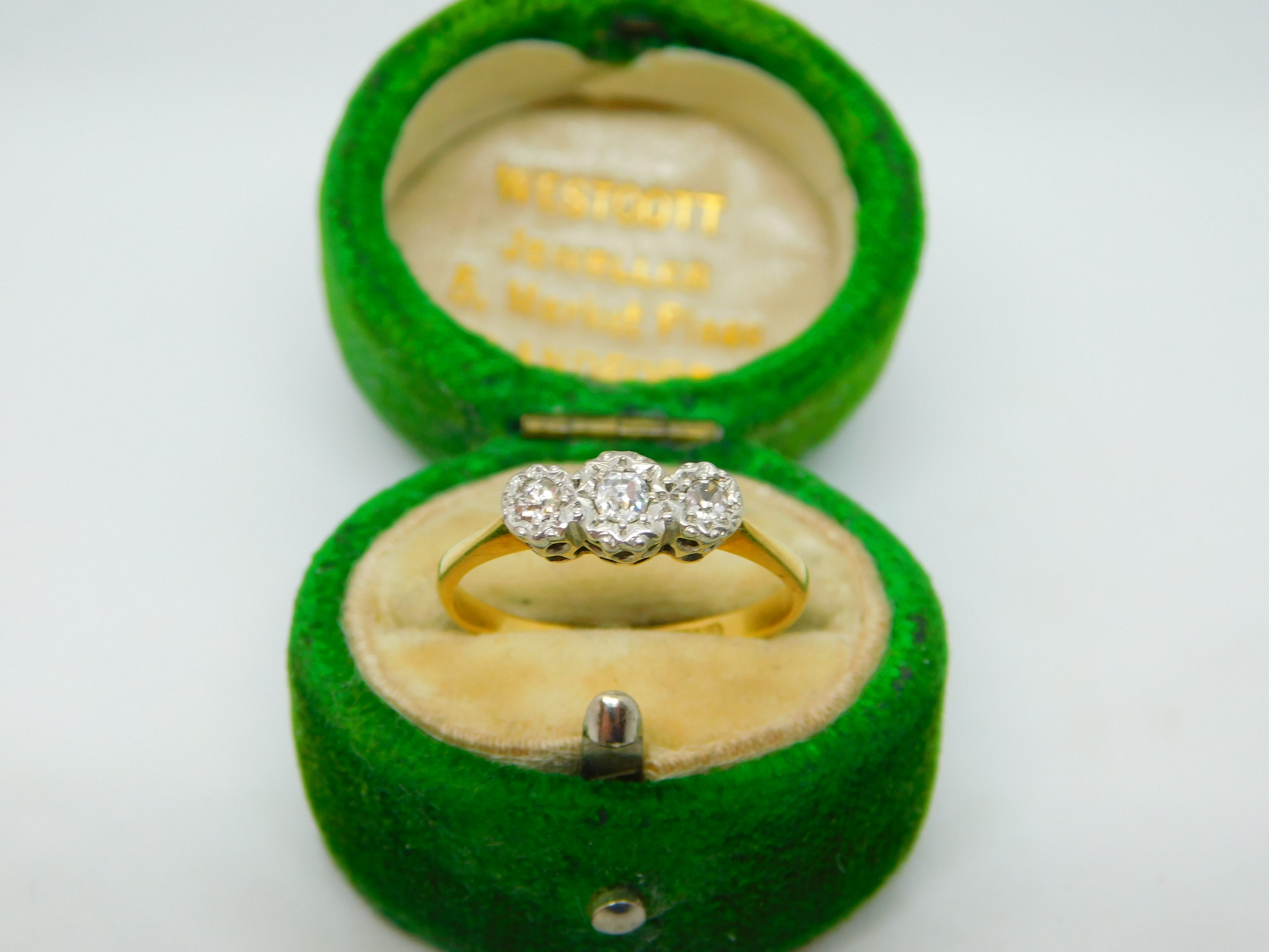 Details: A fantastic and wonderfully designed antique Victorian 18ct yellow gold three stone dress ring set with diamonds, the central stone approximately 0.1ct hallmarked to the interior band c1890. This is a wonderful item that would make a perfect gift or addition to any collection. The BOX pictured is for PRESENTATION ONLY and is NOT included in the listings but used to frame the pictures unless specifically stated otherwise.