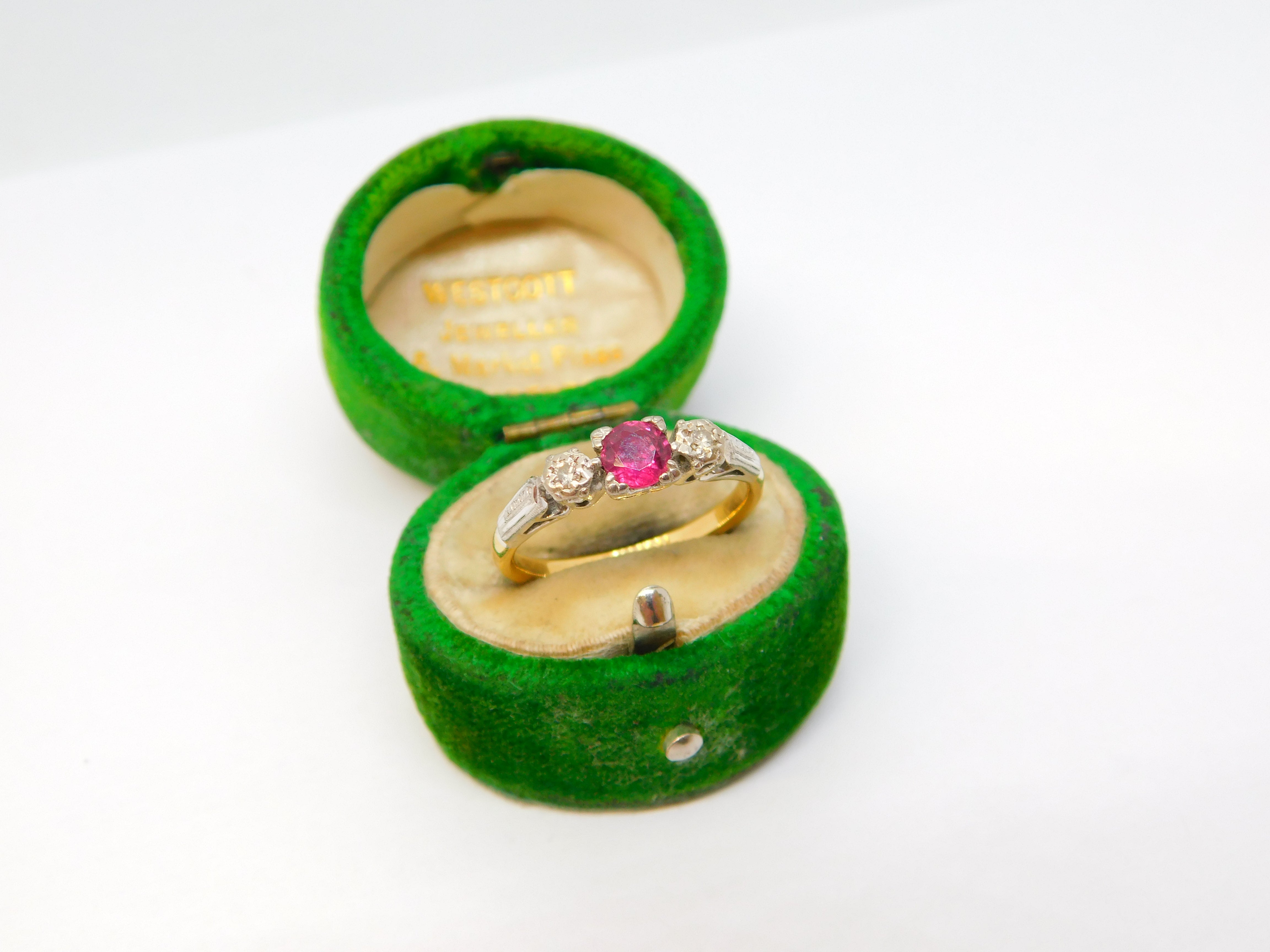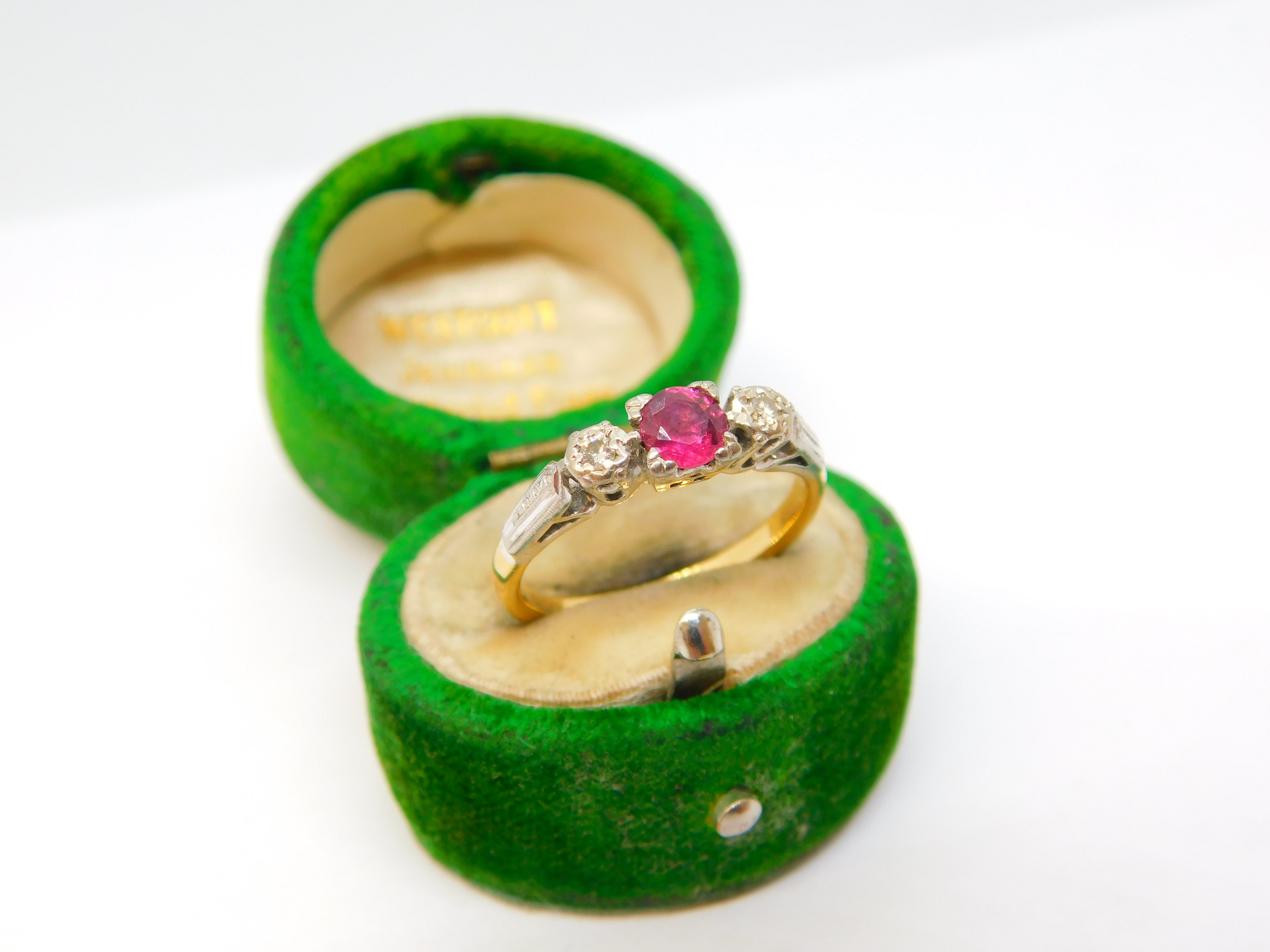 Details: A fantastic and wonderfully designed antique Victorian 18ct yellow gold dress ring set with central 0.2ct ruby flanked with two smaller diamonds hallmarked to the interior c1890, the stones have been tested. This is a wonderful item that would make a perfect gift or addition to any collection. The BOX pictured is for PRESENTATION ONLY and is NOT included in the listings but used to frame the pictures unless specifically stated otherwise.