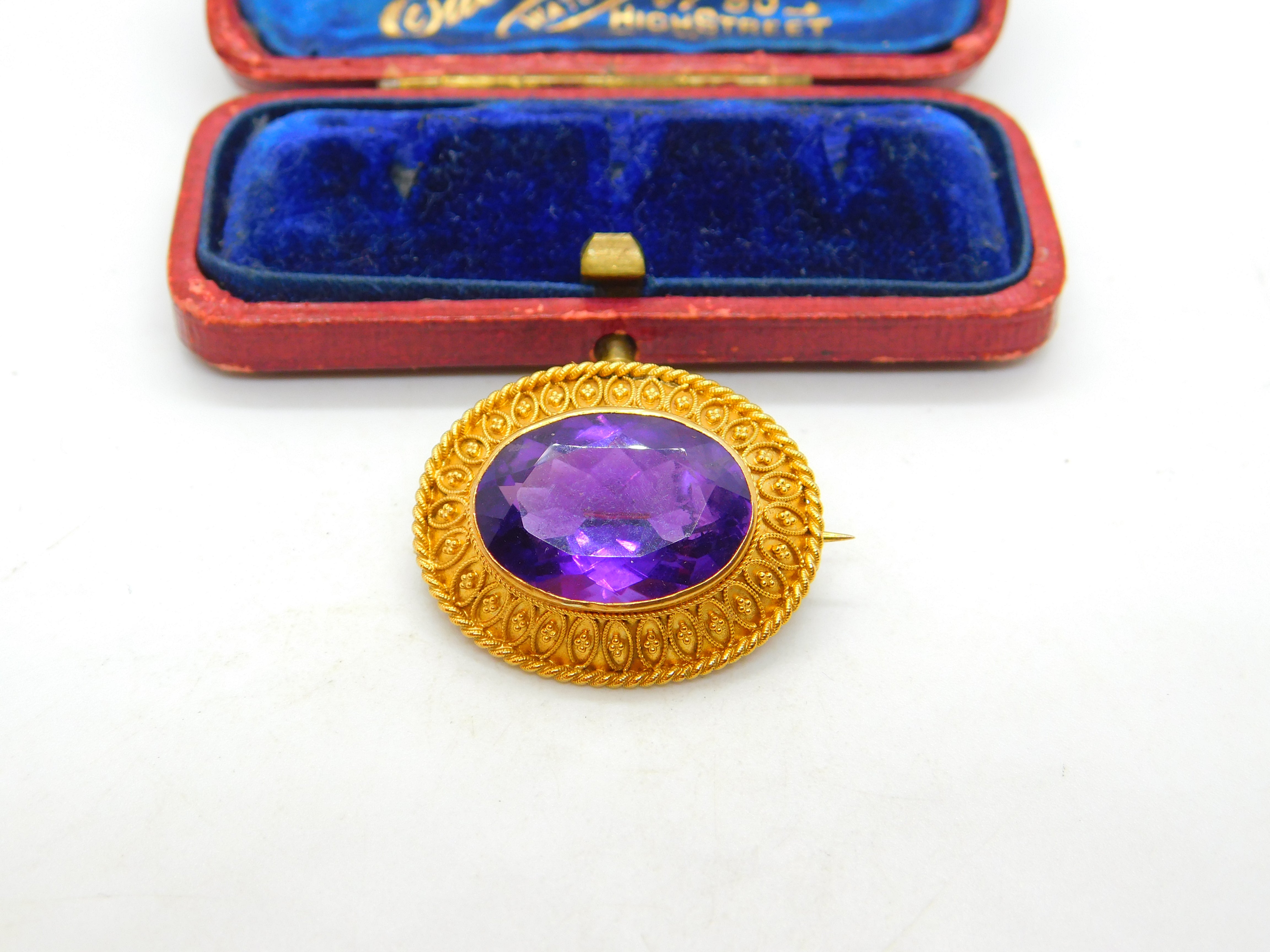 Victorian 18ct Yellow Gold & Amethyst Set Etruscan Style Brooch Antique c1880