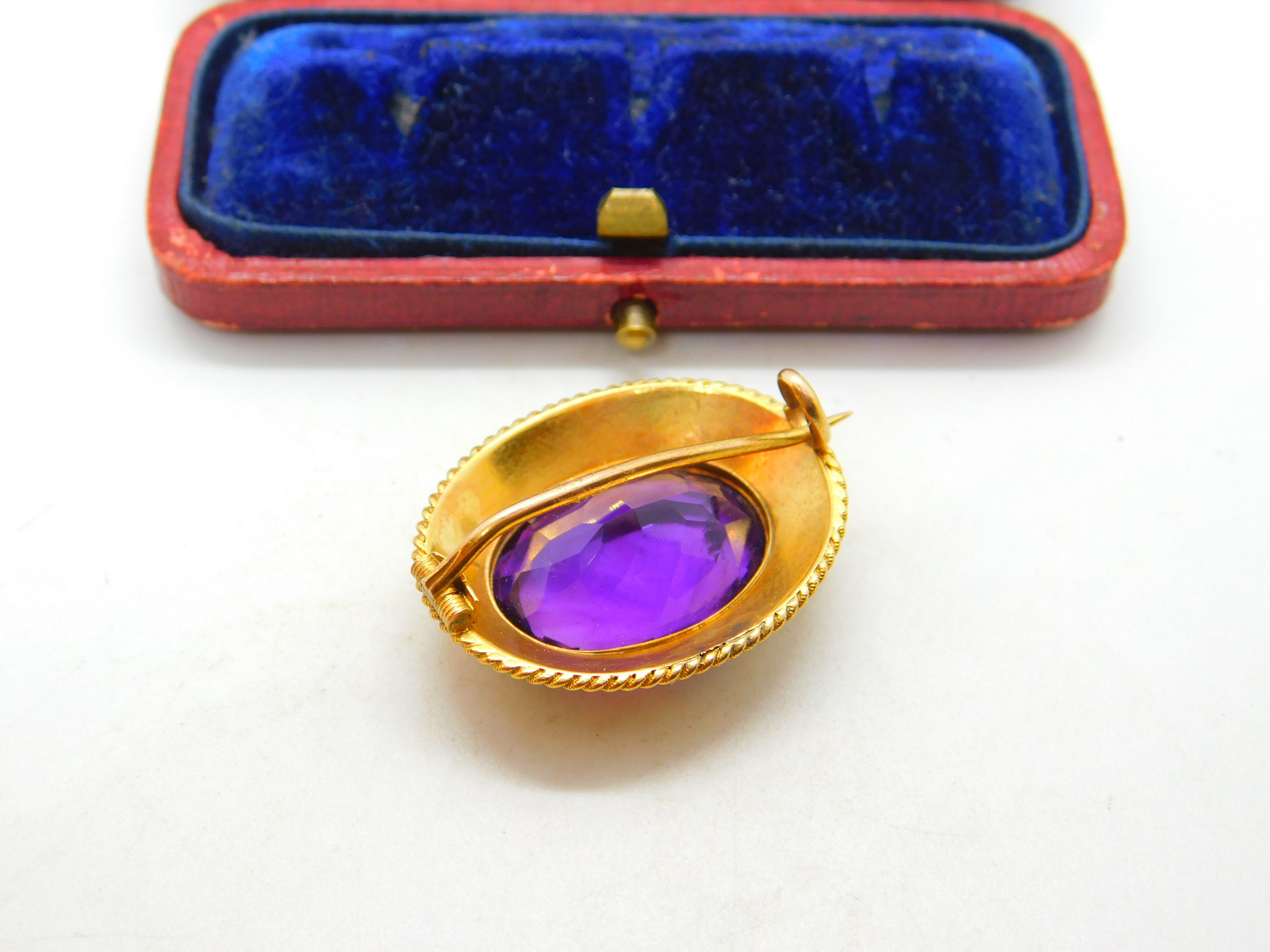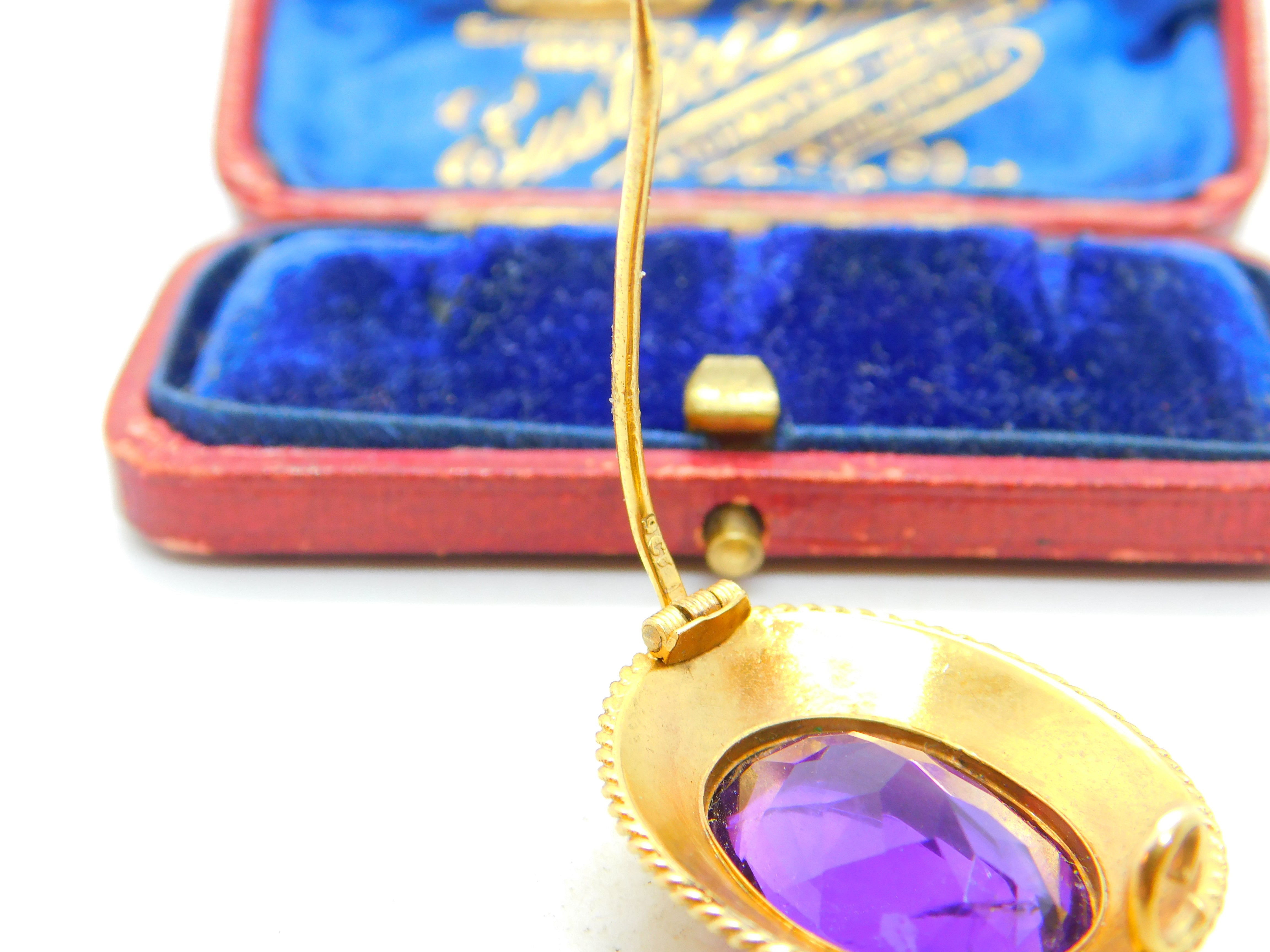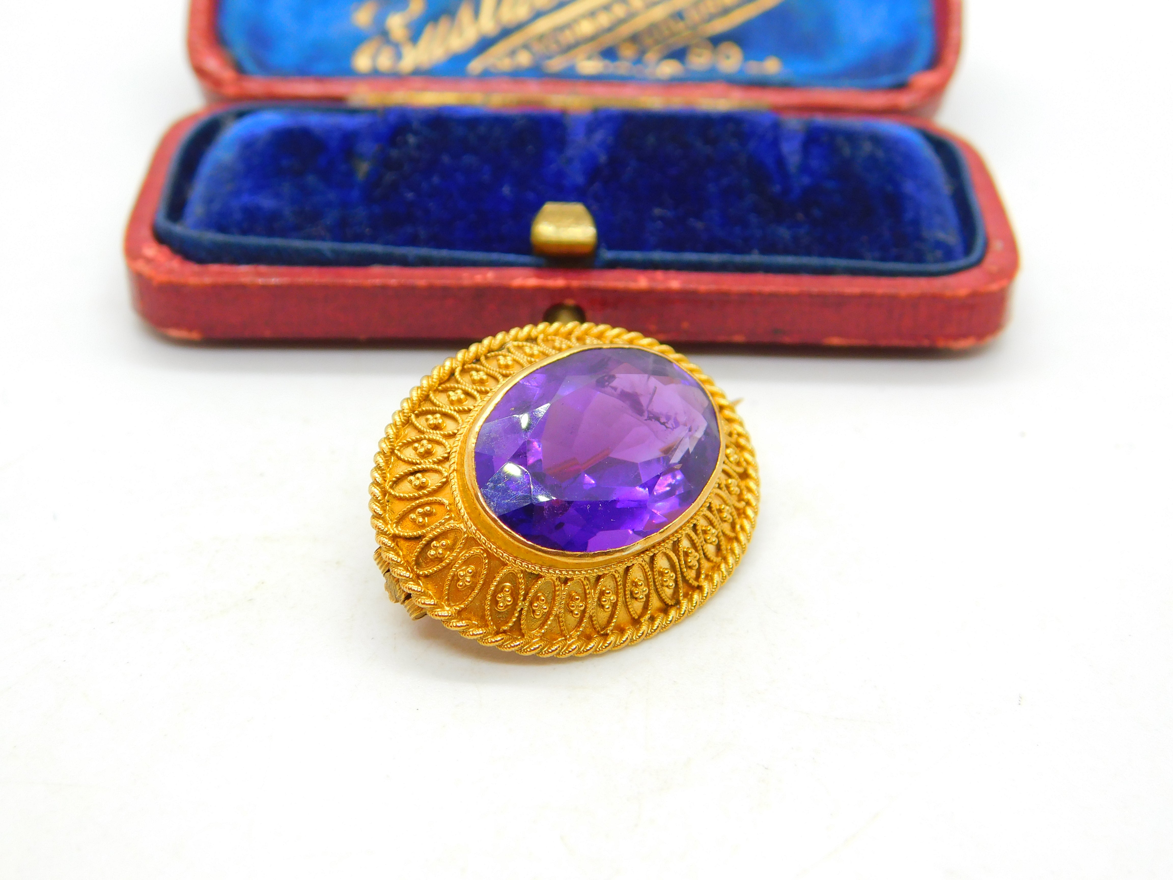Details: A fantastic and wonderfully designed antique Victorian 18ct yellow gold etruscan style brooch set with superb deep purple faceted amethyst c1880 - the gold has been XRF tested and the pin is 9ct and is also marked 9ct. This is a wonderful item that would make a perfect gift or addition to any collection. The BOX pictured is for PRESENTATION ONLY and is NOT included in the listings but used to frame the pictures unless specifically stated otherwise.