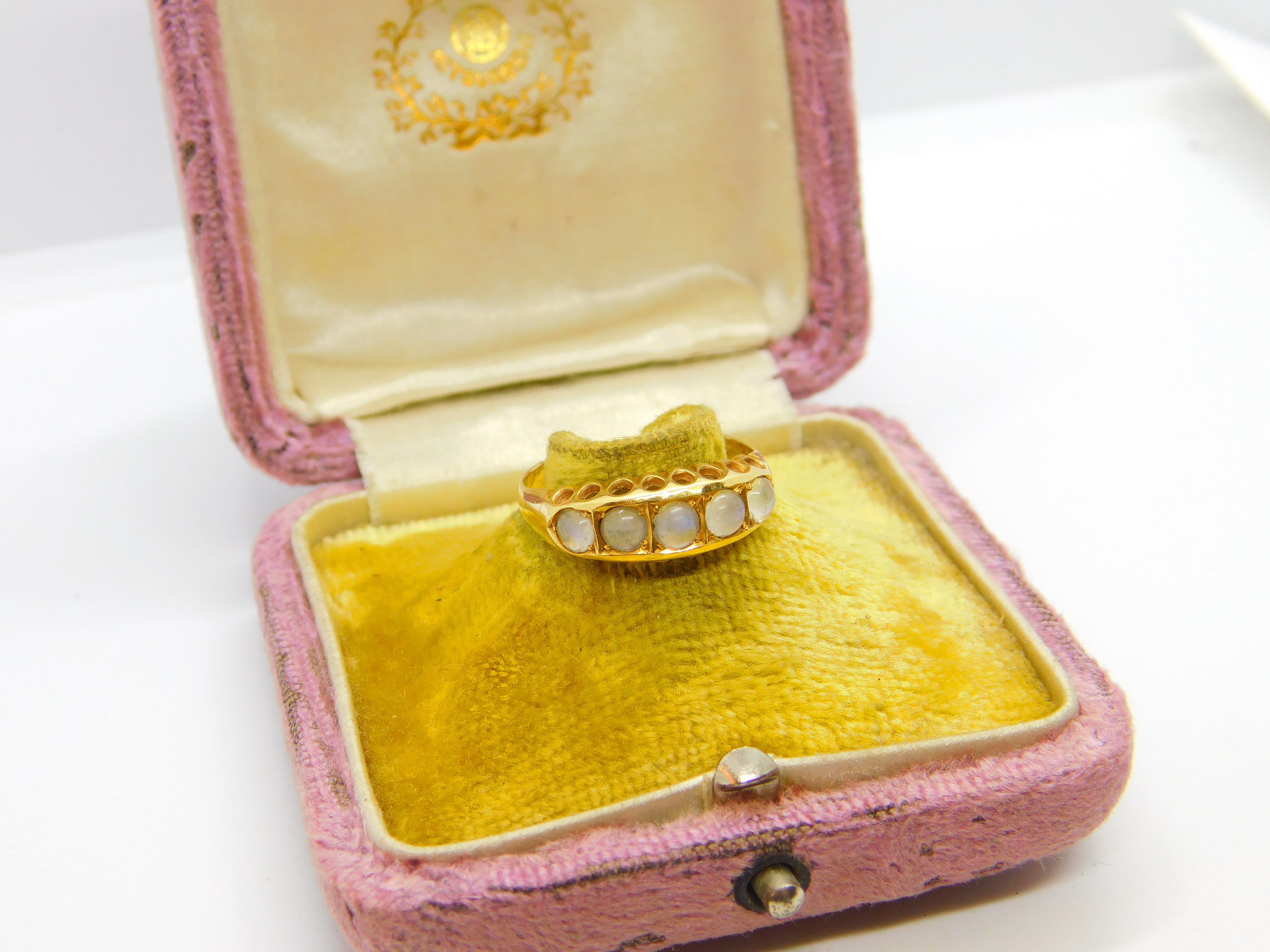 Details: A fantastic and wonderfully designed antique Victorian 18ct yellow gold boat ring set with five cabochon cut moonstones hallmarked Chester 1899 to the interior band. This is a wonderful item that would make a perfect gift or addition to any collection. The BOX pictured is for PRESENTATION ONLY and is NOT included in the listings but used to frame the pictures unless specifically stated otherwise.