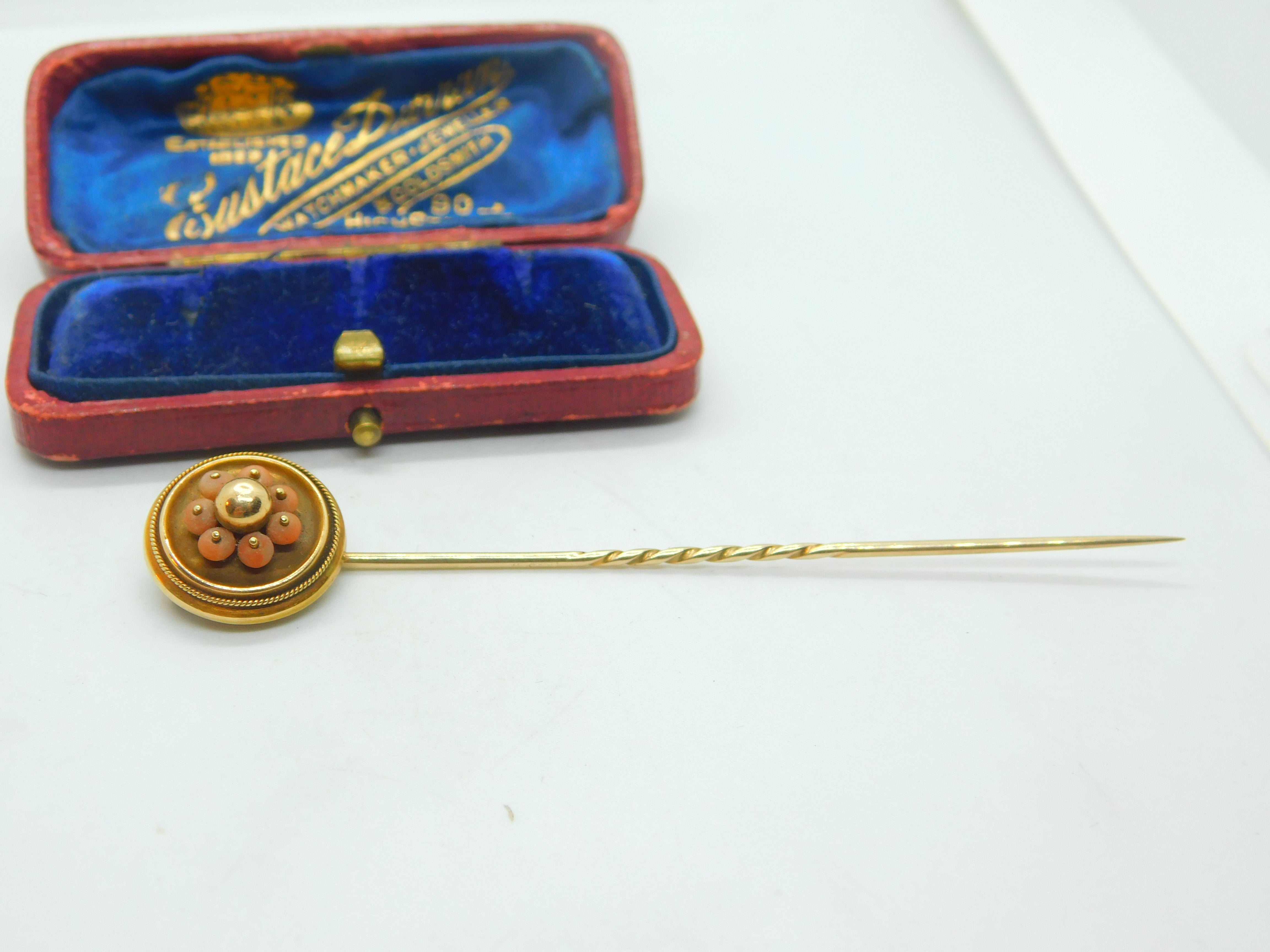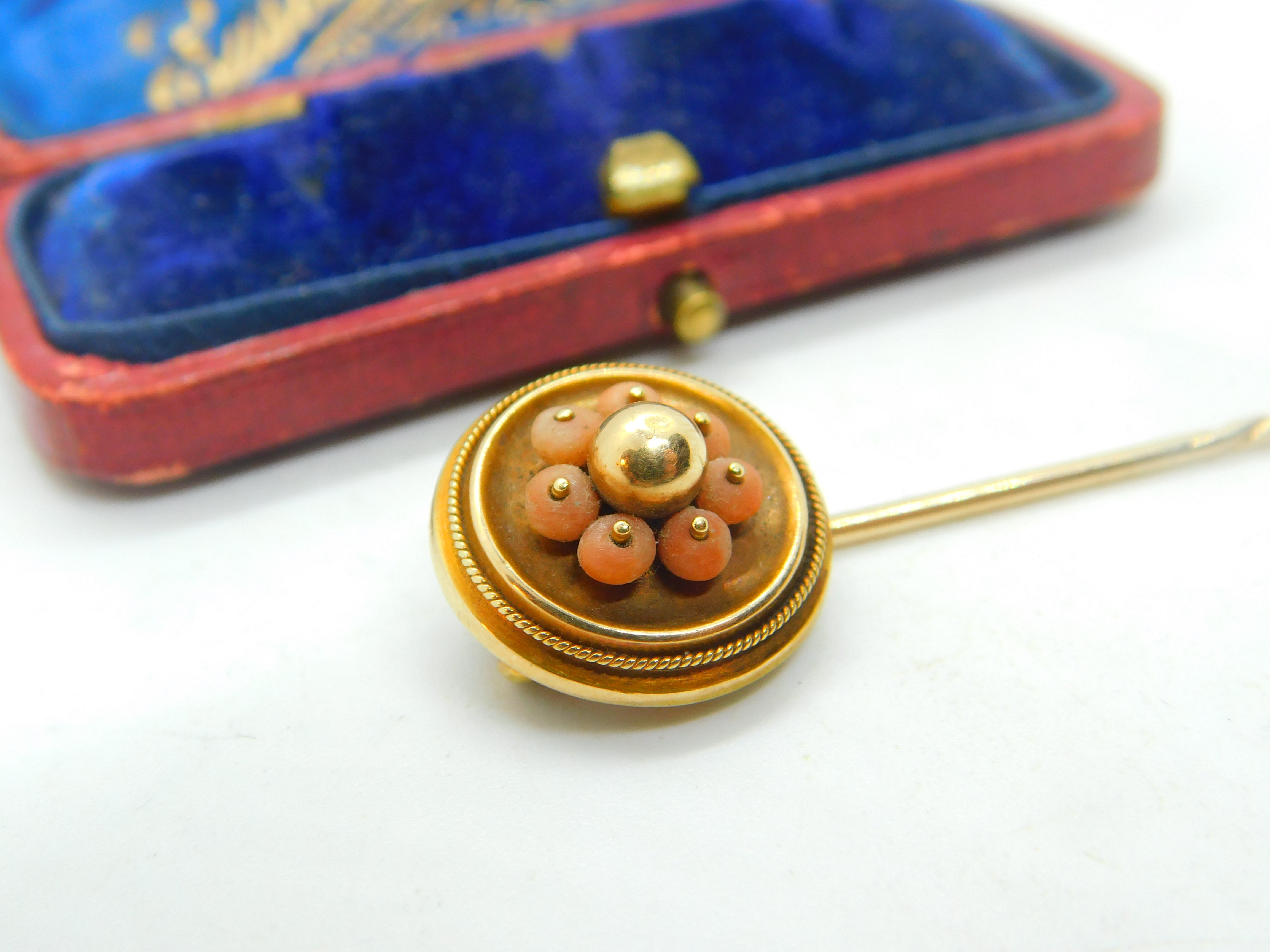 Details: A fantastic and wonderfully designed antique Victorian etruscan style 18ct yellow gold stick pin adorned with red coral beads to the top c1880. The gold has been XRF tested - the pin is 9ct. Acid test mark to the back of the head. This is a wonderful item that would make a perfect gift or addition to any collection. The BOX pictured is for PRESENTATION ONLY and is NOT included in the listings but used to frame the pictures unless specifically stated otherwise.