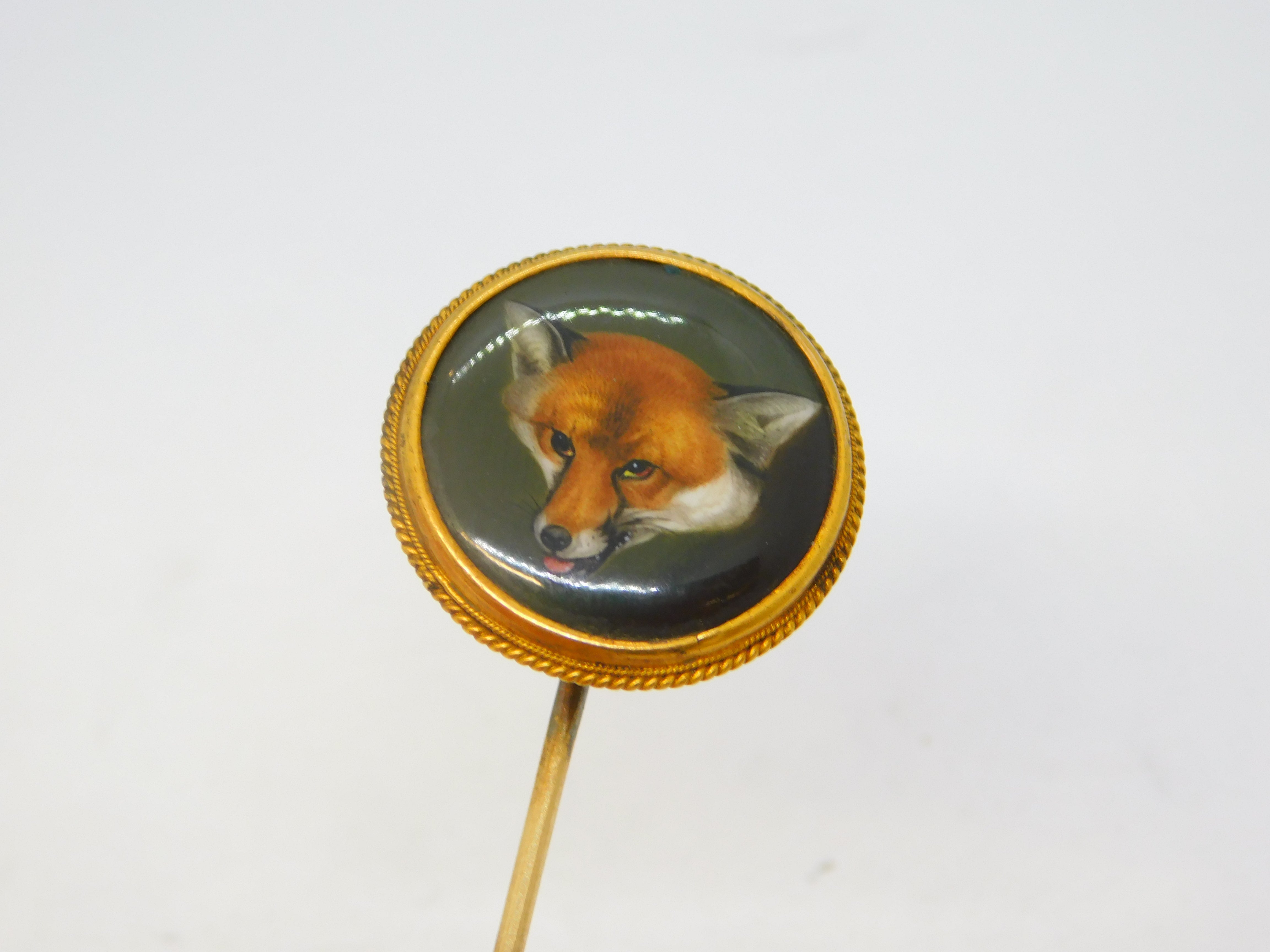 Details: A fantastic and wonderfully designed antique mid-Victorian large 18ct yellow gold mounted stick pin set with stunning enamel terminal in the form of a fox head or mask with lovely detailing, the gold has been XRF tested as it is unmarked - the top is 18ct and the pin is 9ct. This is a wonderful item that would make a perfect gift or addition to any collection.