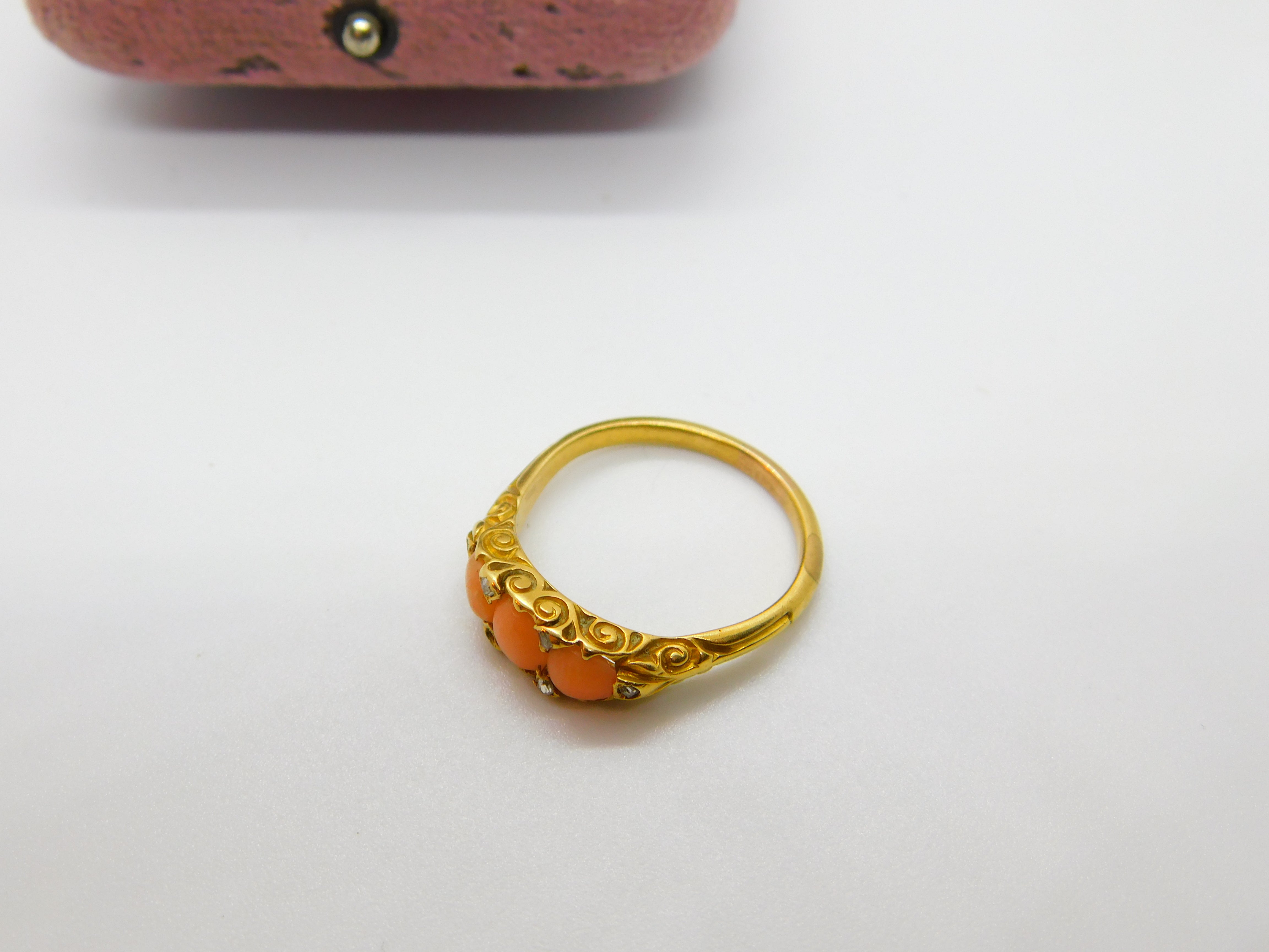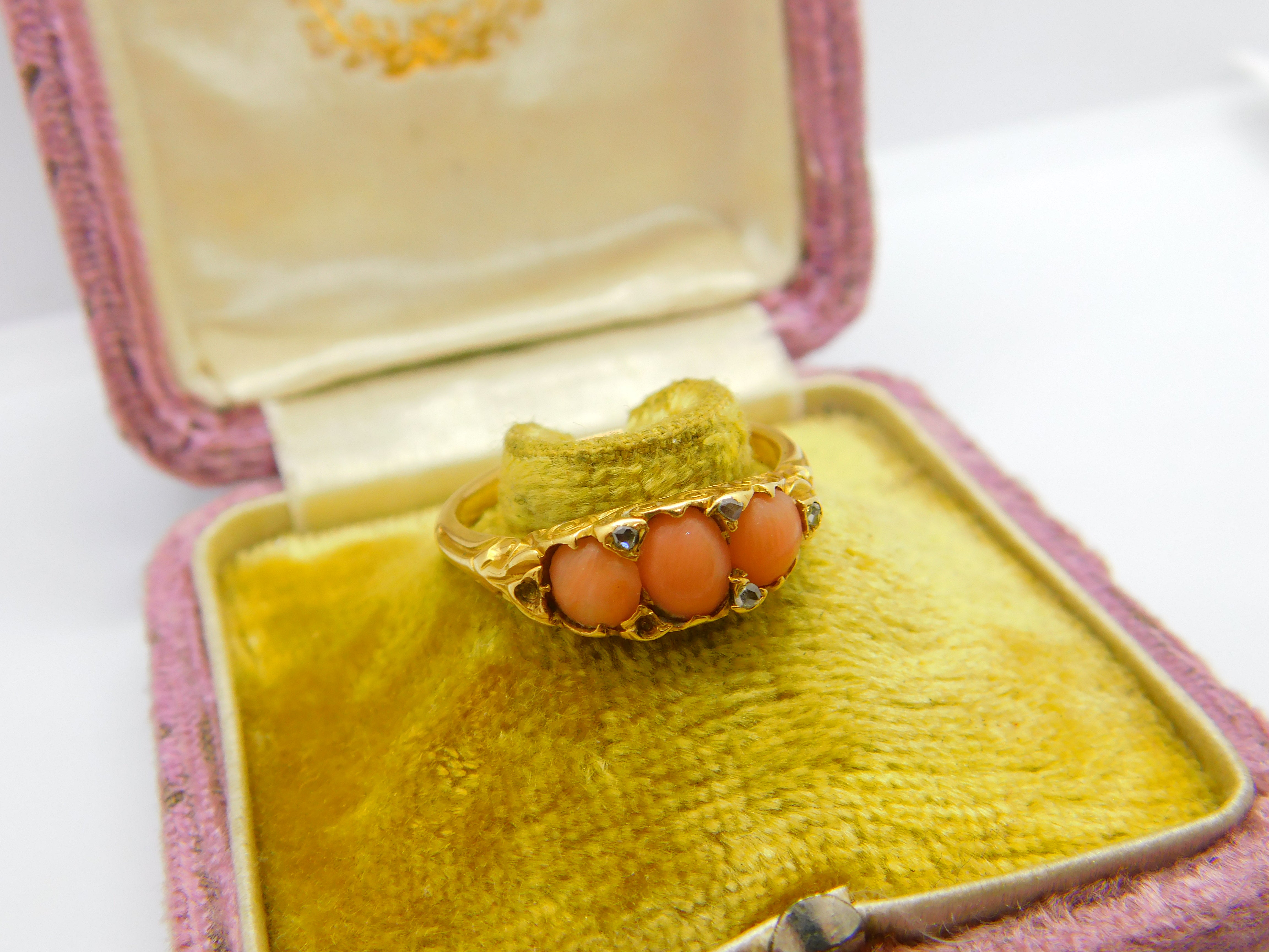 Victorian 18ct Yellow Gold, Red Coral & Diamond Band Ring Antique c1890