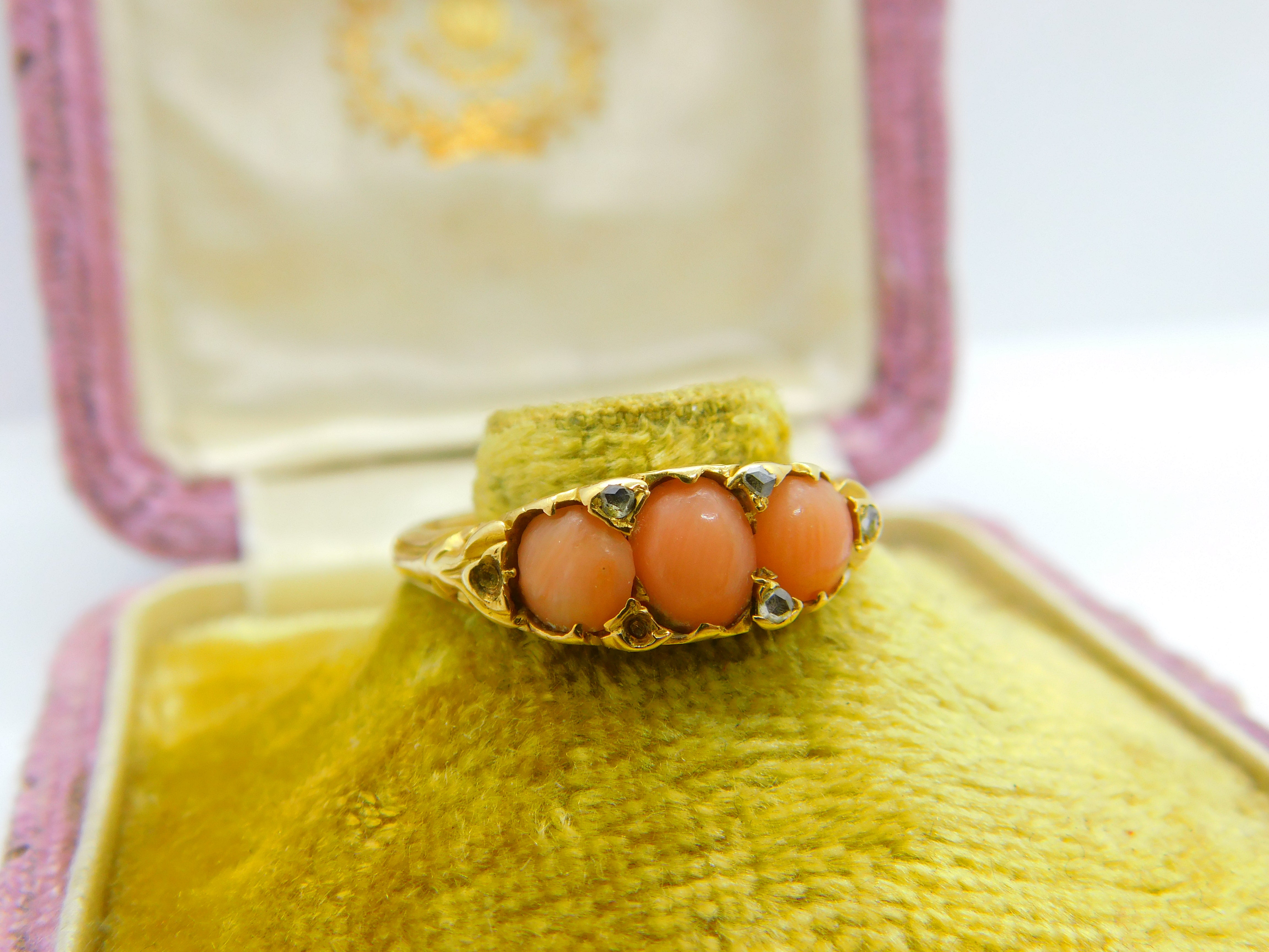 Details: A fantastic and wonderfully designed antique Victorian 18ct yellow gold, red coral and small diamond set boat ring with beautiful floral shoulders c1880. The item is missing two of the chip diamonds and the gold has been XRF tested. This is a wonderful item that would make a perfect gift or addition to any collection. The BOX pictured is for PRESENTATION ONLY and is NOT included in the listings but used to frame the pictures unless specifically stated otherwise.