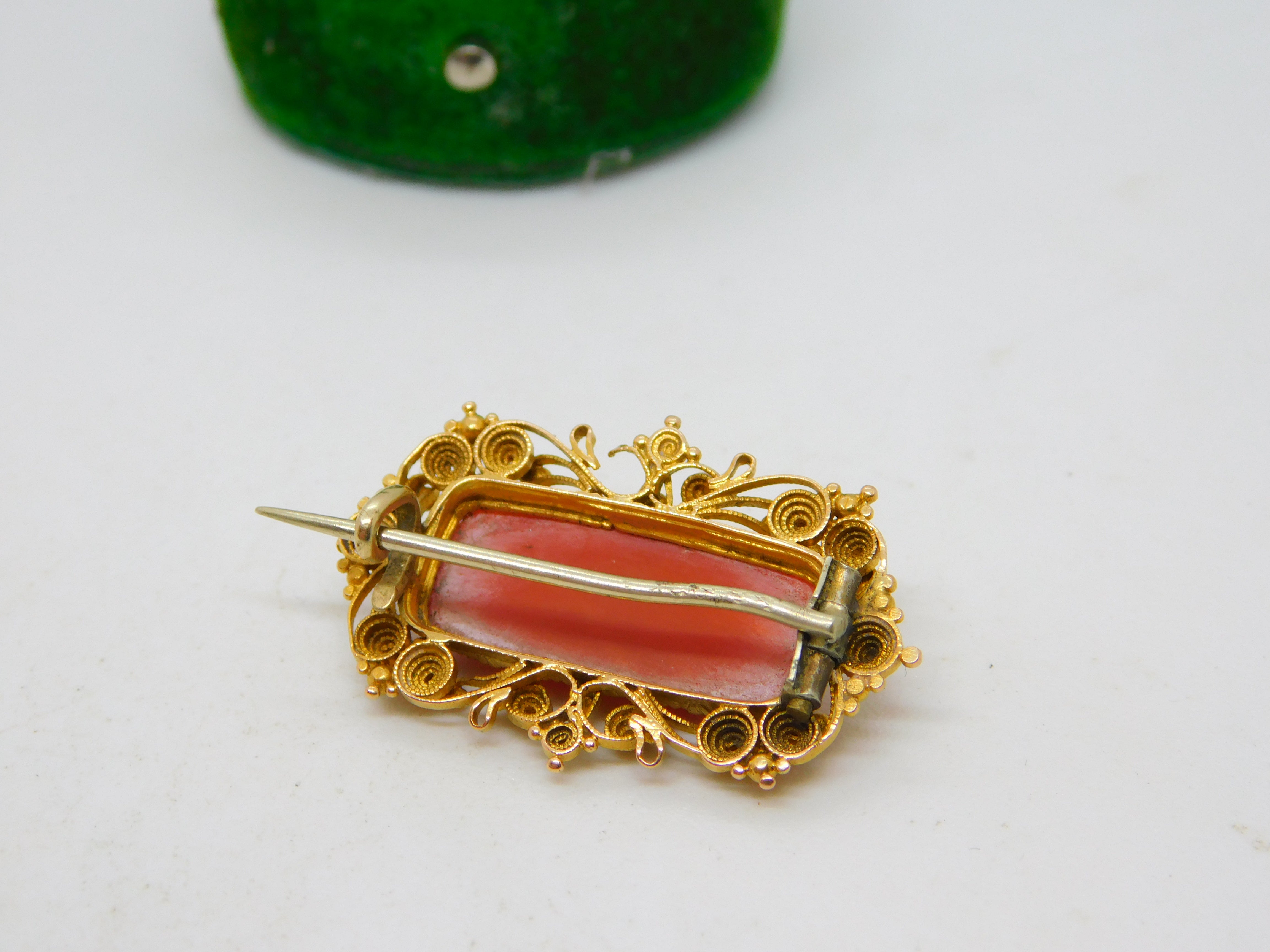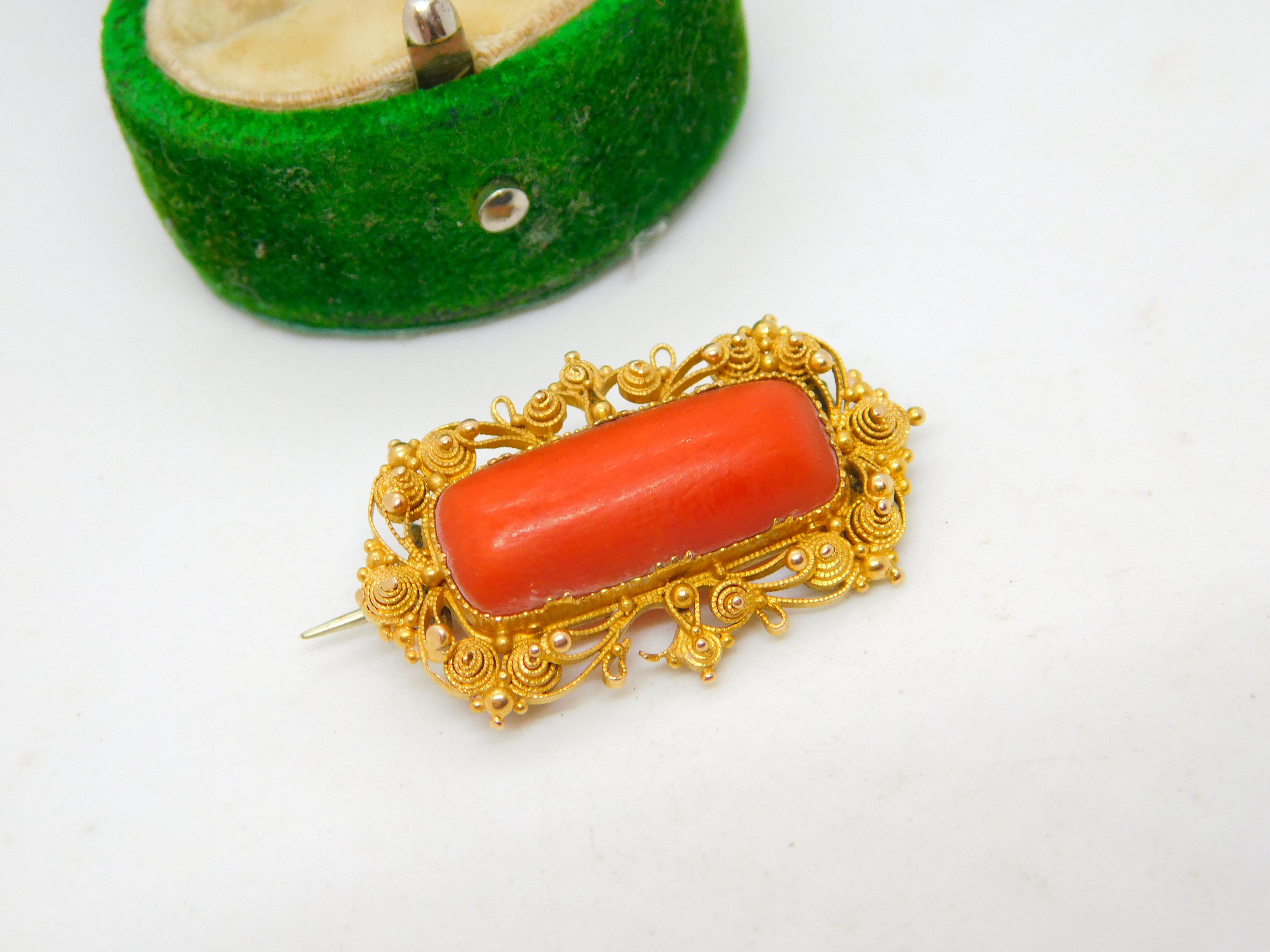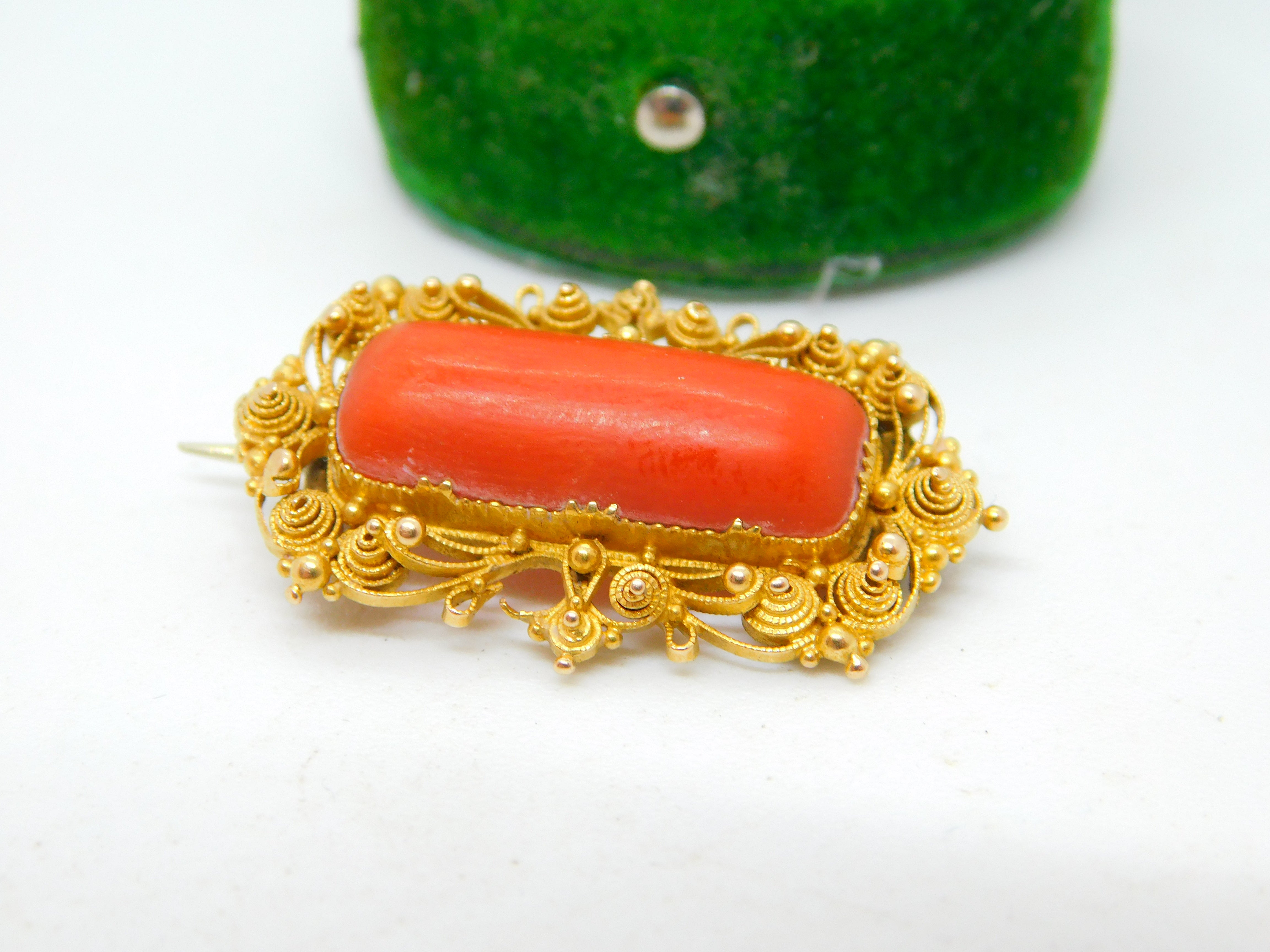 Victorian 18ct Yellow Gold & Red Coral Filigree Brooch Antique c1840