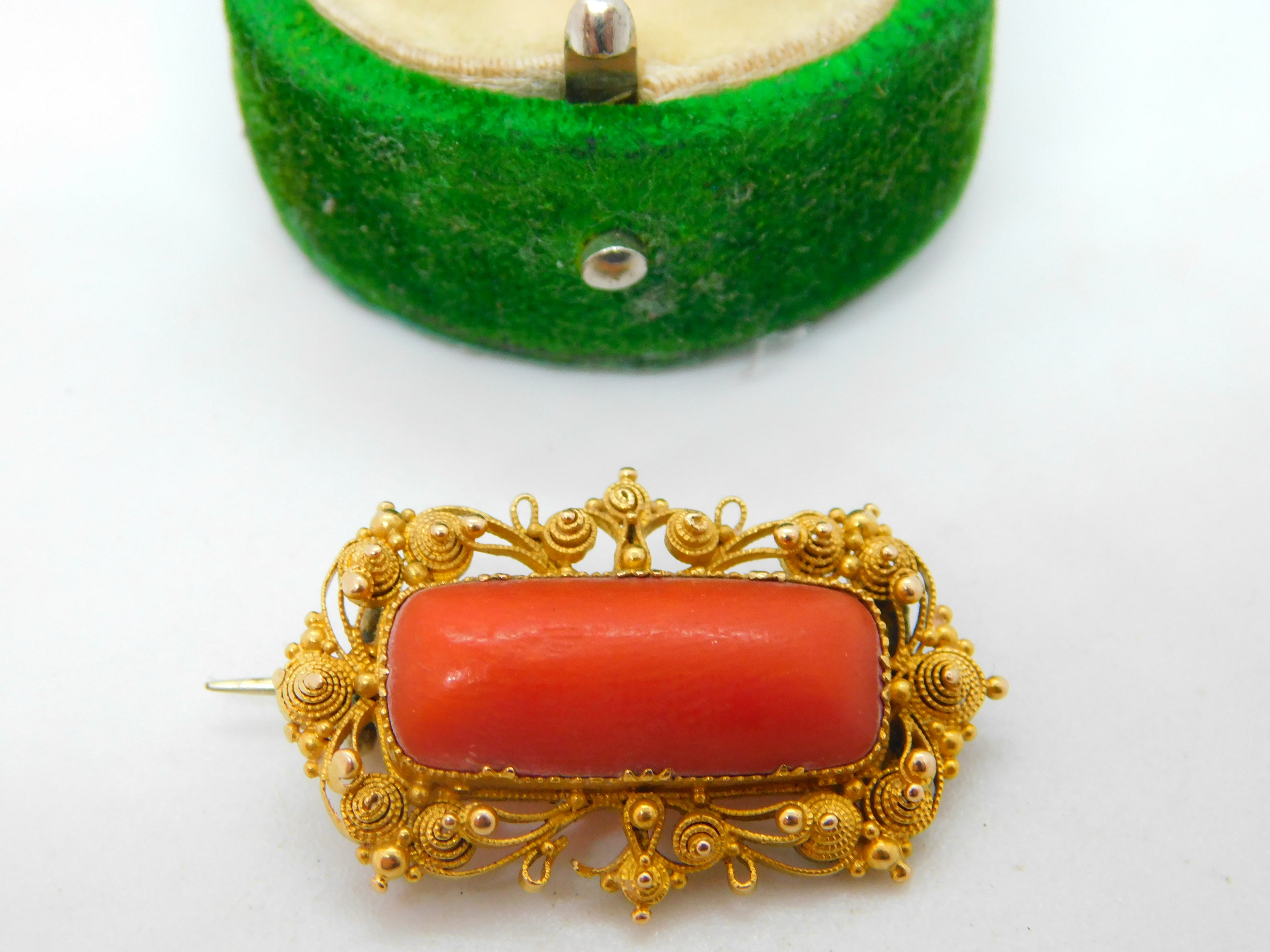 Details: A fantastic and wonderfully designed antique Victorian 18ct yellow gold filigree form brooch set with central red coral c1840, the gold has been XRF tested as it is unmarked. This is a wonderful item that would make a perfect gift or addition to any collection. The BOX pictured is for PRESENTATION ONLY and is NOT included in the listings but used to frame the pictures unless specifically stated otherwise.