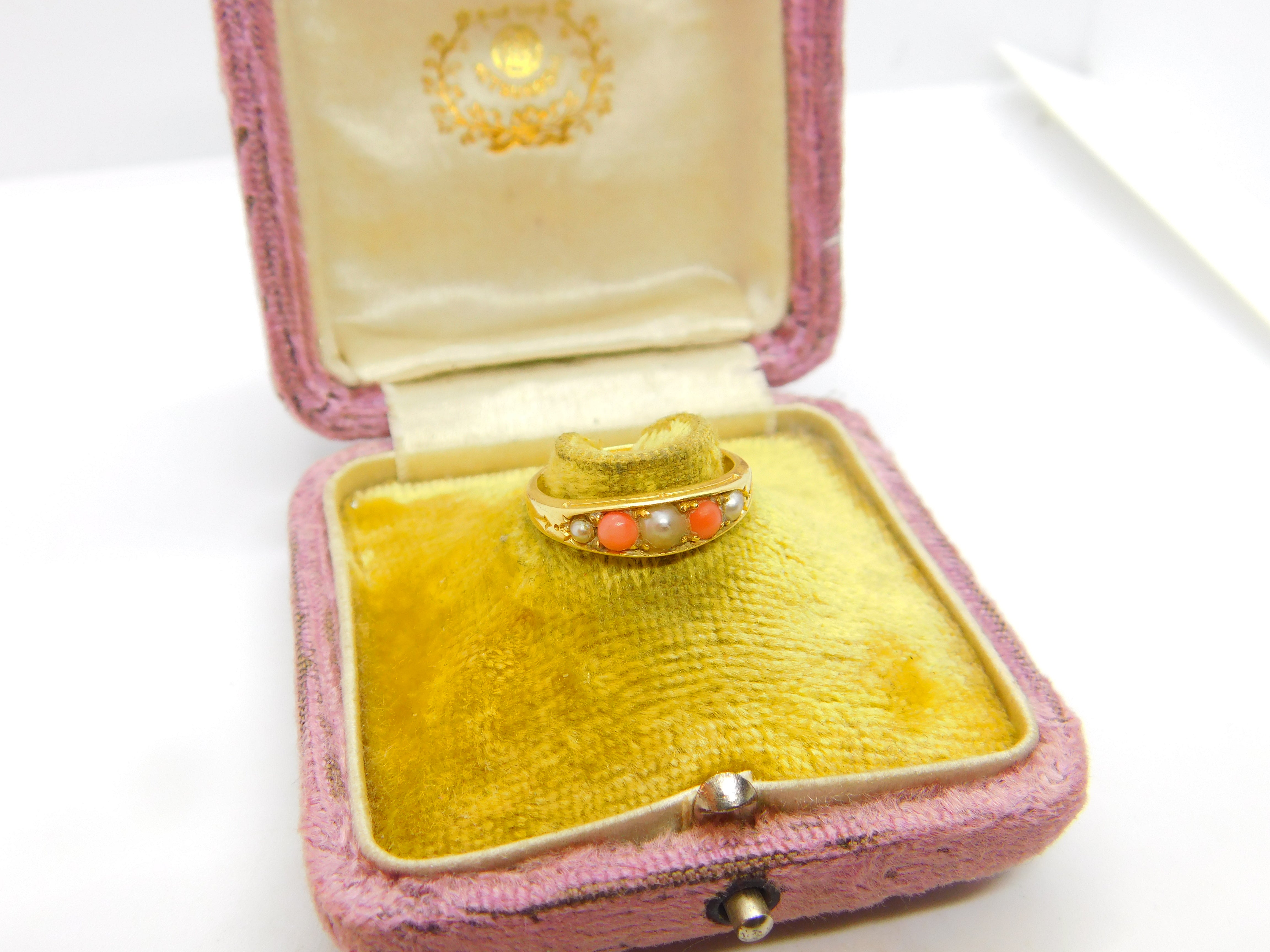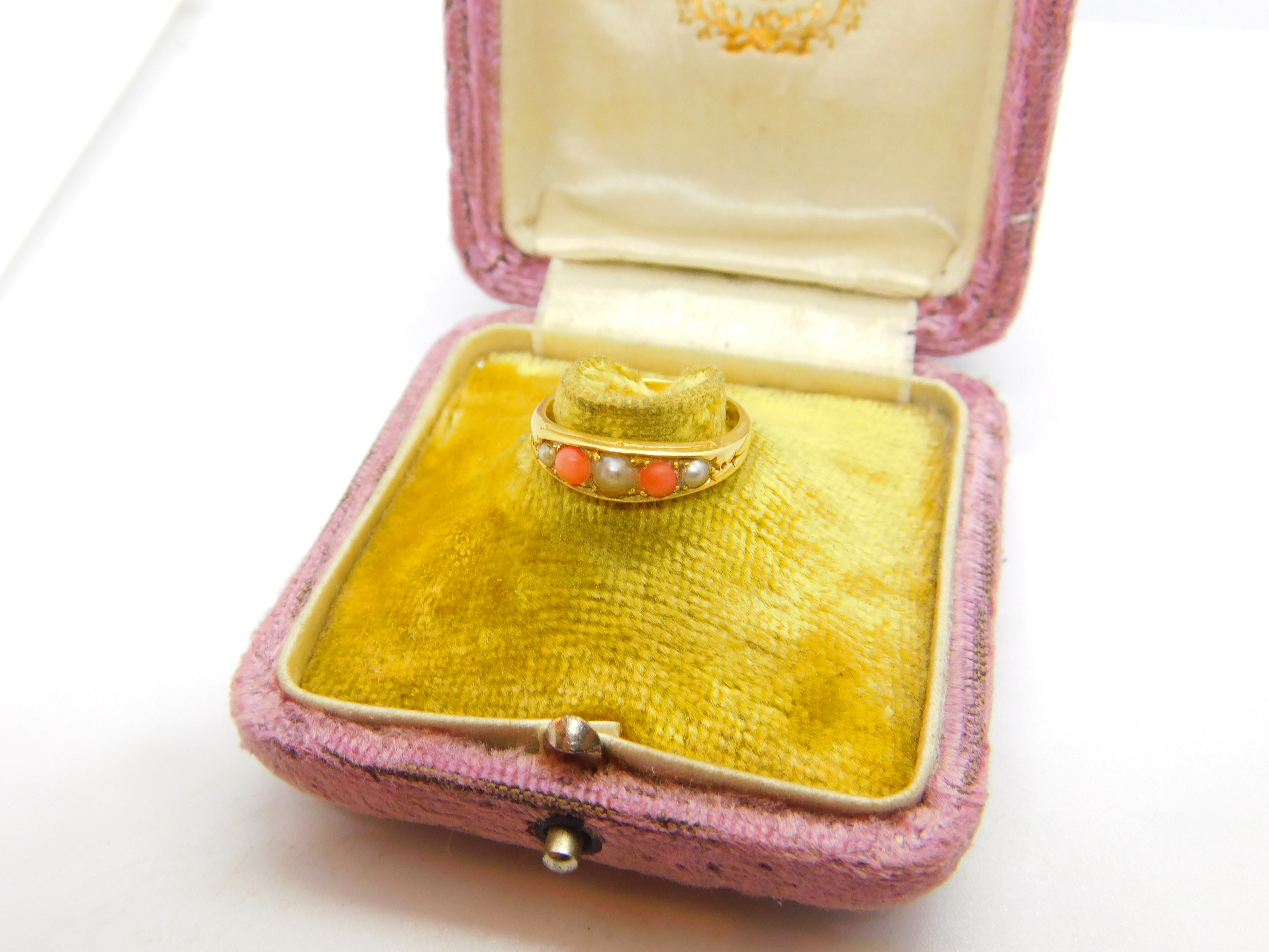 Details: A fantastic and wonderfully designed antique Victorian 18ct yellow gold boat ring set with seed pearl & natural coral hallmarked '18' to the interior and XRF tested c1880. A gorgeous example. This is a wonderful item that would make a perfect gift or addition to any collection. The BOX pictured is for PRESENTATION ONLY and is NOT included in the listings but used to frame the pictures unless specifically stated otherwise.