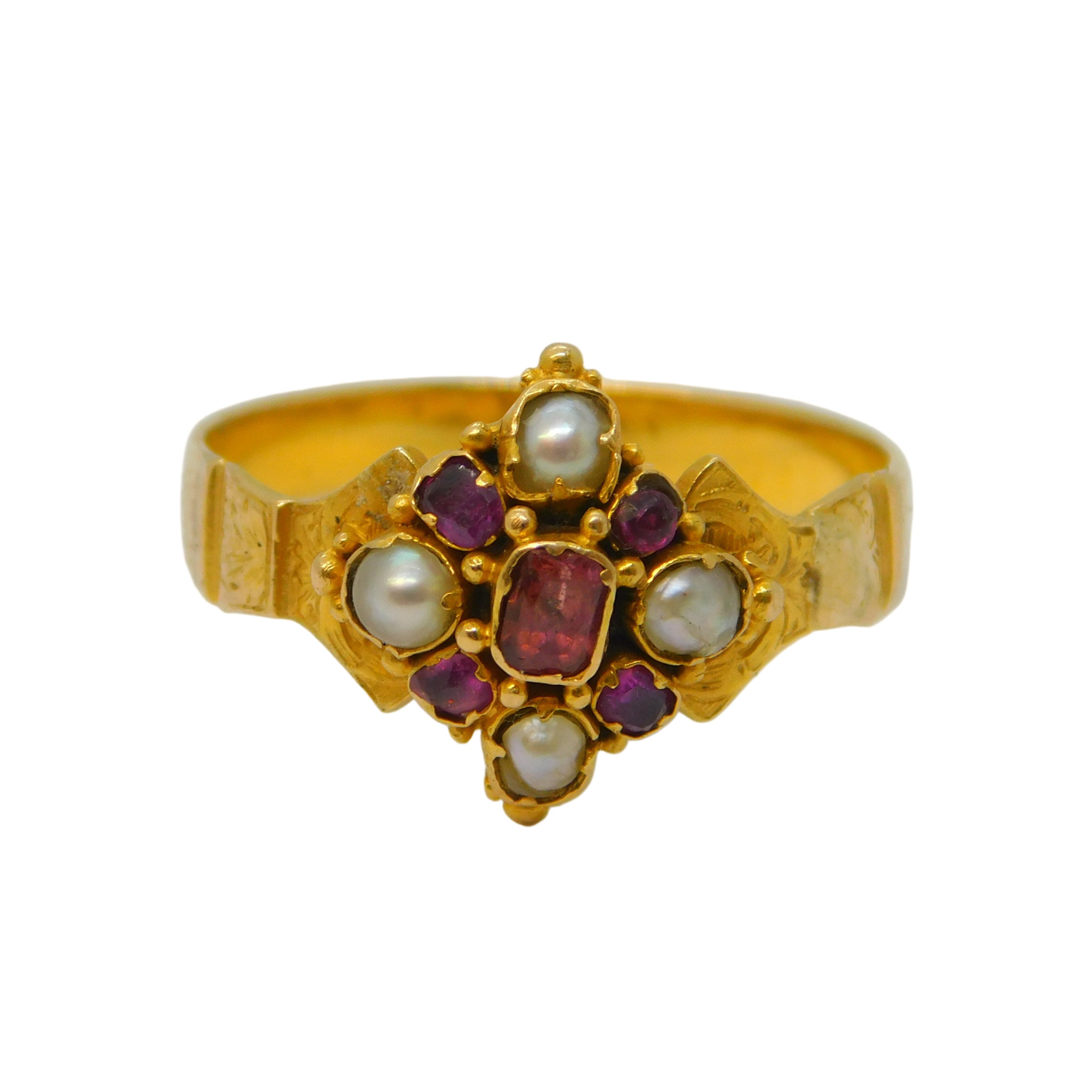 Details: A fantastic and wonderfully designed antique Victorian 18ct yellow gold floral dress ring set with multiple rubies amongst pearls c1860, the gold has been XRF tested as it is unmarked (please see pictures), possible repair to one of the shoulders. This is a wonderful item that would make a perfect gift or addition to any collection. We are more than happy to provide XRF reports for items upon request.