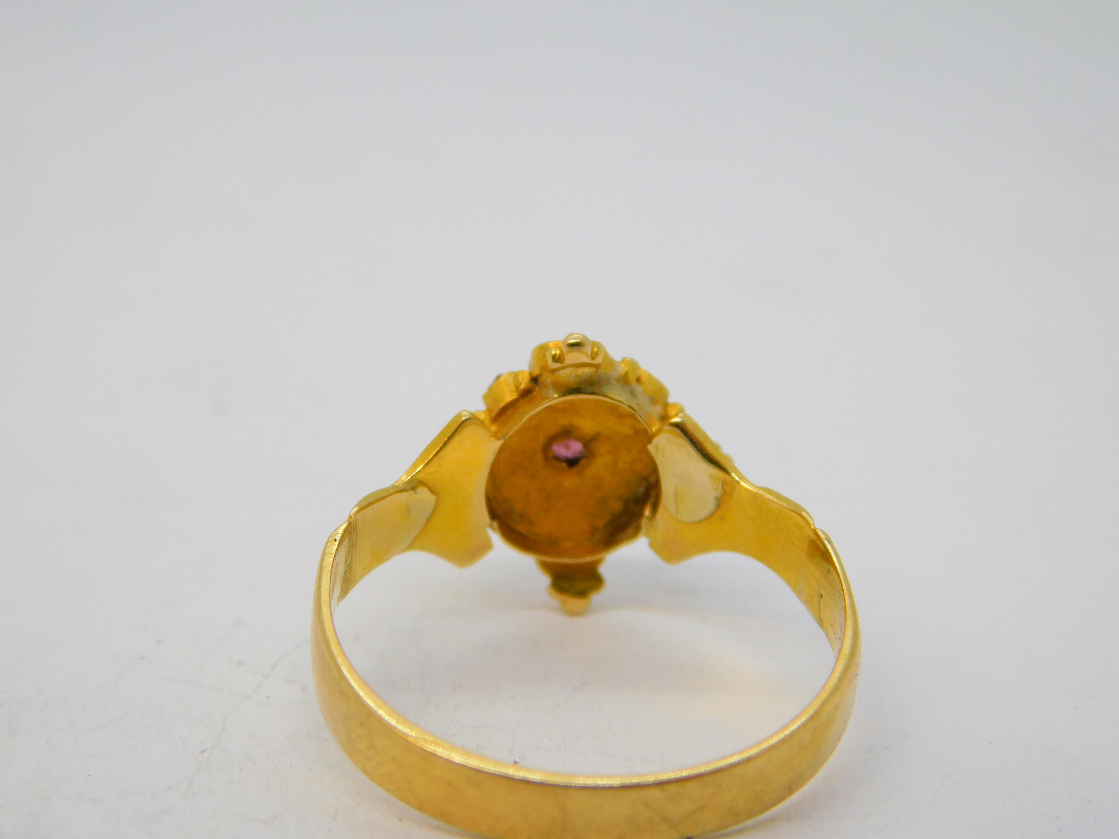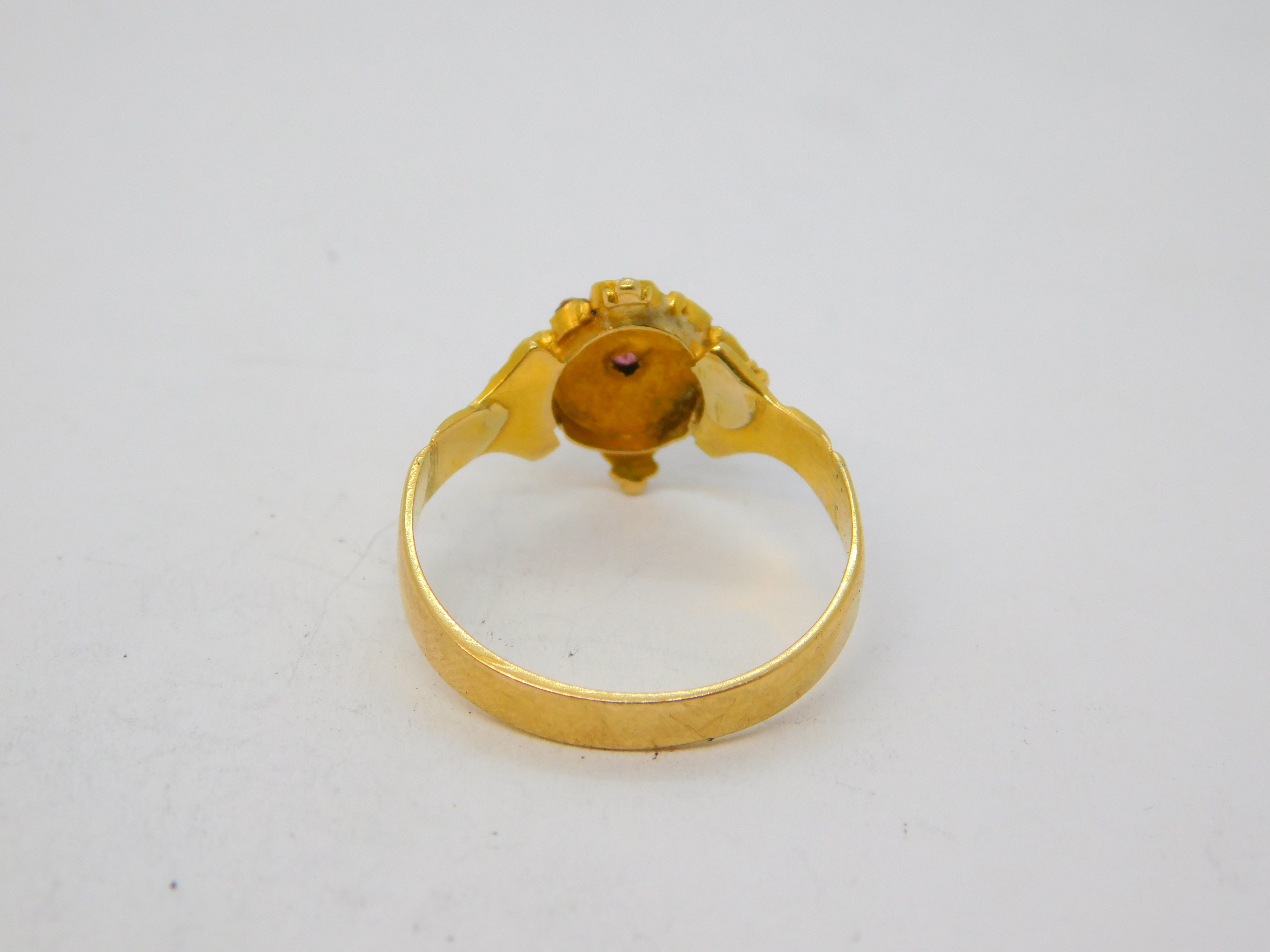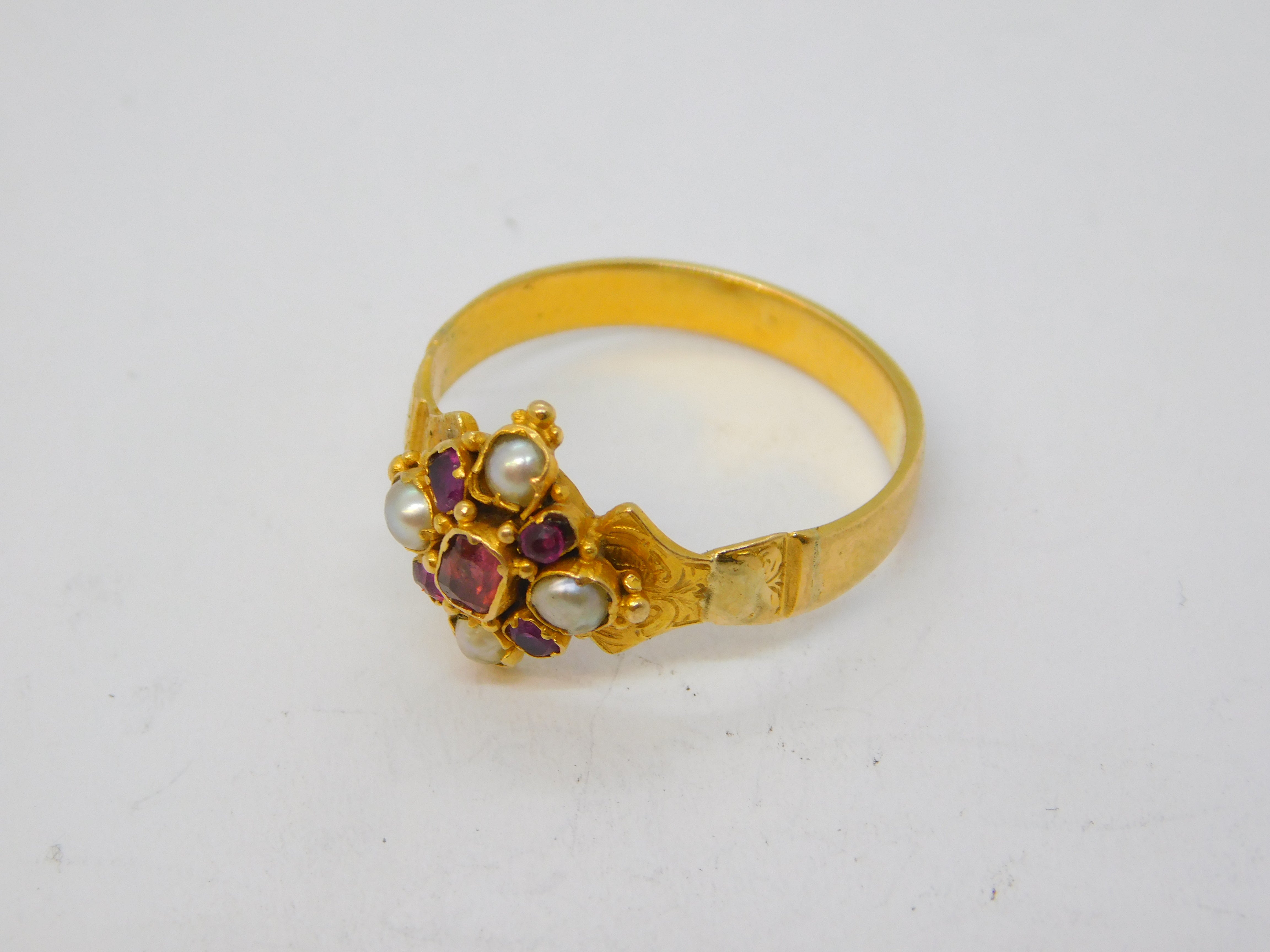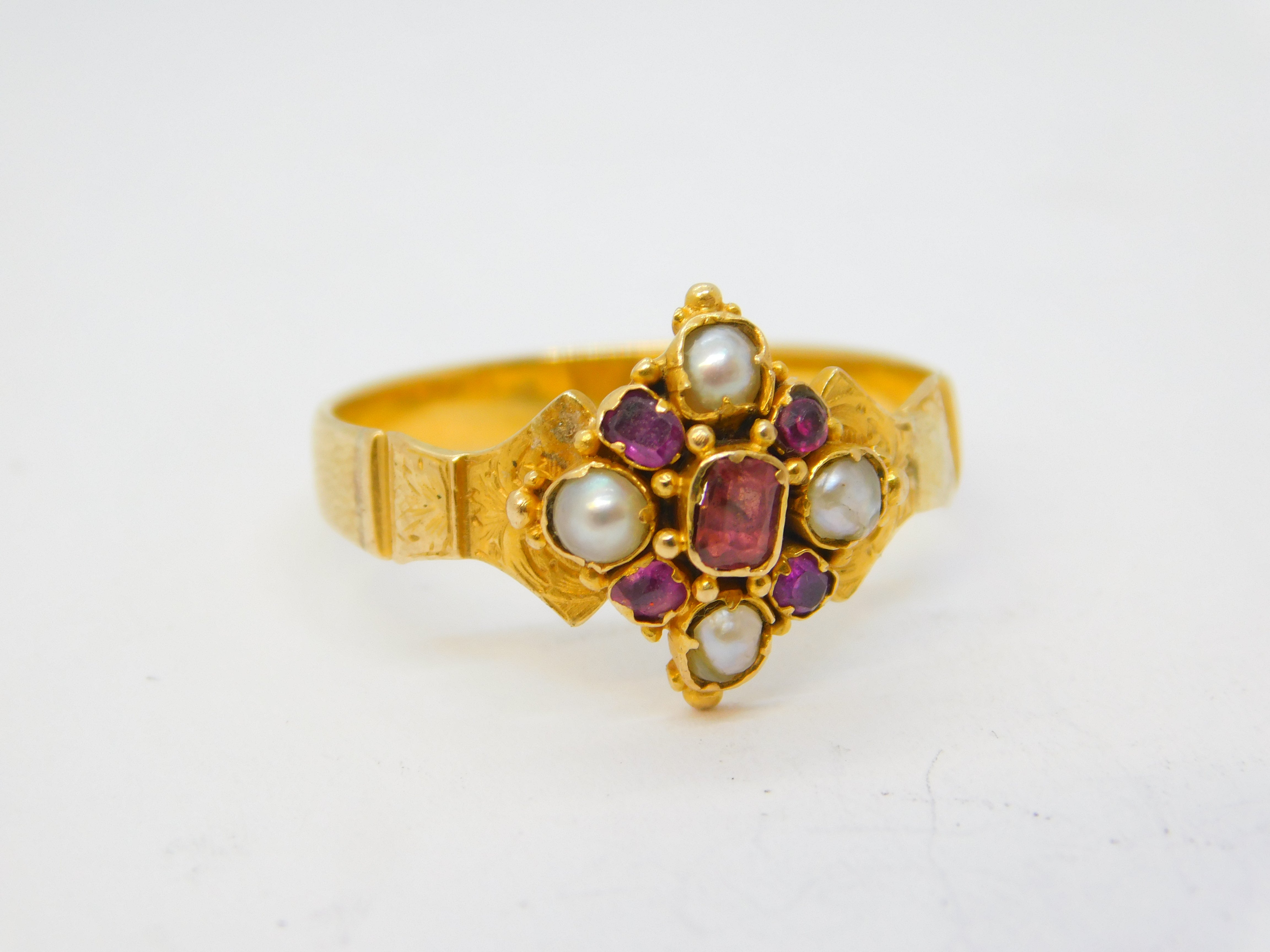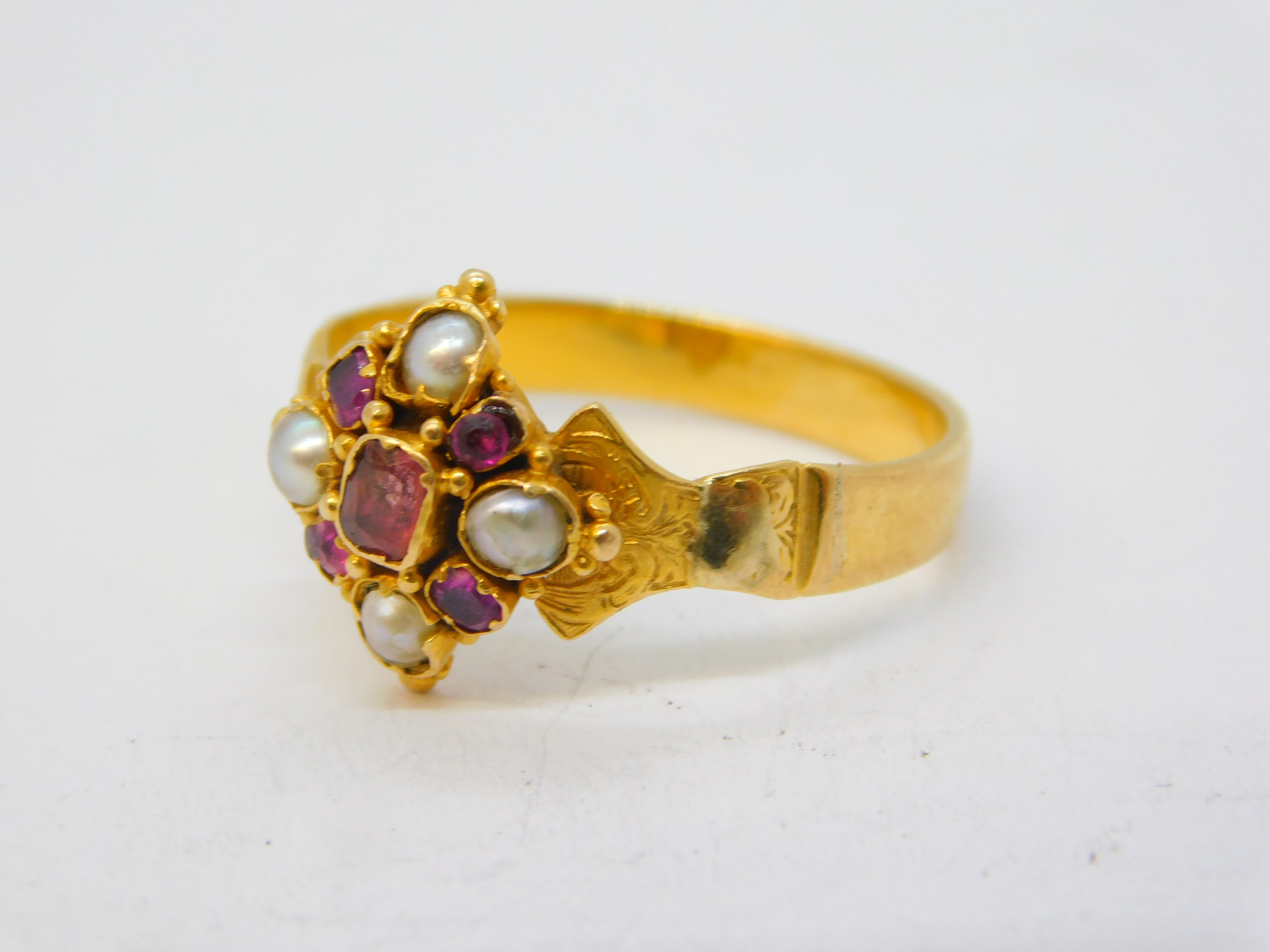 Victorian 18ct Yellow Gold, Ruby & Pearl Set Floral Dress Ring Antique c1860