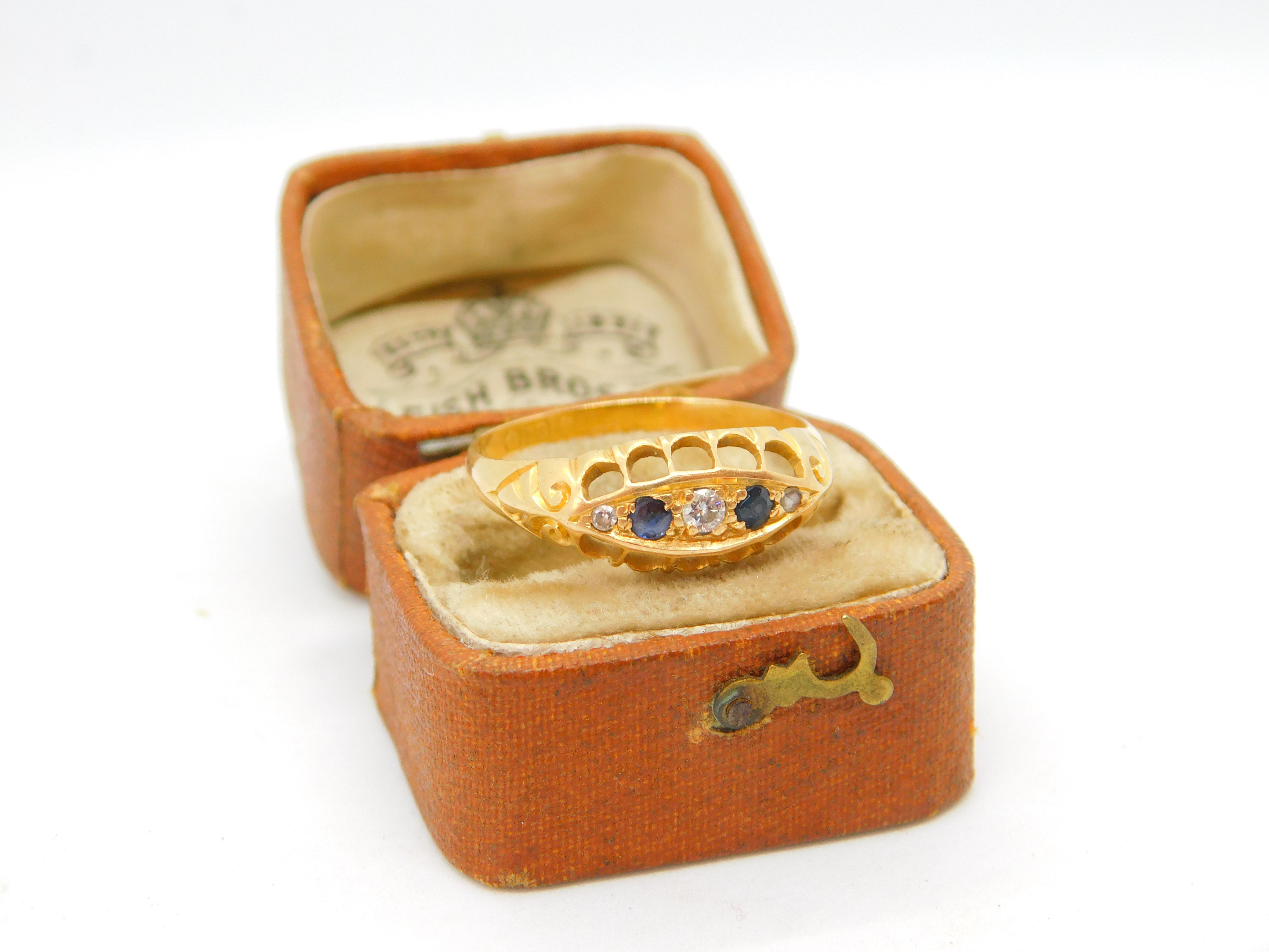 Details: A fantastic and wonderfully designed antique Victorian 18ct yellow gold, sapphire & diamond boat ring with lovely detailing hallmarked Birmingham 1864 to the interior. This is a wonderful item that would make a perfect gift or addition to any collection. The BOX pictured is for PRESENTATION ONLY and is NOT included in the listings but used to frame the pictures unless specifically stated otherwise.