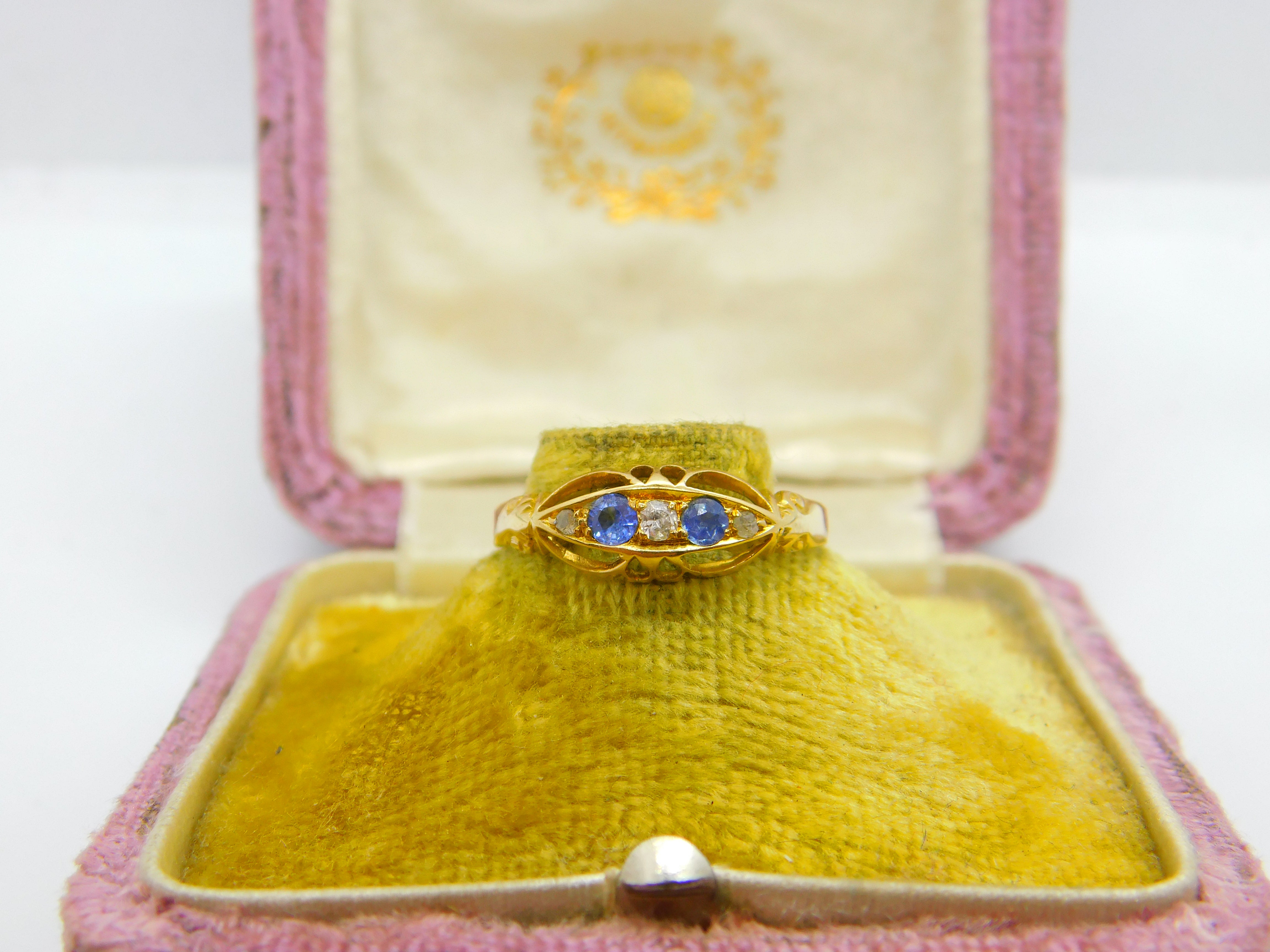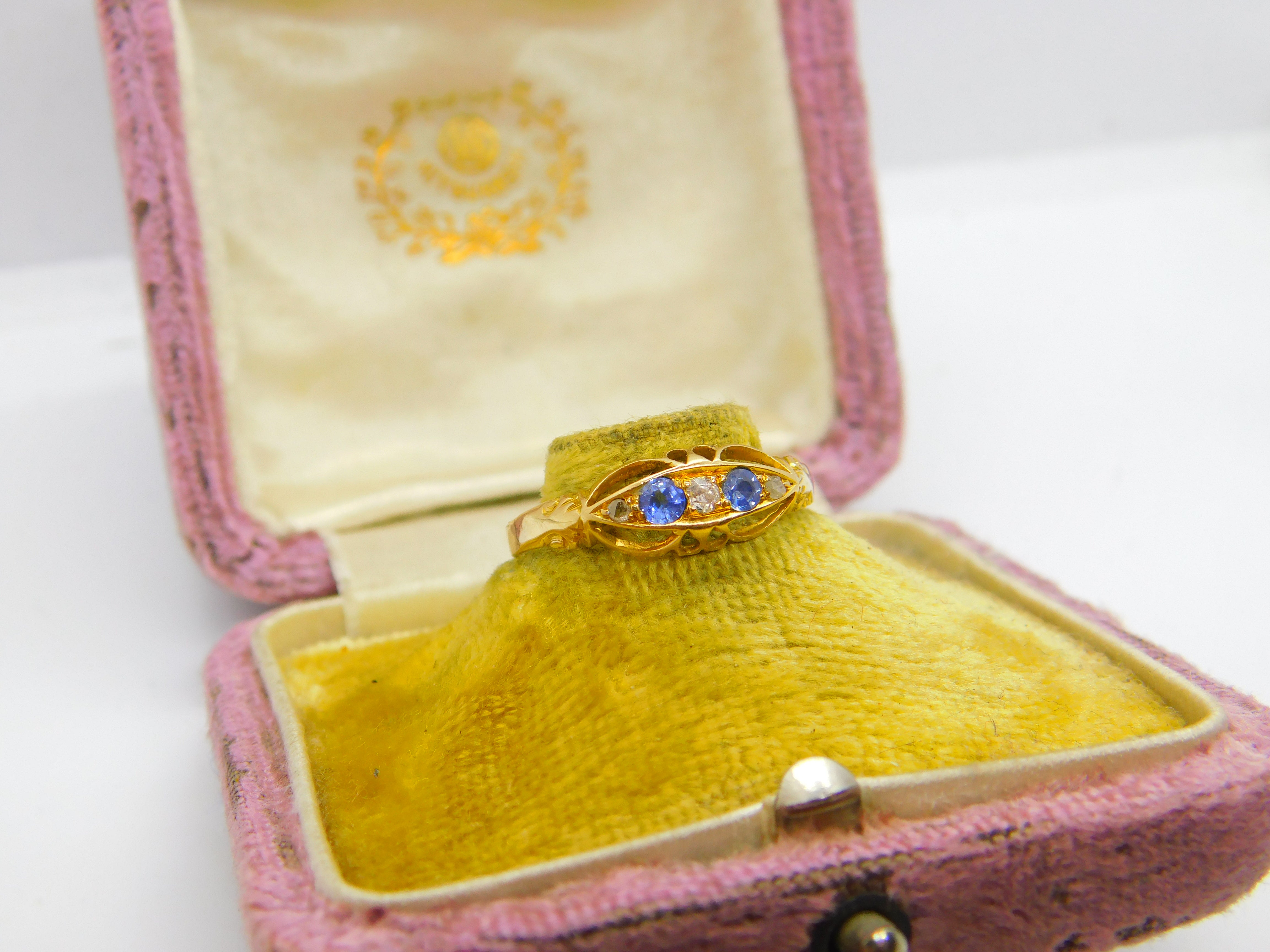 Details: A fantastic and wonderfully designed antique Victorian 18ct yellow gold boat ring set with natural sapphires & diamonds hallmarked to the interior band c1890. The stones have been tested. This is a wonderful item that would make a perfect gift or addition to any collection. The BOX pictured is for PRESENTATION ONLY and is NOT included in the listings but used to frame the pictures unless specifically stated otherwise.