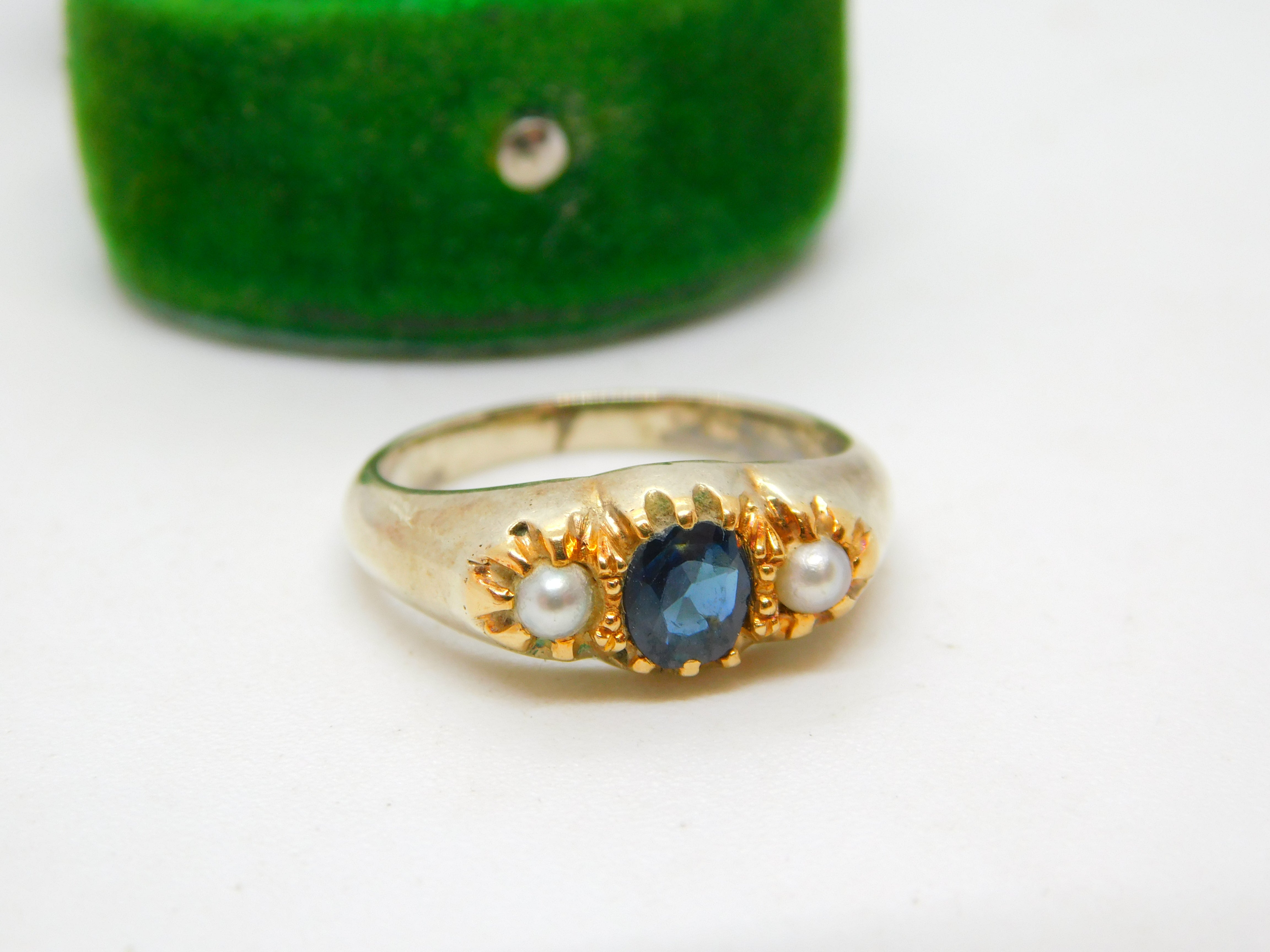 Details: A fantastic and wonderfully designed antique Victorian 18ct yellow gold boat ring set with a central sapphire flanked by two pearls c1880, the gold has been XRF tested as it is unmarked. This is a wonderful item that would make a perfect gift or addition to any collection. The BOX pictured is for PRESENTATION ONLY and is NOT included in the listings but used to frame the pictures unless specifically stated otherwise.