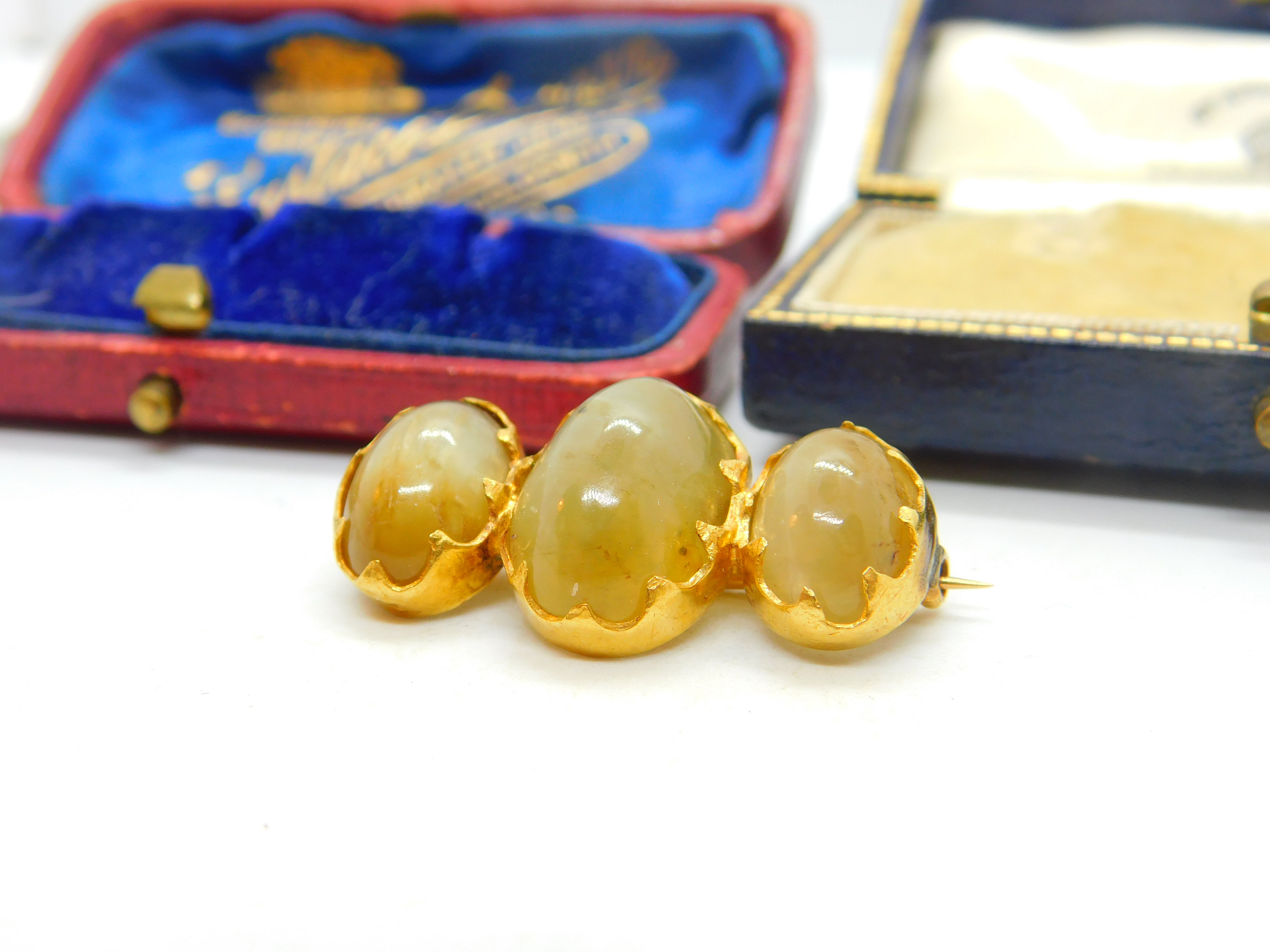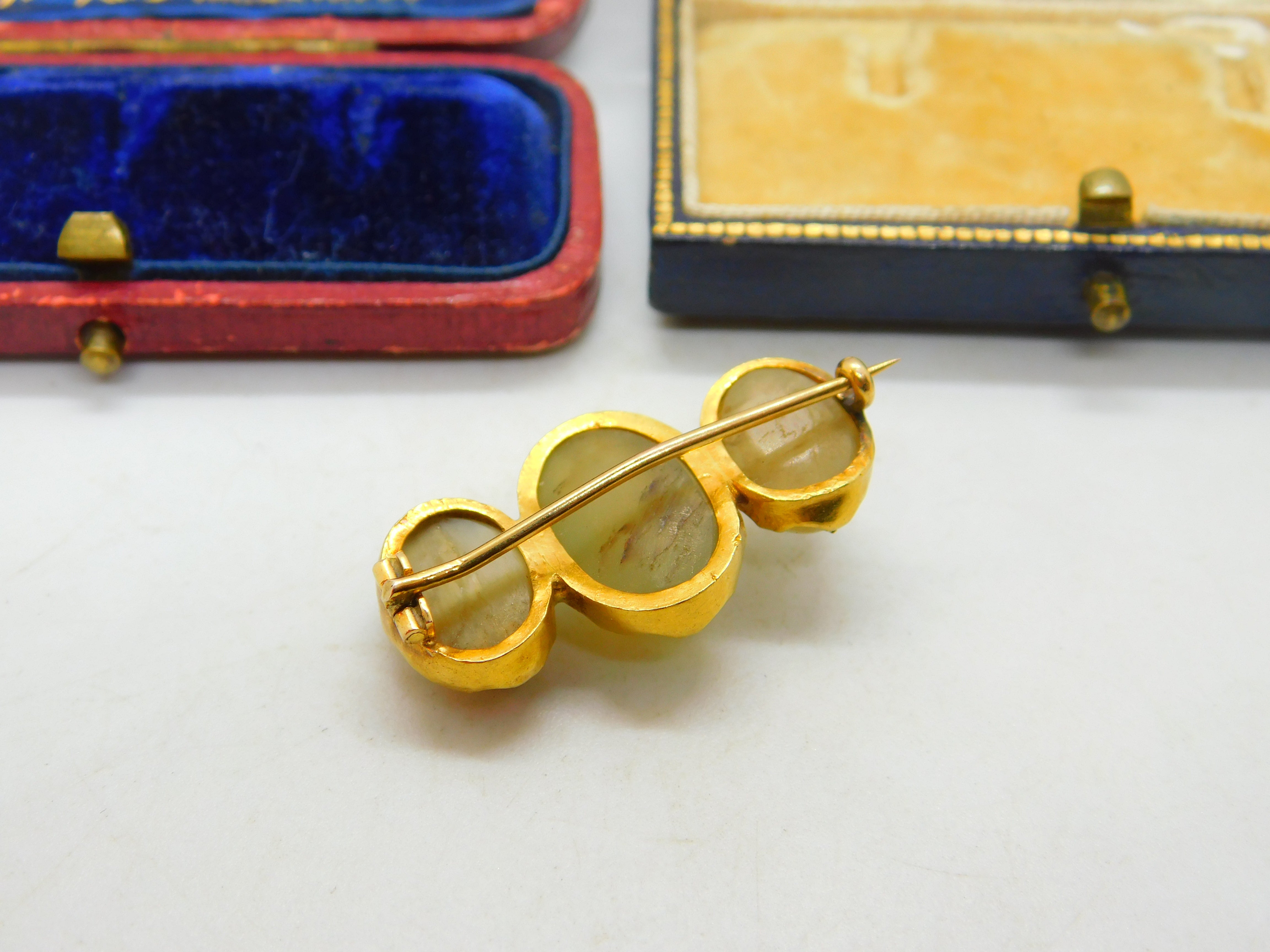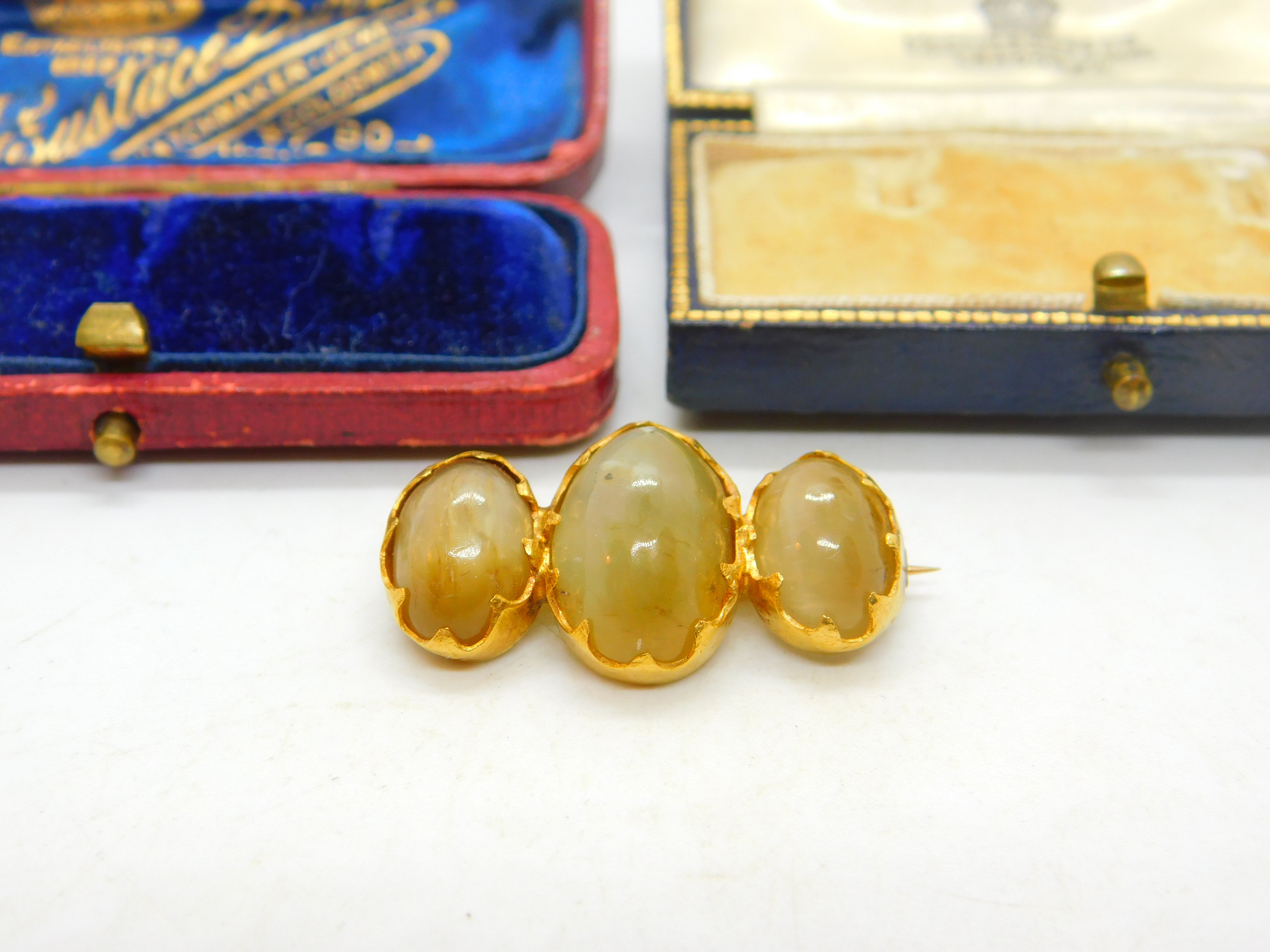 Victorian 18ct Yellow Gold & Triple Cabochon Cats Eye Brooch Antique c1860